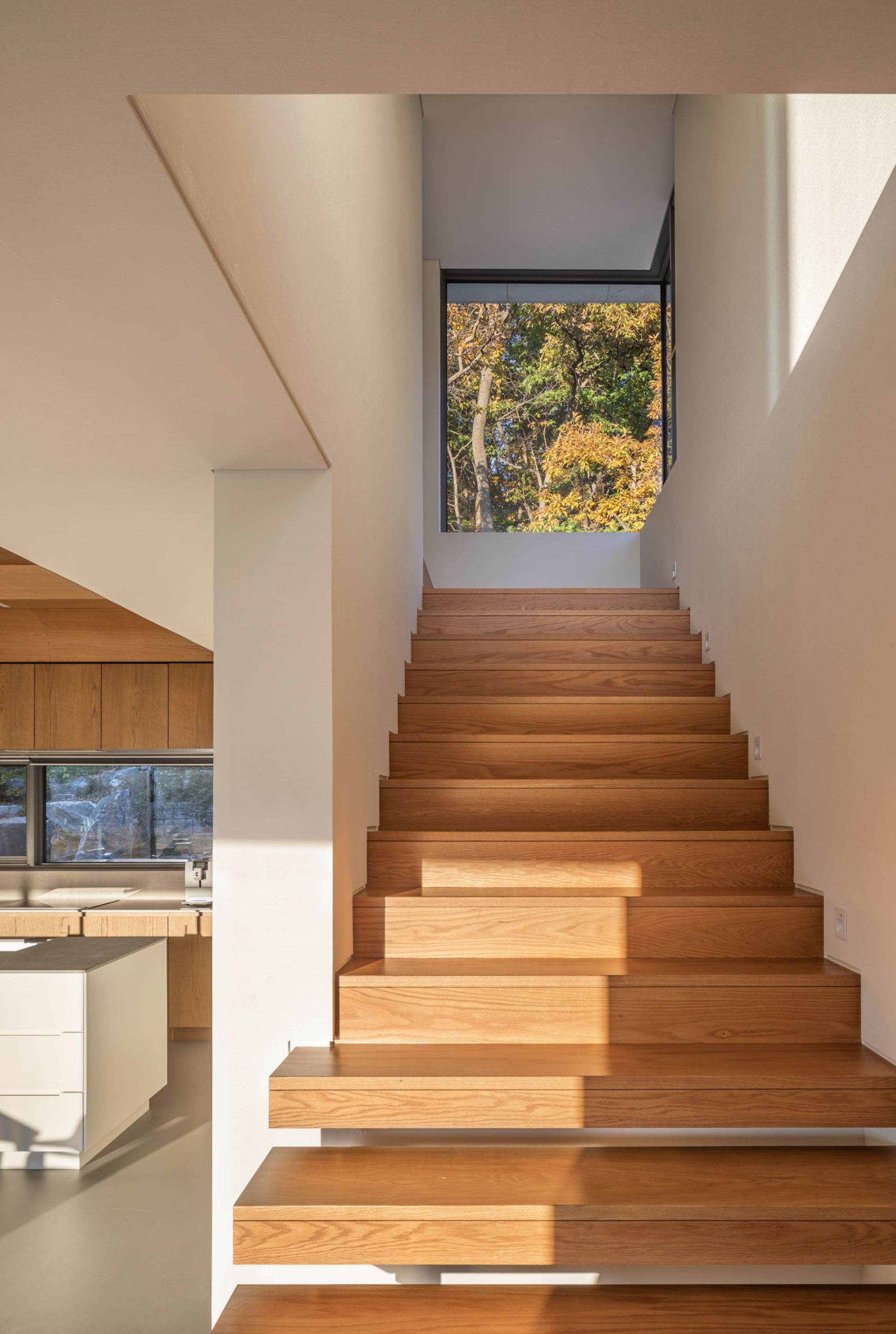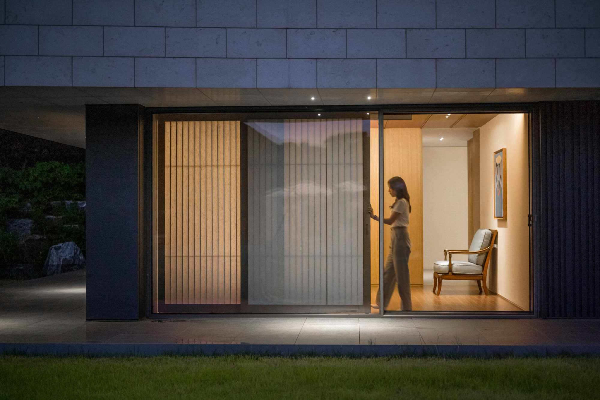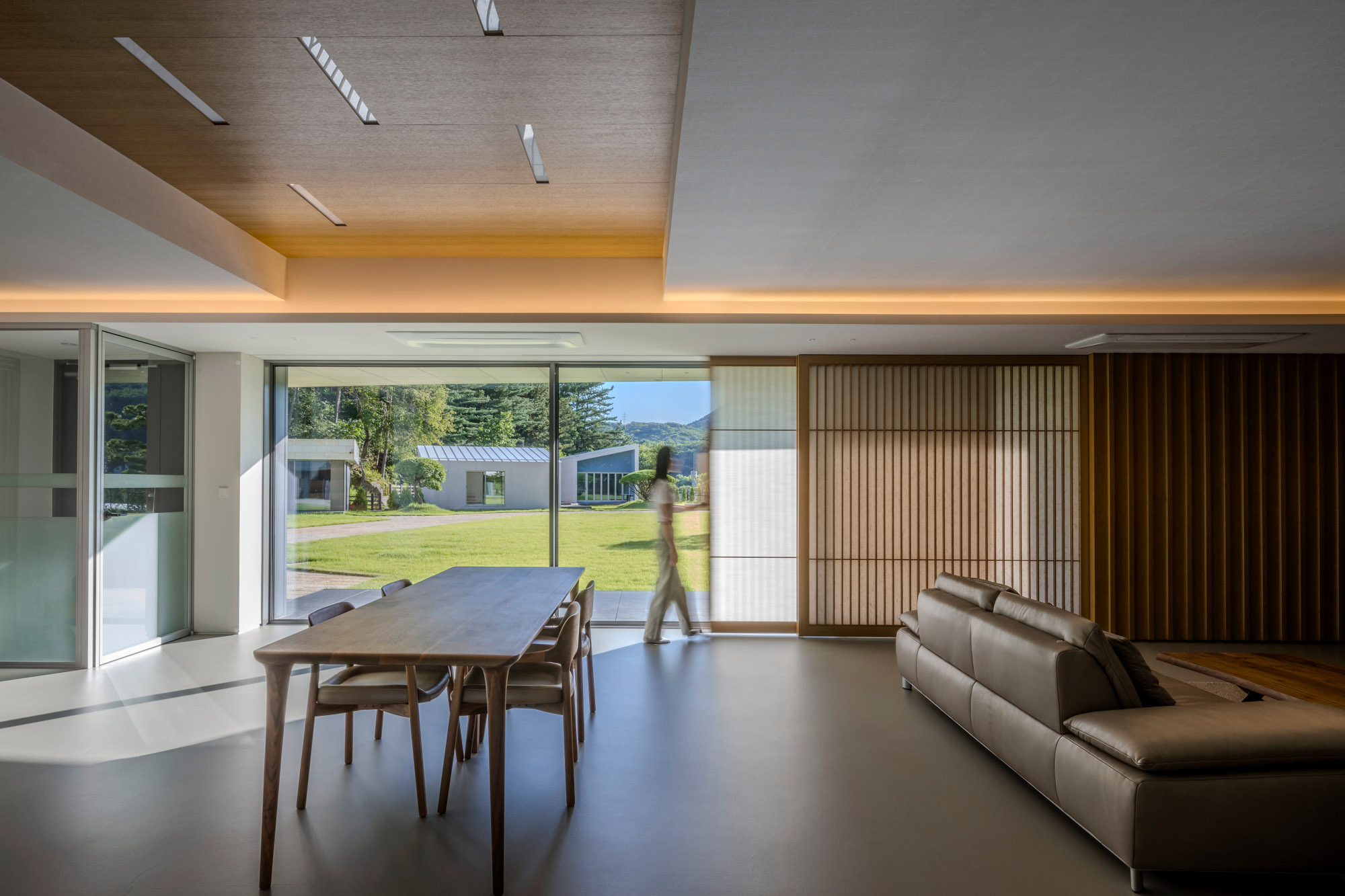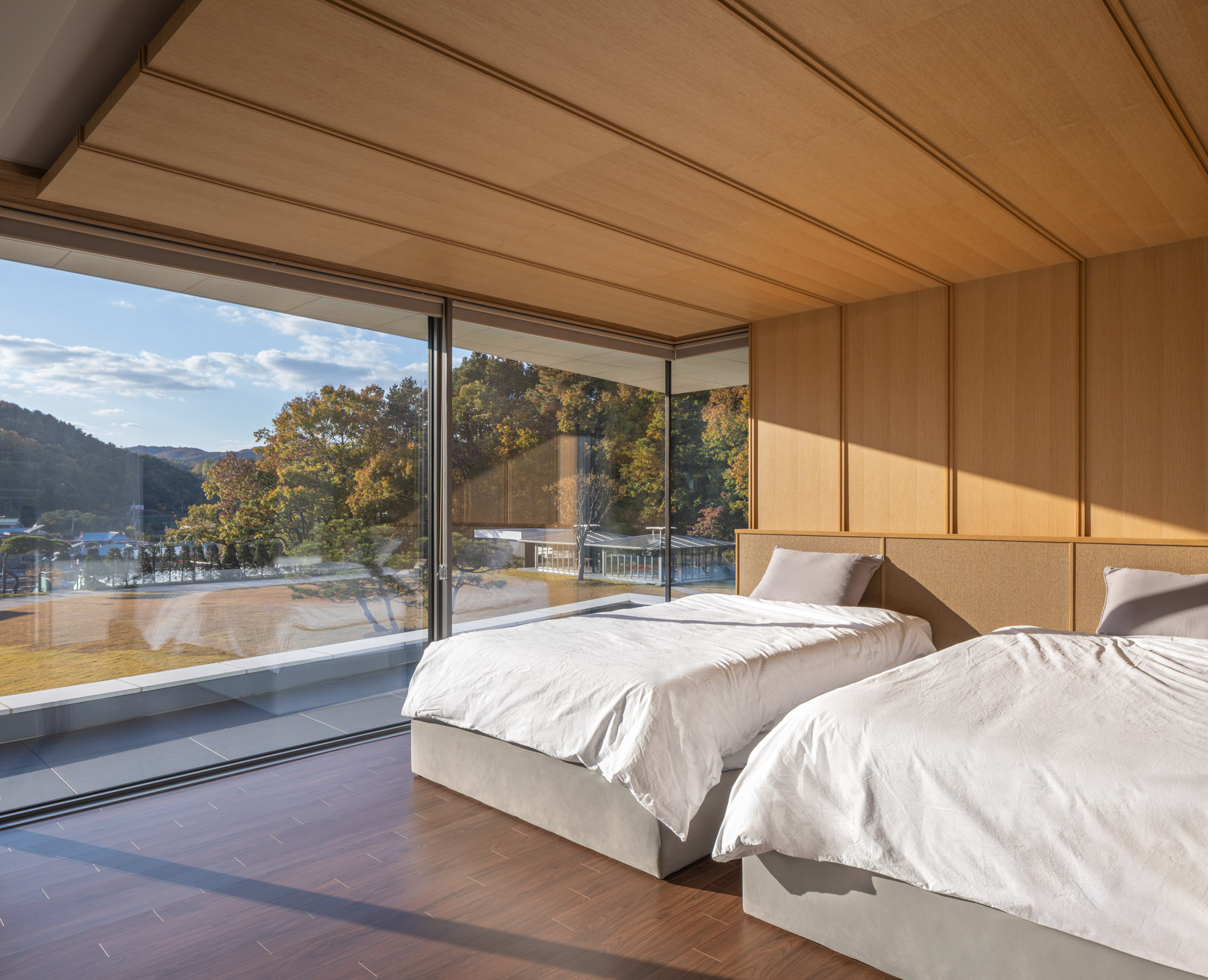 연수동 내부는 크림 화이트 색상을 기본으로 선택하여 아늑함을 강조했다. 파노라마 창밖 풍경이 내부까지 스며들도록 오크 무늬목 마감을 부분 적용하여 자연의 물성을 연속적으로 느낄 수 있다. 숙박으로도 이용되는 연수동은 창 내측에 목재 덧창을 설치해 필요에 따라 여닫으며 외부 시선으로부터 자유로울 수 있도록 설계했다. 덧창은 내부에서 바라보는 시원한 풍경과 사생활 보호라는 상충하는 조건을 해결하면서도 반투명한 마감으로 실내공간을 은은한 볕으로 채워준다.