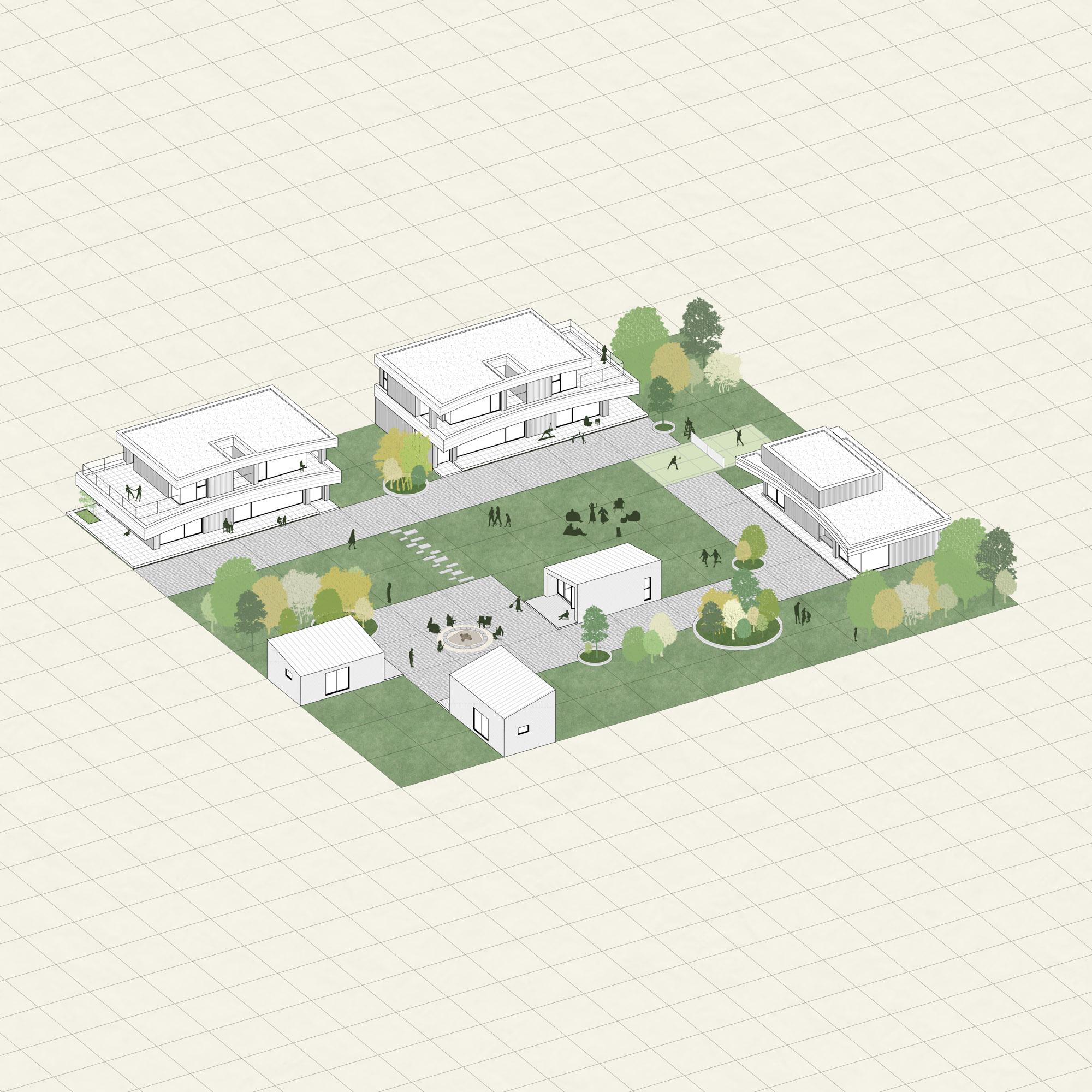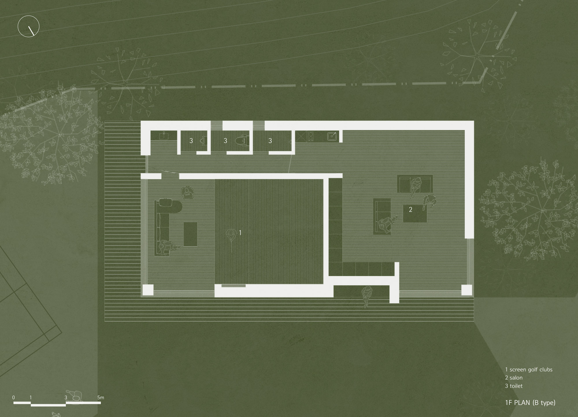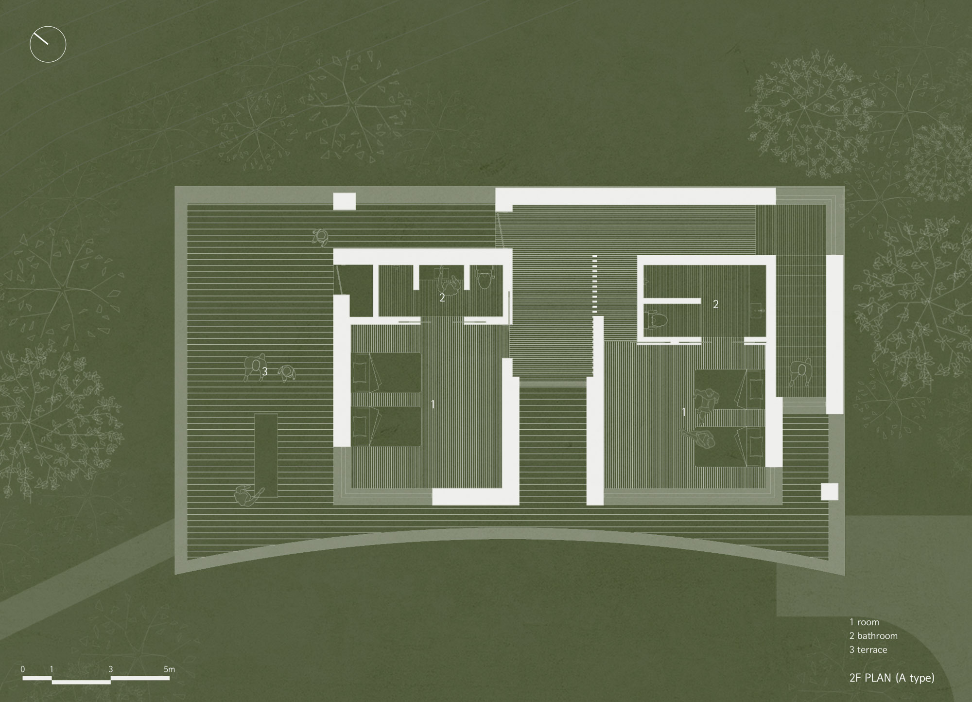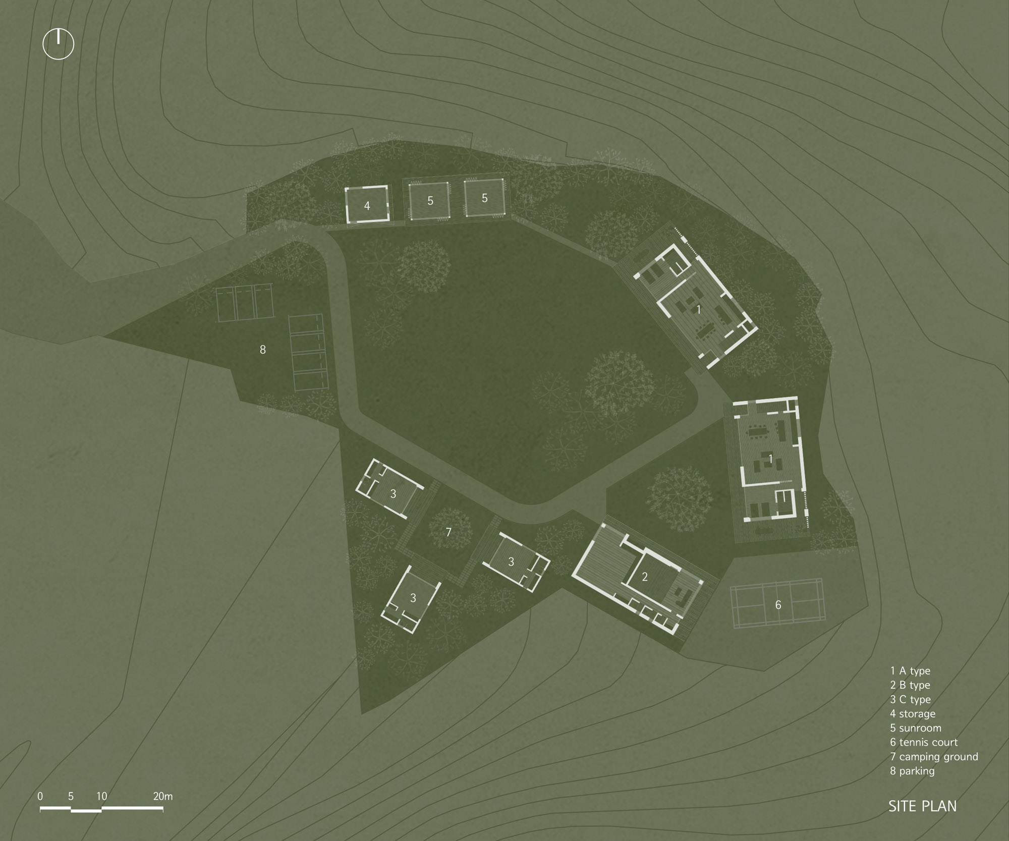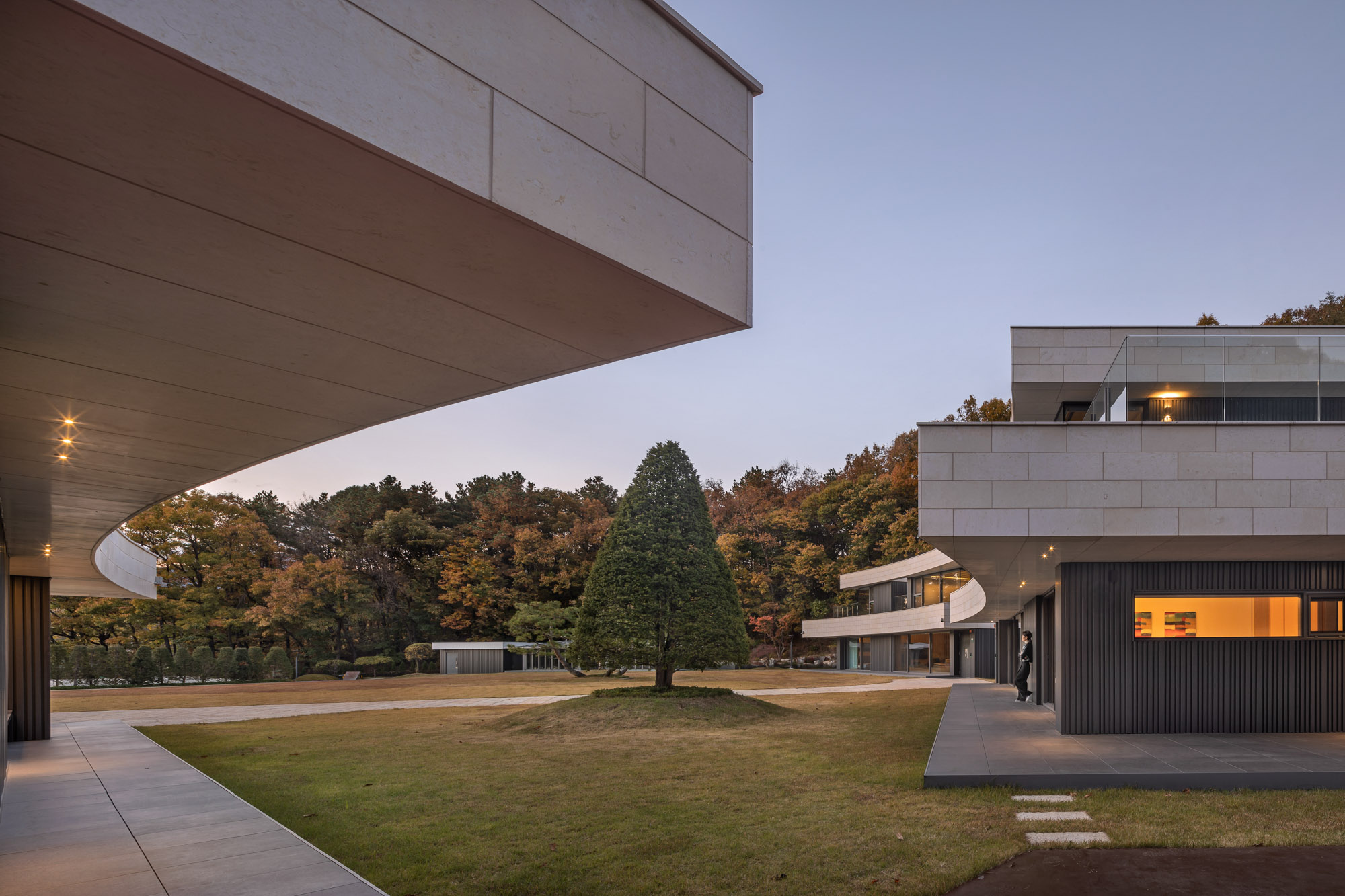 ‘휴원’ 대지를 감싸는 연속적인 풍경에는 보현산 산세가 자리하고 있다. 산자락의 흐름을 끊지 않고 연수원 내 교육과 휴식, 레크리에이션 기능을 고루 갖추기 위해 여러 동으로 분할 배치를 고려했다. 두 개의 연수동과 스크린골프가 설치된 휴게동, 글램핑을 즐길 수 있는 동, 야외 바비큐를 즐길 수 있는 썬룸 그리고 관리동까지. 용도에 따라 8개의 볼륨이 대지 중앙 마당을 향해 조용하게 둘러앉아 있다. 각 동은 주변 풍경의 수평적 흐름을 담고자 했다. 돌출된 테라스와 처마는 연수동의 수직성을 상쇄시키며, 돌출된 처마와 뒤로 물러난 벽면의 대비를 강조하여 가볍게 부유하는 느낌을 강조했다. 곡선으로 계획한 처마의 흐름은 연수동에서 휴게동을 거쳐 뒷산의 풍경과 같이 대지를 감싸며 하나의 시선으로 연결된다.