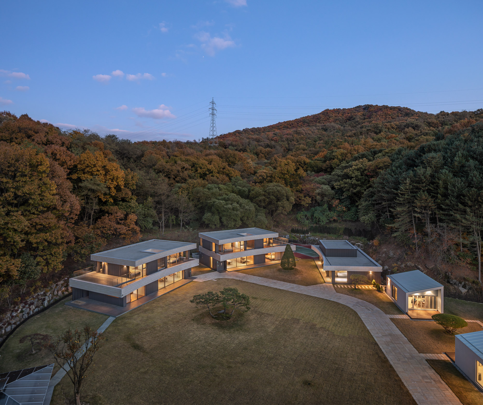 ‘휴식’이라는 단어는 익숙하면서도 바쁜 일상 속에서 때로는 생경하게 느껴진다. 용인 ‘휴원’은 차분한 풍경 속에서 복잡한 생각을 잠시나마 잊을 수 있도록 마음의 안식을 추구하는 의도로 시작되었다. 대지는 산들 마루가 감싸주듯 에워싸고 눈앞에 펼쳐진 풍경에는 마을의 조각들이 나직이 내려앉아 있다. 새벽에는 낮은 안개가 내려앉고 아침에는 새소리와 물소리가 청량하게 울려 퍼진다.