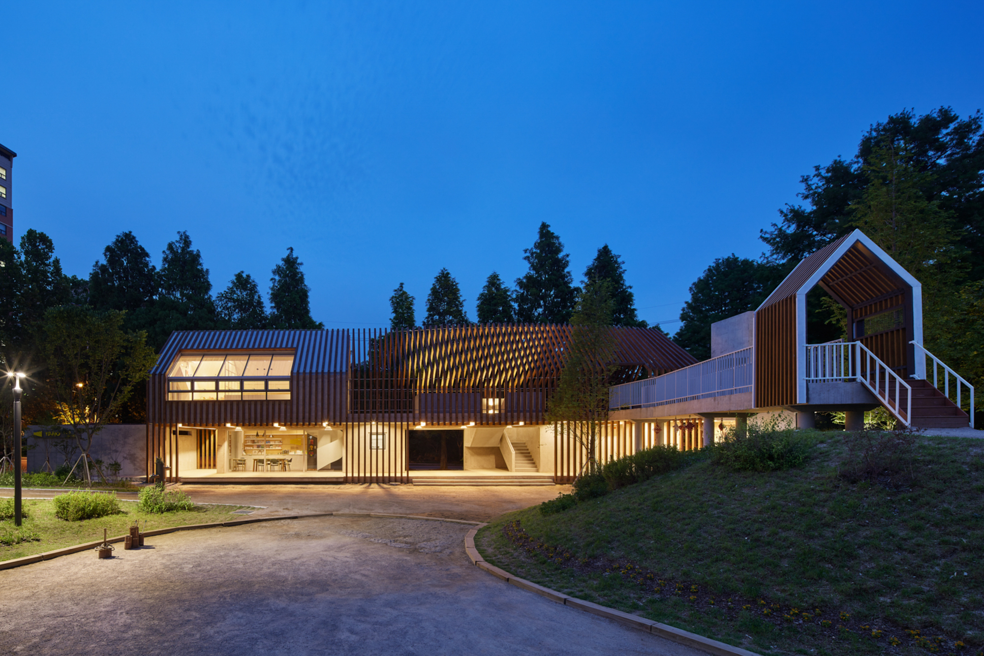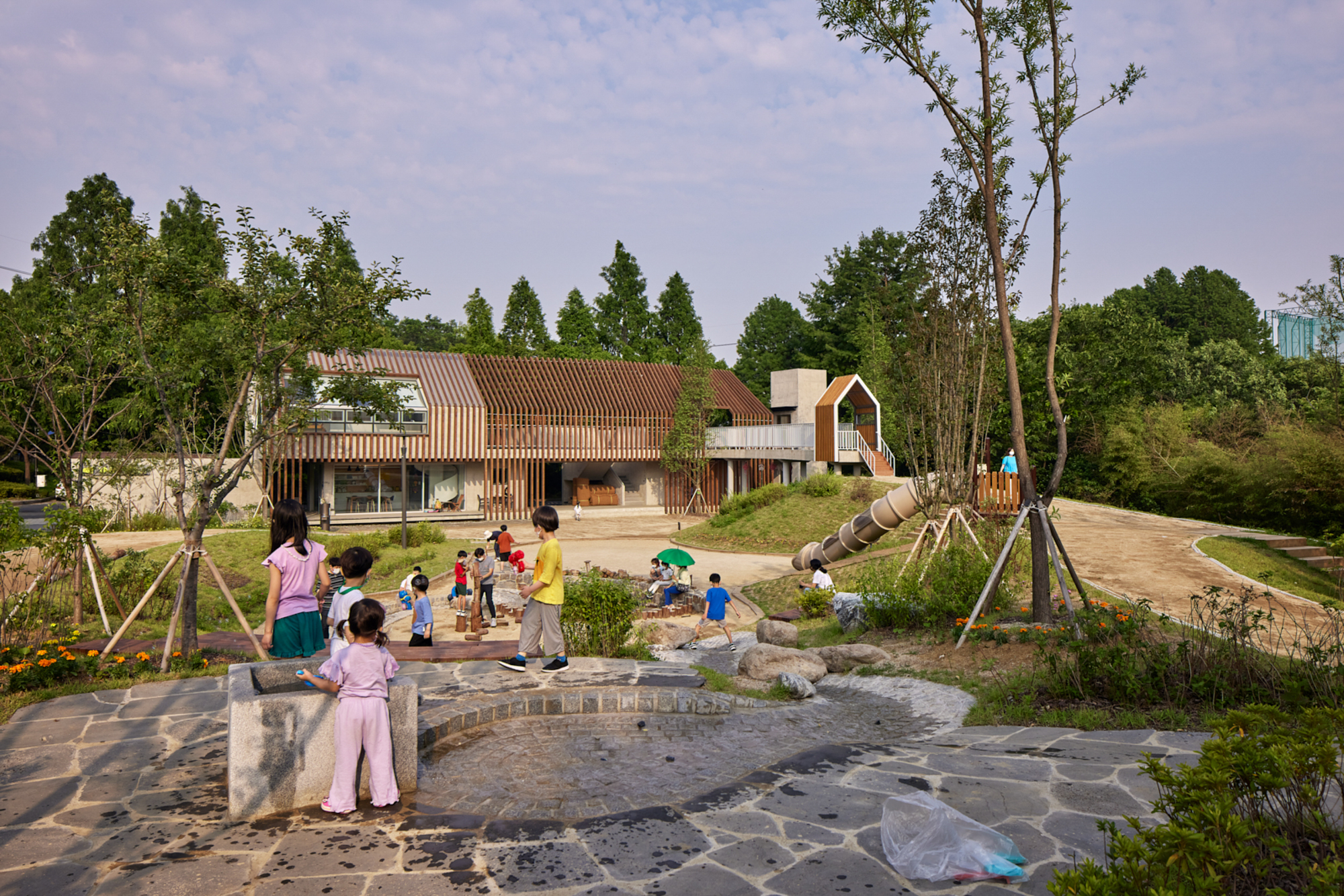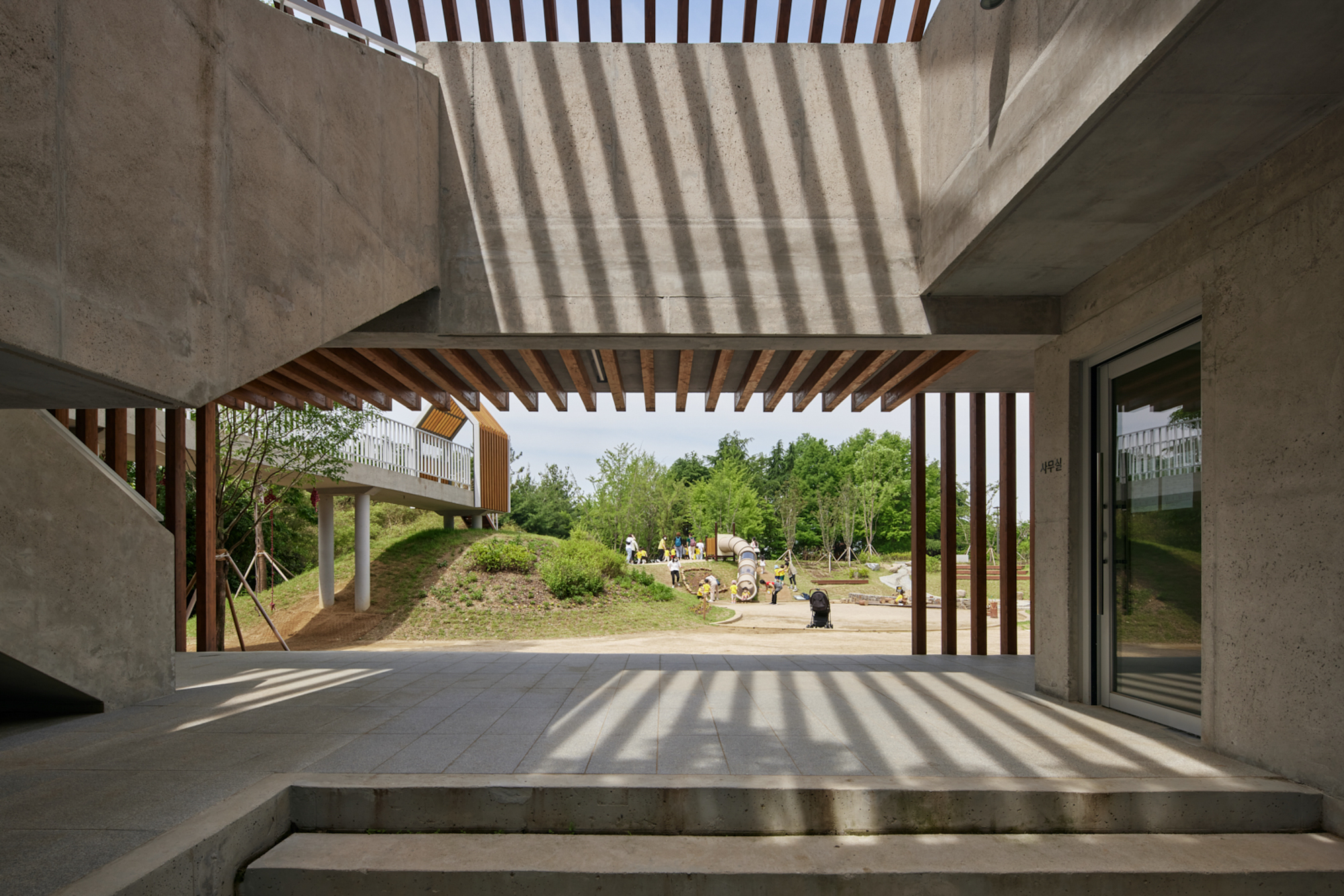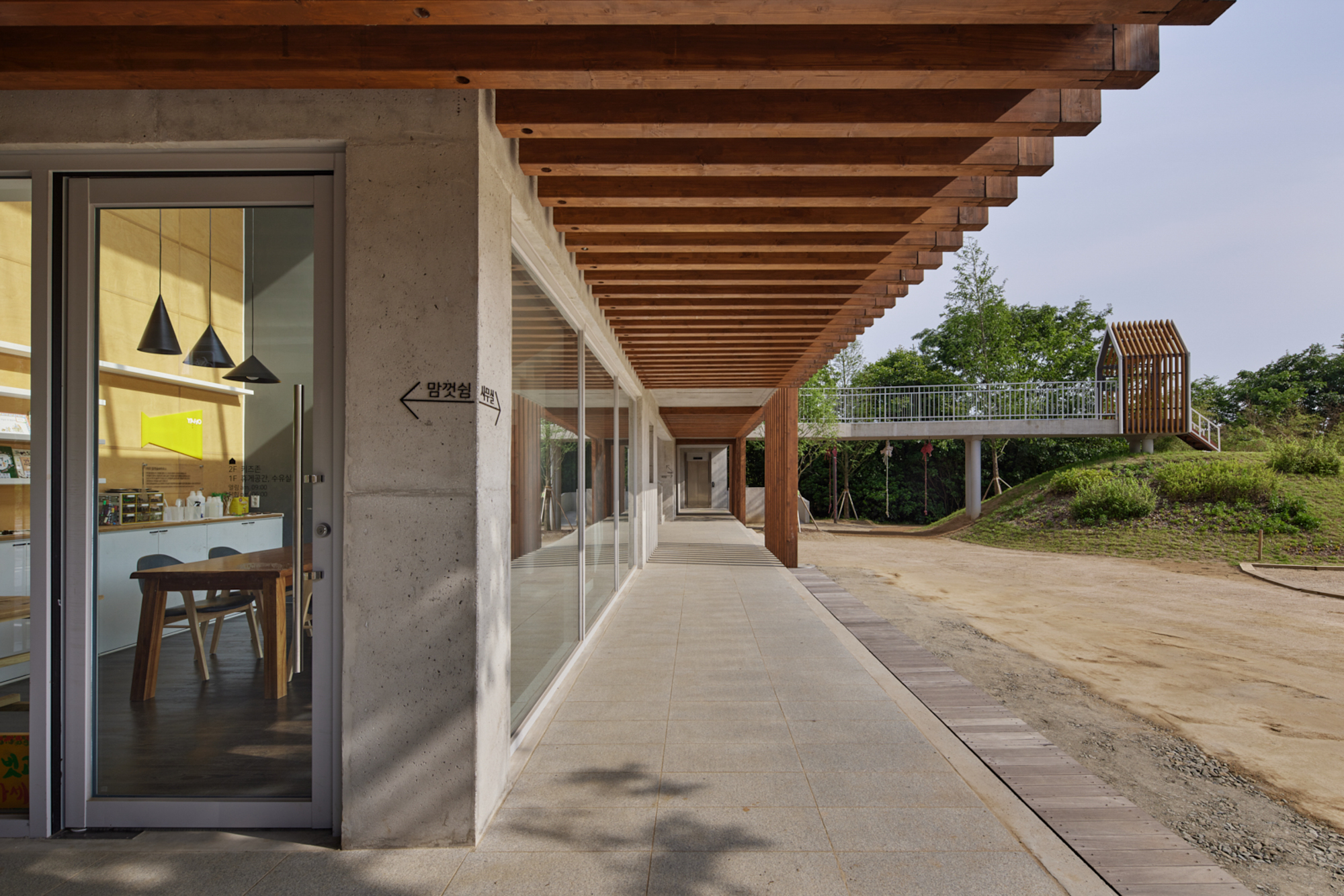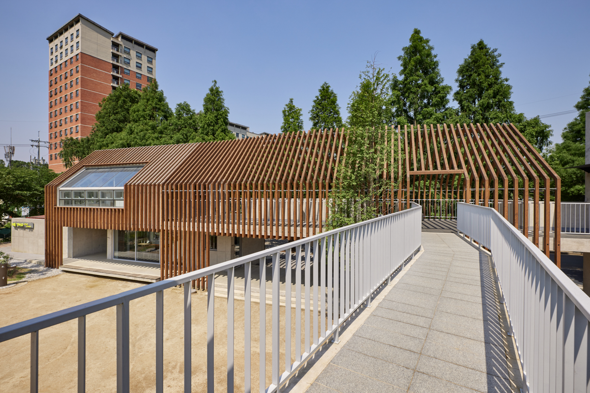 변화하는 박공 목재 프레임(글루램)으로 건축물의 형태를 규정짓고 공간감을 갖게 하였다. 프레임은 적당한 그늘을 만들어주고 안전을 위한 난간 역할을 하며, 각종 놀이활동이 가능하도록 하는 지지대의 역할을 한다. 그네, 집라인과 같은 놀이기구를 만들어 주는 것보다 마음껏 뛰어놀 수 있는 공간을 제공하는 것이 본 프로젝트의 주된 이야기다.■