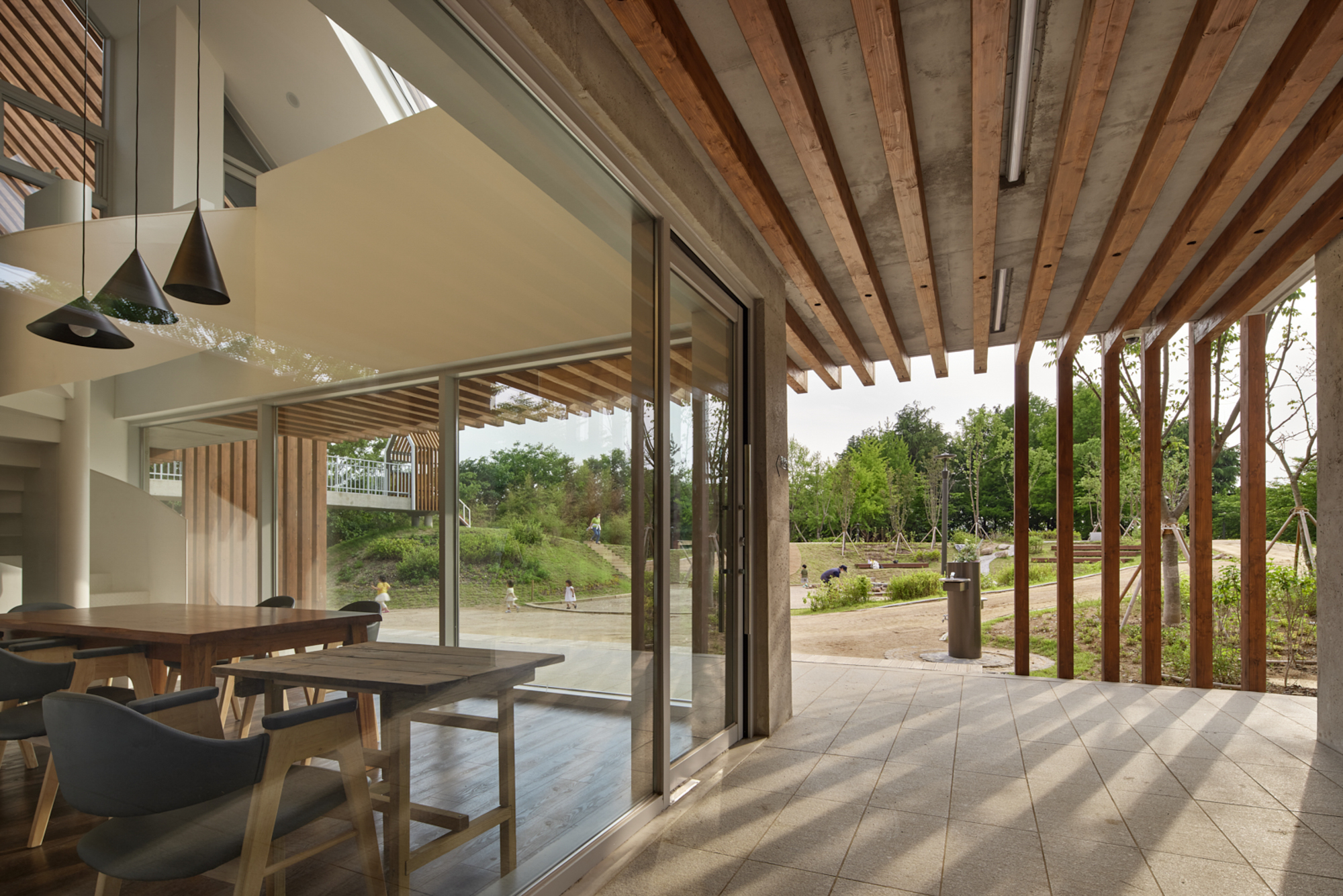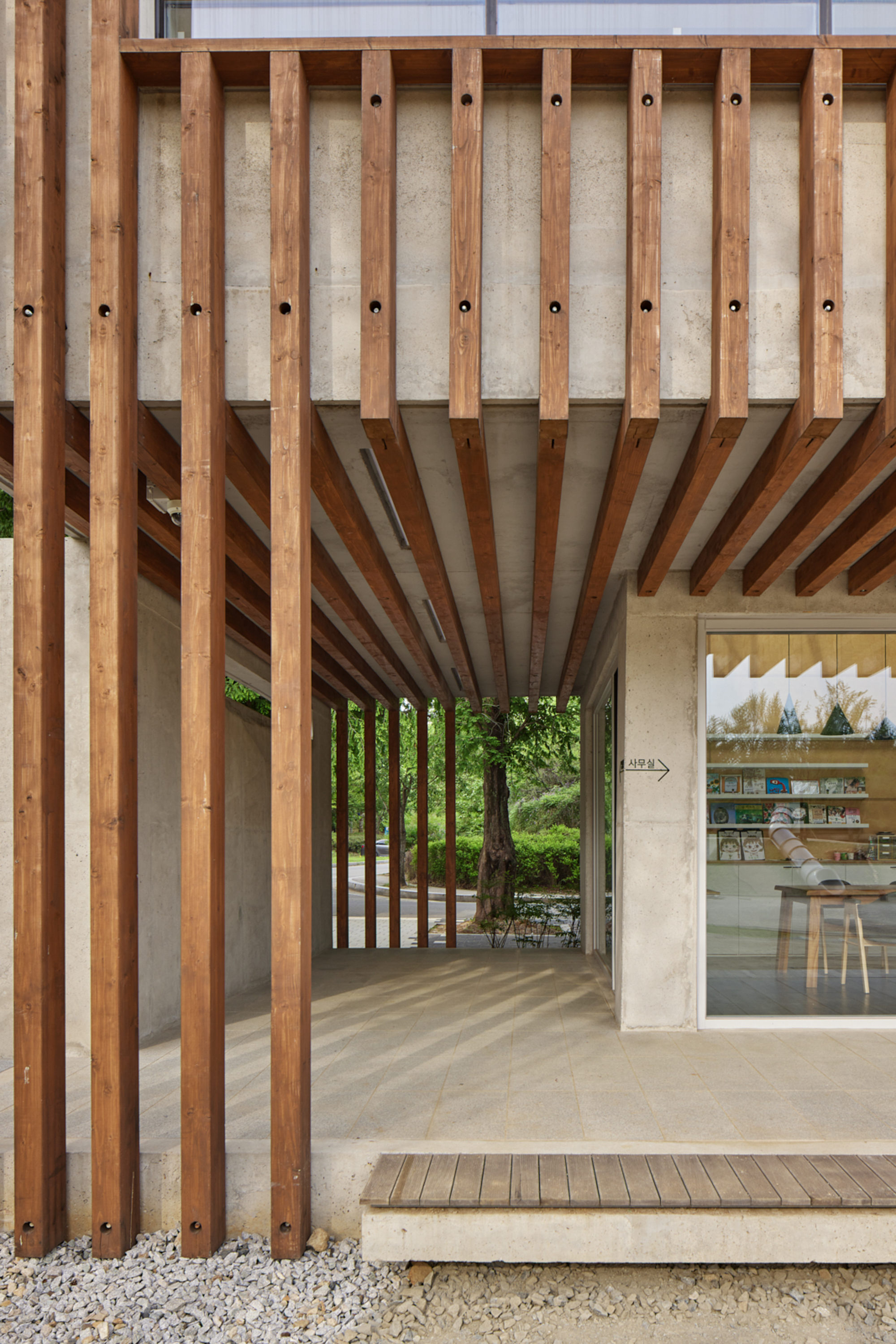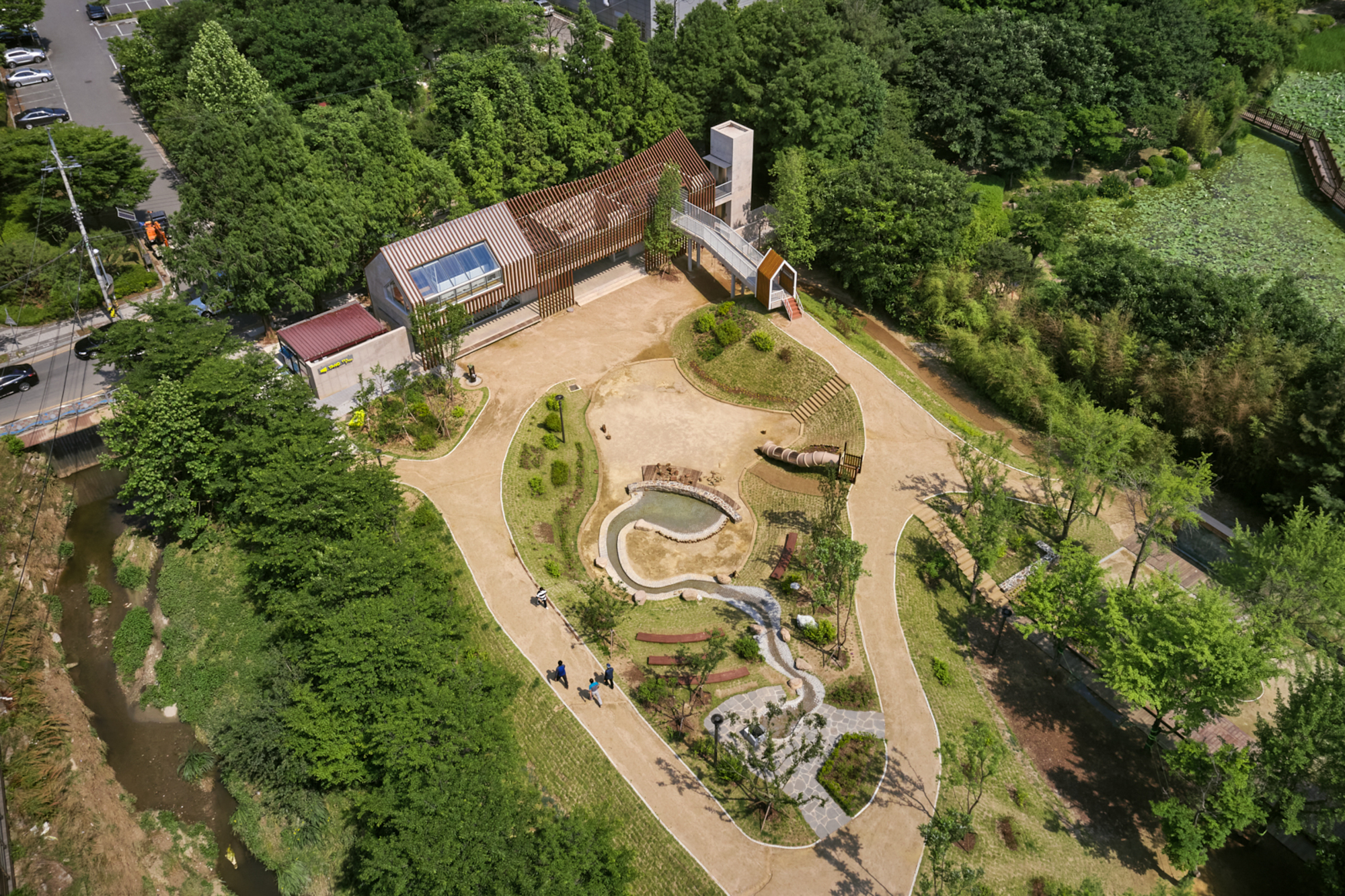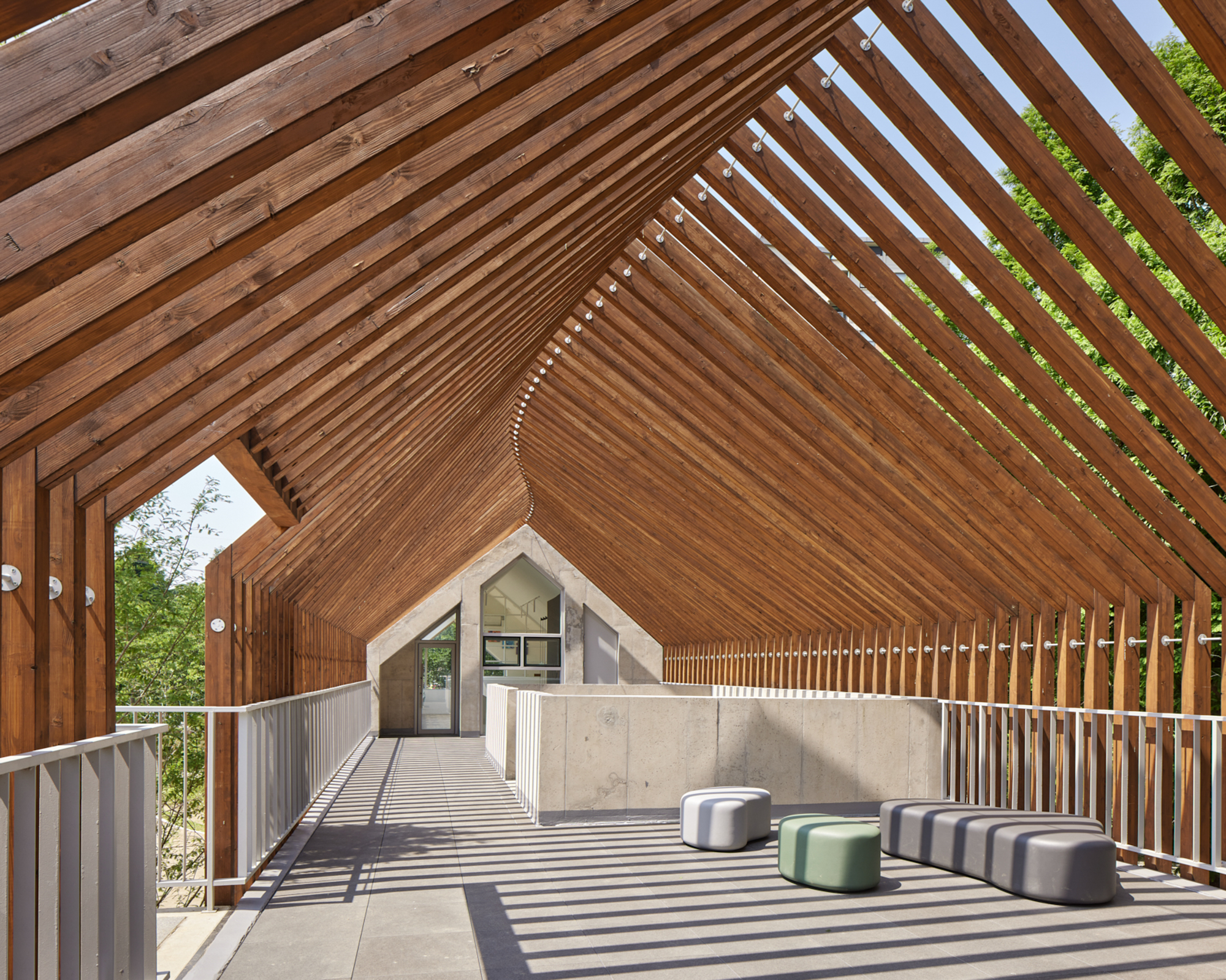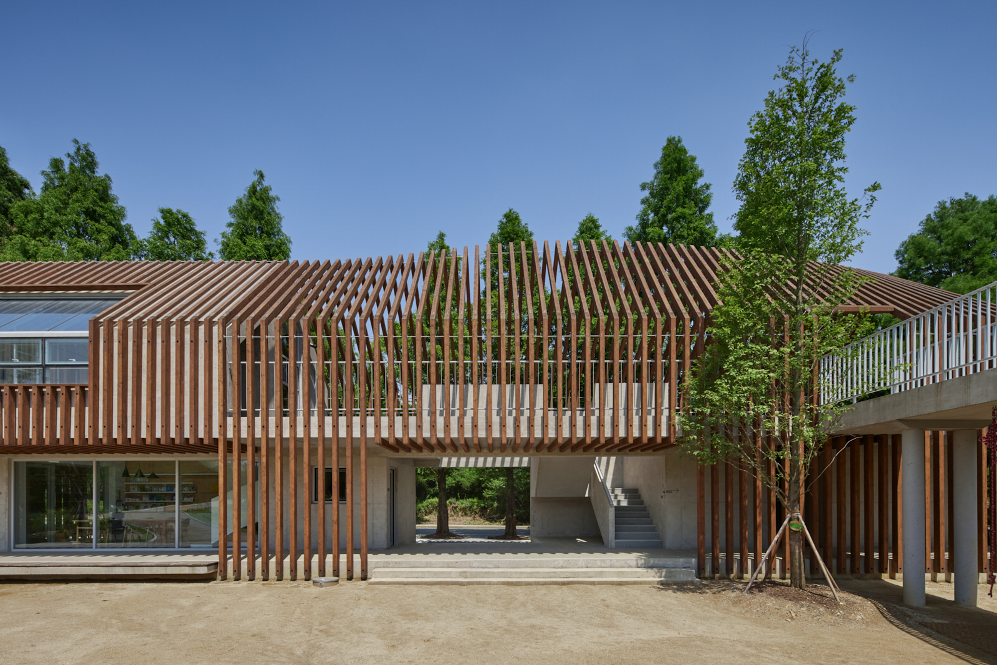 변화하는 박공 목재 프레임(글루램)으로 건축물의 형태를 규정짓고 공간감을 갖게 하였다. 프레임은 적당한 그늘을 만들어주고 안전을 위한 난간 역할을 하며, 각종 놀이활동이 가능하도록 하는 지지대의 역할을 한다. 그네, 집라인과 같은 놀이기구를 만들어 주는 것보다 마음껏 뛰어놀 수 있는 공간을 제공하는 것이 본 프로젝트의 주된 이야기다.■