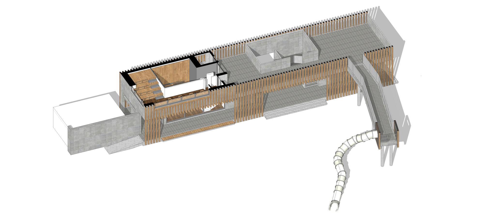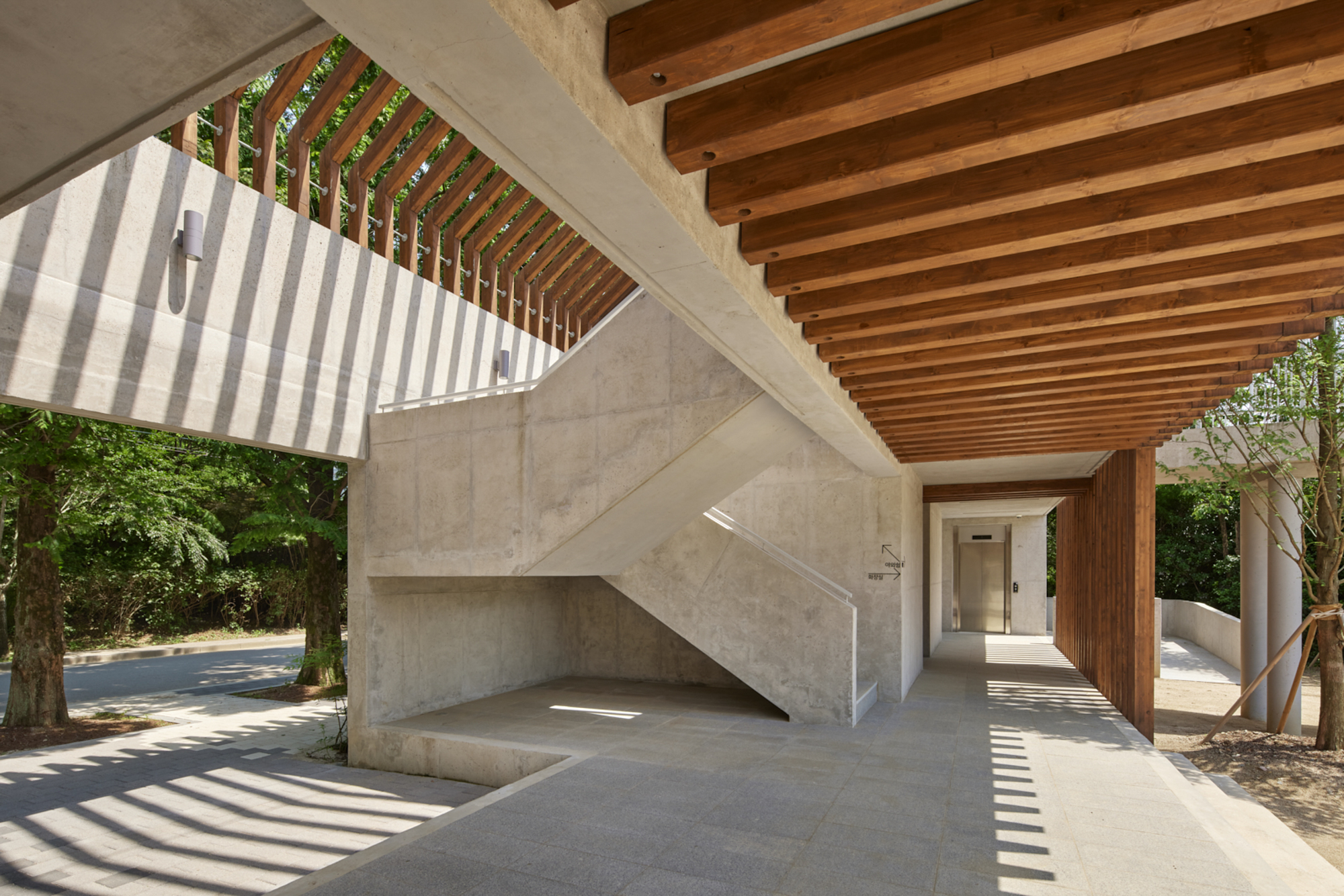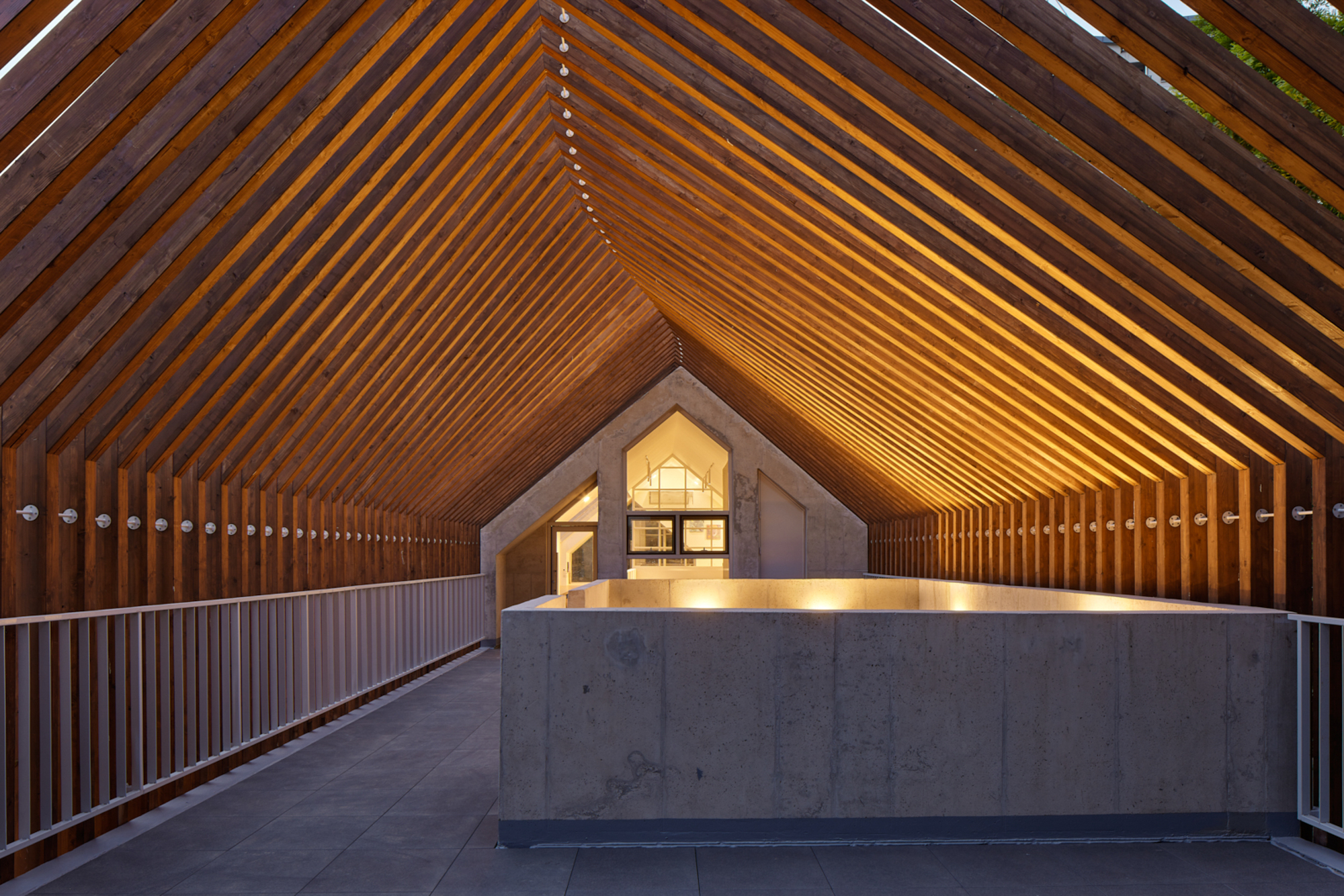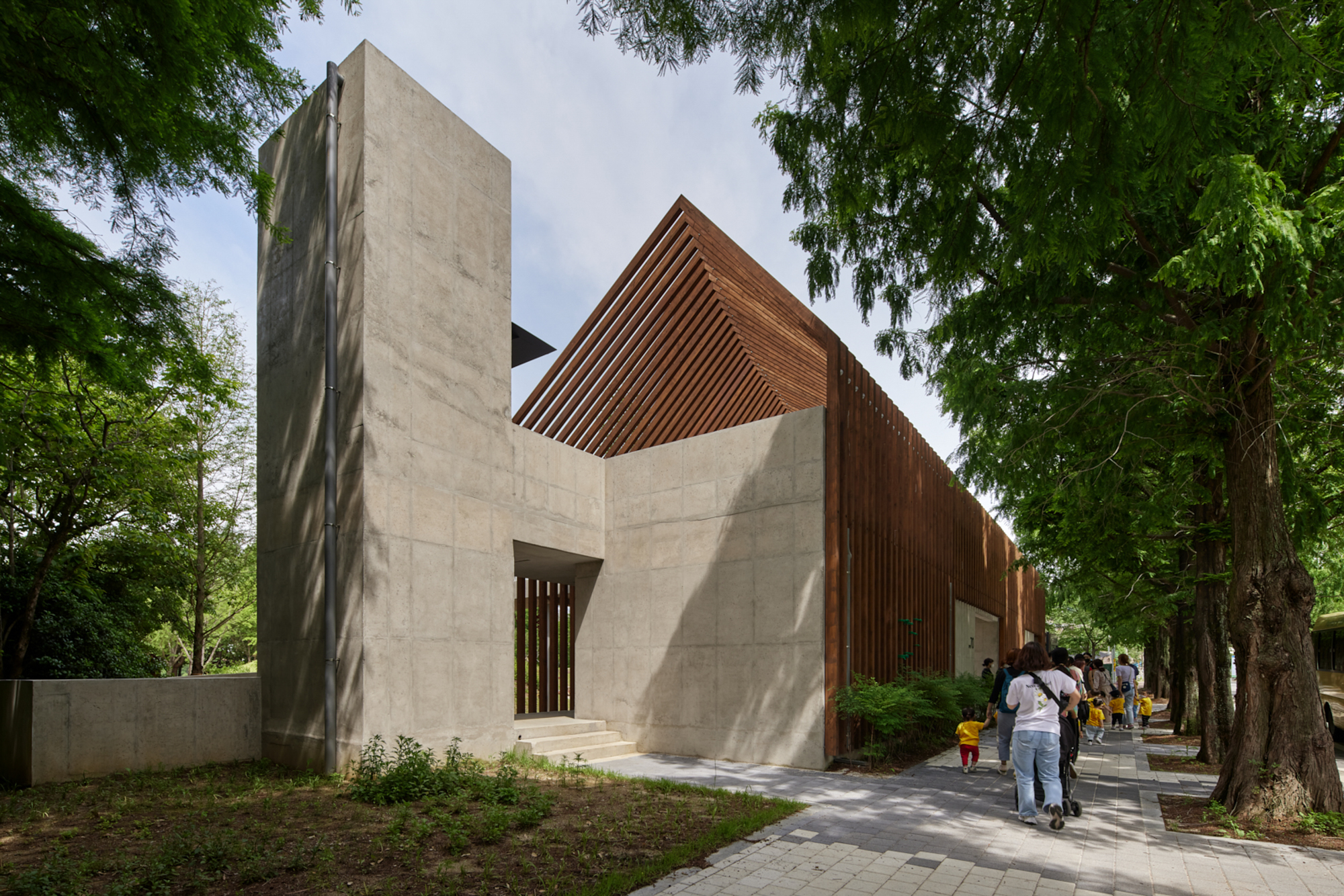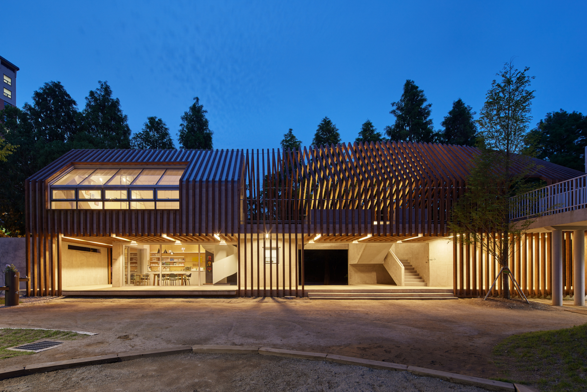 변화하는 박공 목재 프레임(글루램)으로 건축물의 형태를 규정짓고 공간감을 갖게 하였다. 프레임은 적당한 그늘을 만들어주고 안전을 위한 난간 역할을 하며, 각종 놀이활동이 가능하도록 하는 지지대의 역할을 한다. 그네, 집라인과 같은 놀이기구를 만들어 주는 것보다 마음껏 뛰어놀 수 있는 공간을 제공하는 것이 본 프로젝트의 주된 이야기다.■