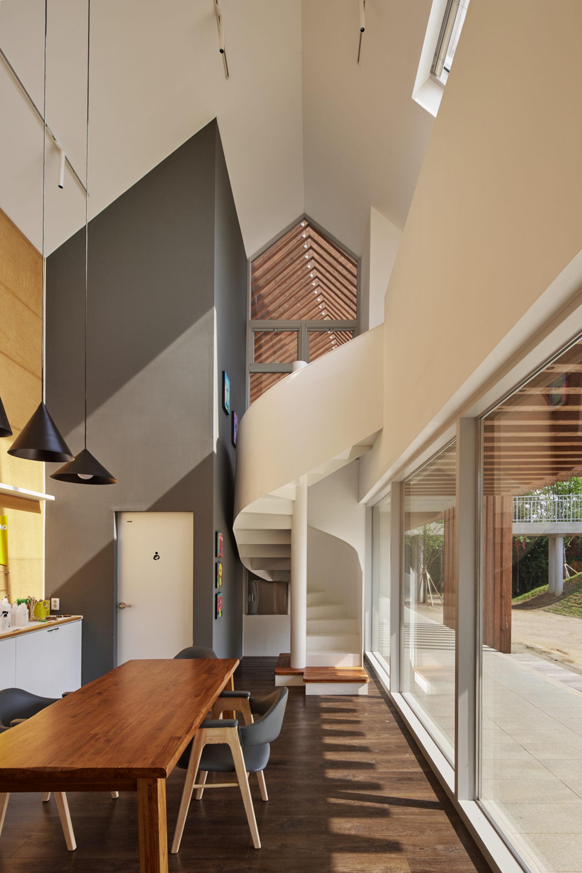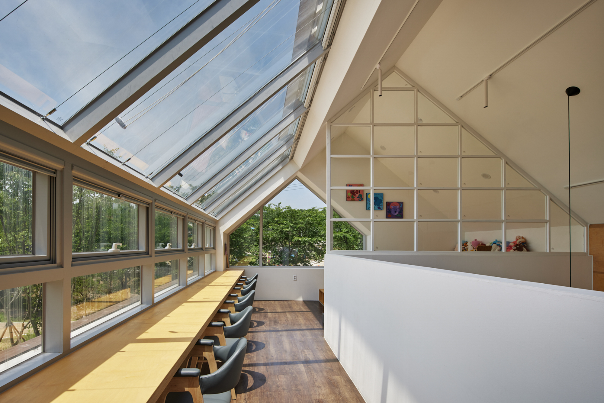 놀이 공간을 만드는 건축 장치는 틈과 프레임이다. 물리적으로 꼭 필요한 실내공간만을 넣으면서 실내로 규정되는 공간을 최소화하고, 외부공간과 사이공간 '틈'을 최대한 확보하였다. 틈은 이동이 목적이 되는 공간이 되기도 하고 머무르기도 하는 부피가 있는 공간이다. 때론 활동이 이루어지지 않아도 시야 및 음향이 통과되는 공간이 되기도 한다. 틈을 만들어준 것은 아이들이 일방적인 방향성을 갖는 움직임이 아닌 사방팔방으로 뛰어놀 수 있는 공간이 되길 바랐기 때문이다.