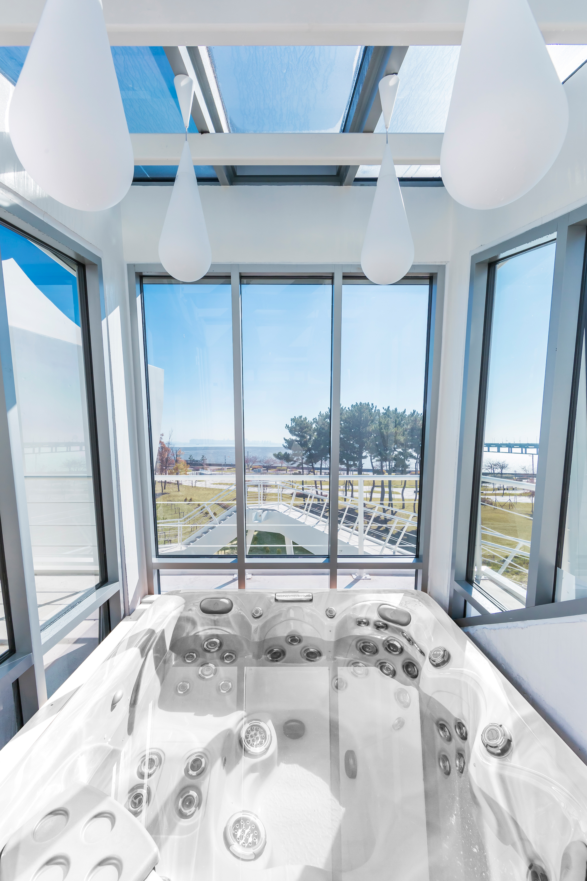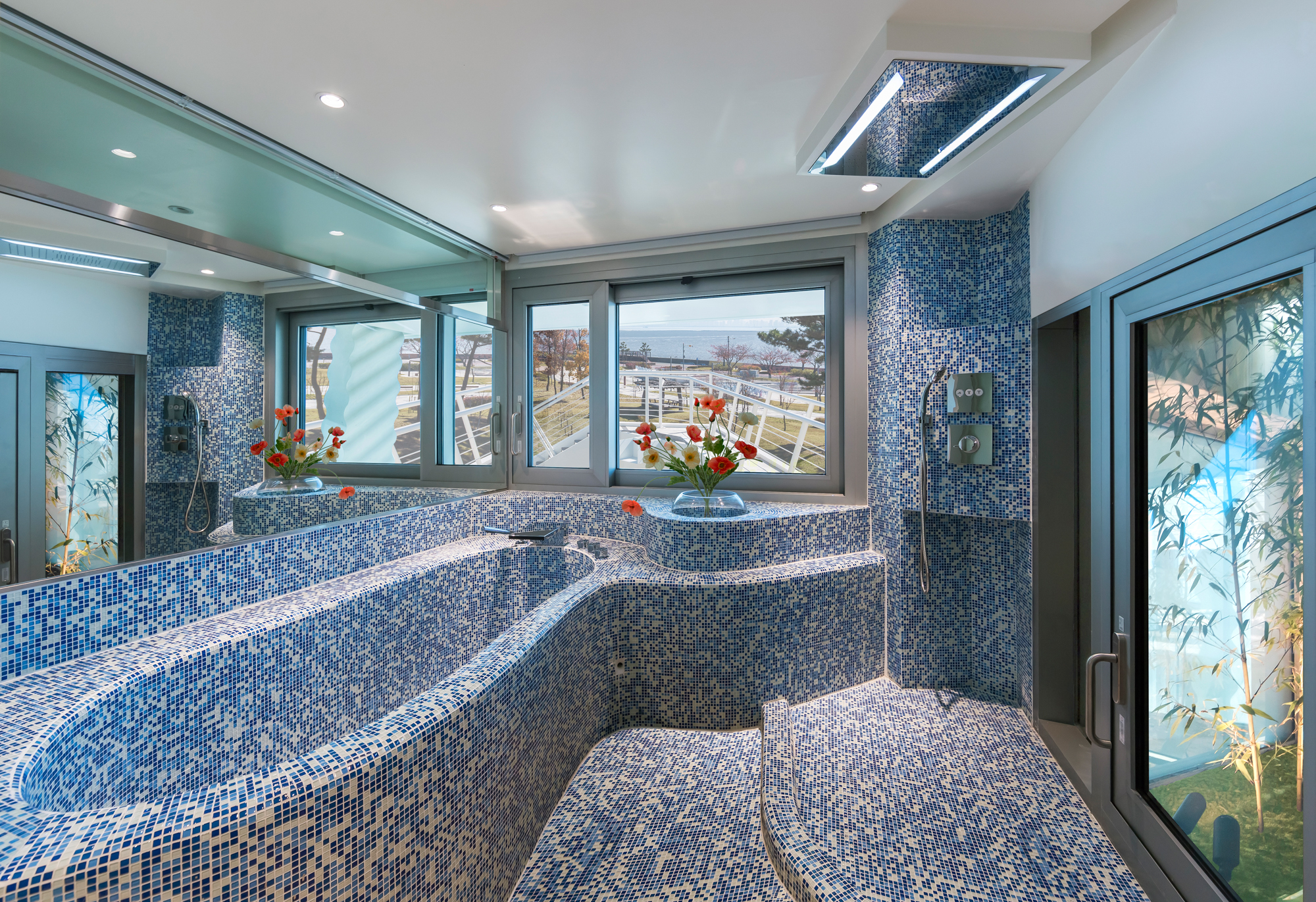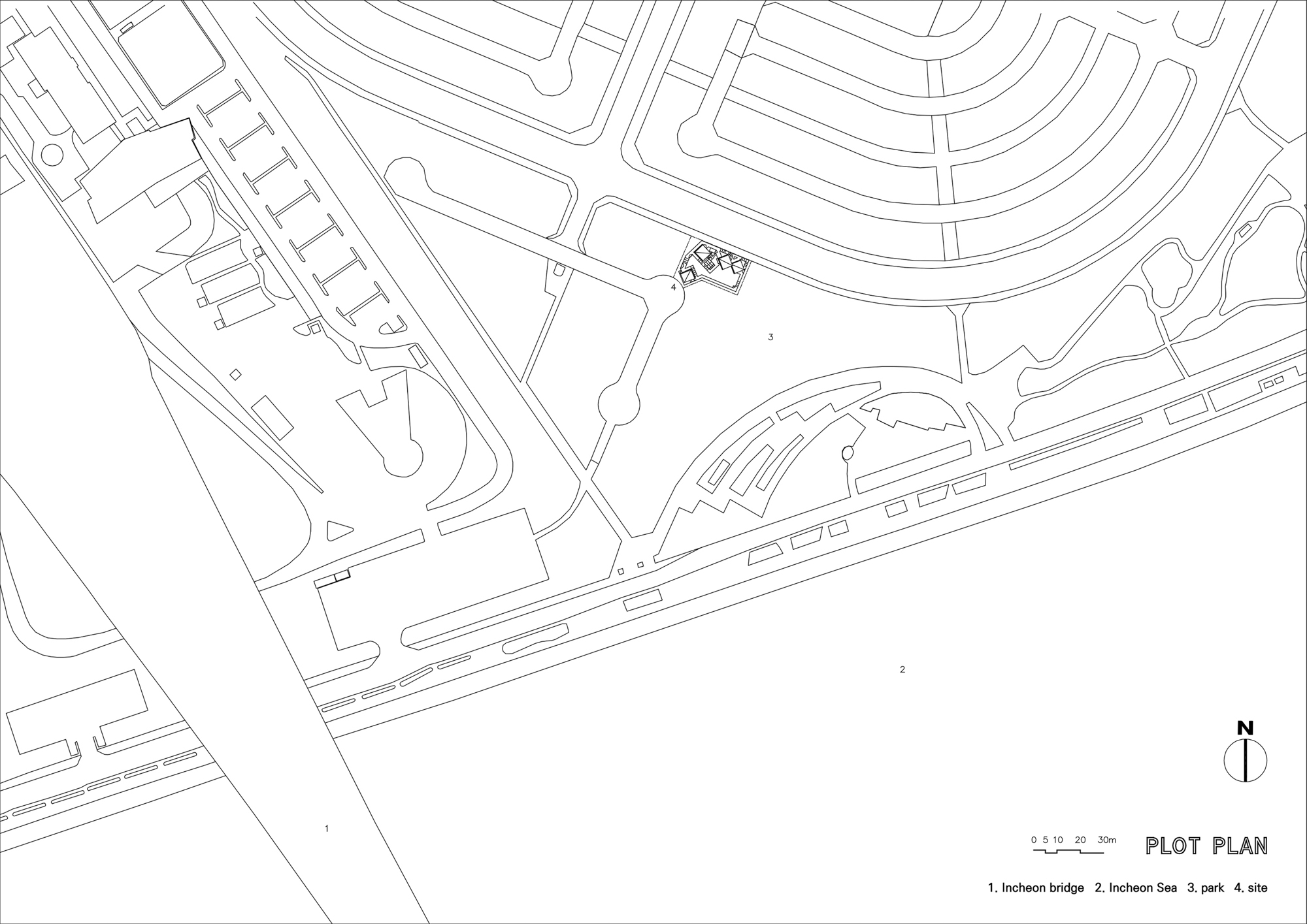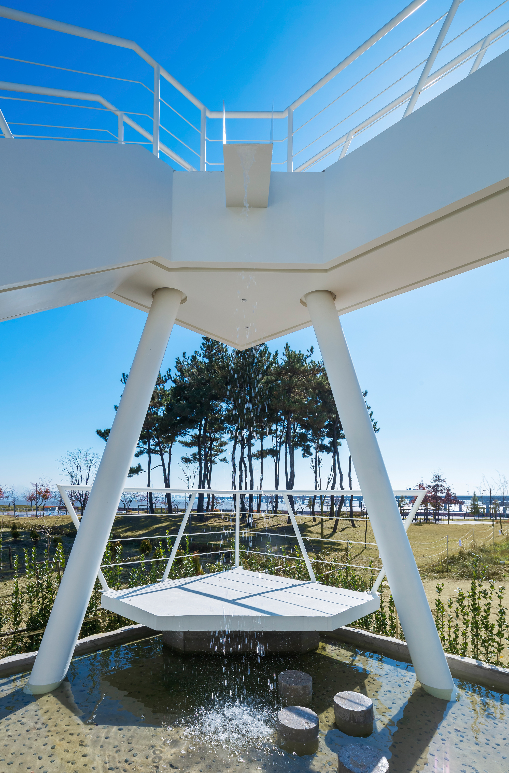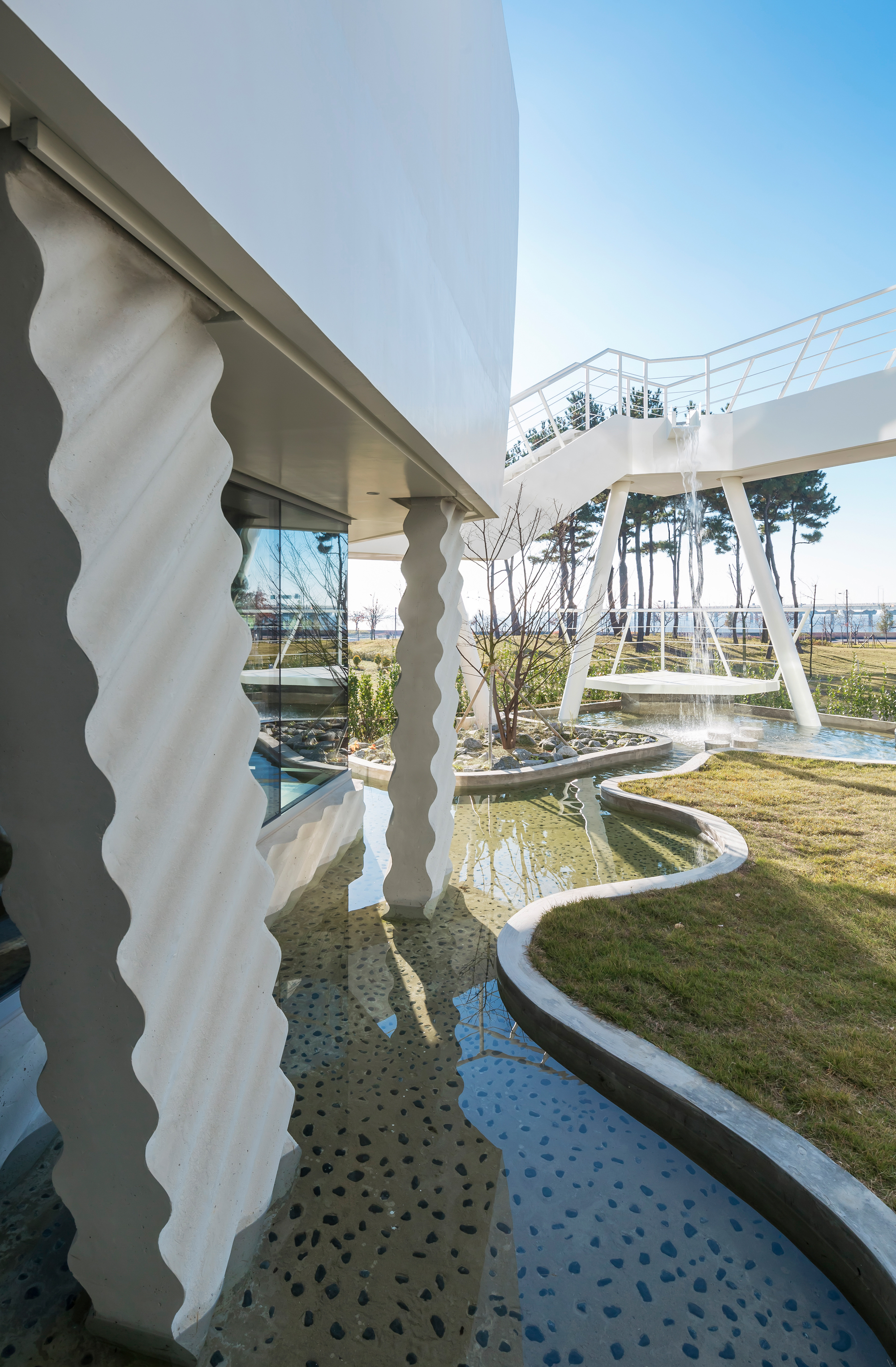 설계한 연못과 실개천 그리고 폭포를 통한 물의 도입은 바다와 건축물 사이를 바다처럼 만들어 시각적으로 연결하는 조경 요소로 계획했다.