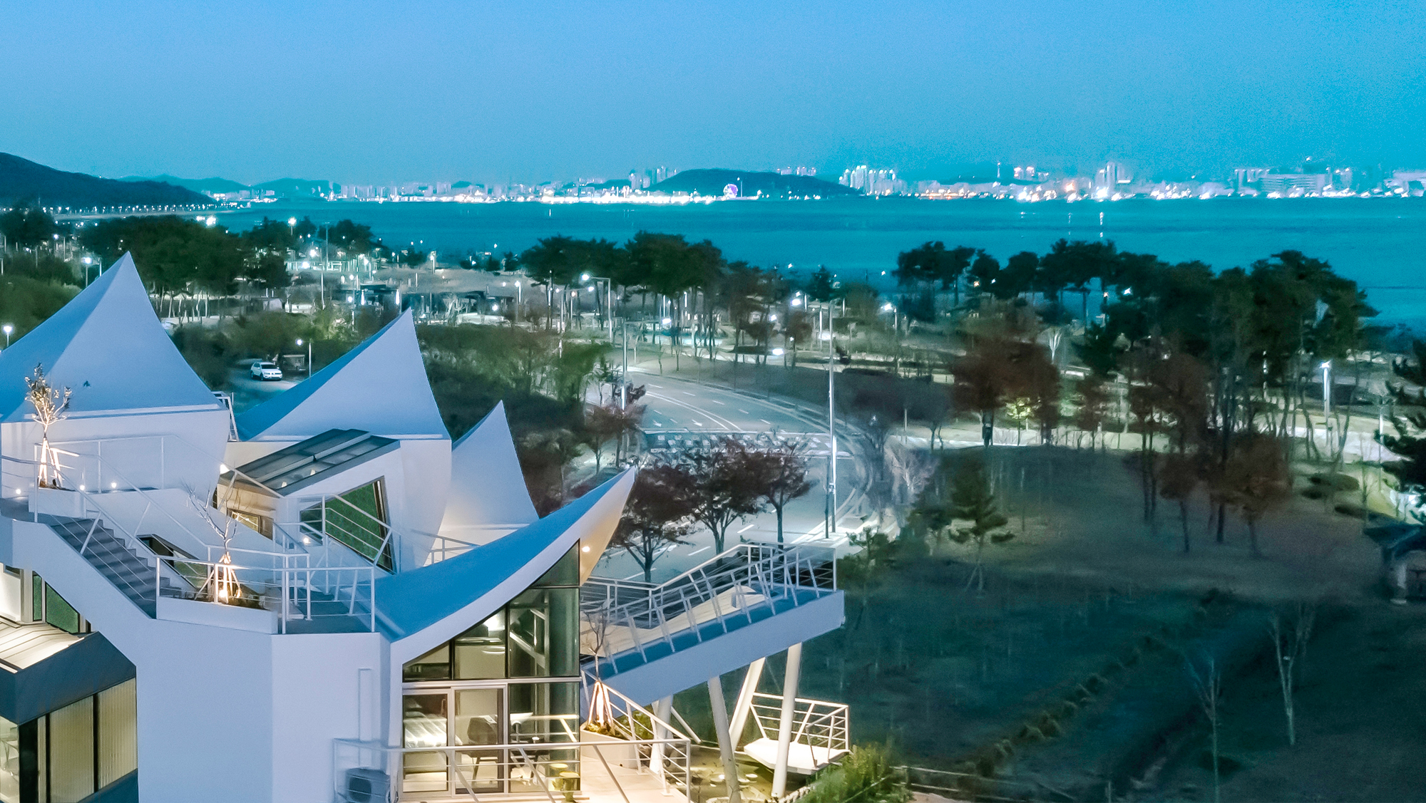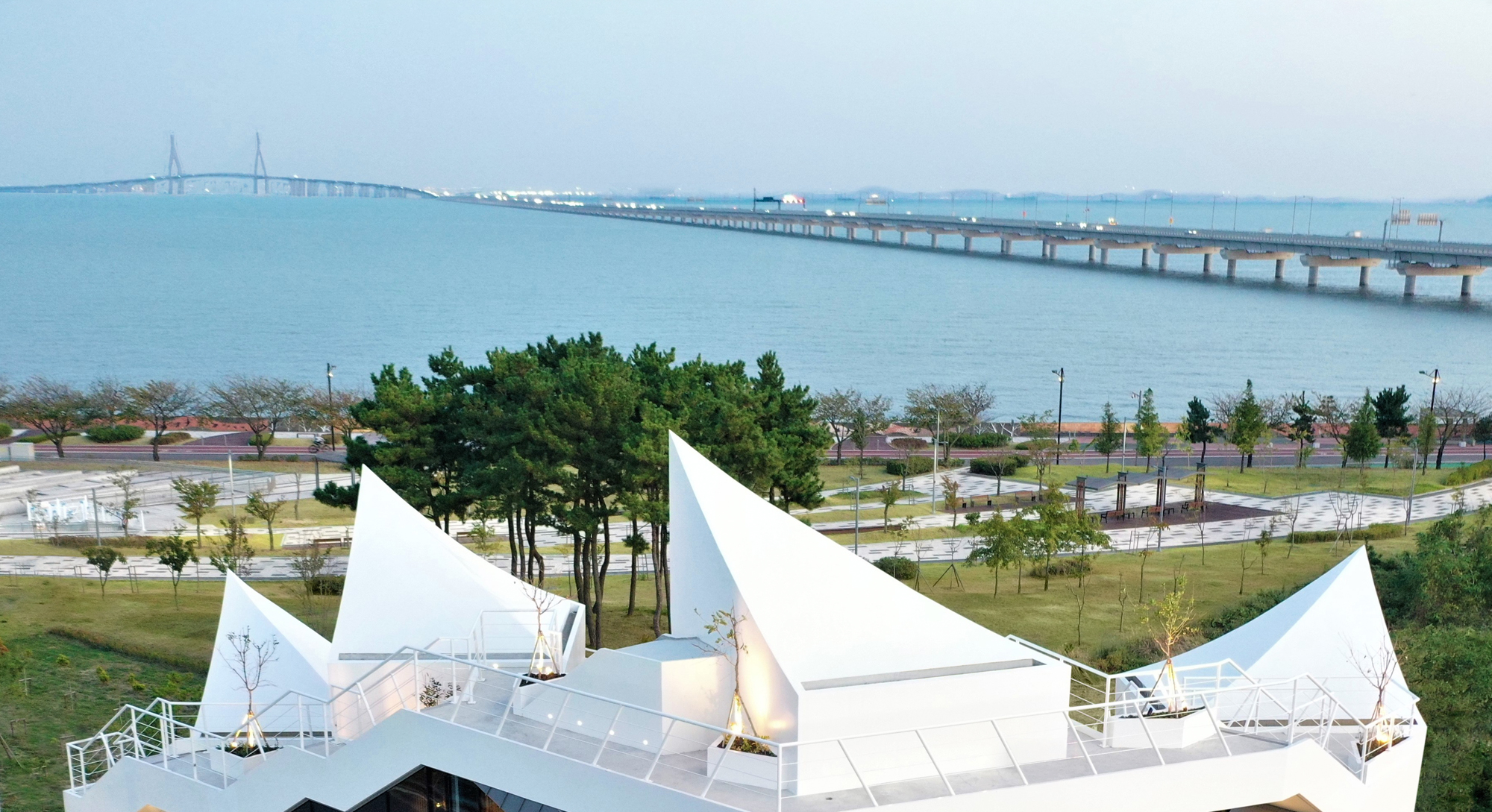 한국전통건축의 지붕 곡선인 마이너스 곡선을 바람의 힘을 품고 있는 역동적인 돛과 동일시하여 전통건축의 조형성과 바닷가의 공간적 특성을 동시에 표현하고자 했다.