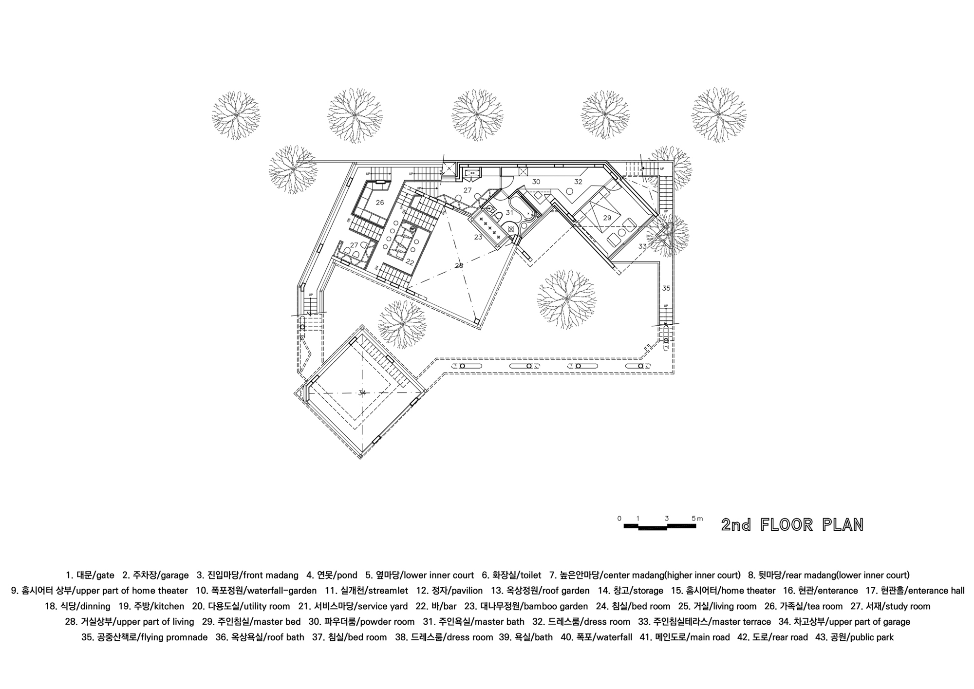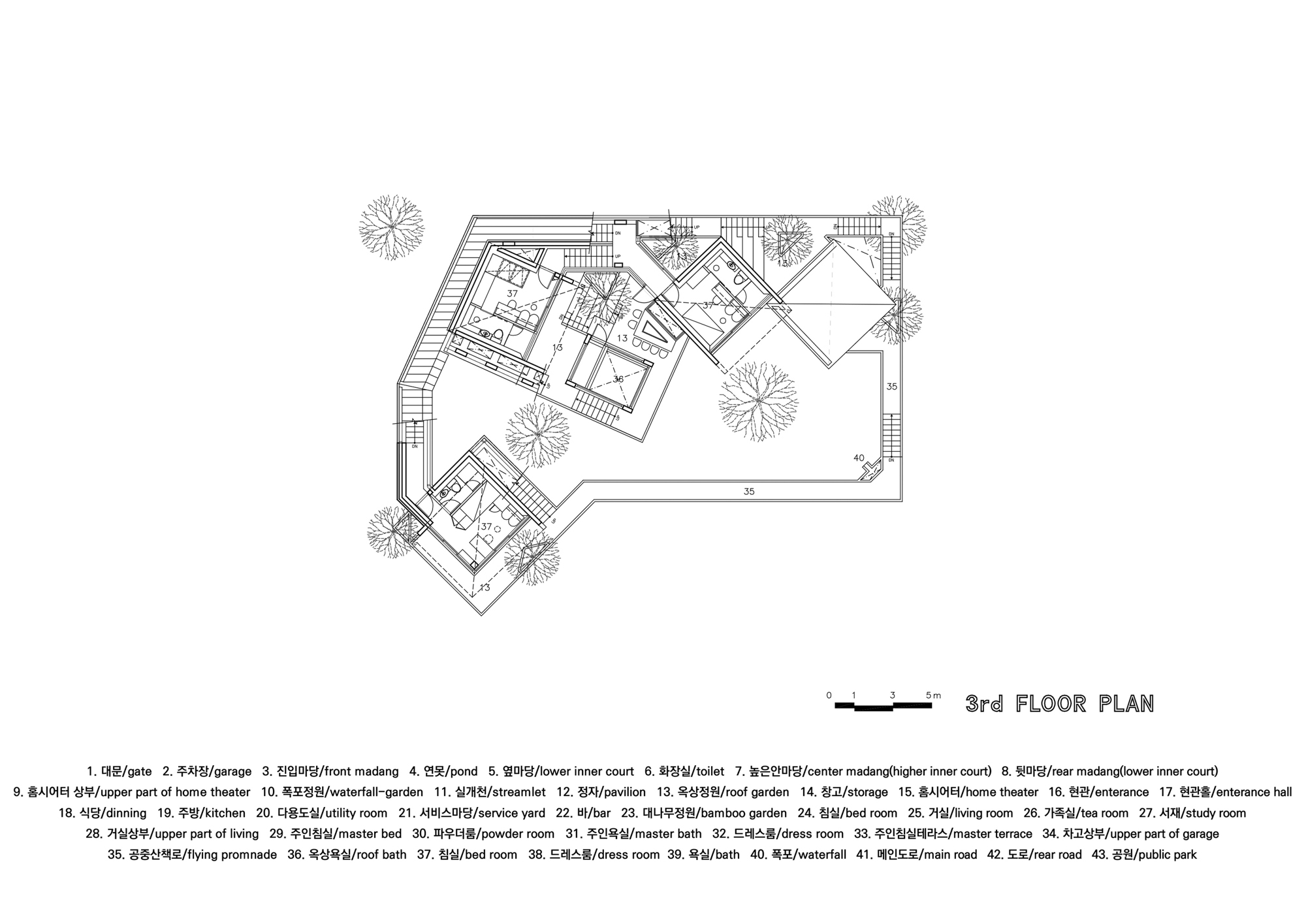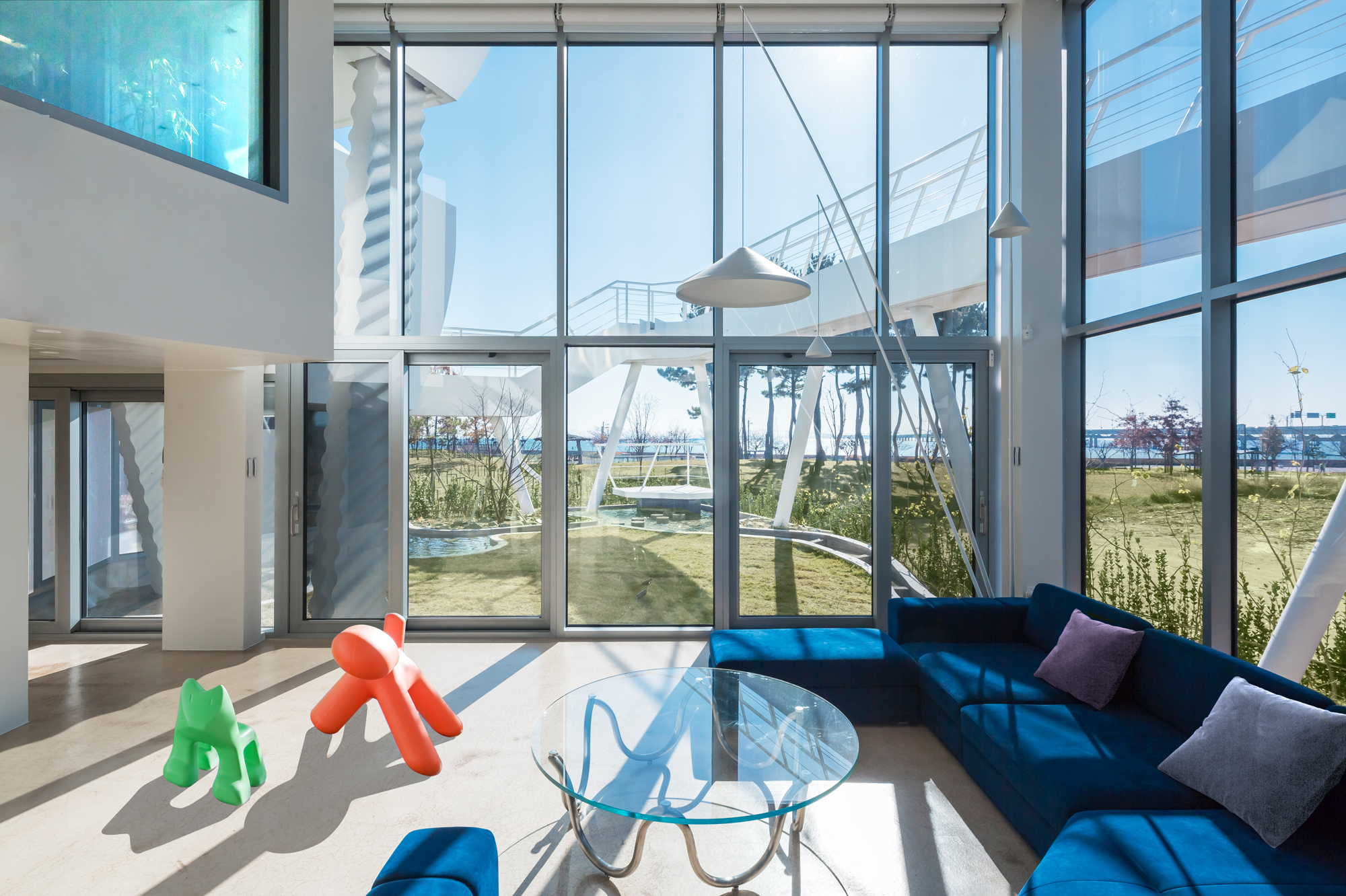 현대사회에서, 일상 속 가족 간의 만남의 빈도는 많지 않다. 바다를 바라보는 극장식 거실공간 속에 가족구성원들의 서재, 가족실, 바 등의 공적기능을 분산 배치했고, 각 개인의 침실을 가기 위한 동선을 이 극장식 거실 공간을 필연적으로 거치게 하였다. 이러한 계획을 통해 수직적 거실 공간을 바다를 보는 전망대이자 가족의 만남이 이루어지는 친교의 장소로 만들었다.