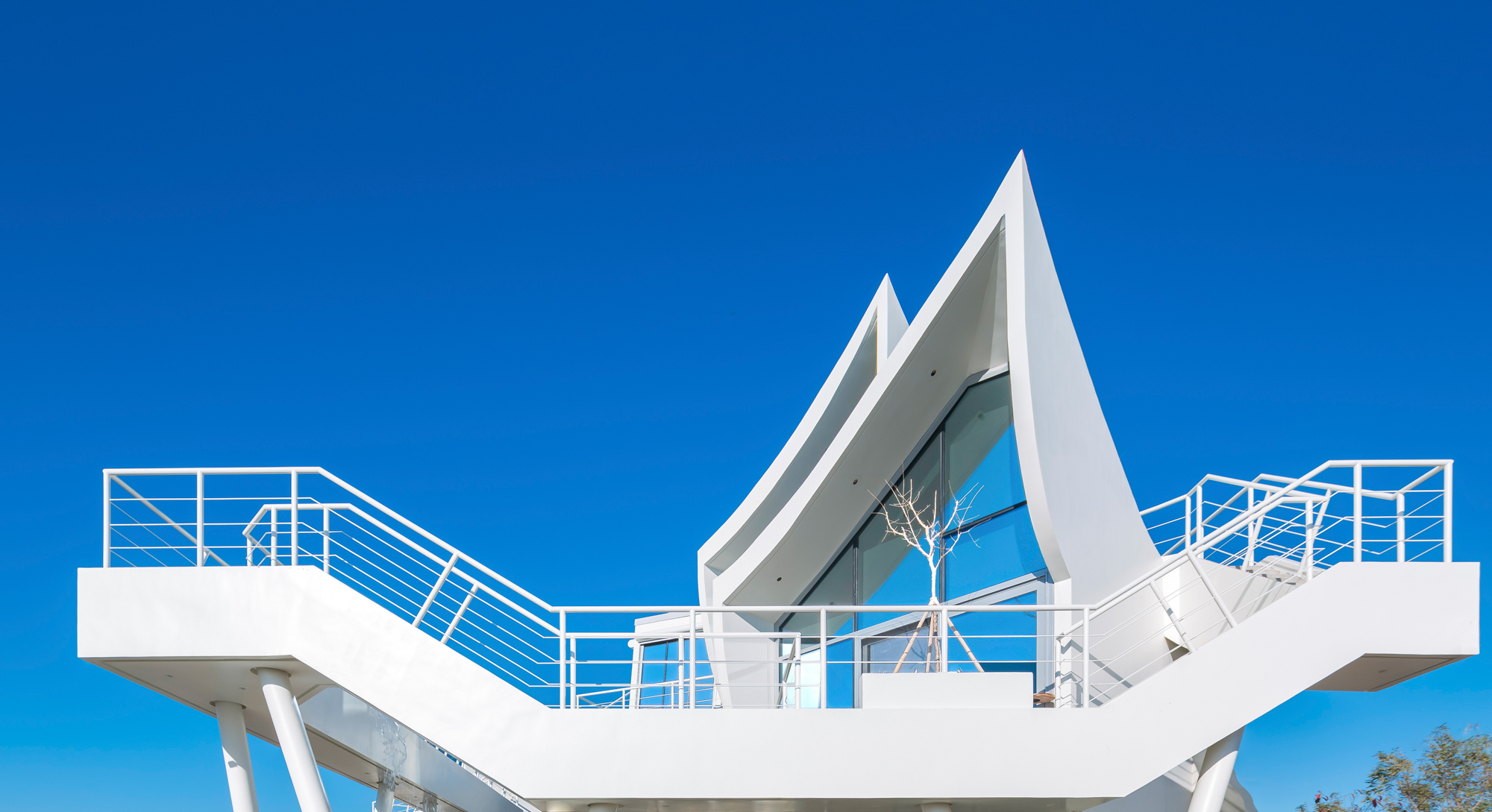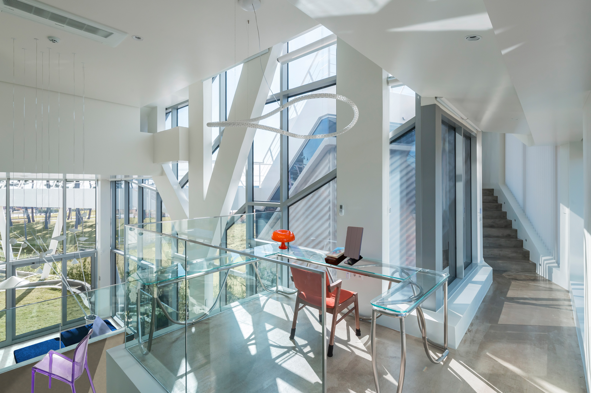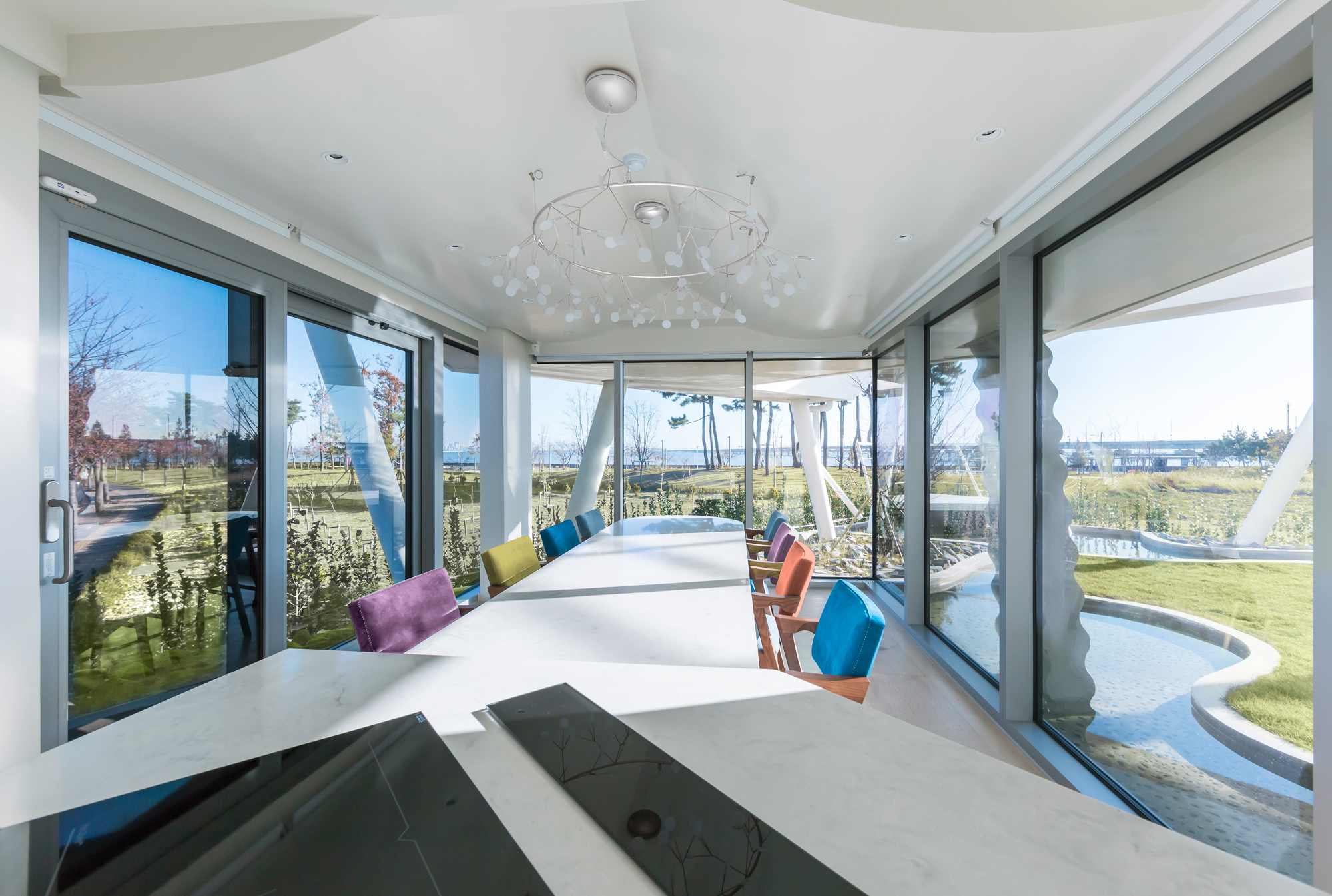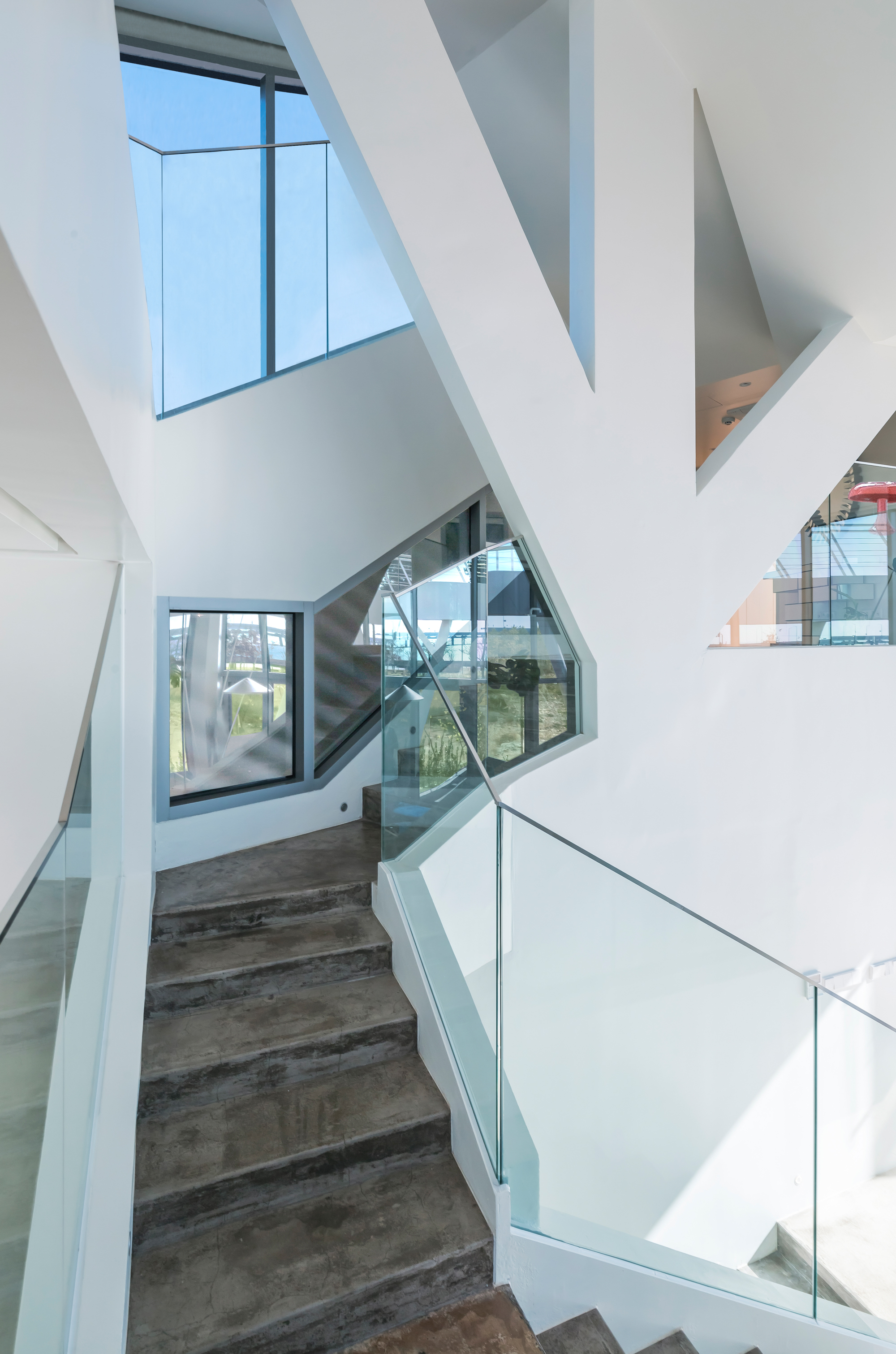 대지 축은 넓은 공원을 사이에 두고 먼바다를 보는 소극적인 풍경을 향해있어 바다는 넓은 공원의 일부 작은 풍경에 불과했다. 최대한 가까운 바다를 보기 위해 인접 대지를 피하고, 이 집의 모든 방의 방향을 서로 다른 각도로 틀었다. 다수의 전망 축이 만들어지면서 모든 가족은 집 어디서든지 바다를 바라보며 각자의 미래를 꿈꾸는 일상적 공간 속에 거주하게 된다. 동시에 바다를 향한 조형적 역동성을 유발한다.