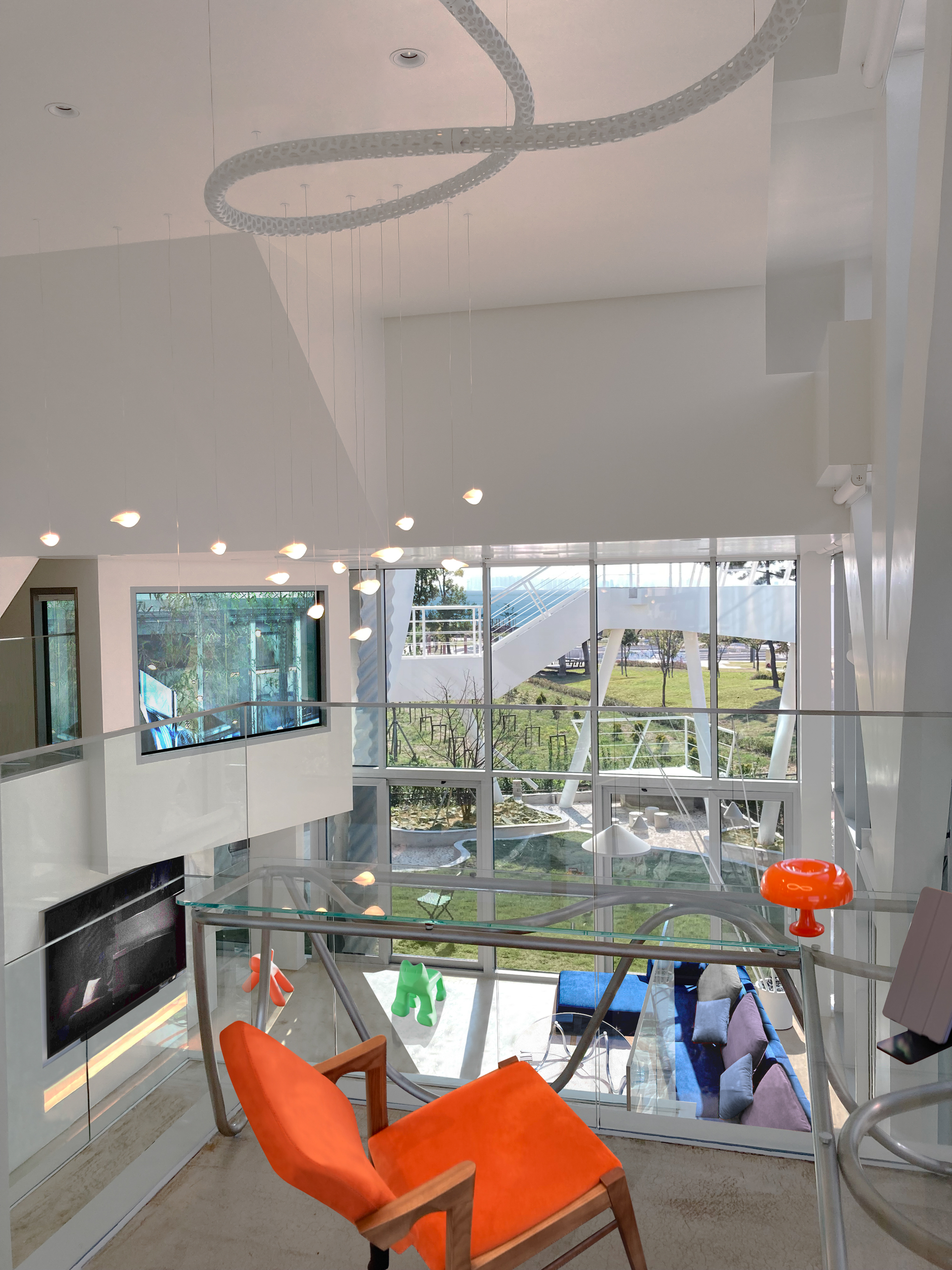 각 층의 여러 레벨에 위치한 개인 침실마다 바다를 즐기는 옥외 테라스가 부속되어있고, 이들은 공중산책로로 상호연결되어 있다. 이 공중산책로는 안마당을 둘러싸 내향적 공간을 구성하는 공간 요소이자 바다를 보는 전망대가 된다.