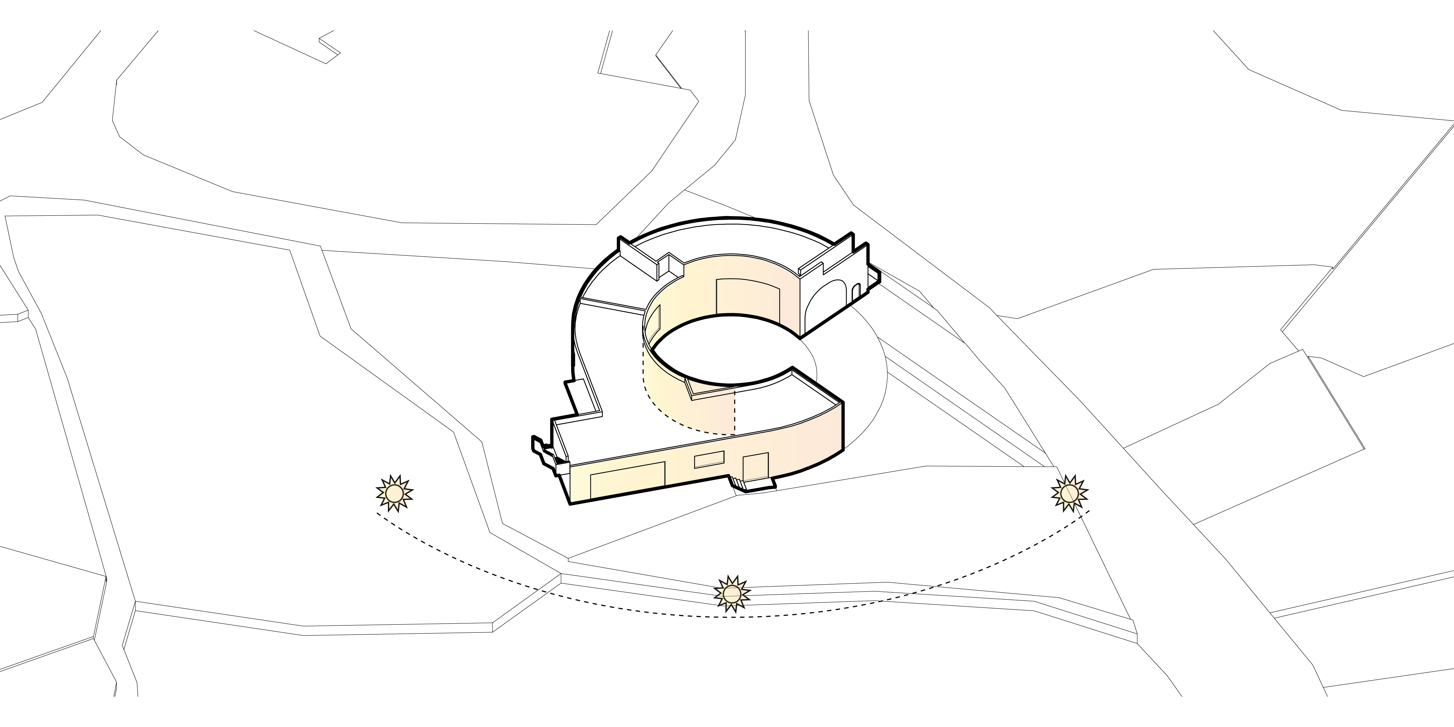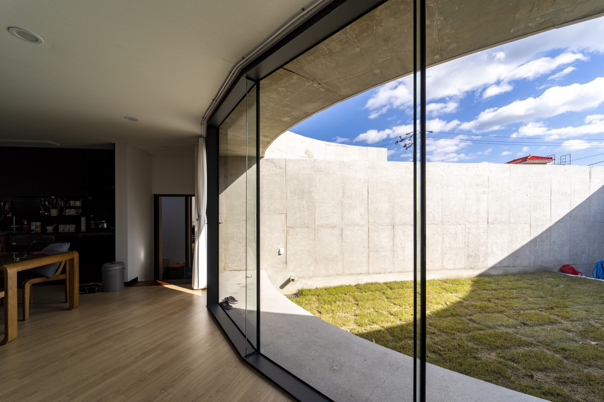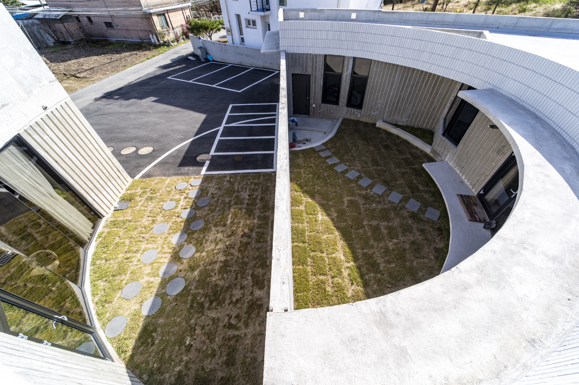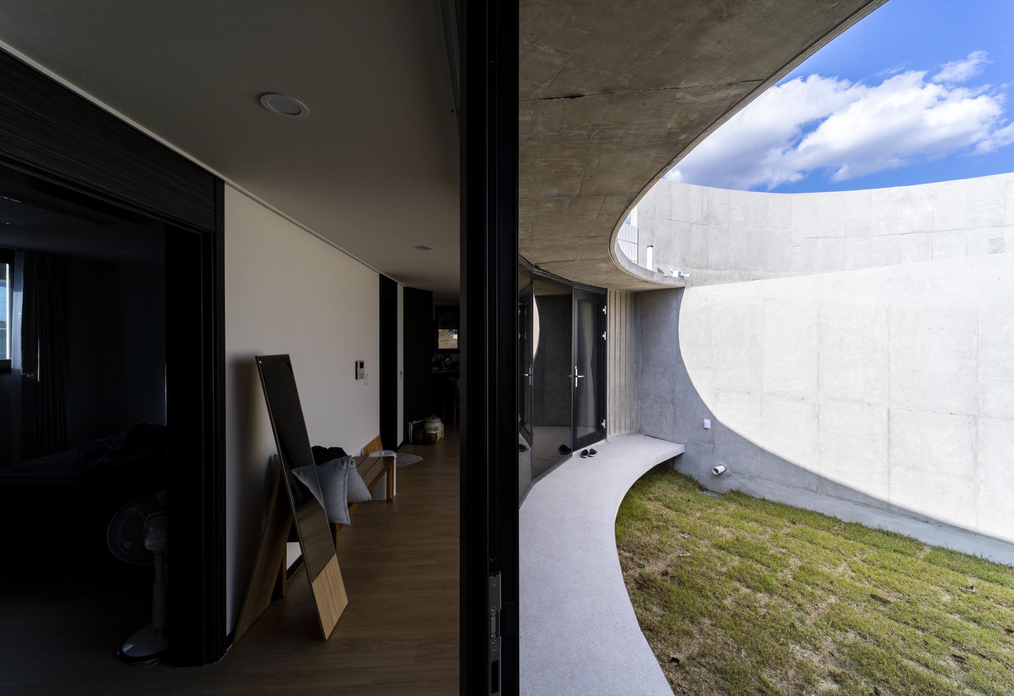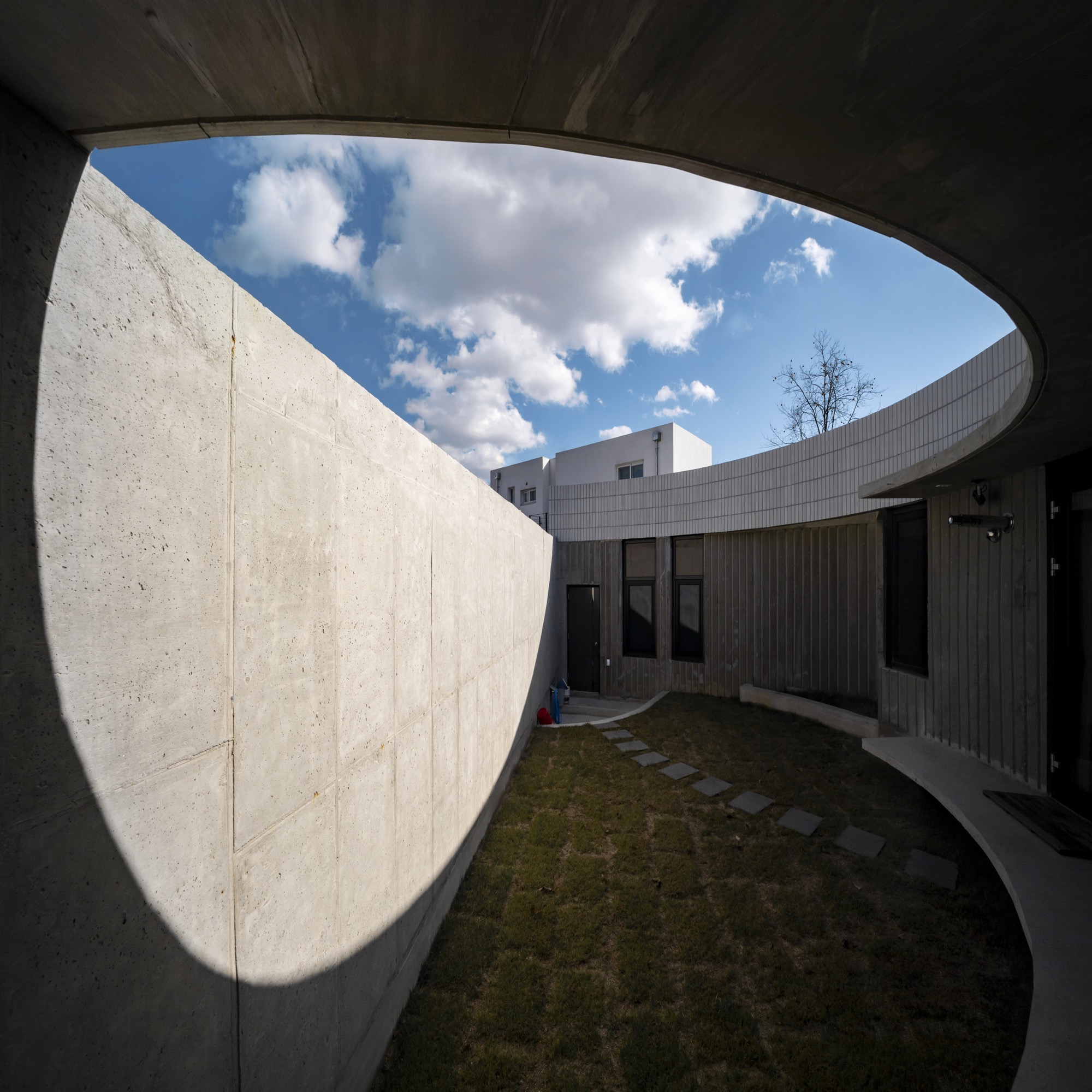 내부 마당인 반원의 중정은 동쪽의 아침 빛은 직접 들어올 수 있는 높이의 벽으로 외부를 차단하는 역할을 한다. 낮부터 저녁까지는 벽에 반사된 빛으로 마당은 밝게 빛난다. 이 내부 마당은 독립된 공간으로 건축주만의 온전한 하루를 만든다.