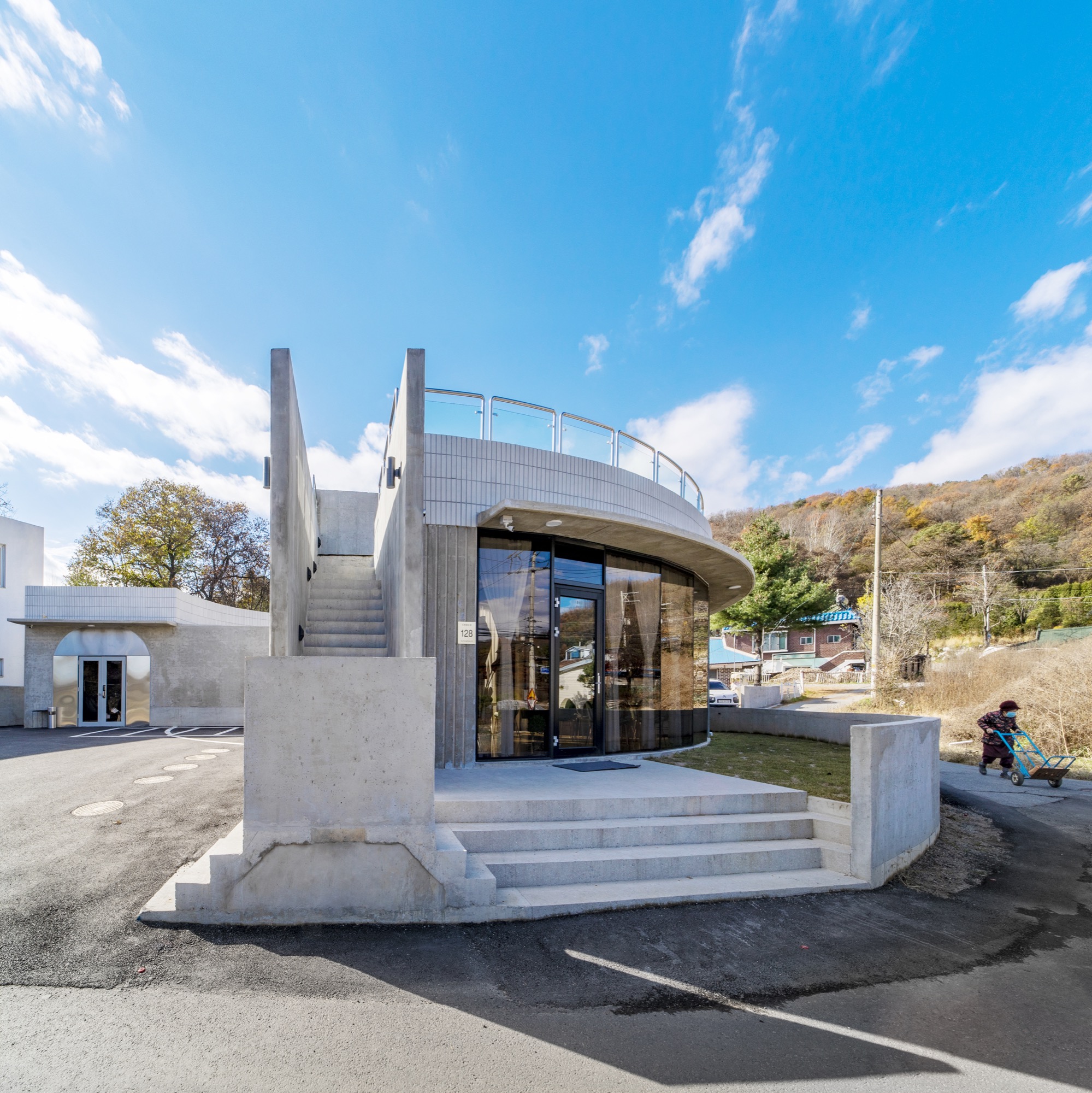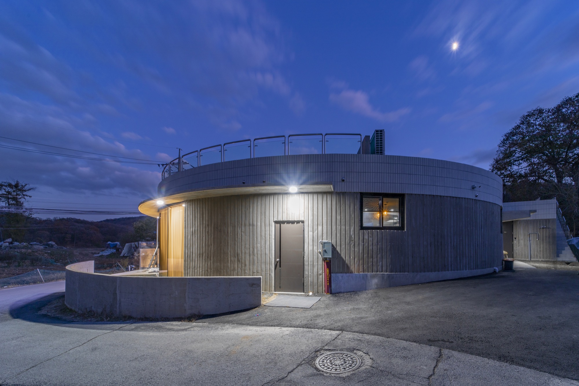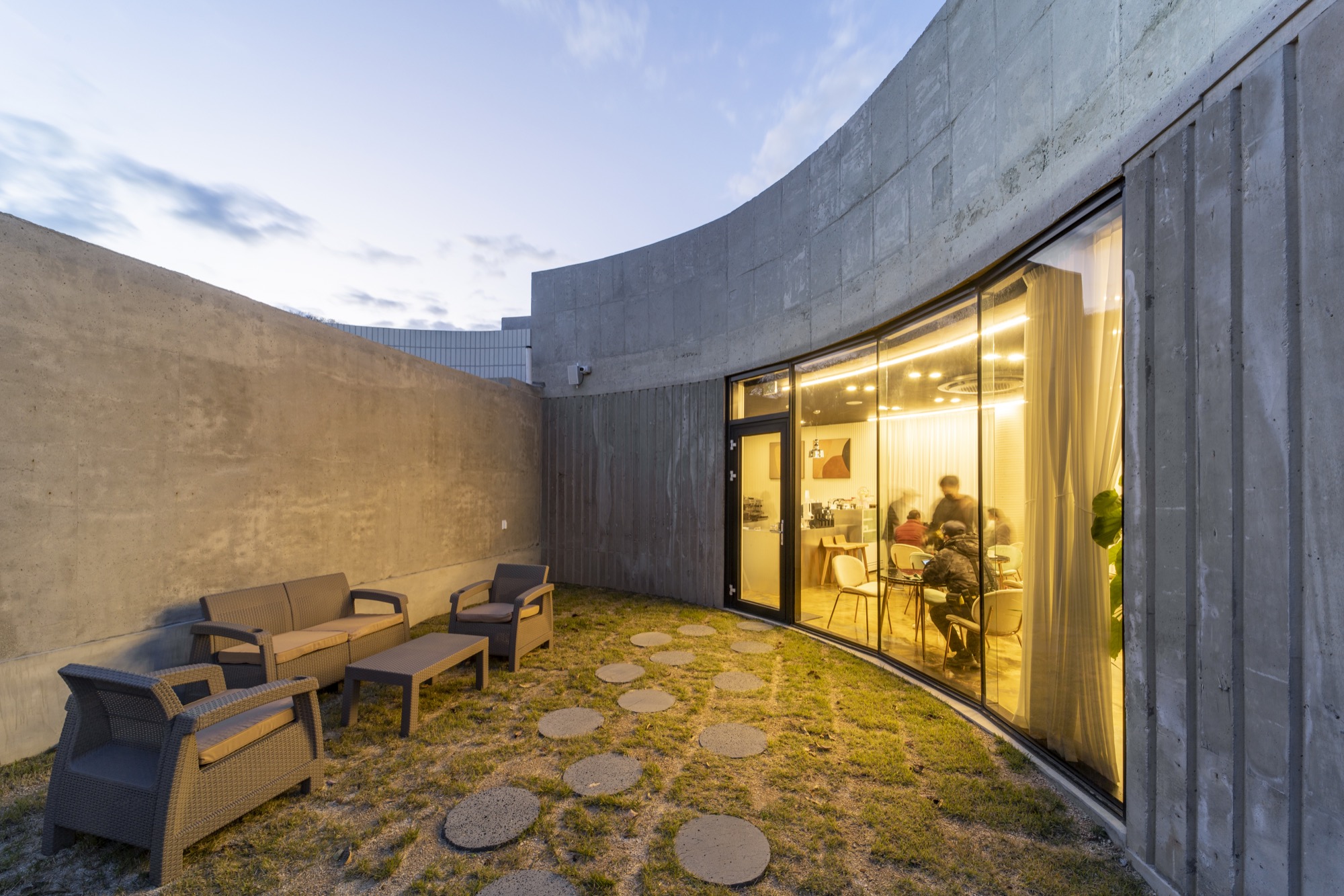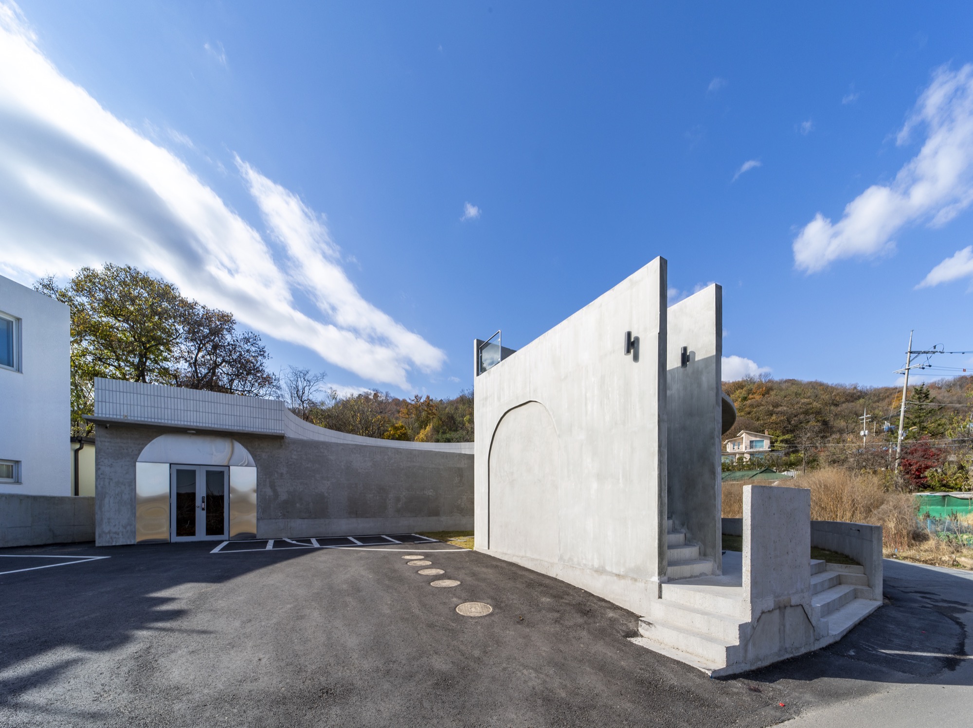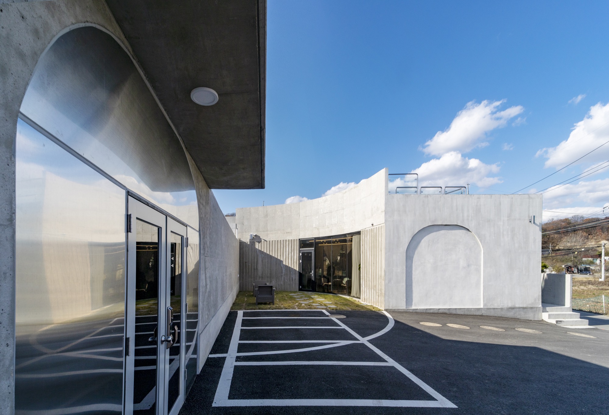 중정 사이의 벽으로 외부와 내부 온도가 달라진다. 외부 미완의 원형 중정은 카페에서 일부 사용하며 주차장으로 연결된다. 주차장은 라이더 동호회 회원들을 위해 넓은 공간으로 활용된다. 중정은 외부로 공간을 확장하고 개인의 삶에서 의미를 확장한다. 지극히 개인적인 건물이면서 모두를 위한 건축이 되길 꿈꾼다. ■