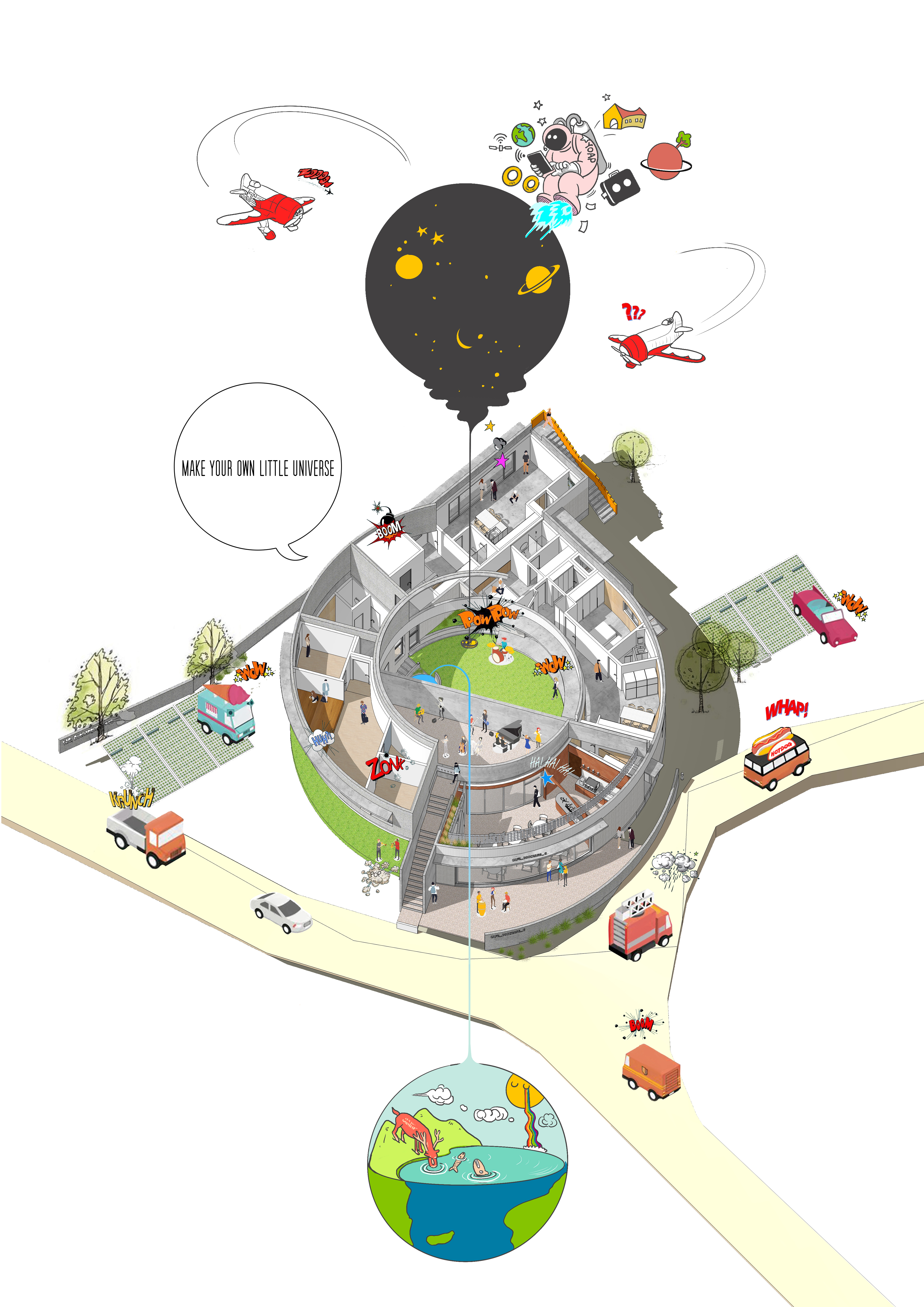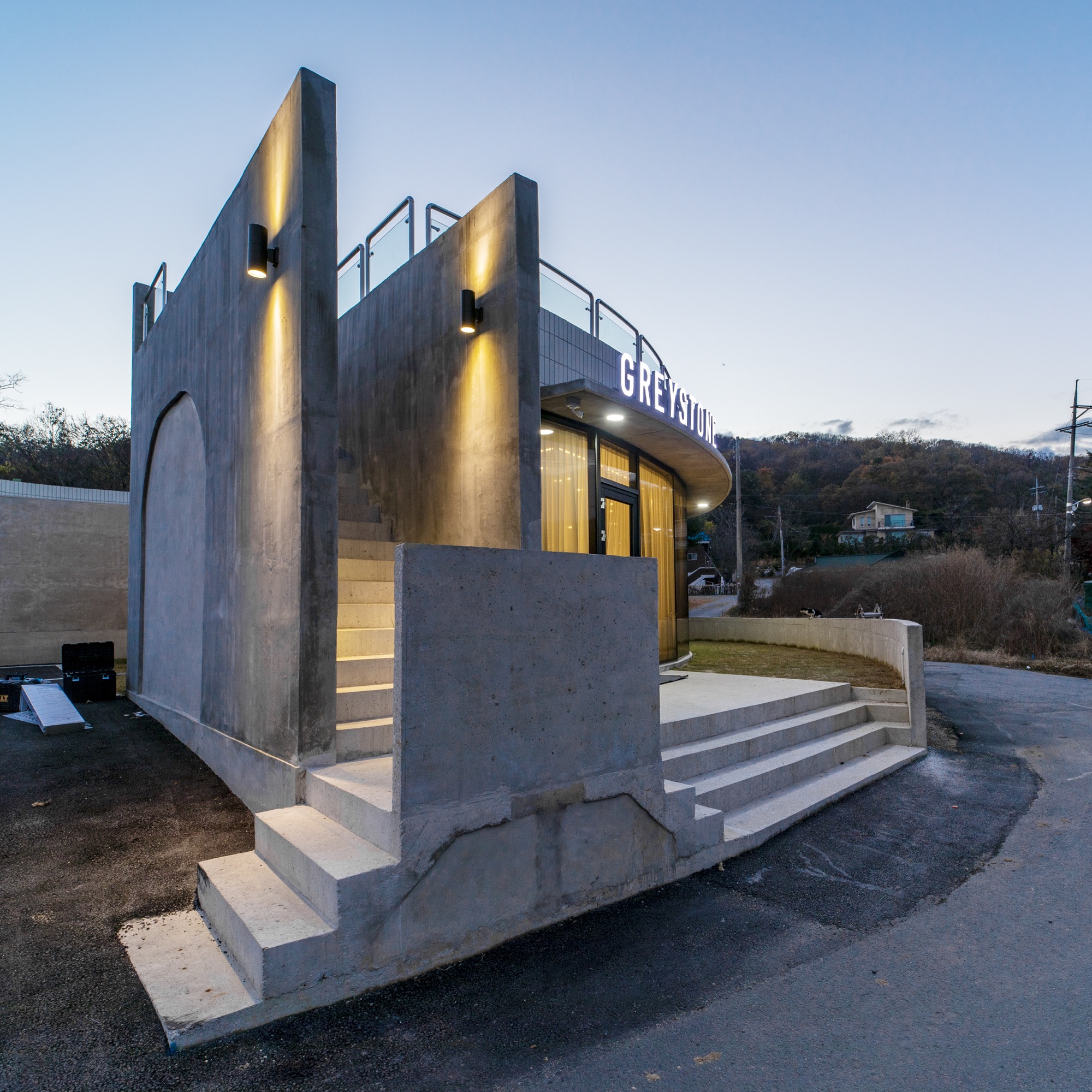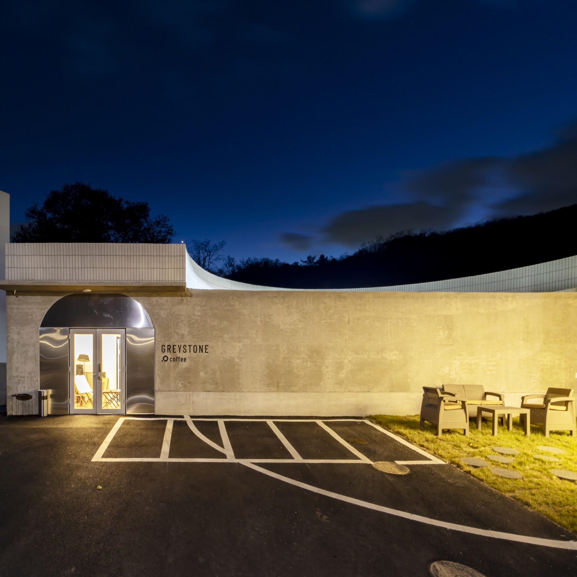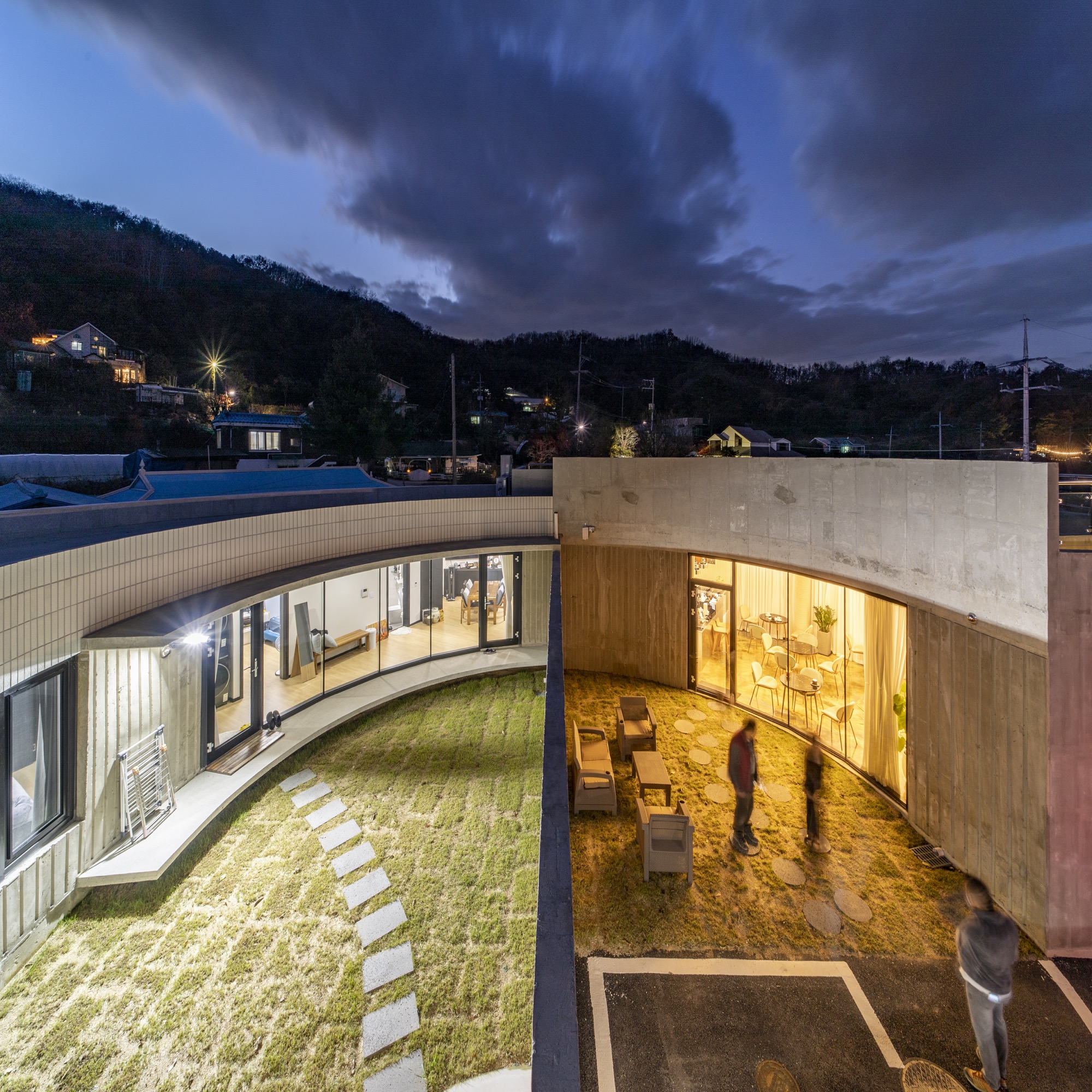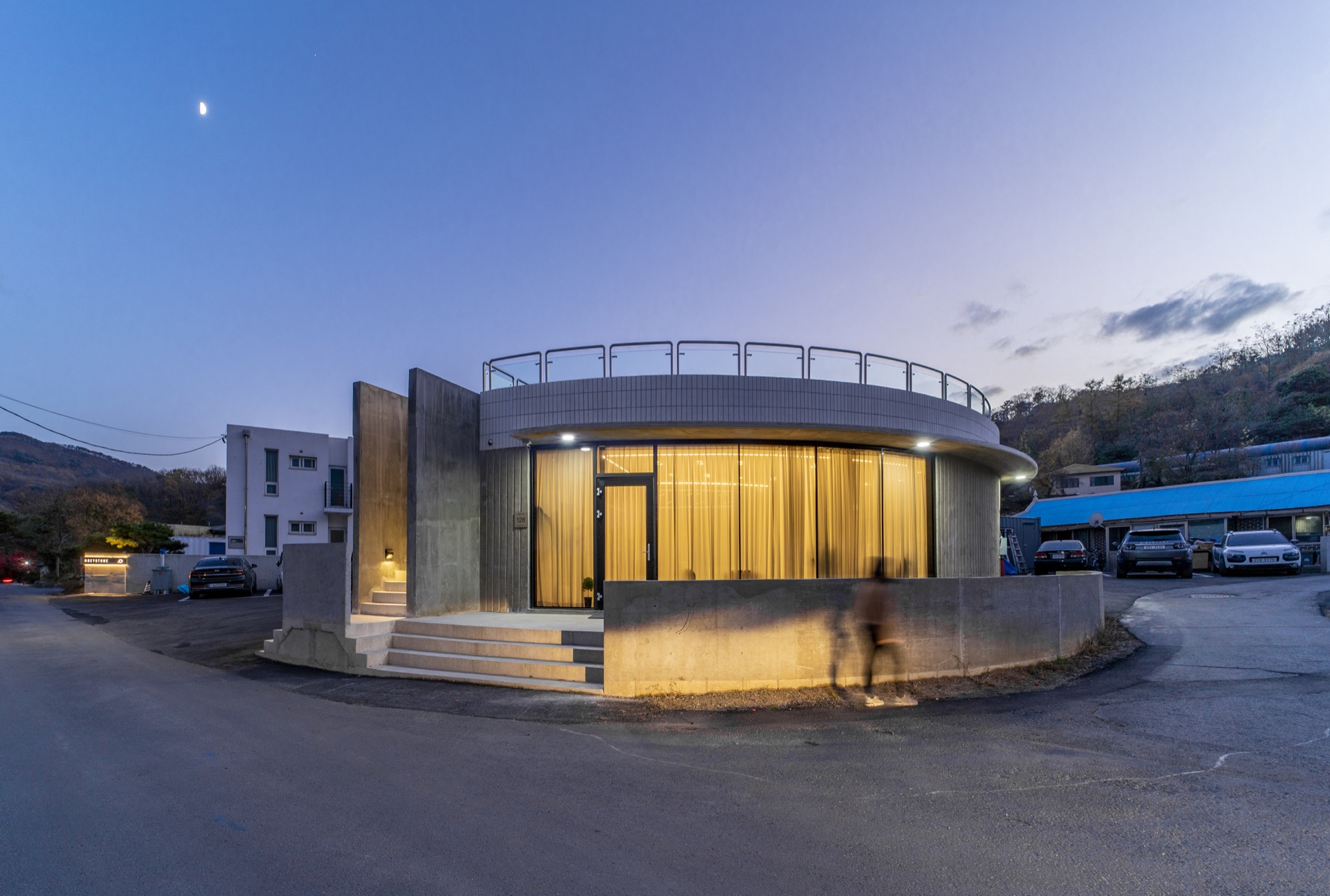 중정 사이의 벽으로 외부와 내부 온도가 달라진다. 외부 미완의 원형 중정은 카페에서 일부 사용하며 주차장으로 연결된다. 주차장은 라이더 동호회 회원들을 위해 넓은 공간으로 활용된다. 중정은 외부로 공간을 확장하고 개인의 삶에서 의미를 확장한다. 지극히 개인적인 건물이면서 모두를 위한 건축이 되길 꿈꾼다. ■