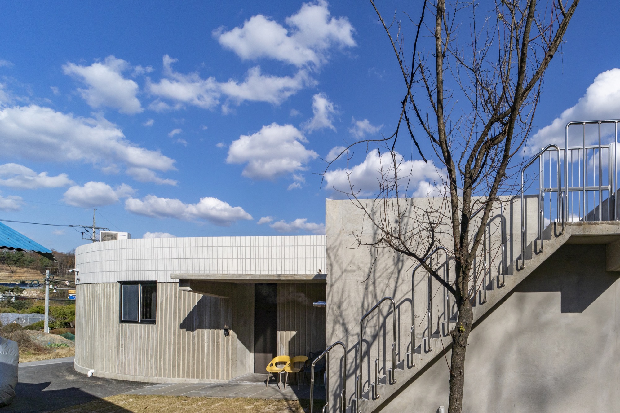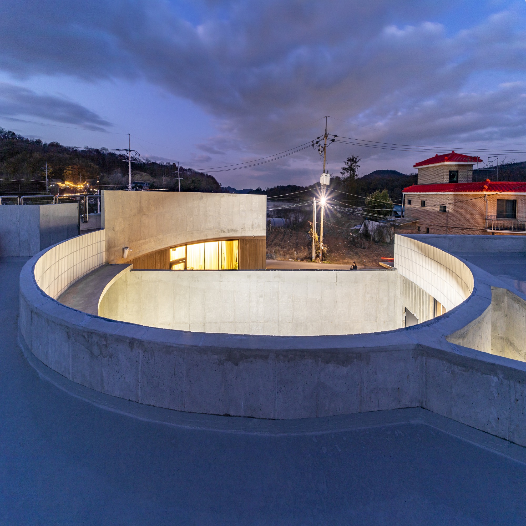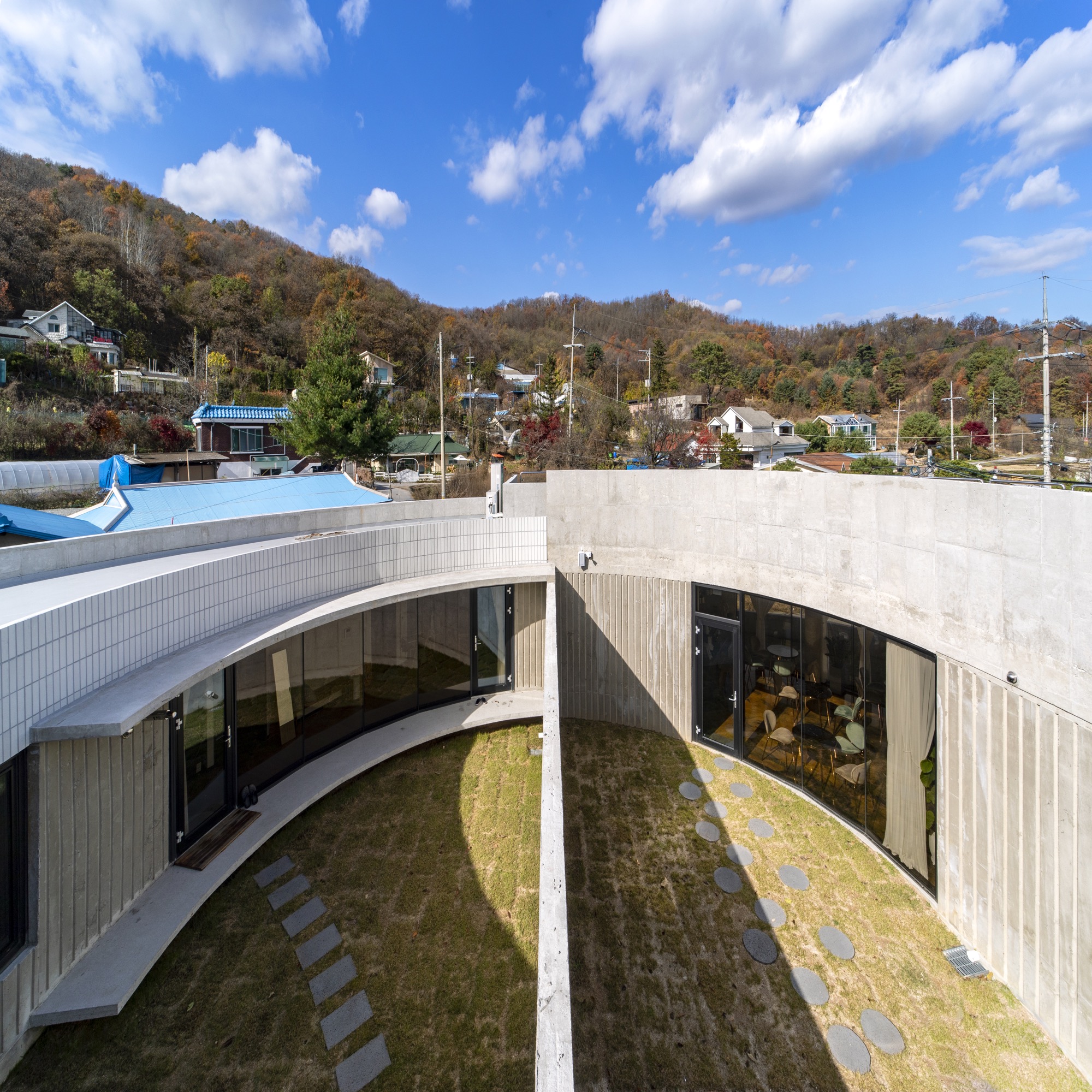 카페는 굽어진 시골 길의 교차로를 받아준다. 원형의 확장된 카페 테라스 공간과 내부 중정 공간, 그리고 옥상공간까지 서로 교차하며 소통한다.