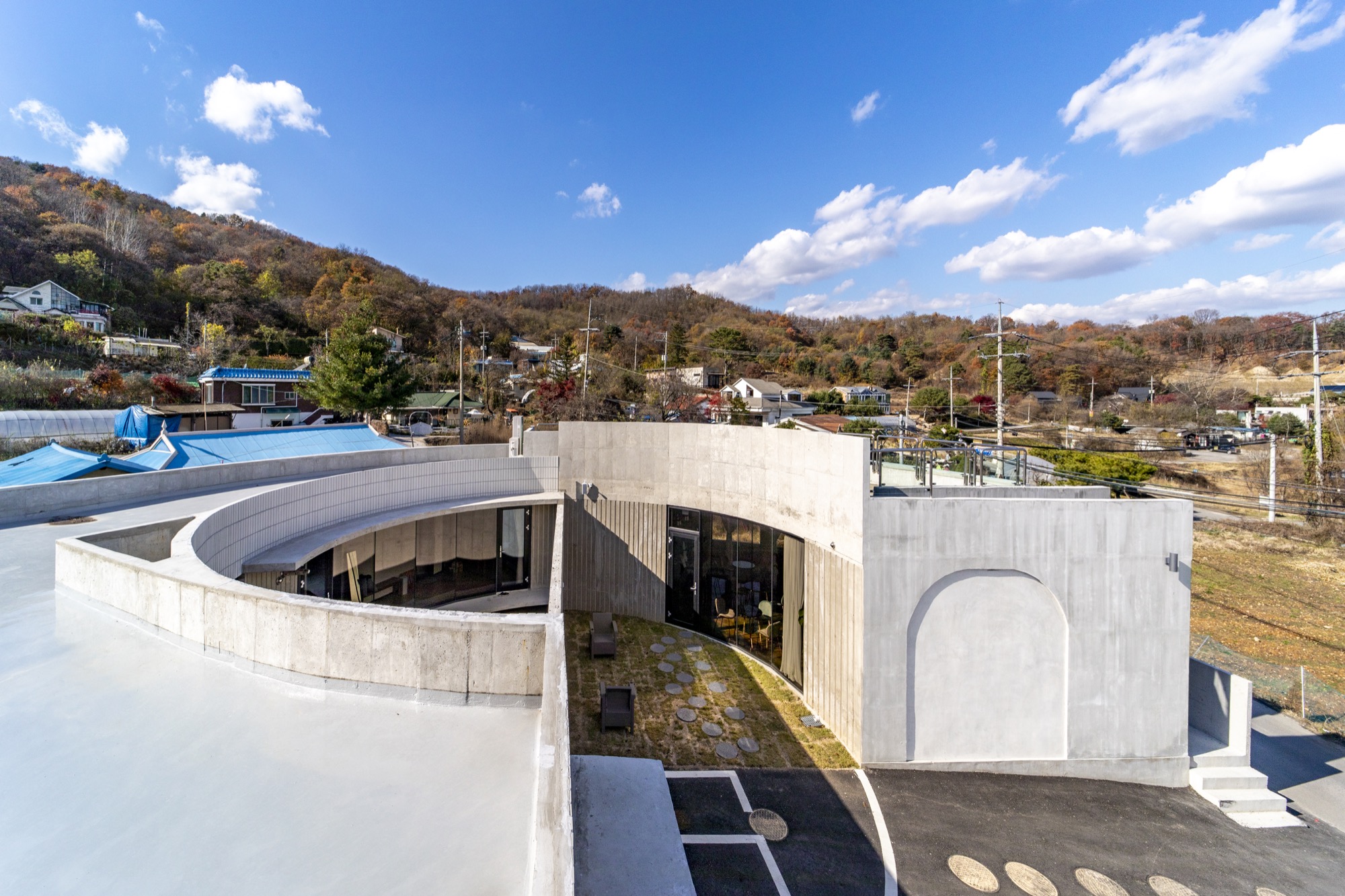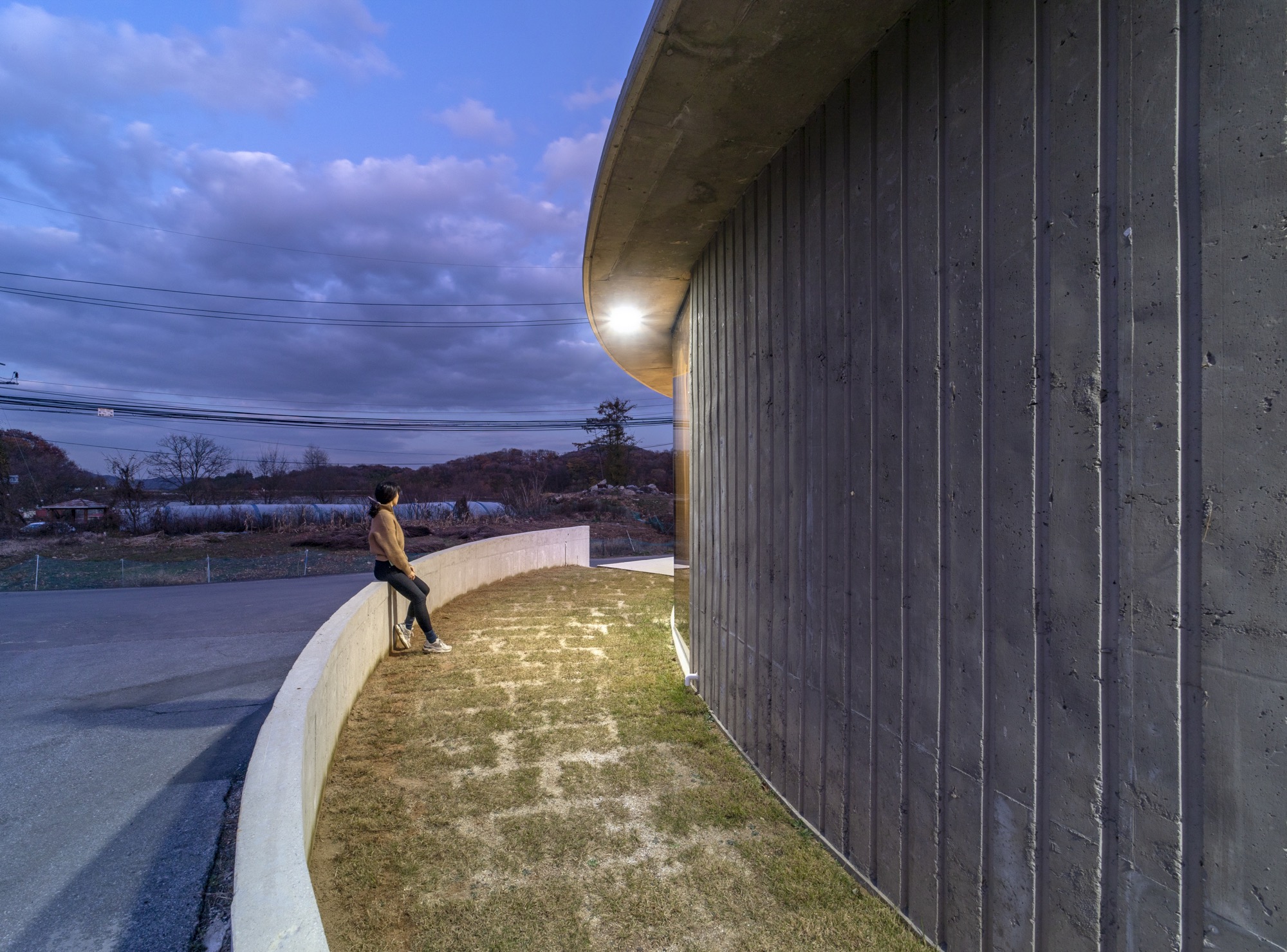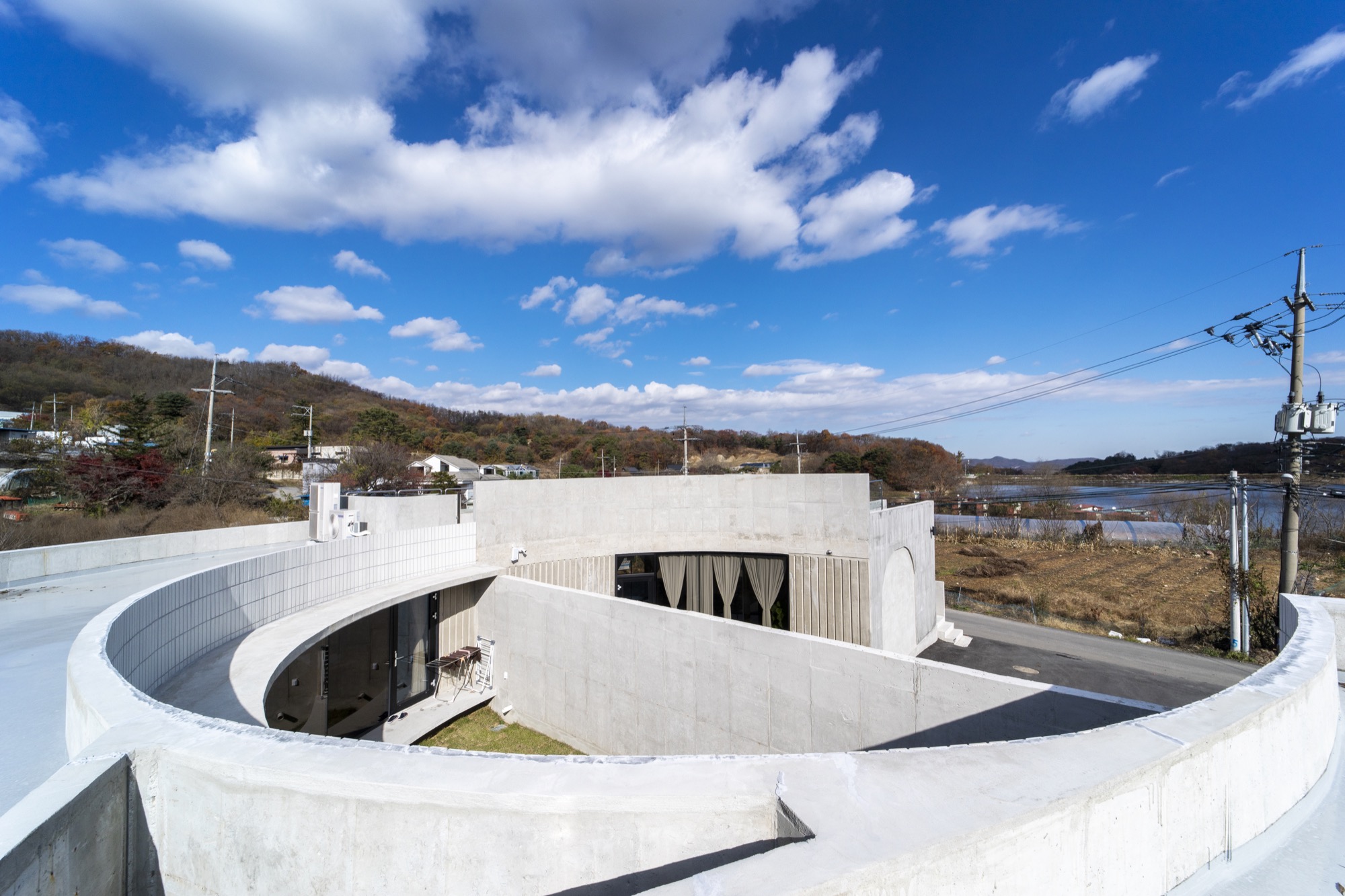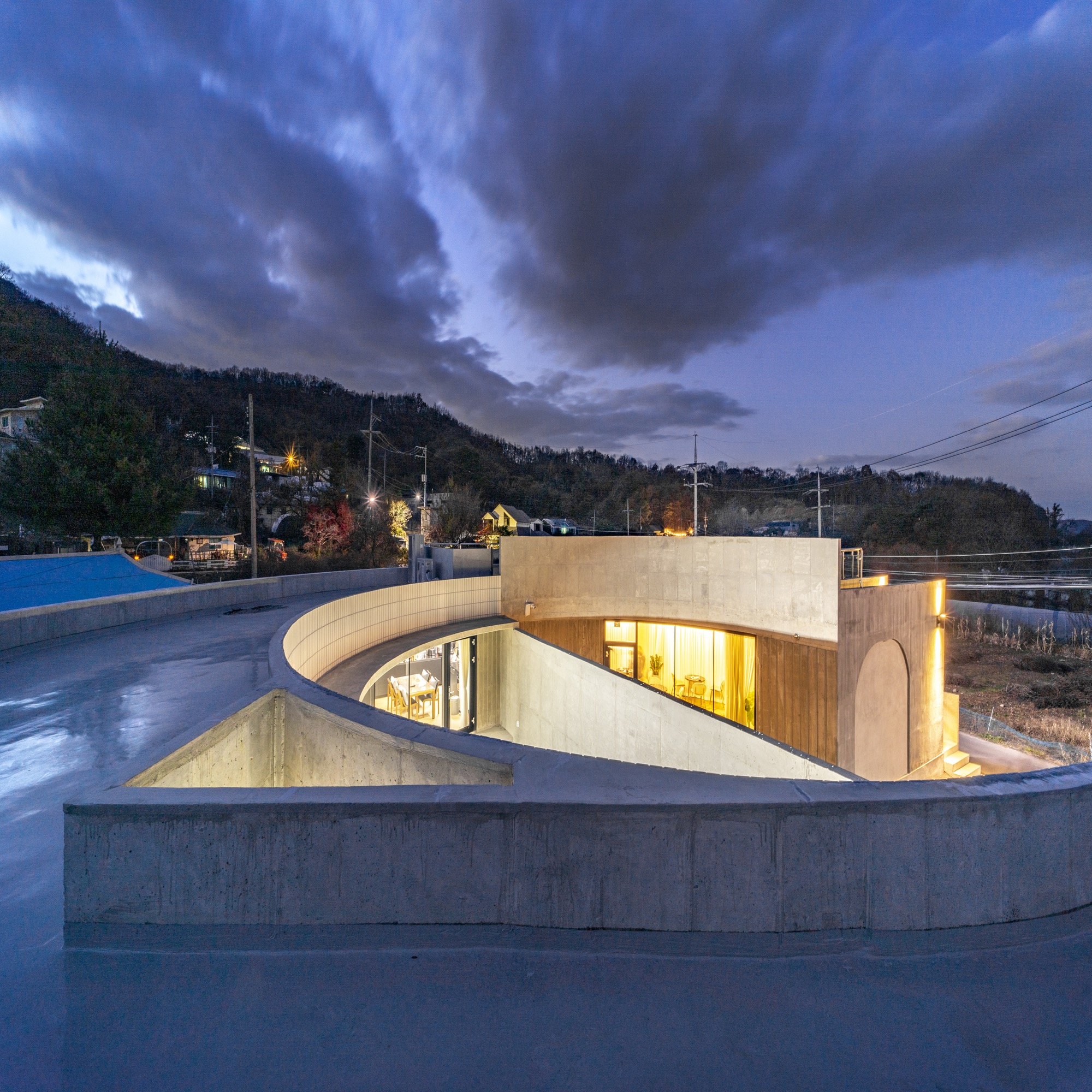 카페는 굽어진 시골 길의 교차로를 받아준다. 원형의 확장된 카페 테라스 공간과 내부 중정 공간, 그리고 옥상공간까지 서로 교차하며 소통한다.