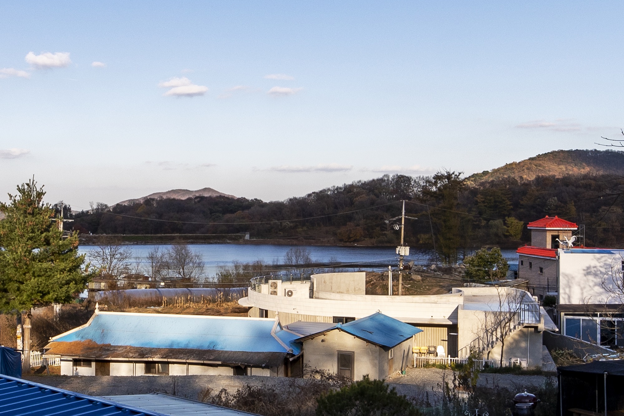 ‘둥근중정 gray-round’는 용인 두창 저수지 낚시터가 있는 조그만 마을에 자리하고 있다. 2개의 가구와 아주 작은 카페가 저수지를 바라보며 자리하고 있다. 처음 방문했을 때 저수지를 따라 굽어진 시골 길과 낮은 물안개가 기억이 난다. 클라이언트는 다른 곳에서 살던 부모님, 형제와 함께할 집과 낯선 사람들이 잘 수 있는 숙소와 카페 등을 두길 원했다. 상업적인 공간과 개인의 공간, 그리고 친구들, 동호회를 위한 마당까지 모든 공간을 아우를 수 있길 바랐다.