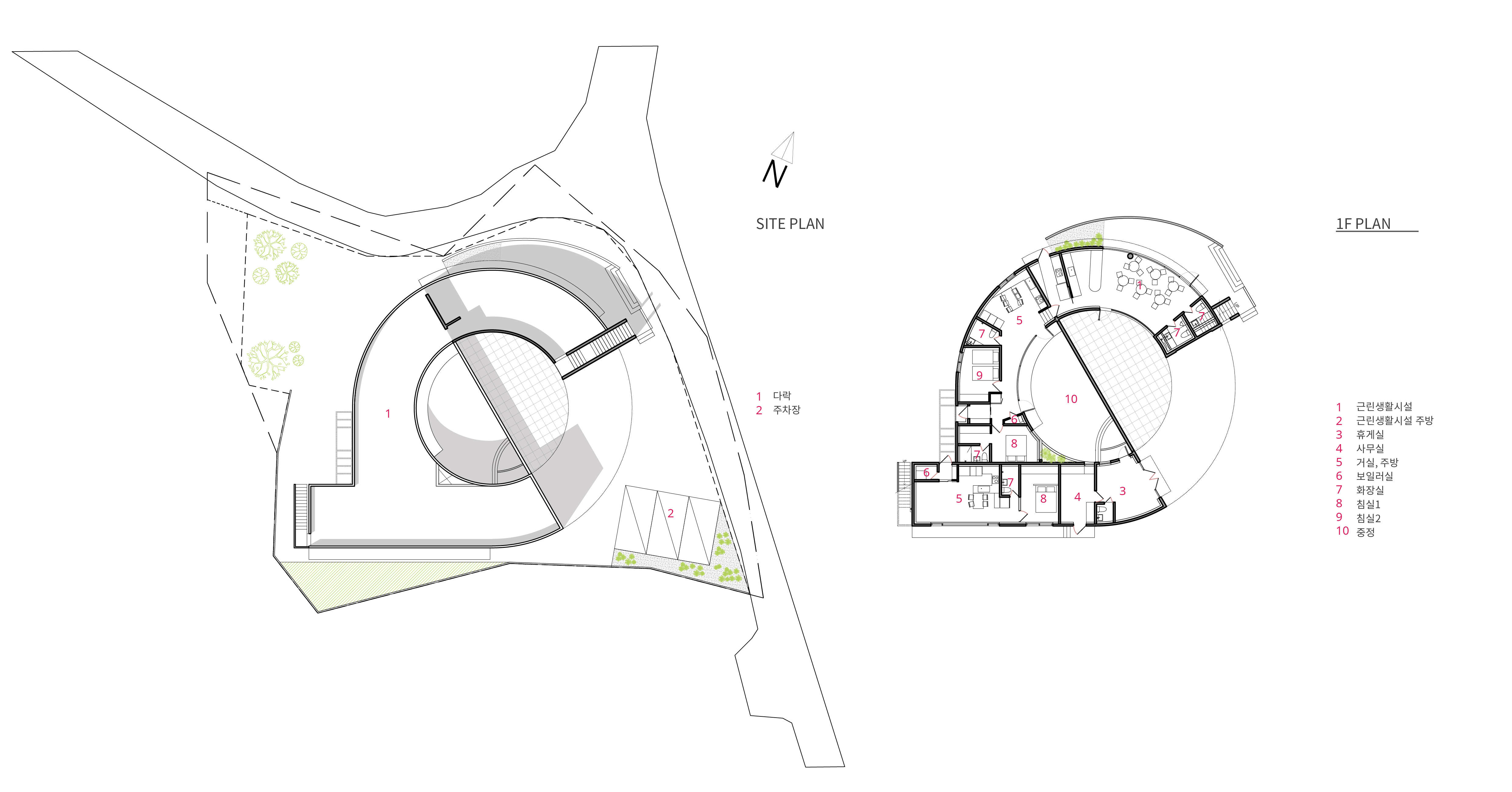 주거 공간 중 가장 프라이버시가 중요한 부모님 집은 독립된 동선으로 조용한 곳에 남향으로 배치했다. 중정과 거리를 만들었고 온종일 볕이 잘 드는 마당을 바라보게 한다. 또한, 내부에서 원형의 중정이 느껴지지 않게 최대한 반듯한 평면과 짧은 동선으로 심플하게 거주할 수 있도록 계획했다.
