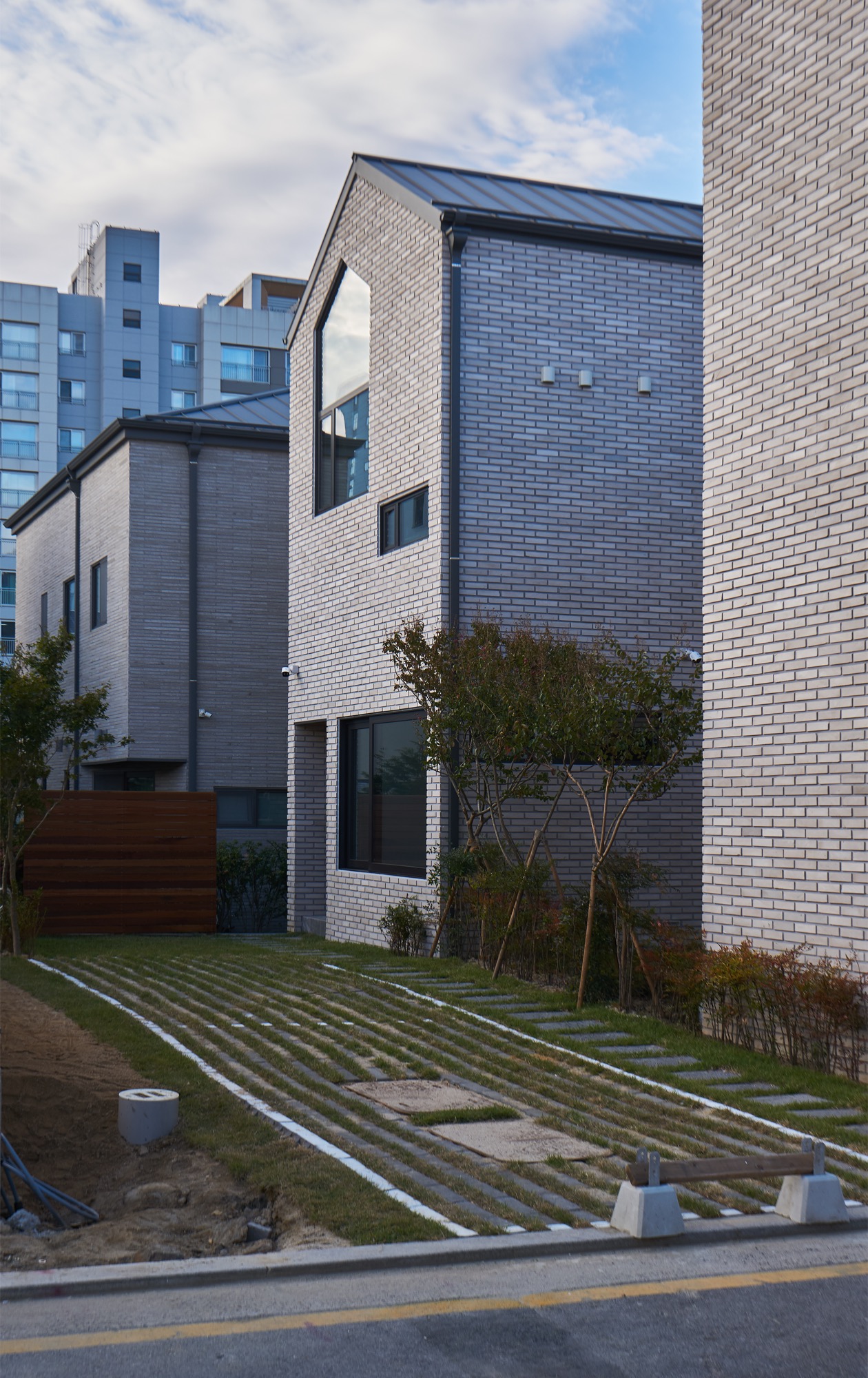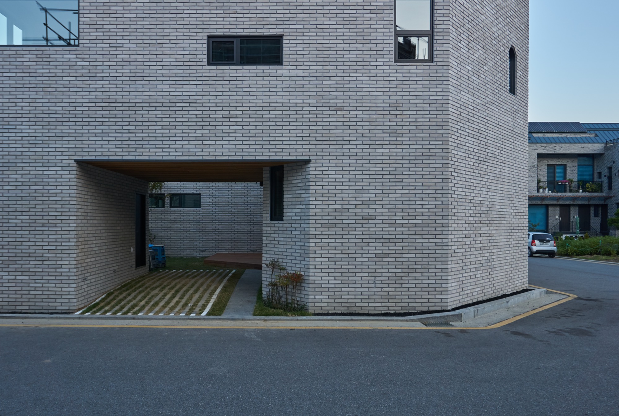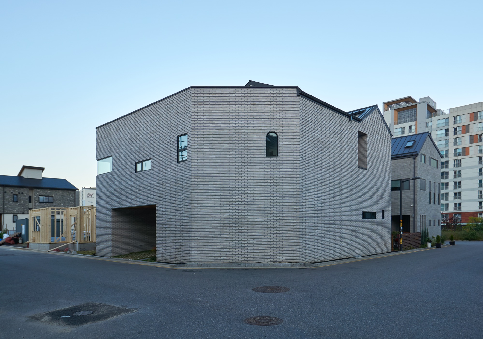 위례 신도시는 주변의 모든 건물이 지어진 지 5년 이내로 새로운 도시가 형성되고 있다. 한 집 걸러 한 집 공사가 이루어지고 있었고, 서로 자신을 뽐내기 위해 서로 경쟁이라도 하는 듯이 느껴졌다. 이러한 상황 속에서 디자인 방향을 잡는 일은 오히려 손쉬운 작업이었다. 시끌벅적한 형태보다 단순하고 강렬한 형태로 목소리를 낸다. 묵직하게 자리 잡은 모습을 통해 주변의 새롭고 적극적인 목소리와 대조된다. 조용하지만 나지막하게 도시 속에 자리 잡기를 바랐다. 건물의 형태는 대지에 맞춰 자연스럽게 도로를 등진 ‘ㄷ’자로 배치하게 되었다.