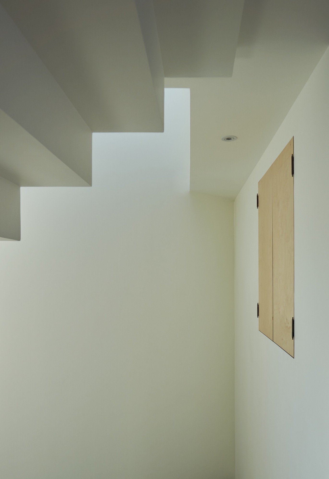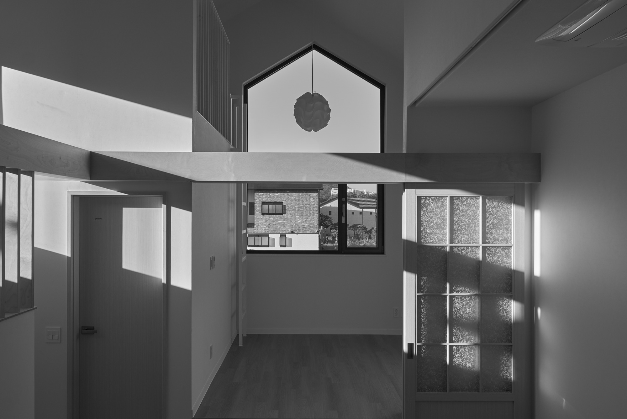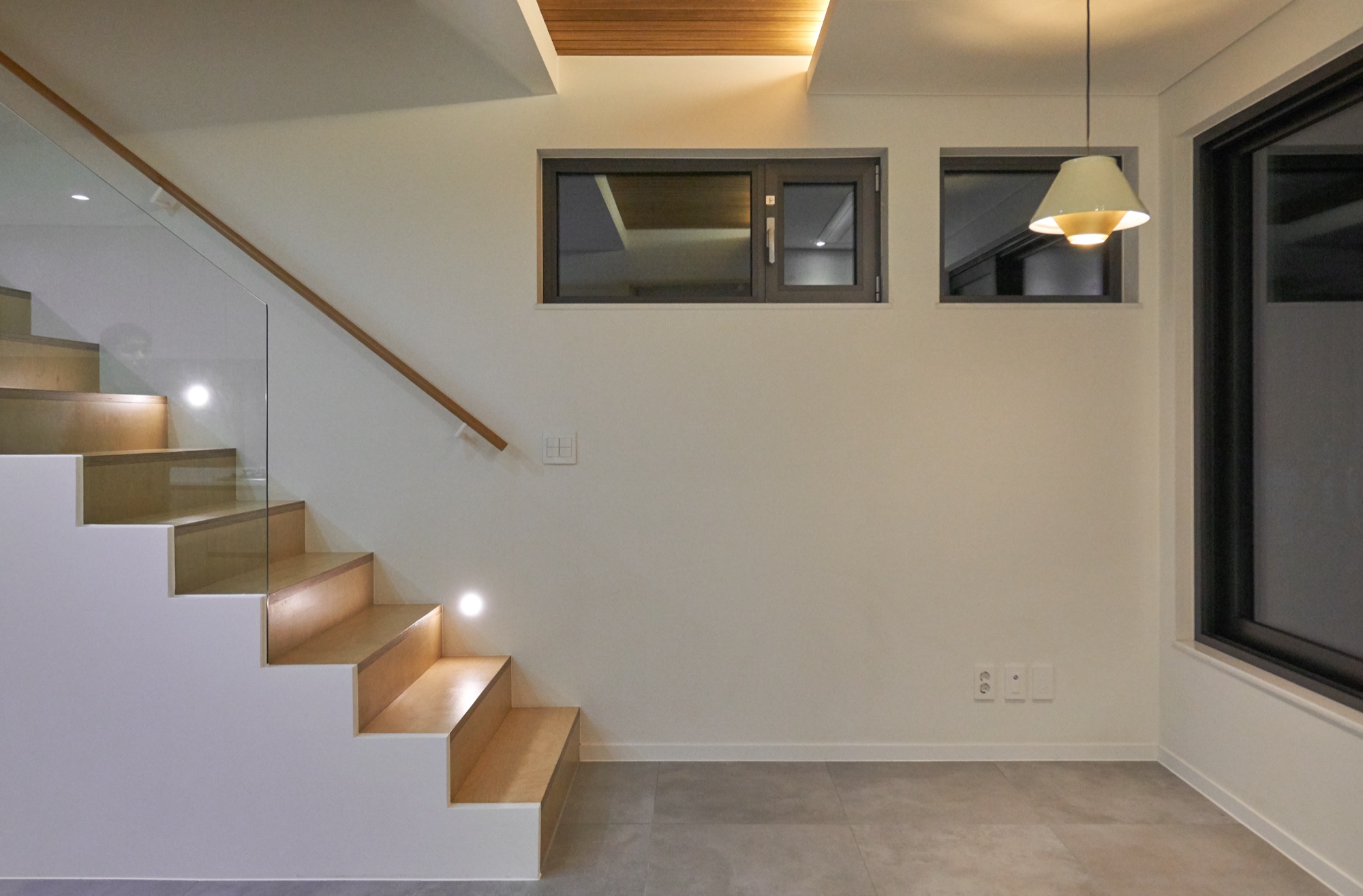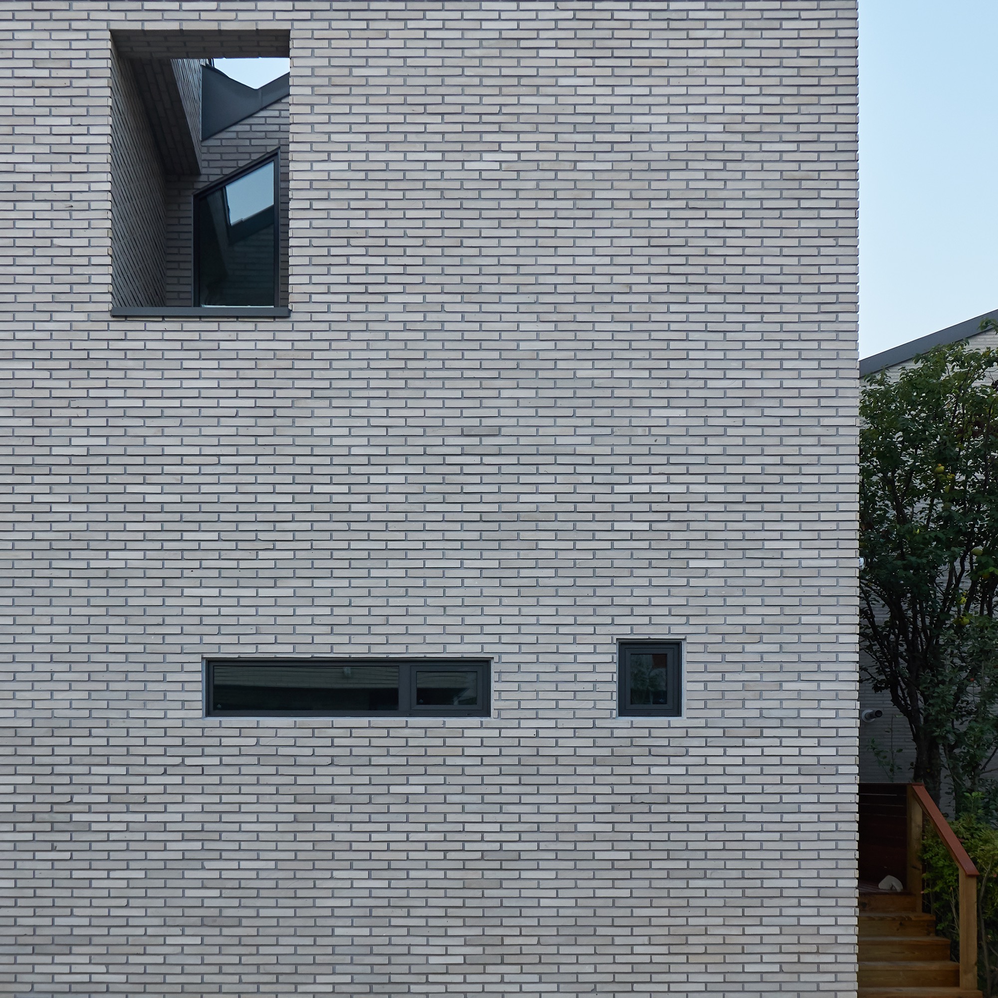 설계에서 가장 중요하게 생각했던 부분은 현관이다. 흔히들 흘러 지나가는 곳이라 여겨 중요성이 떨어지는 곳이지만, 조금은 사치를 부려 천창이 있는 포켓 정원으로 만들었다. 서로 엮이는 계단과 시선, 흘러들어오는 빛은 작은 공간 속에 다양한 이야기를 담는다.