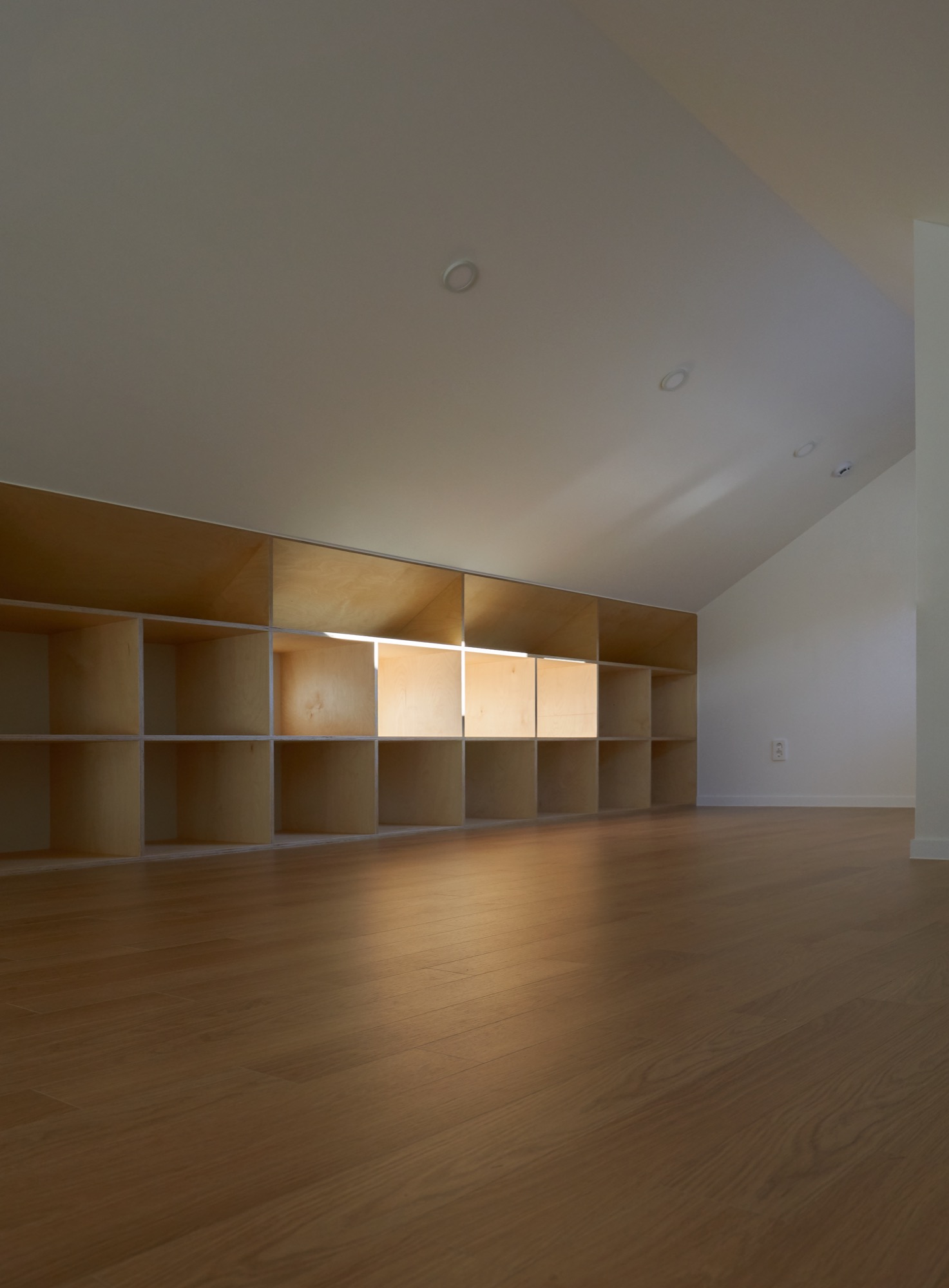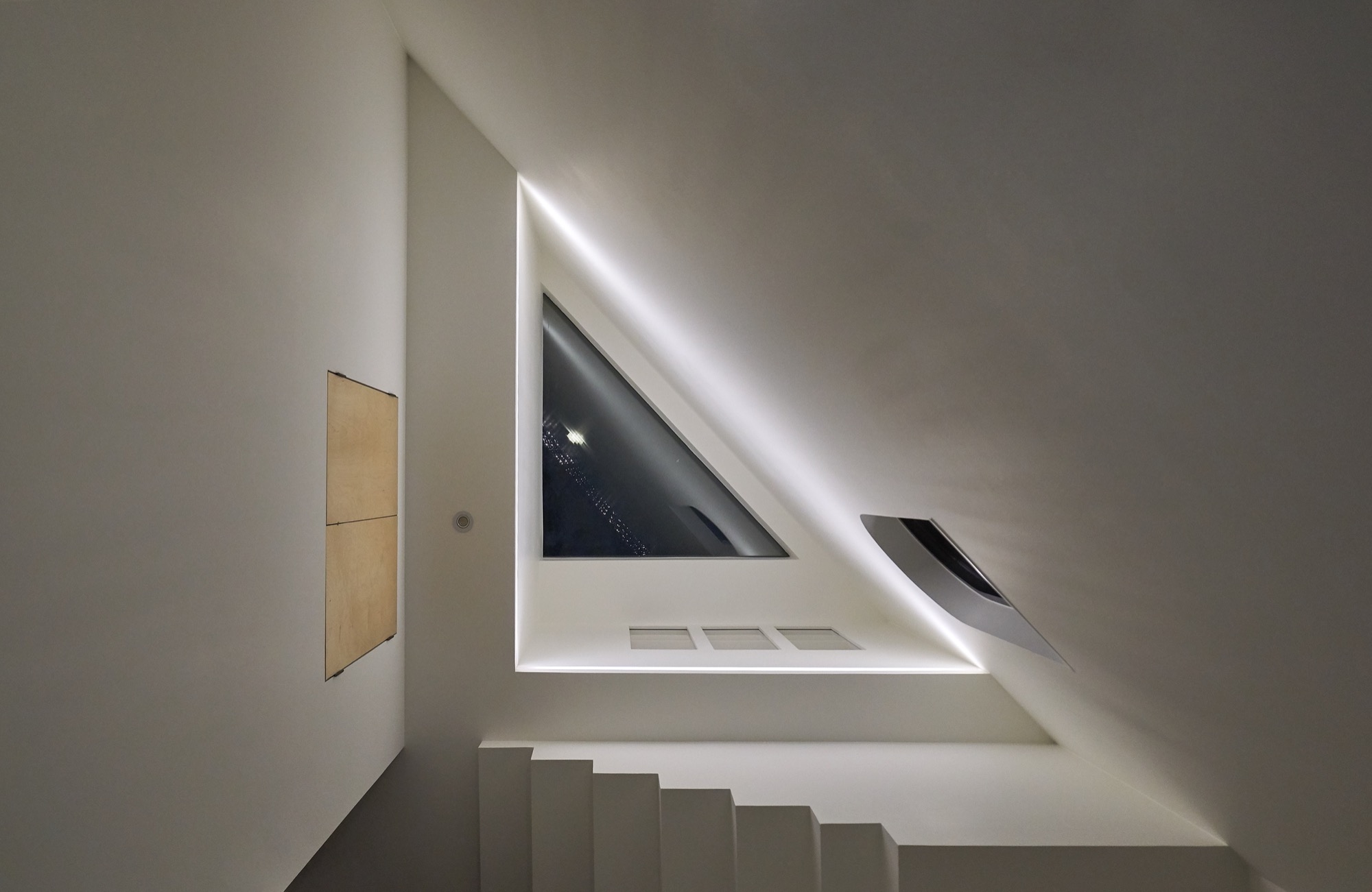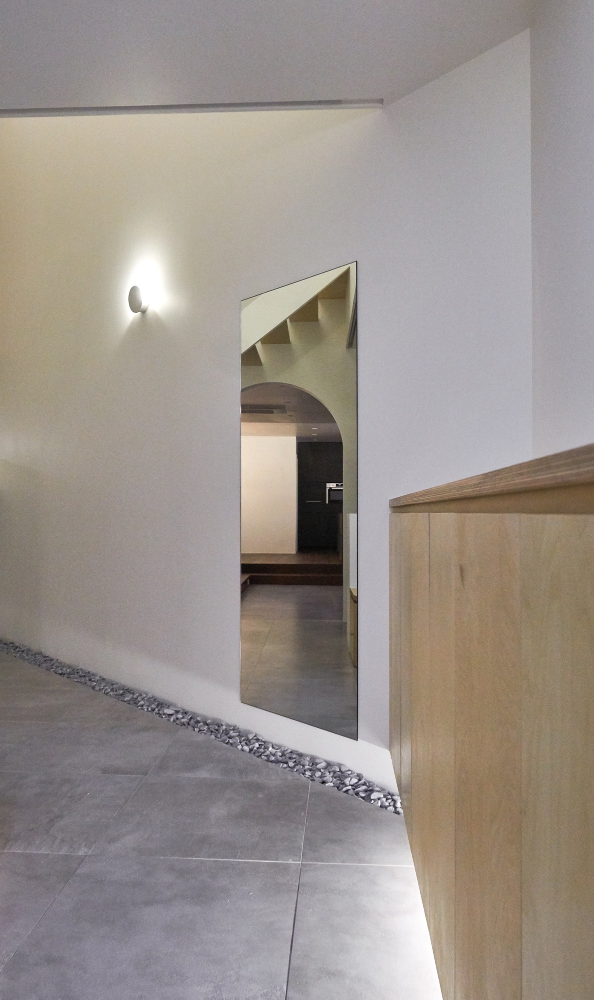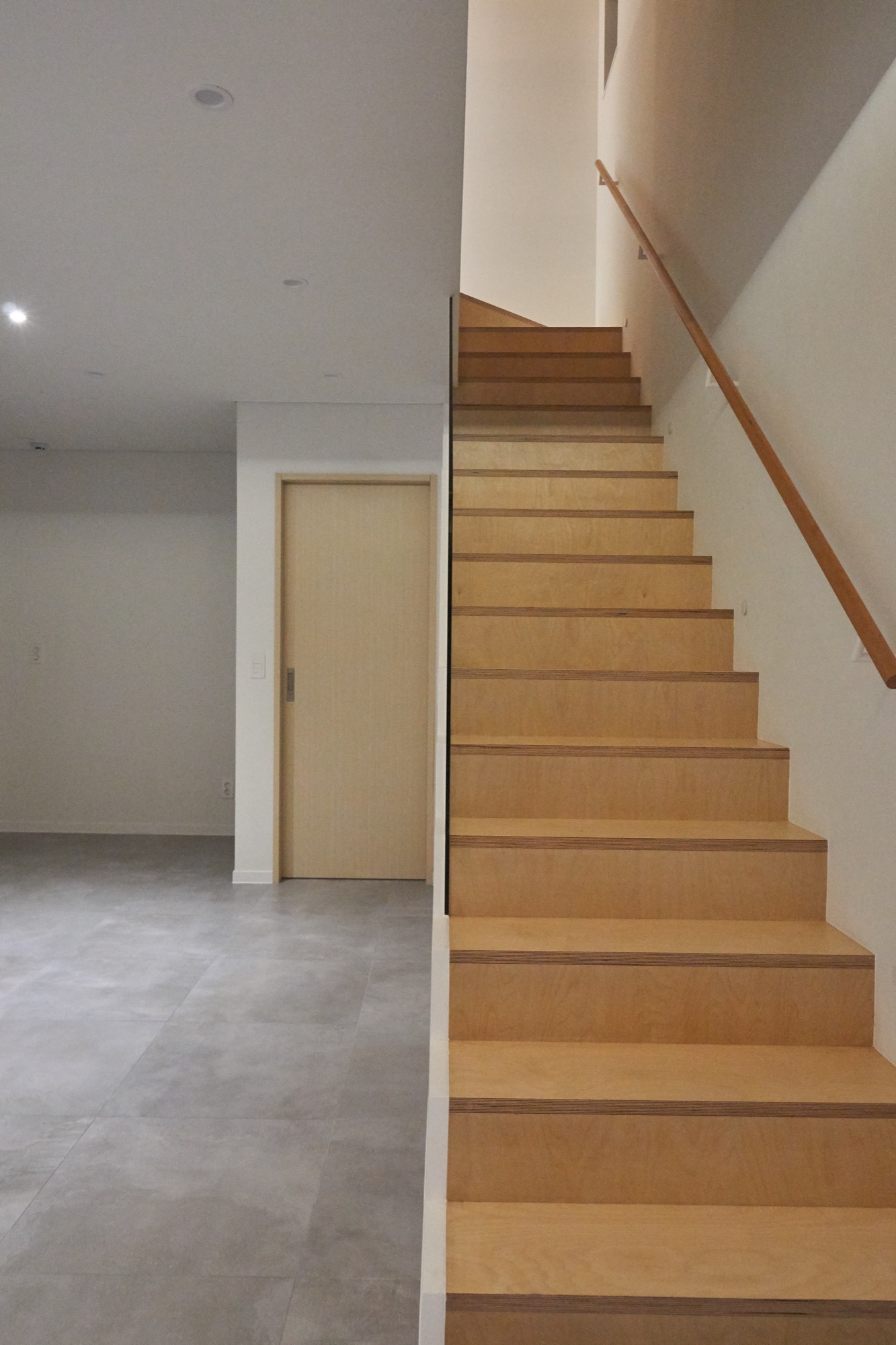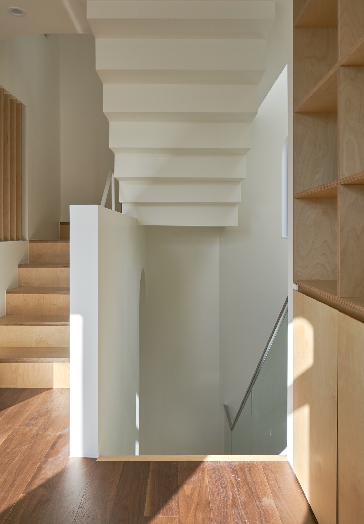 설계에서 가장 중요하게 생각했던 부분은 현관이다. 흔히들 흘러 지나가는 곳이라 여겨 중요성이 떨어지는 곳이지만, 조금은 사치를 부려 천창이 있는 포켓 정원으로 만들었다. 서로 엮이는 계단과 시선, 흘러들어오는 빛은 작은 공간 속에 다양한 이야기를 담는다.