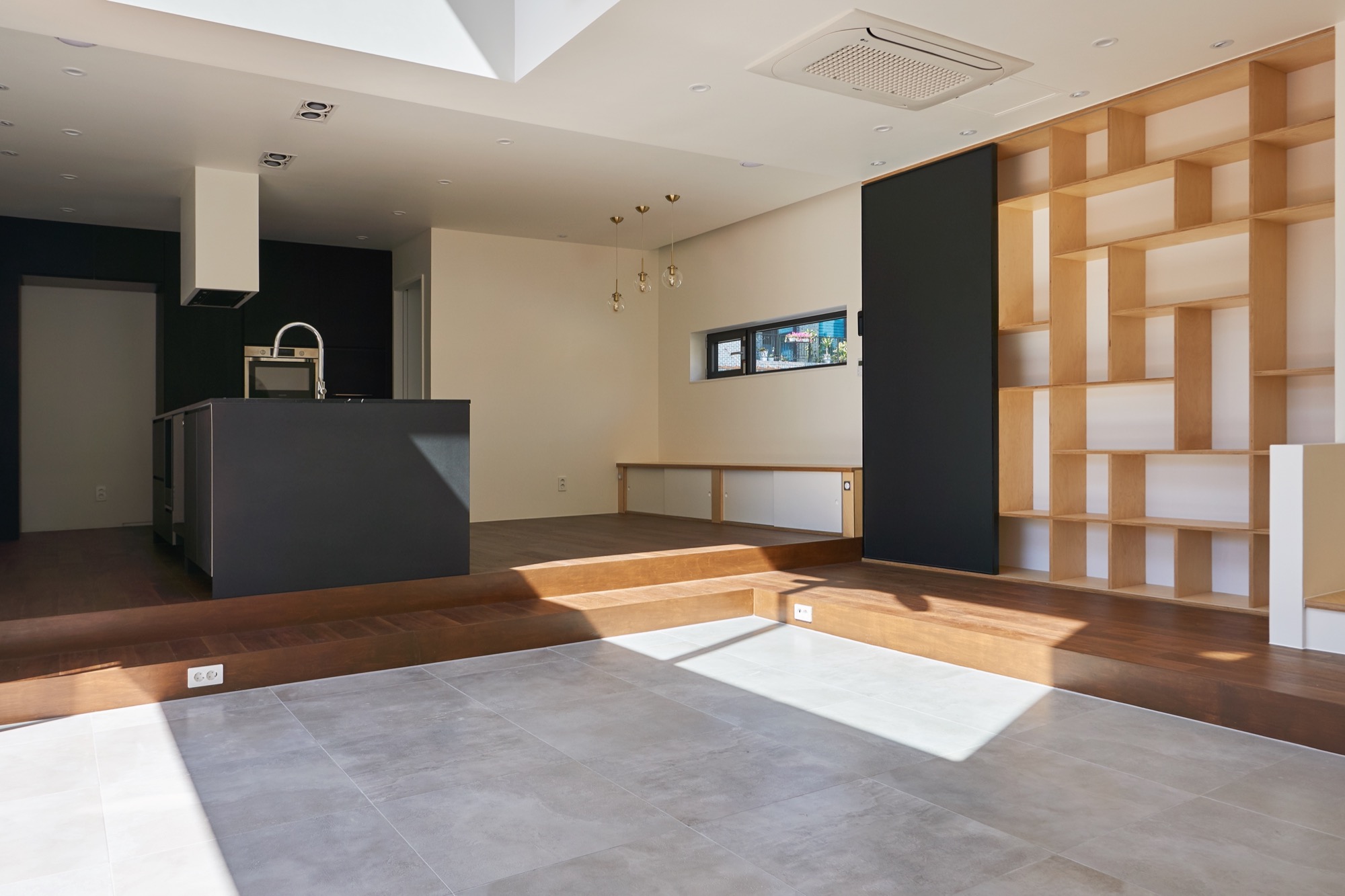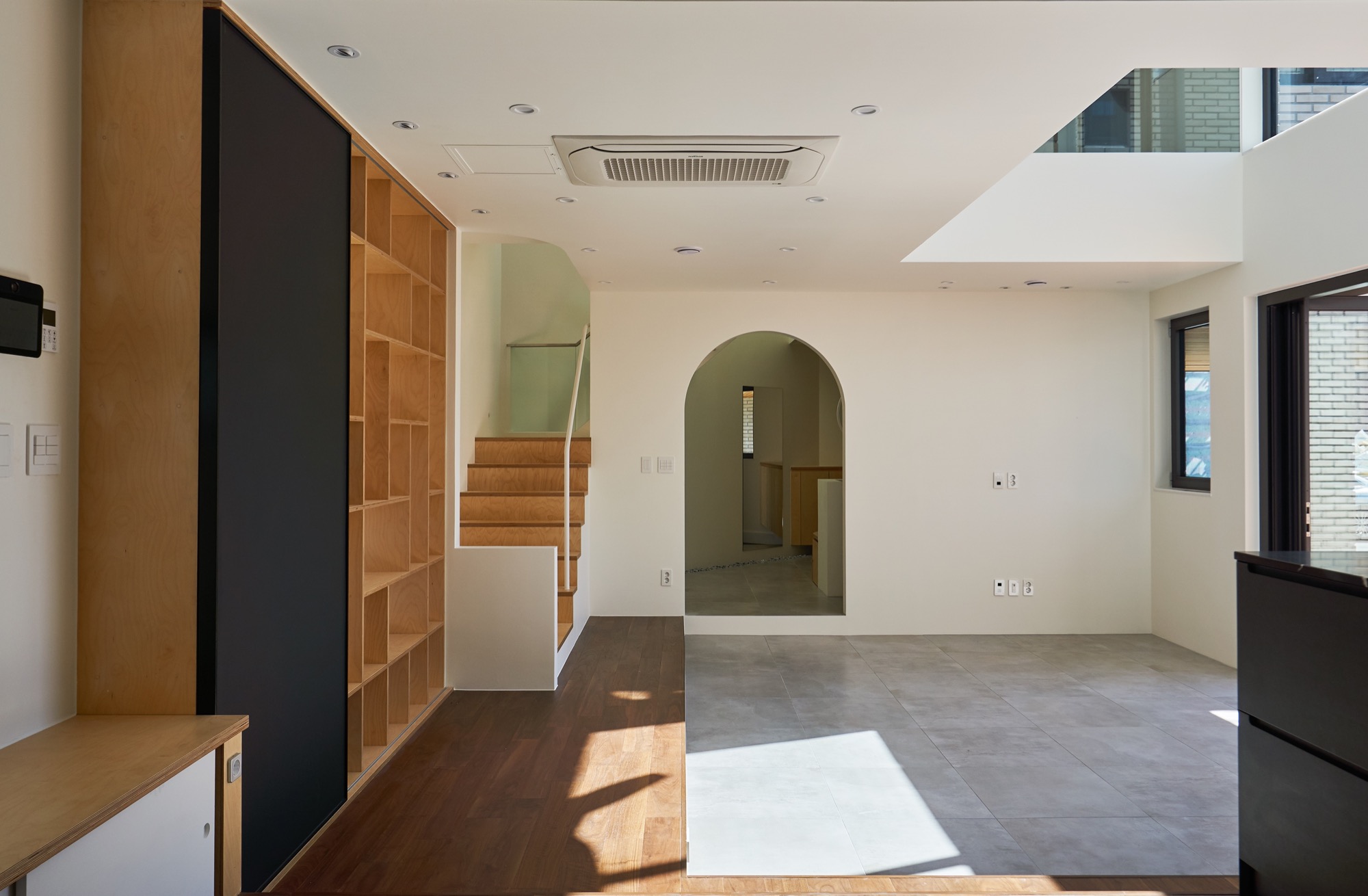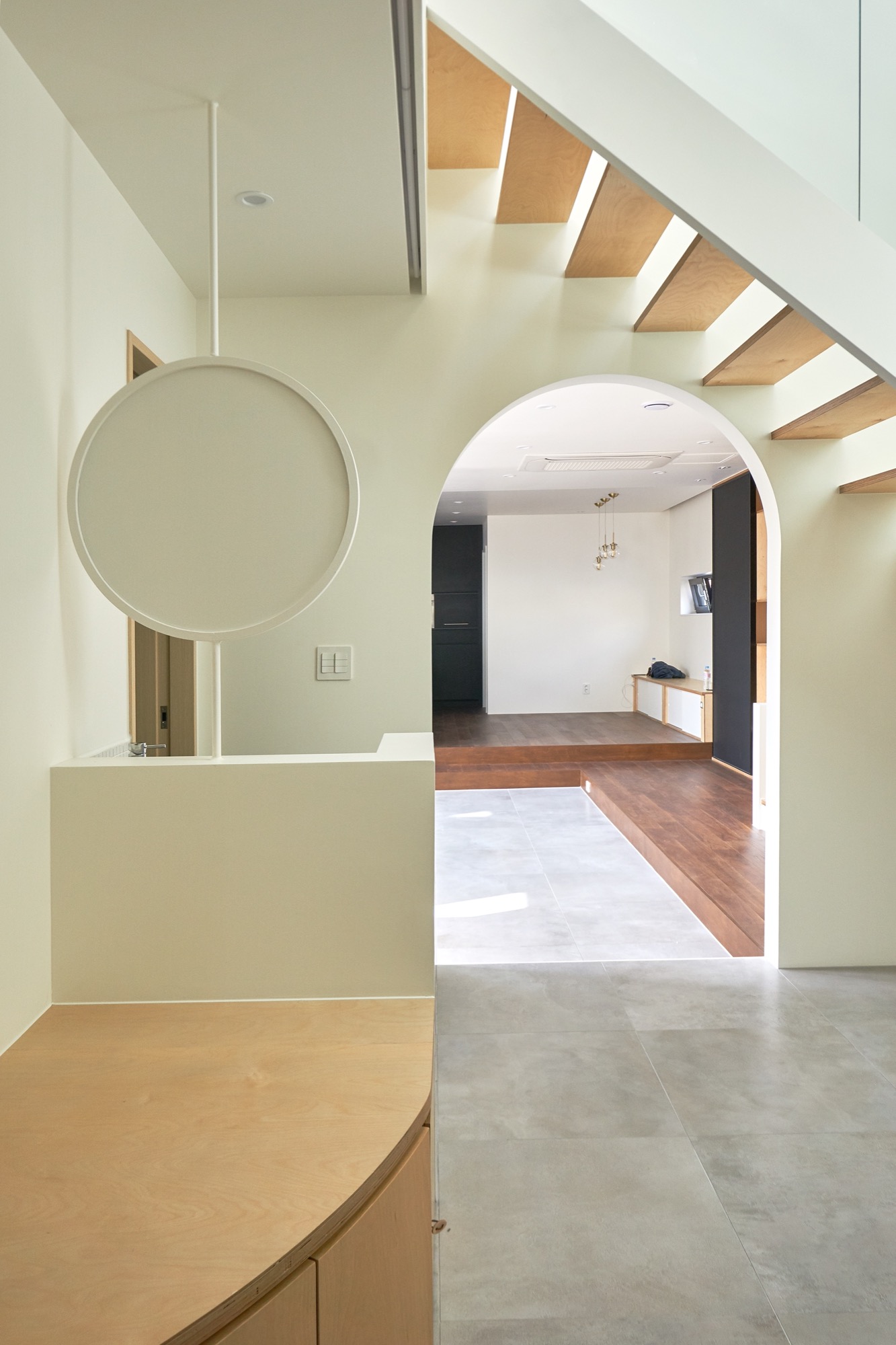 건축주와 매주 인터뷰와 워크숍을 진행하며 그들의 생각에 공감할 수 있었다. 단독주택에서 살아본 경험이 없는 건축주는 단독주택에 대한 꿈과 관심이 매우 컸다. 매주 새로운 아이디어를 제안했고, 라이프스타일에 대한 고민을 공유했다. 건축주는 높고 밝은 집 아래 가족 음악회를 꿈꾸었다. 평소 음악 감상과 와인을 즐긴다는 건축주의 소망을 담은 집을 함께 그려갔다. 1층은 가족들이 음악회를 즐기는 무대다. 거실과 주방은 2개의 단으로 나뉘어 자연스레 객석과 무대가 형성되고, 동그란 아치 문은 주인공이 등장하는 듯한 느낌과 재미를 준다.