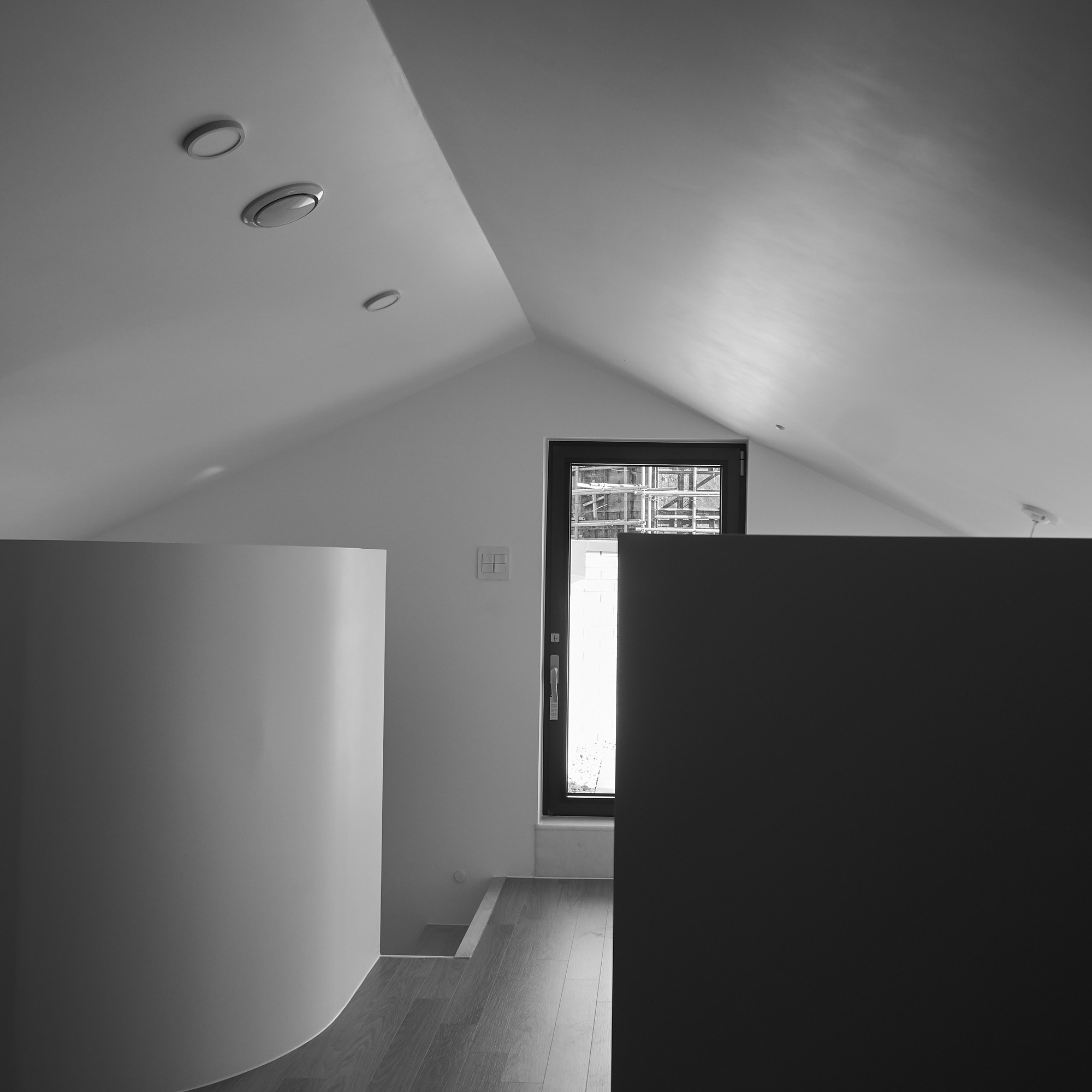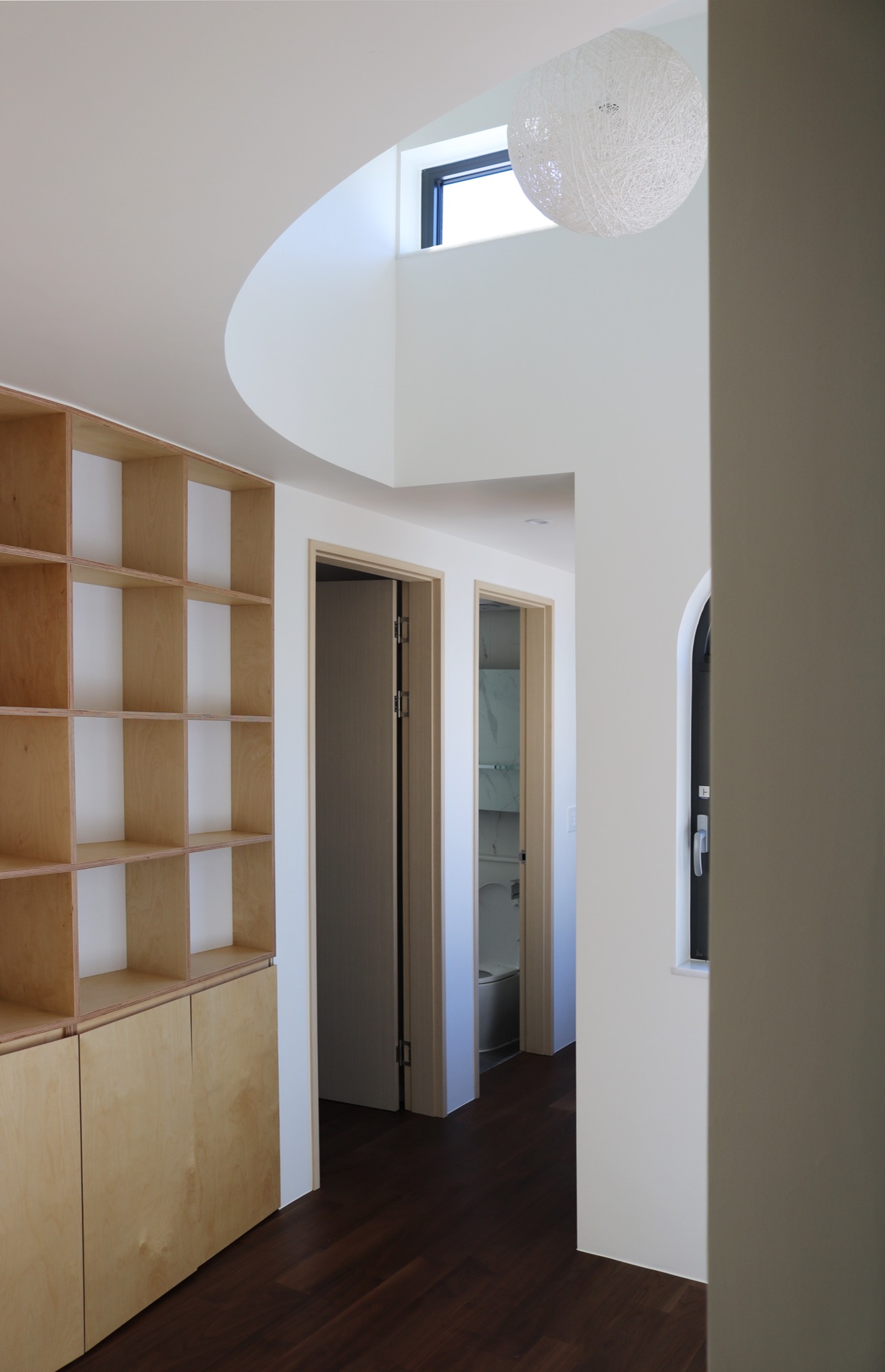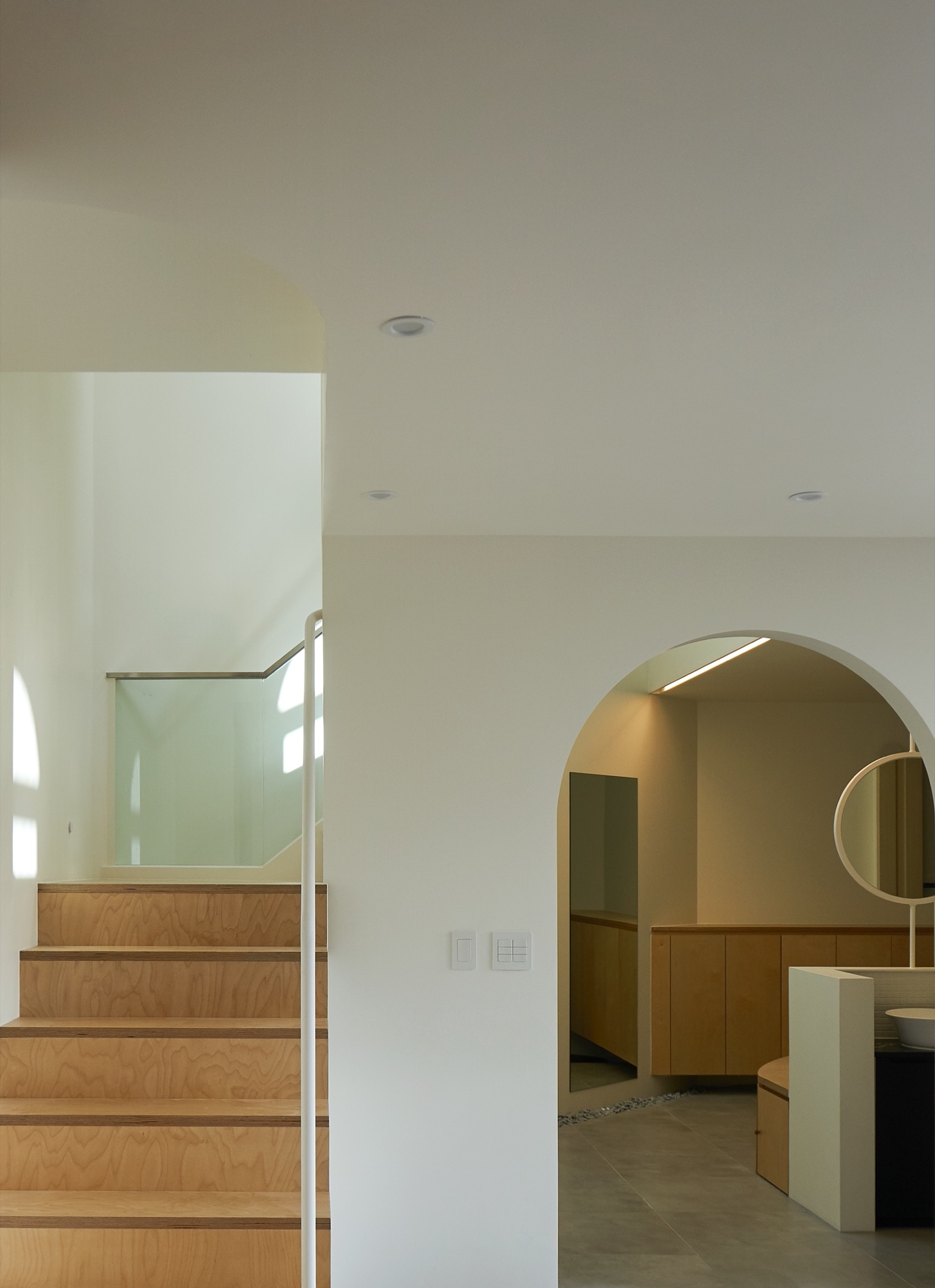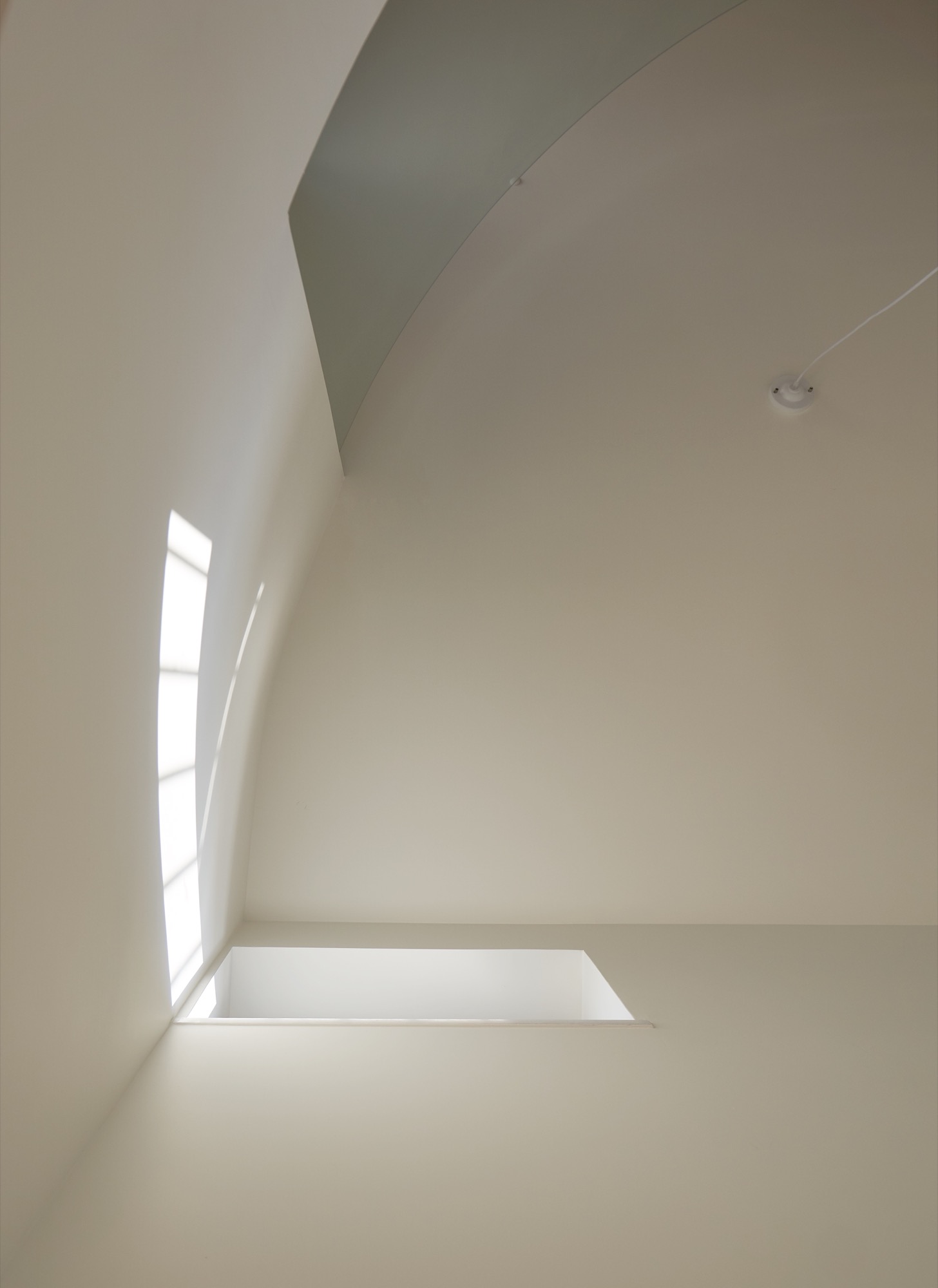 집의 전체적인 인테리어는 외관의 무거움을 덜어내는 방향으로 진행됐다. 커다란 볼륨이 주는 무게감에 건축주가 짓눌리지 않도록, 오픈 부위는 곡선을 활용하여 무게감을 덜었고, 조형이 주는 재미와 아름다움을 집안 내부에서도 즐길 수 있게 했다. 시간에 따라 달리 떨어지는 빛의 모습이 내부에서 잘 연출 될 수 있도록 최대한 단순한 형태의 조형으로 내부 공간을 만들어갔다.