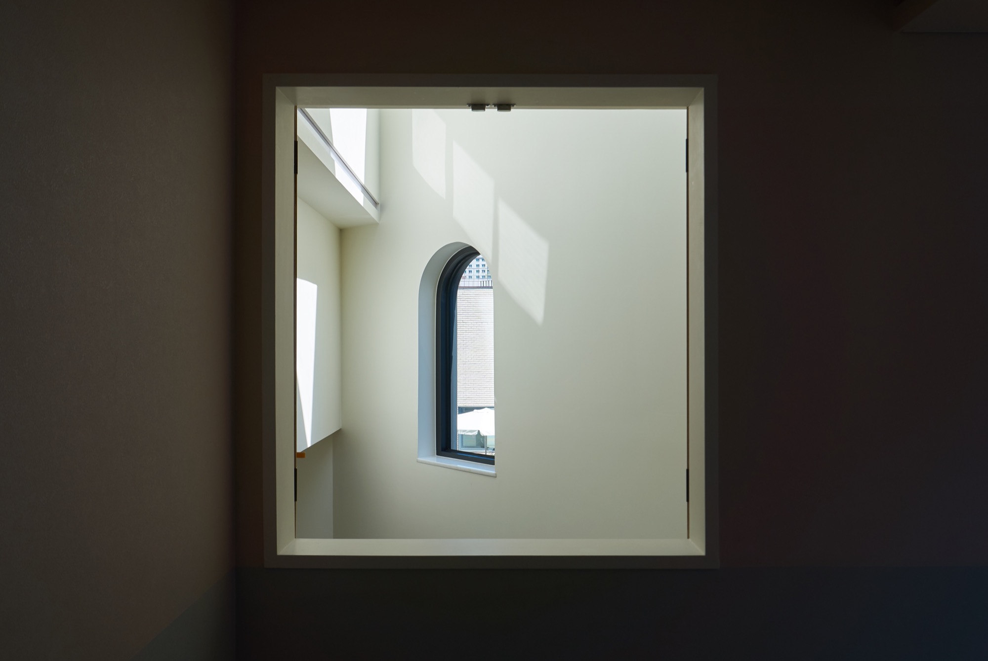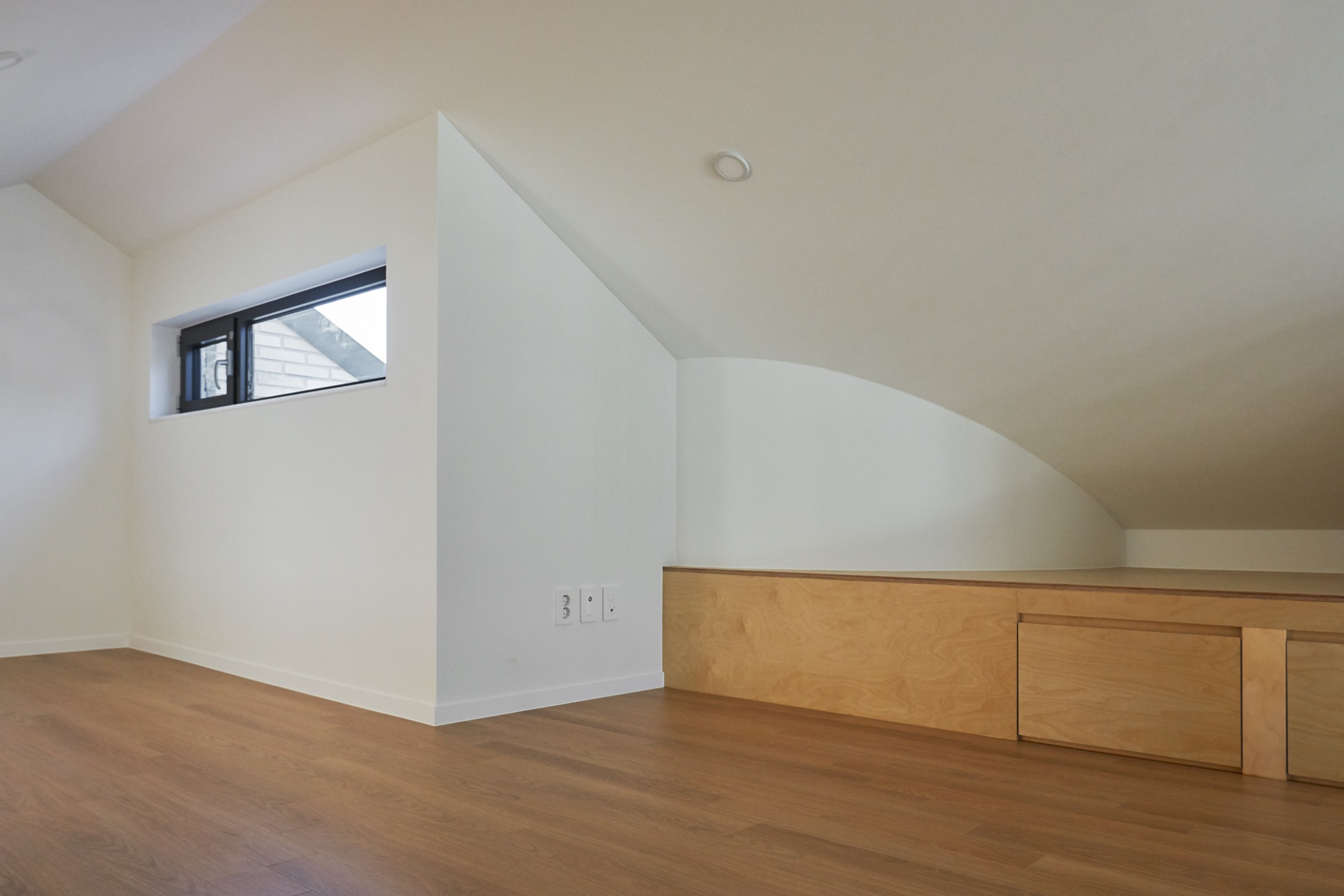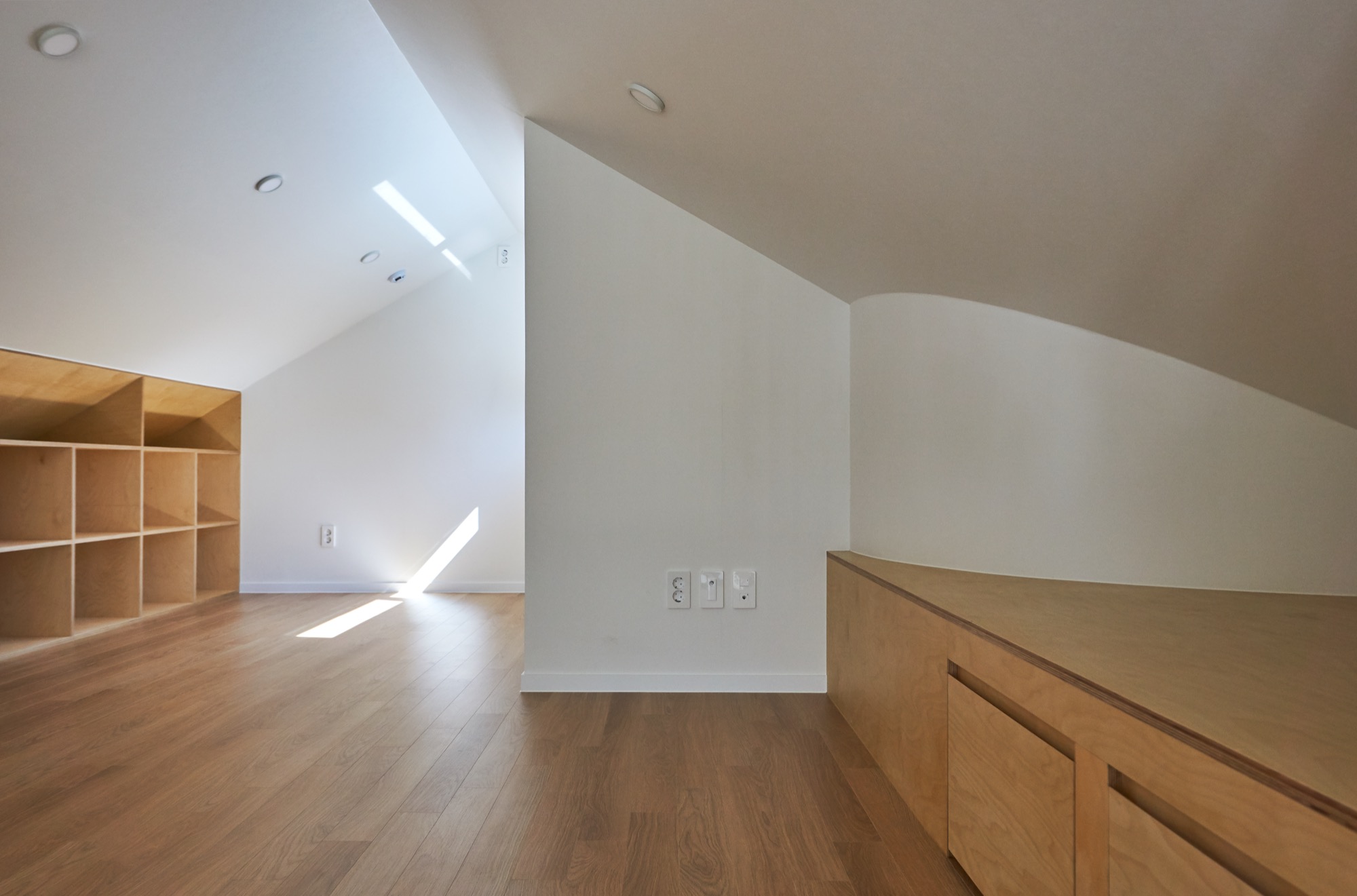 집의 전체적인 인테리어는 외관의 무거움을 덜어내는 방향으로 진행됐다. 커다란 볼륨이 주는 무게감에 건축주가 짓눌리지 않도록, 오픈 부위는 곡선을 활용하여 무게감을 덜었고, 조형이 주는 재미와 아름다움을 집안 내부에서도 즐길 수 있게 했다. 시간에 따라 달리 떨어지는 빛의 모습이 내부에서 잘 연출 될 수 있도록 최대한 단순한 형태의 조형으로 내부 공간을 만들어갔다.