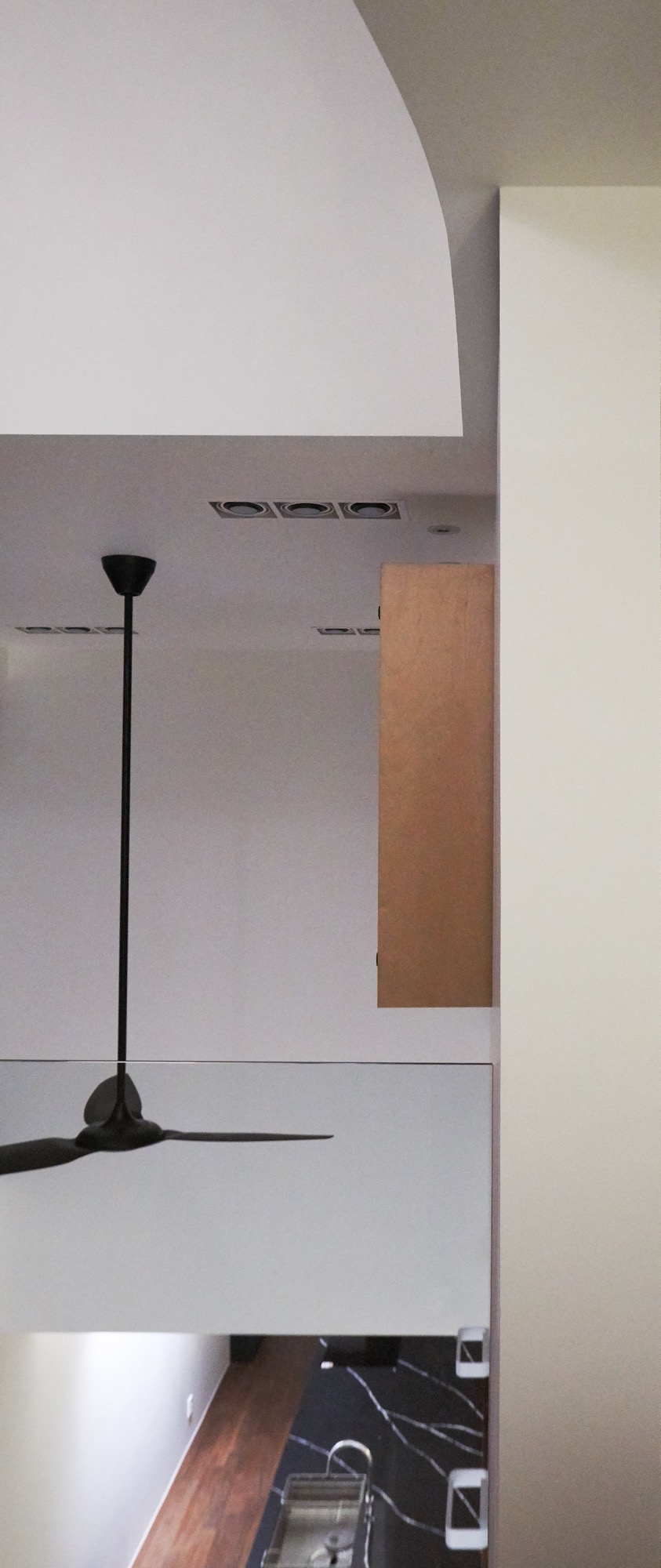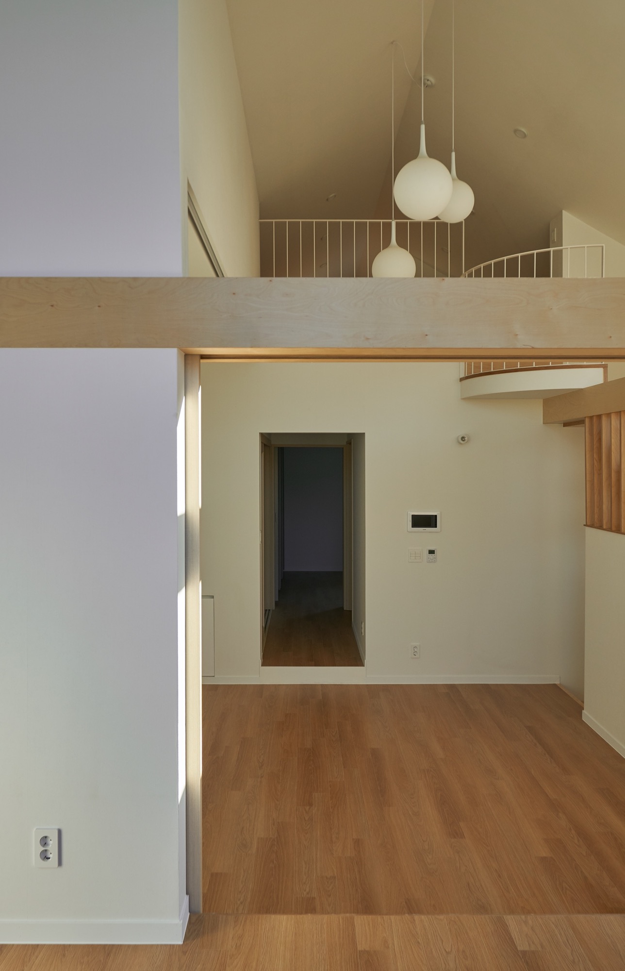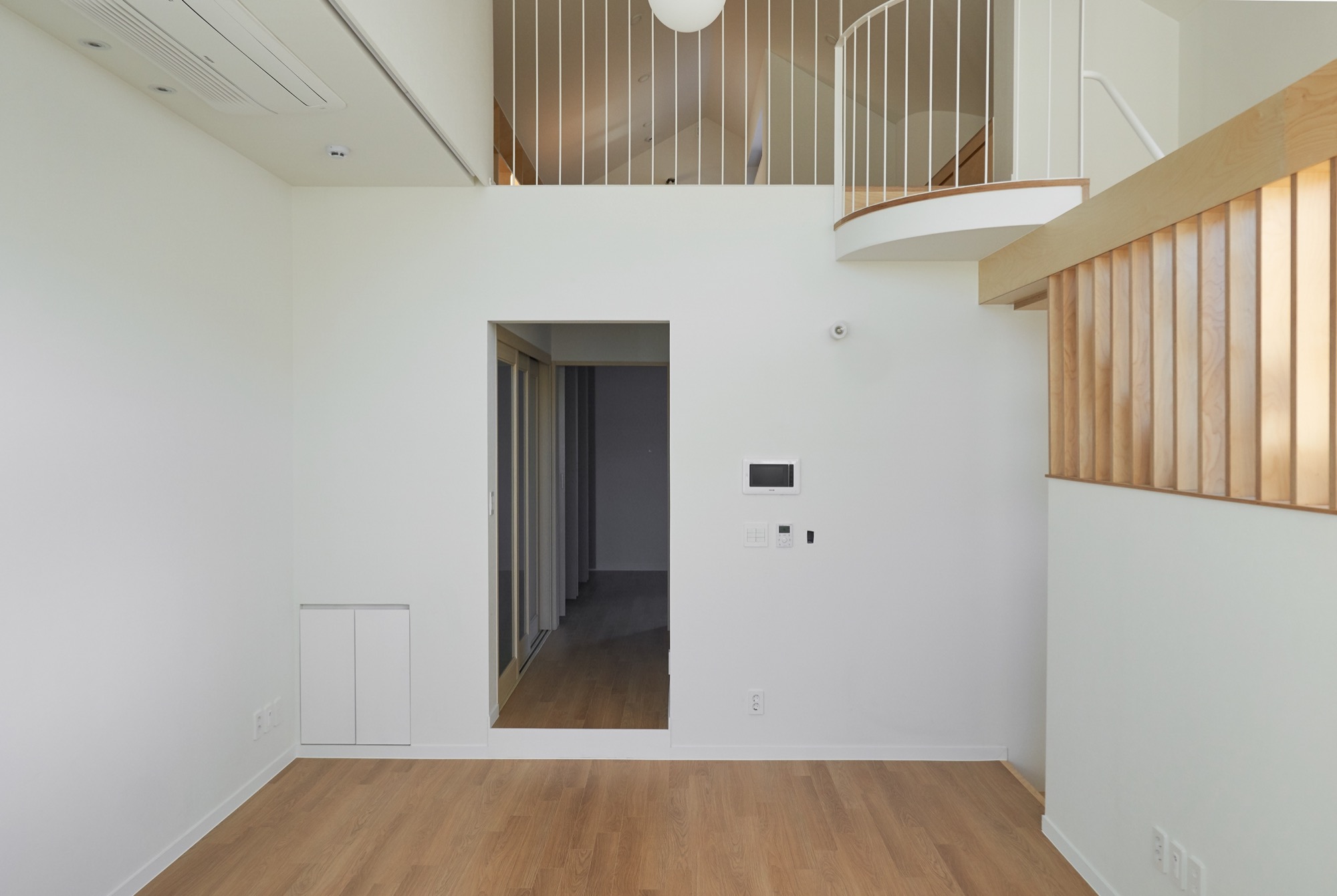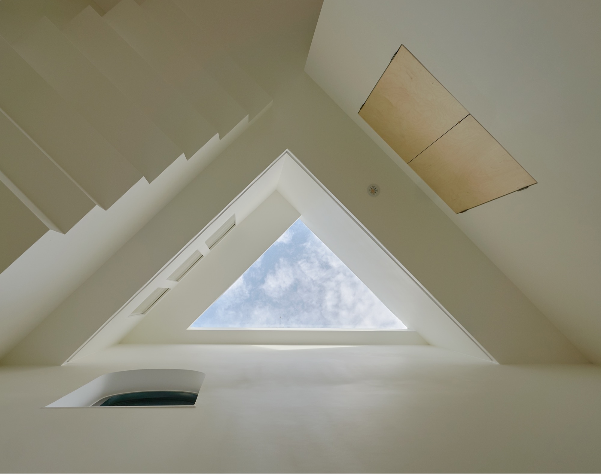 집의 전체적인 인테리어는 외관의 무거움을 덜어내는 방향으로 진행됐다. 커다란 볼륨이 주는 무게감에 건축주가 짓눌리지 않도록, 오픈 부위는 곡선을 활용하여 무게감을 덜었고, 조형이 주는 재미와 아름다움을 집안 내부에서도 즐길 수 있게 했다. 시간에 따라 달리 떨어지는 빛의 모습이 내부에서 잘 연출 될 수 있도록 최대한 단순한 형태의 조형으로 내부 공간을 만들어갔다.