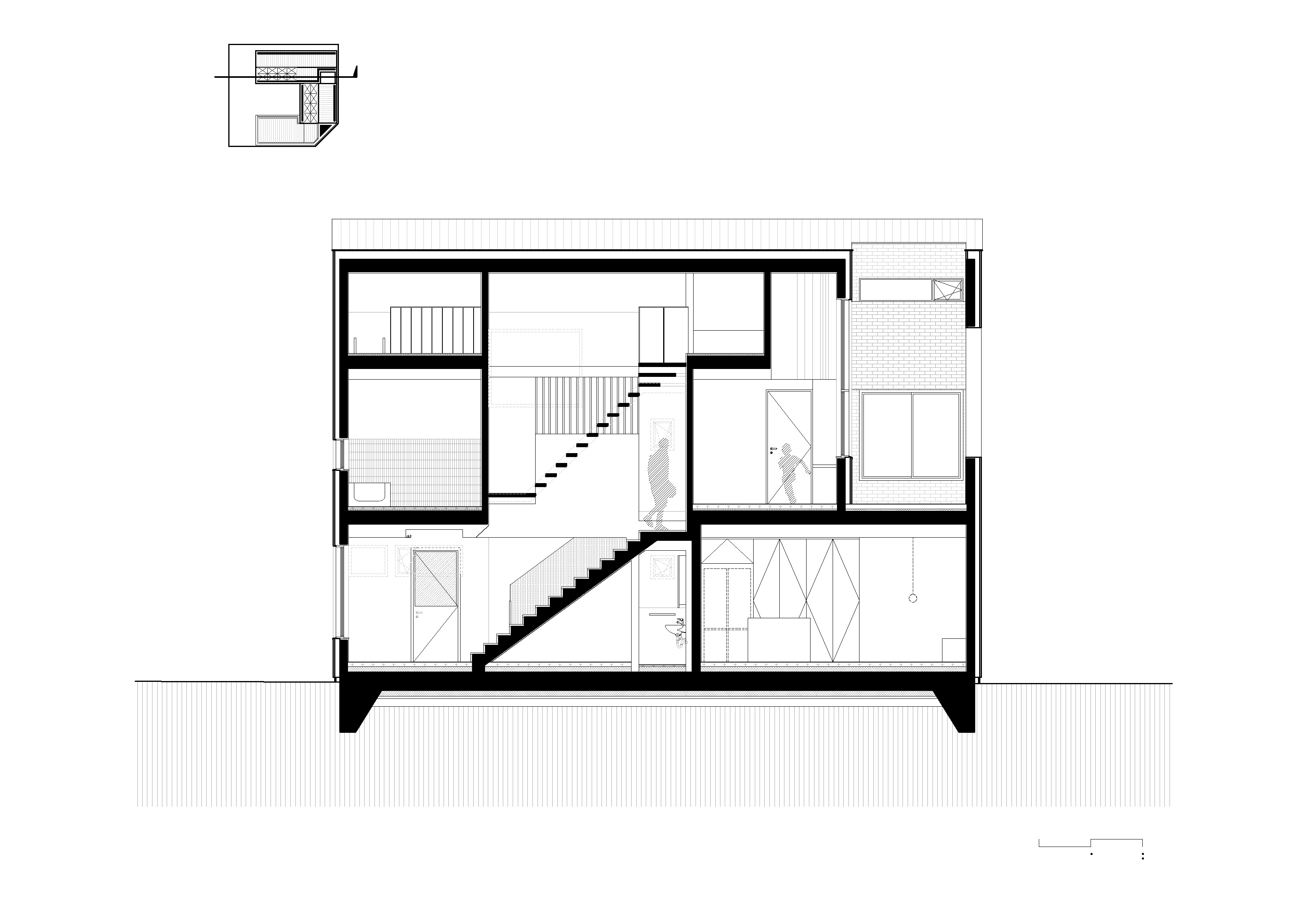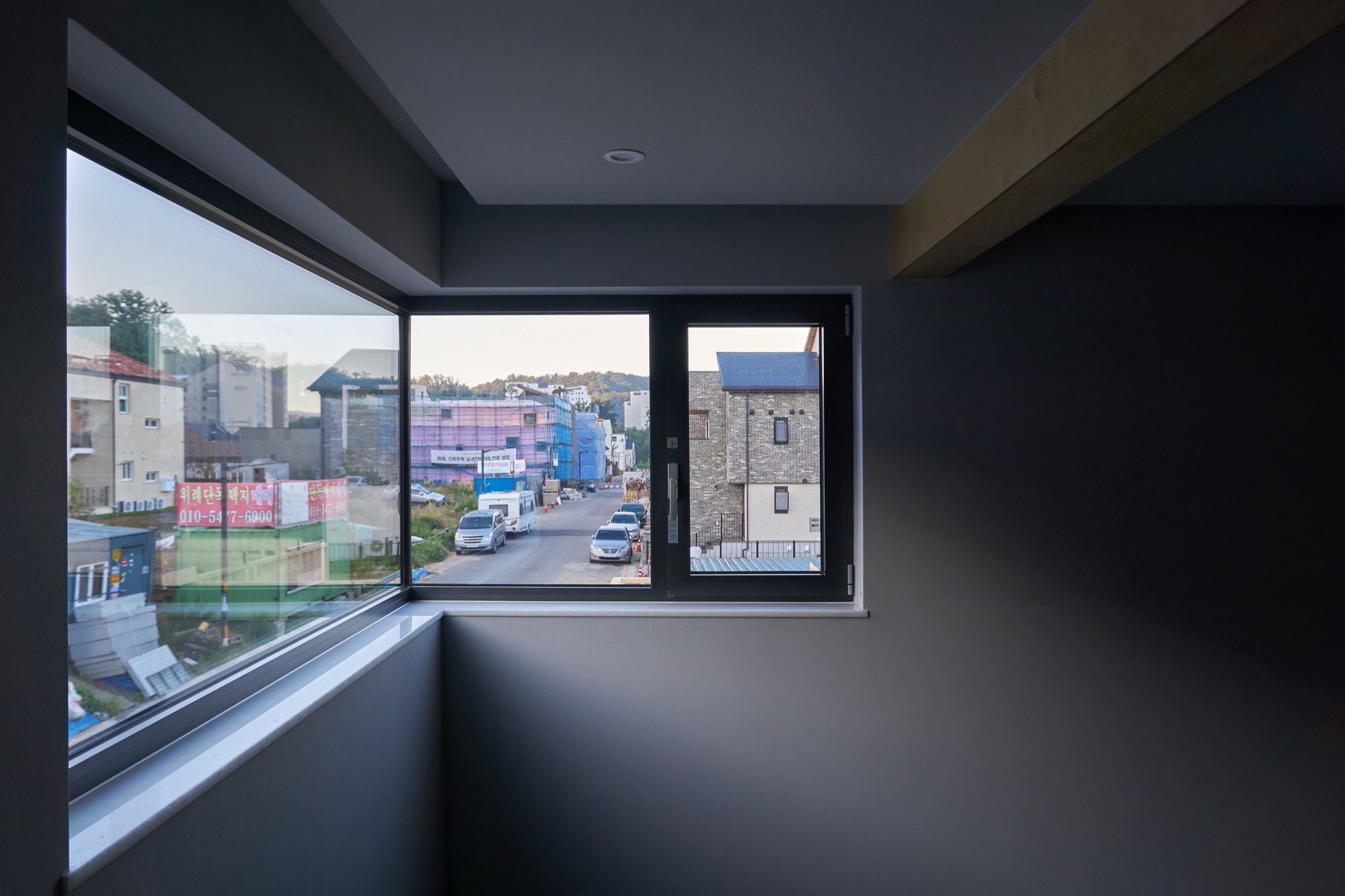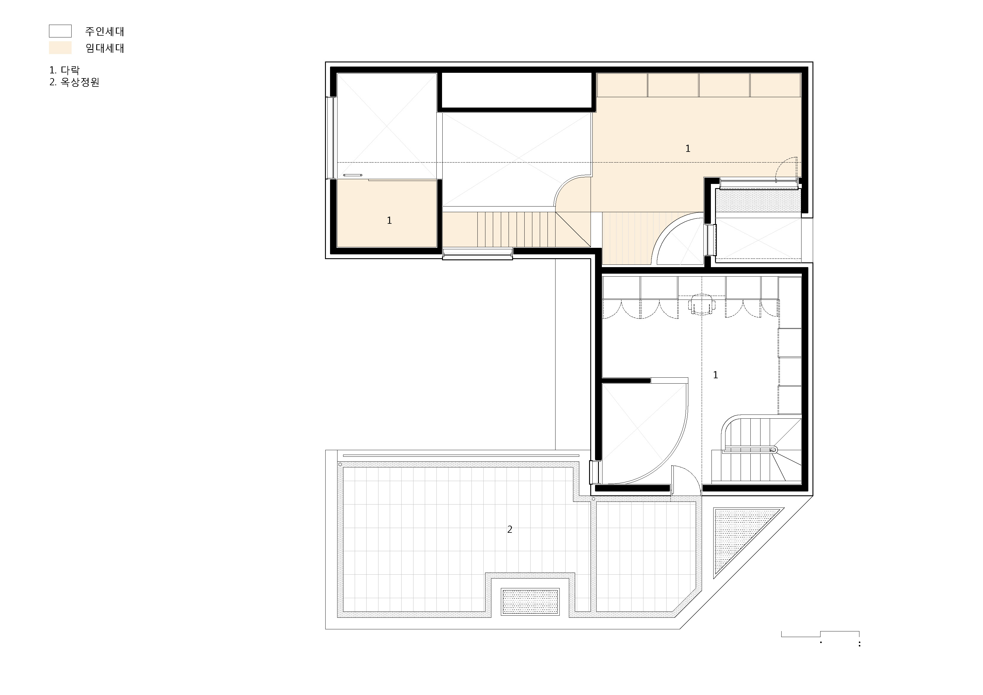 높은 땅값과 부족한 대지는 한 필지에 한 가구를 짓는 일이 사치로 느껴지게 한다. 건축주 역시 이런 문제를 해결하고자 듀플렉스 하우스로 집을 짓길 원했다. ‘ㄷ’자로 배치된 건물 형태를 따라 위쪽의 직선은 임대세대가, 아래쪽의 ‘ㄴ’자는 안마당과 함께 주인세대가 점유하는 방식으로 평면을 풀어나갔다.