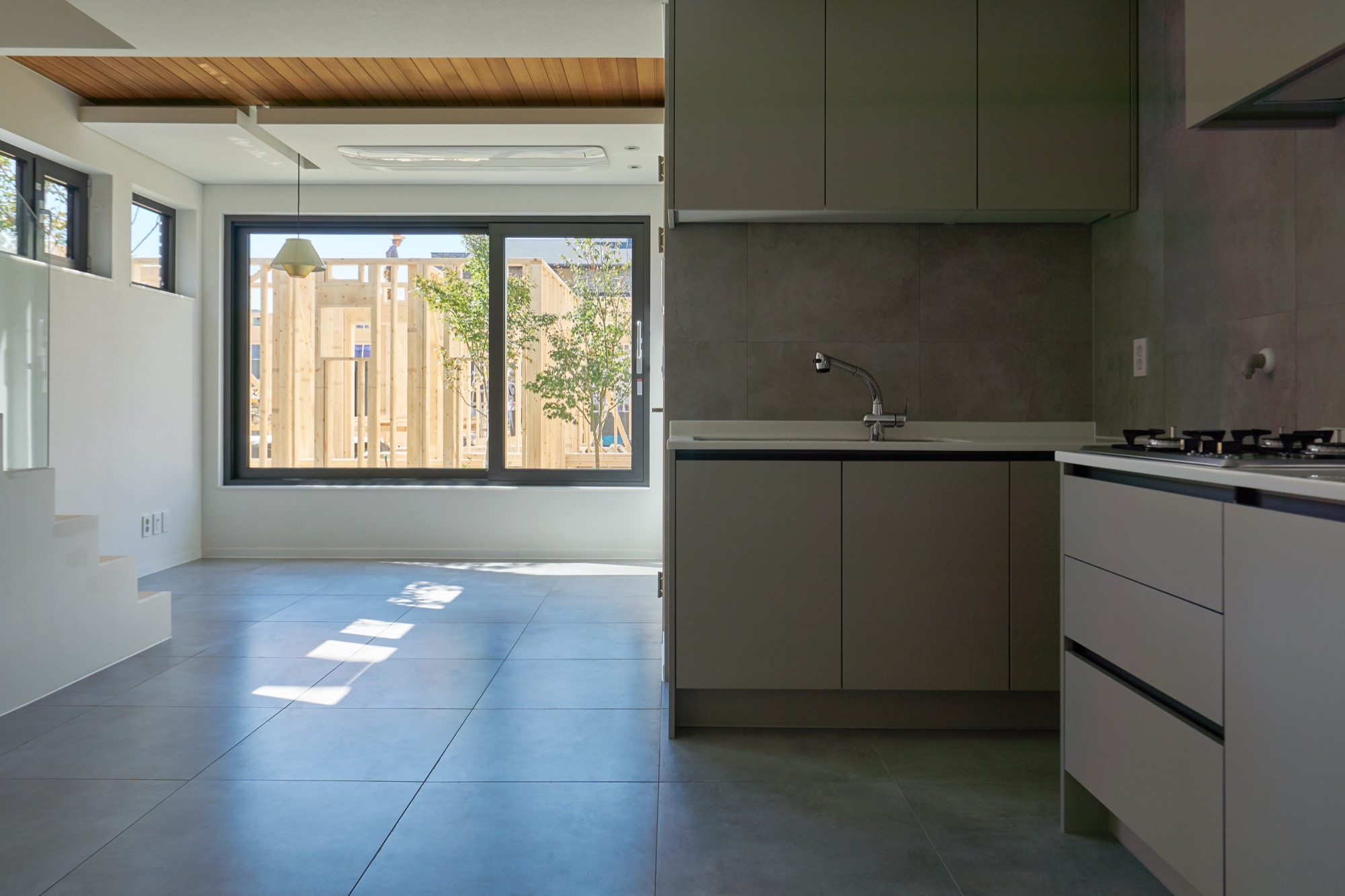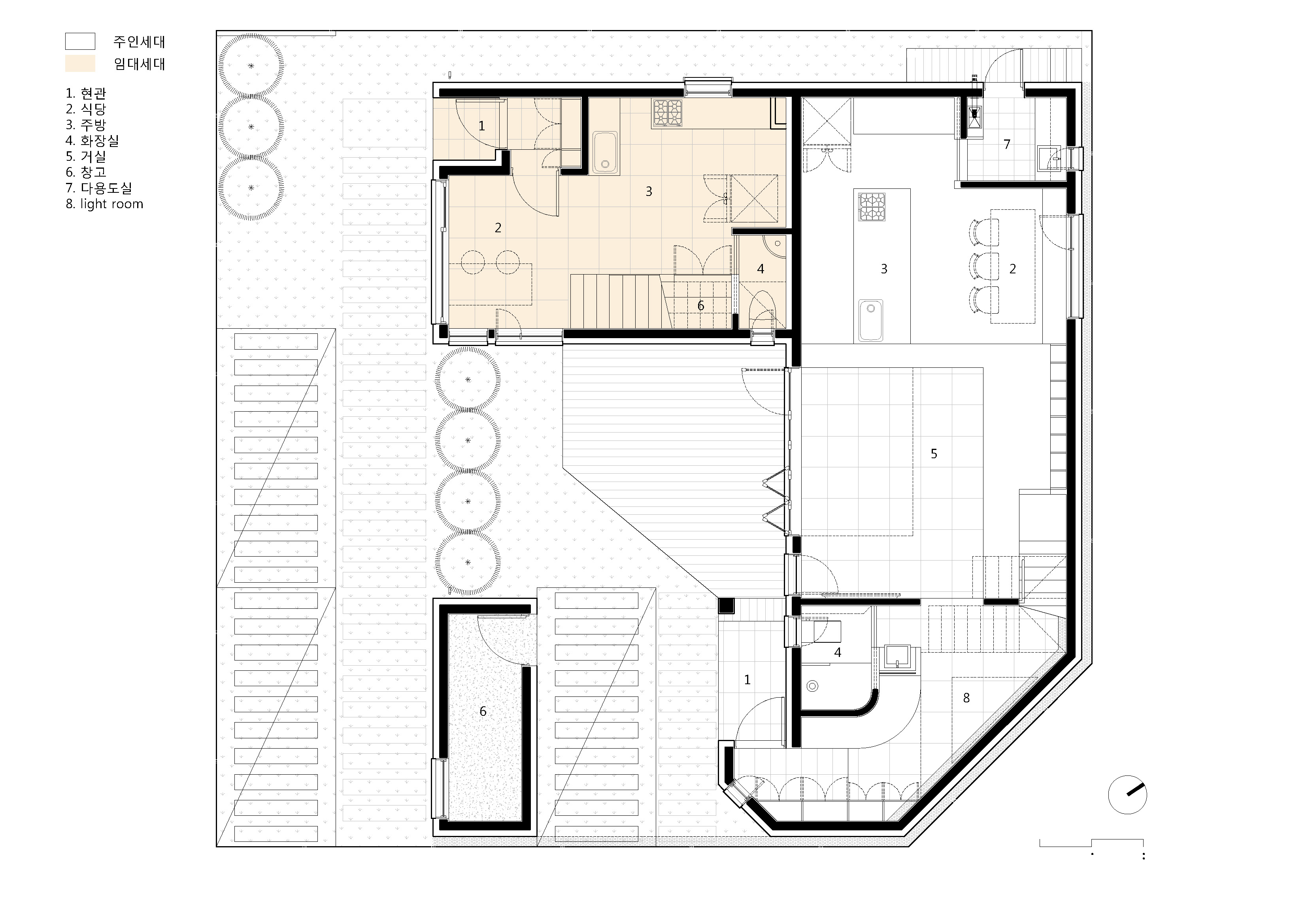 주인세대의 강한 취향과 이상과는 달리 임대세대는 보편적인 특성과 더불어 집의 조화를 깨지 않는 범위 내로 진행했다. 작은 평수의 집이지만 누가 들어와서 살던지 단독주택만이 줄 수 있는 소담한 공간감을 만들 수 있게 구성하였다. 1층은 식당과 주방을 배치하여 포켓 정원을 바라보며 즐거운 한 끼를 나눌 수 있고, 2층은 거실과 침실을 배치하여 생활에 불편함이 없도록 하였다. 면적의 불리함은 수직적인 확장으로 동일 면적대 아파트에서는 느낄 수 없는 쾌적한 환경을 만들 수 있었다.