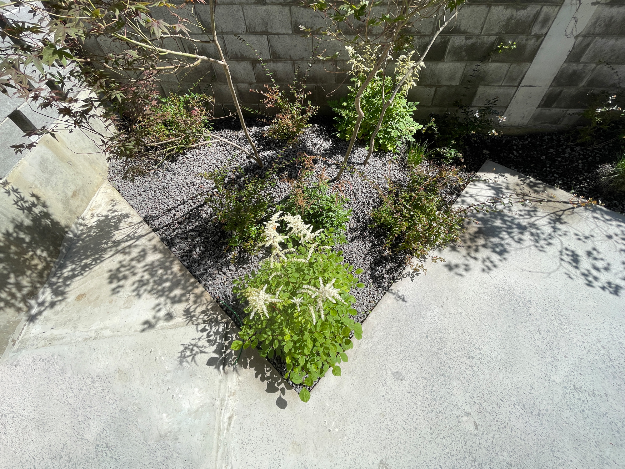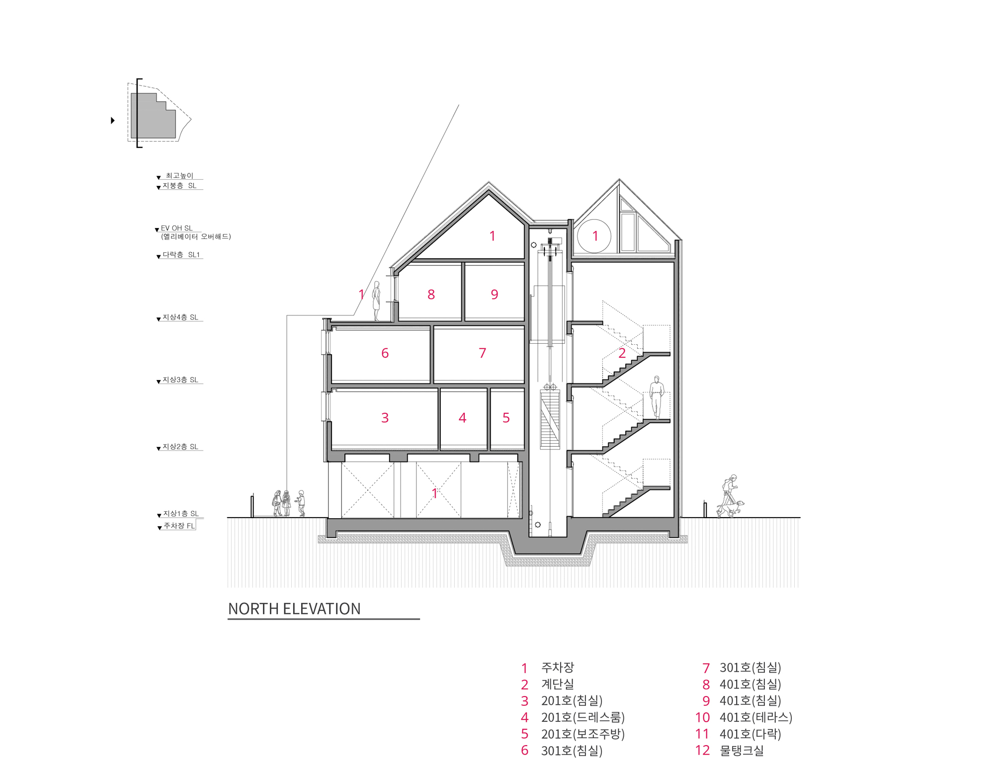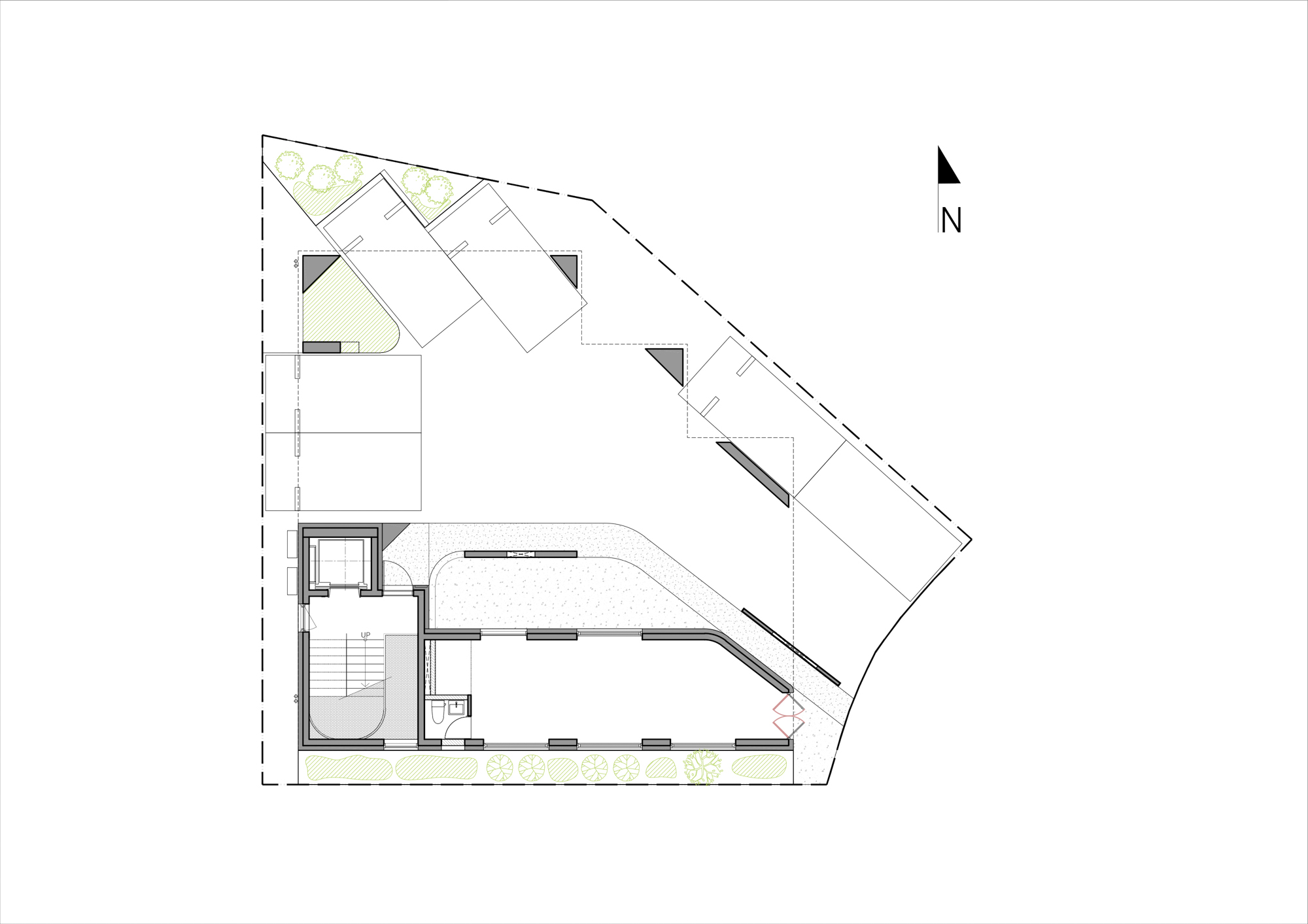 보행로와 차로를 분리하는 바닥과 벽체의 디자인은 길의 표정을 다채롭게 만든다. 좁은 입구를 극복하기 위해 피로티 주차공간을 삼각형 기둥으로 장식과 구조를 해결했다.