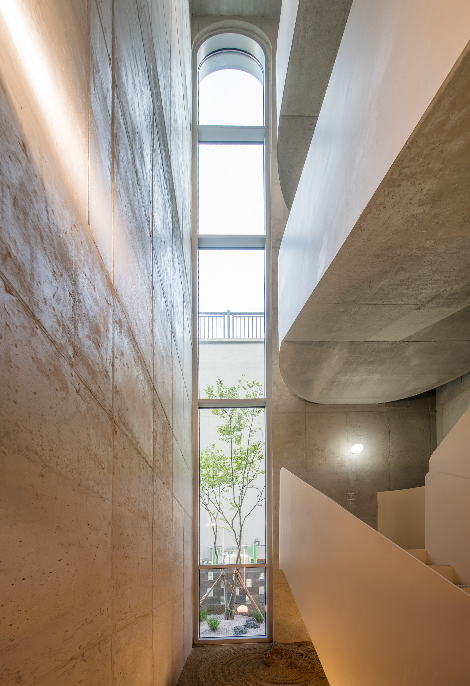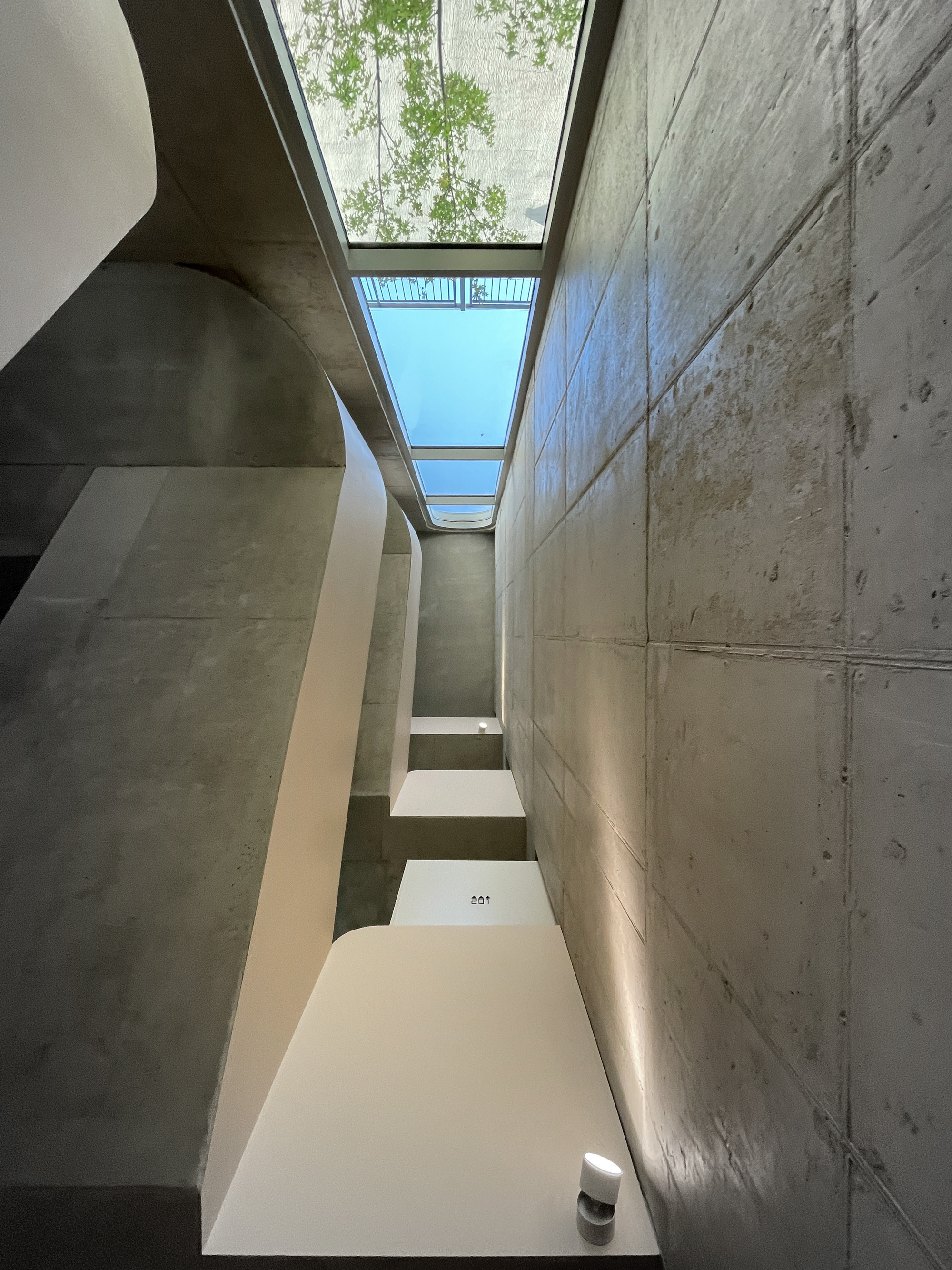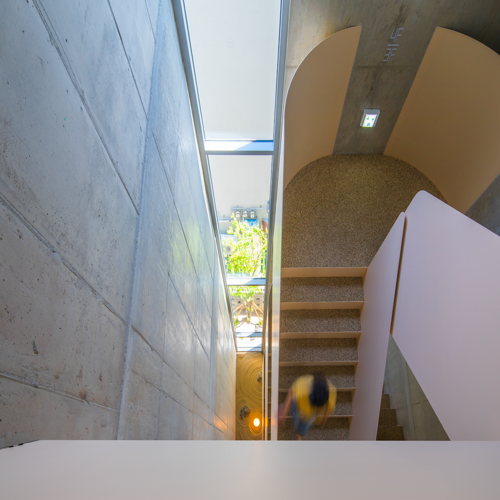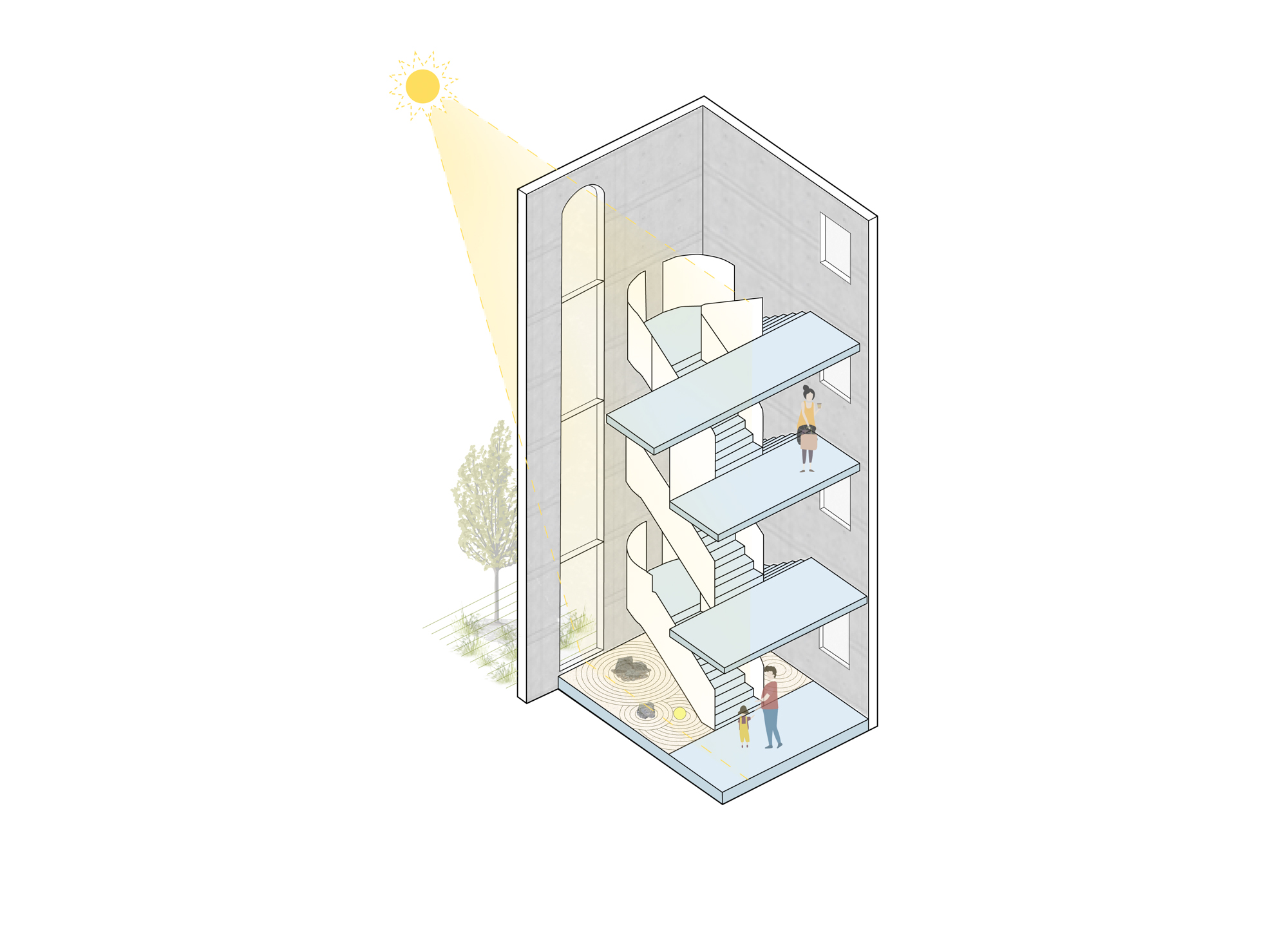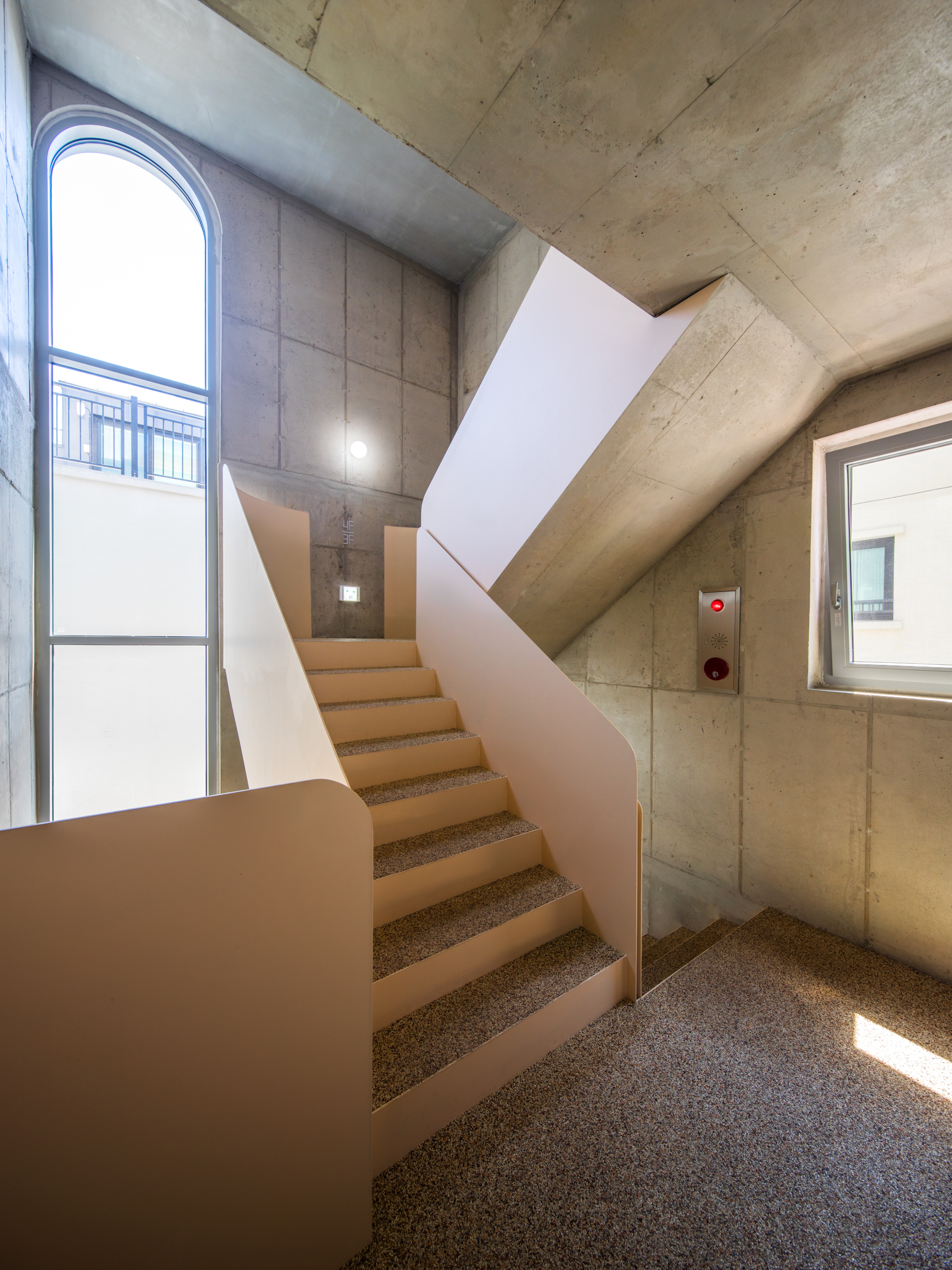 계단실에 90cm 여유 공간으로 빛이 들어온다. 보통의 공간에서 90cm만으로 일상이 특별해지는 건축적 경험을 할 수 있다. 출입문을 열고 가장 먼저 마주하게 되는 이곳 공용 공간에는 높이 11m에 달하는 수직 창이 남측 면에 계획하여 다가구 주택에서는 기대하기 힘든 밝고 개방감 있는 공간감을 마주한다. 공동 주택은 서로 공간과 기억을 공유한다. 그 공간들은 색과 재료로 이루어져 있다. 건축 공간의 체험은 집에 대한 질감의 형태로 기억될 것이다.■