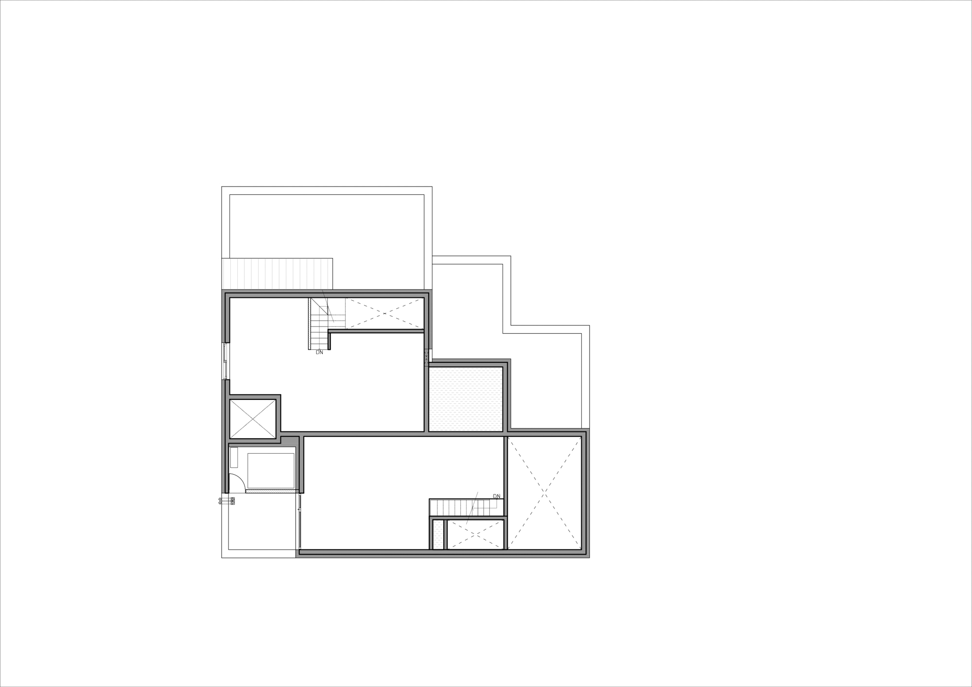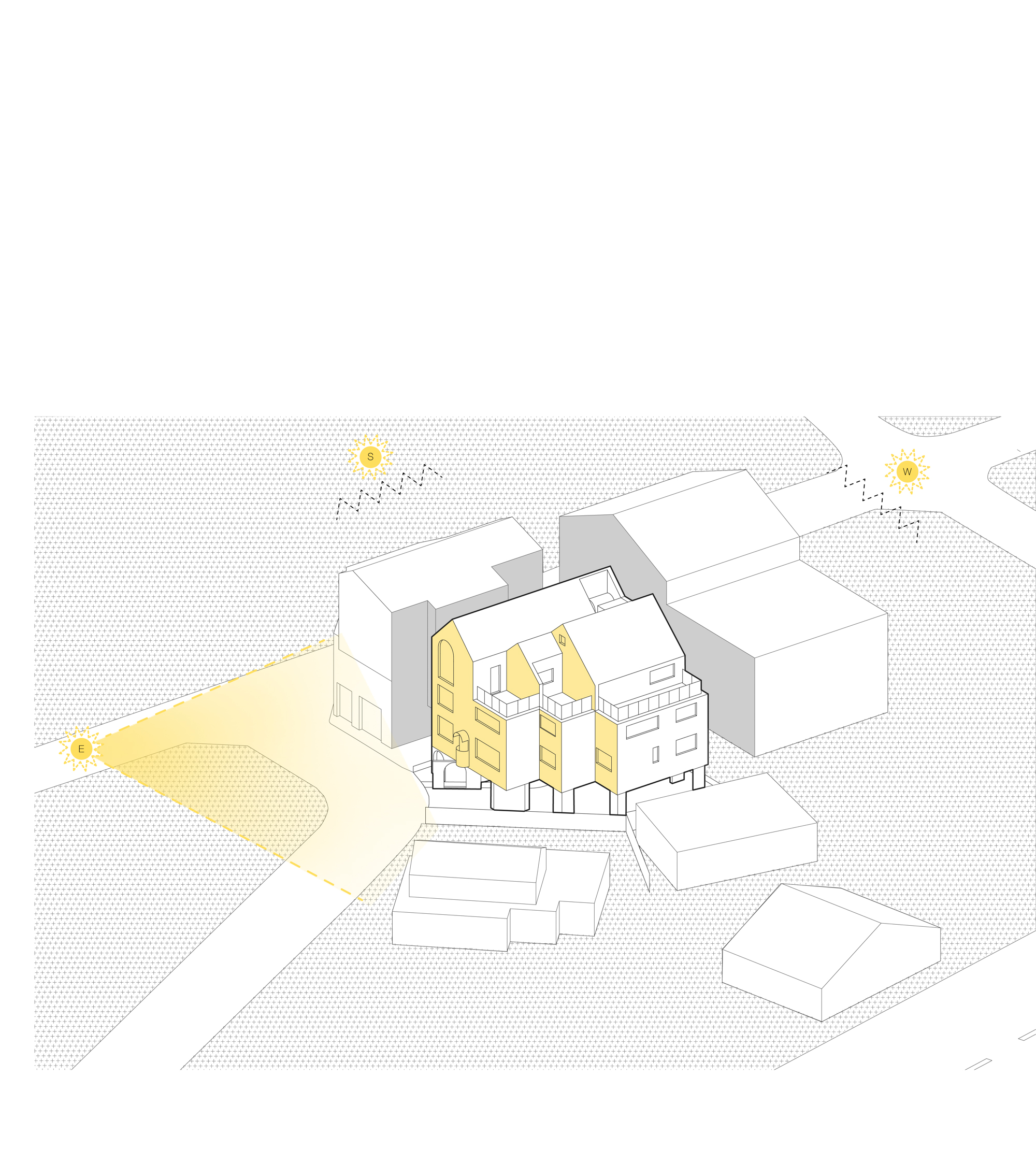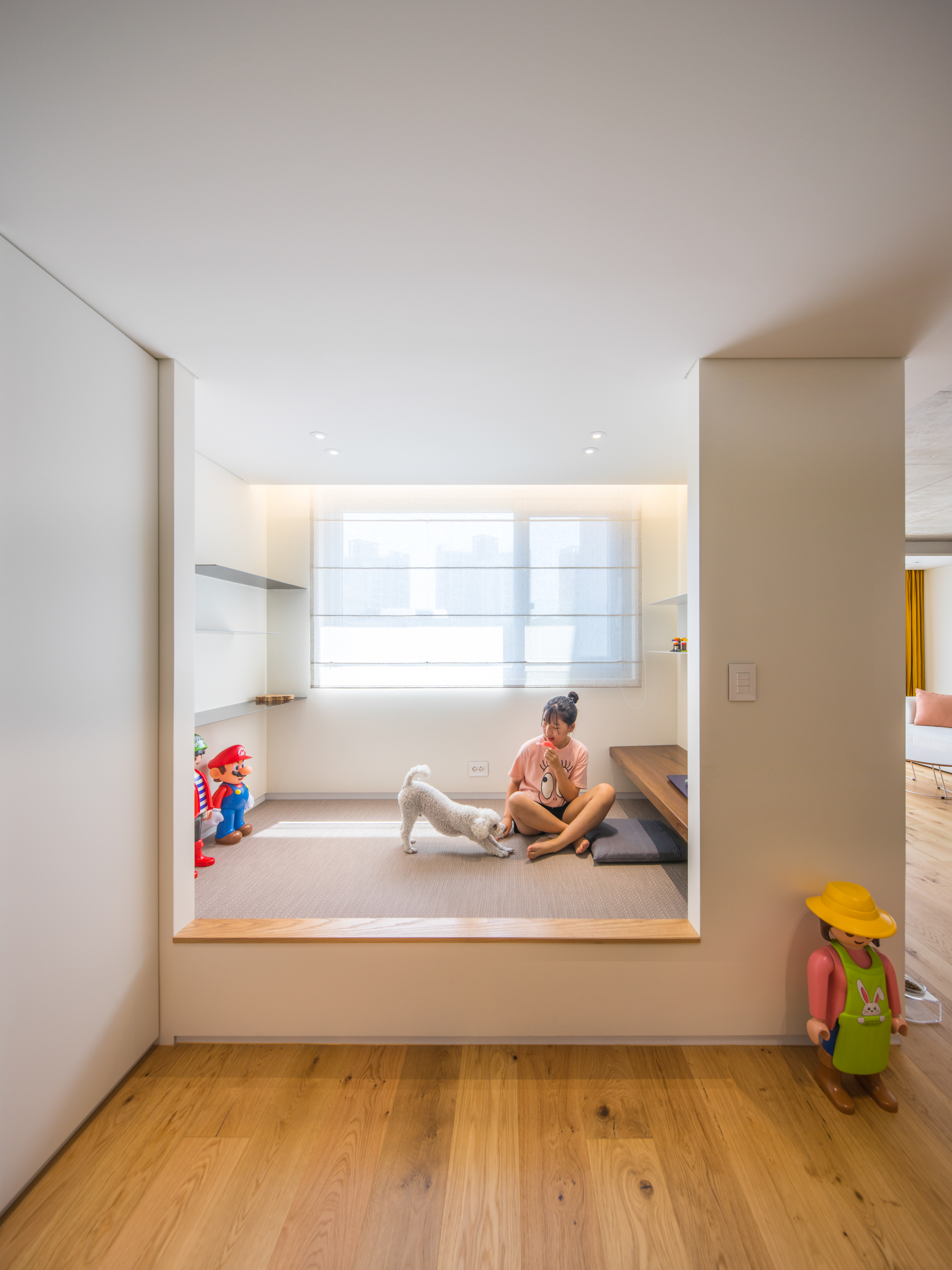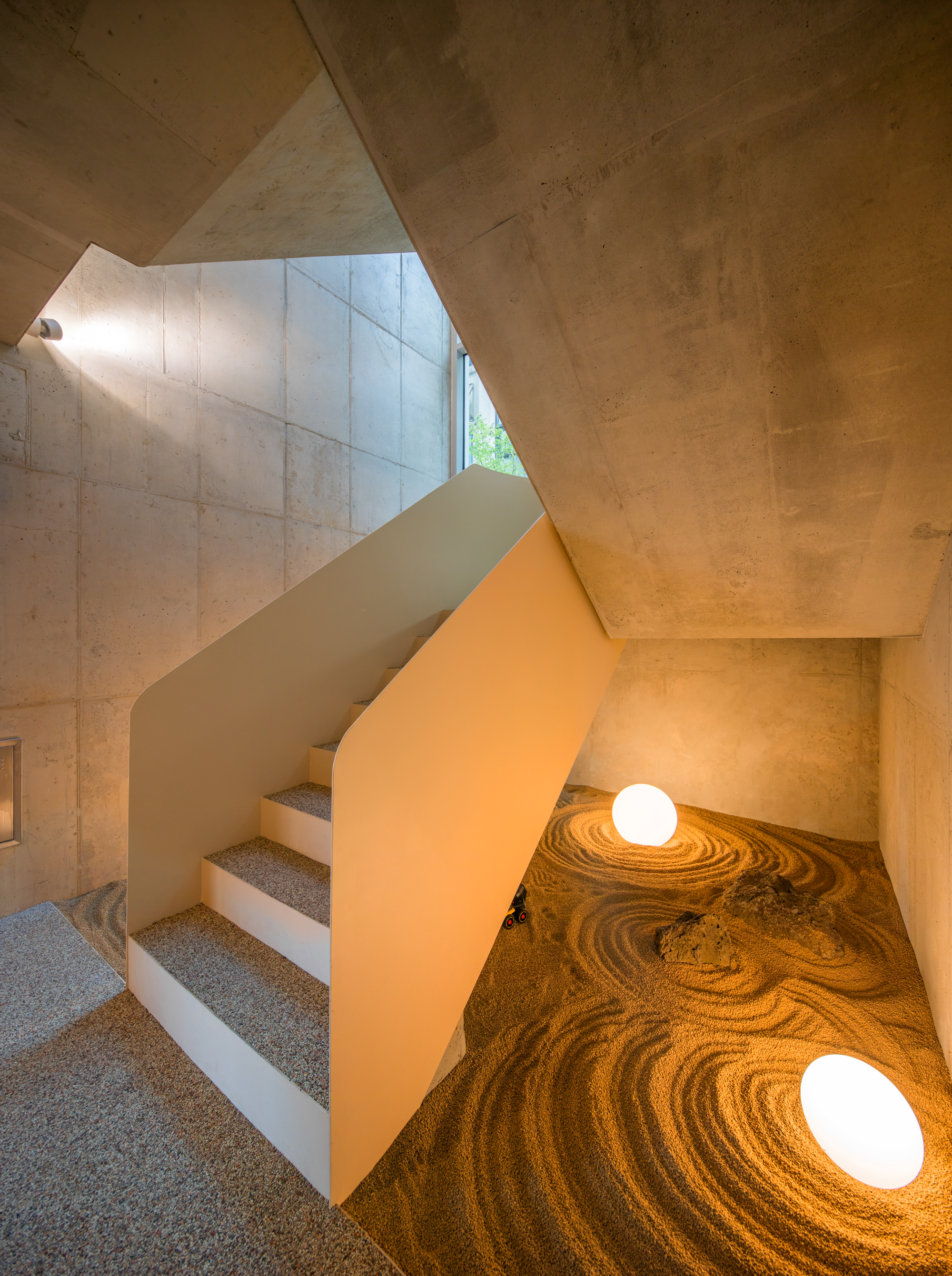 계단실에 90cm 여유 공간으로 빛이 들어온다. 보통의 공간에서 90cm만으로 일상이 특별해지는 건축적 경험을 할 수 있다. 출입문을 열고 가장 먼저 마주하게 되는 이곳 공용 공간에는 높이 11m에 달하는 수직 창이 남측 면에 계획하여 다가구 주택에서는 기대하기 힘든 밝고 개방감 있는 공간감을 마주한다. 공동 주택은 서로 공간과 기억을 공유한다. 그 공간들은 색과 재료로 이루어져 있다. 건축 공간의 체험은 집에 대한 질감의 형태로 기억될 것이다.■