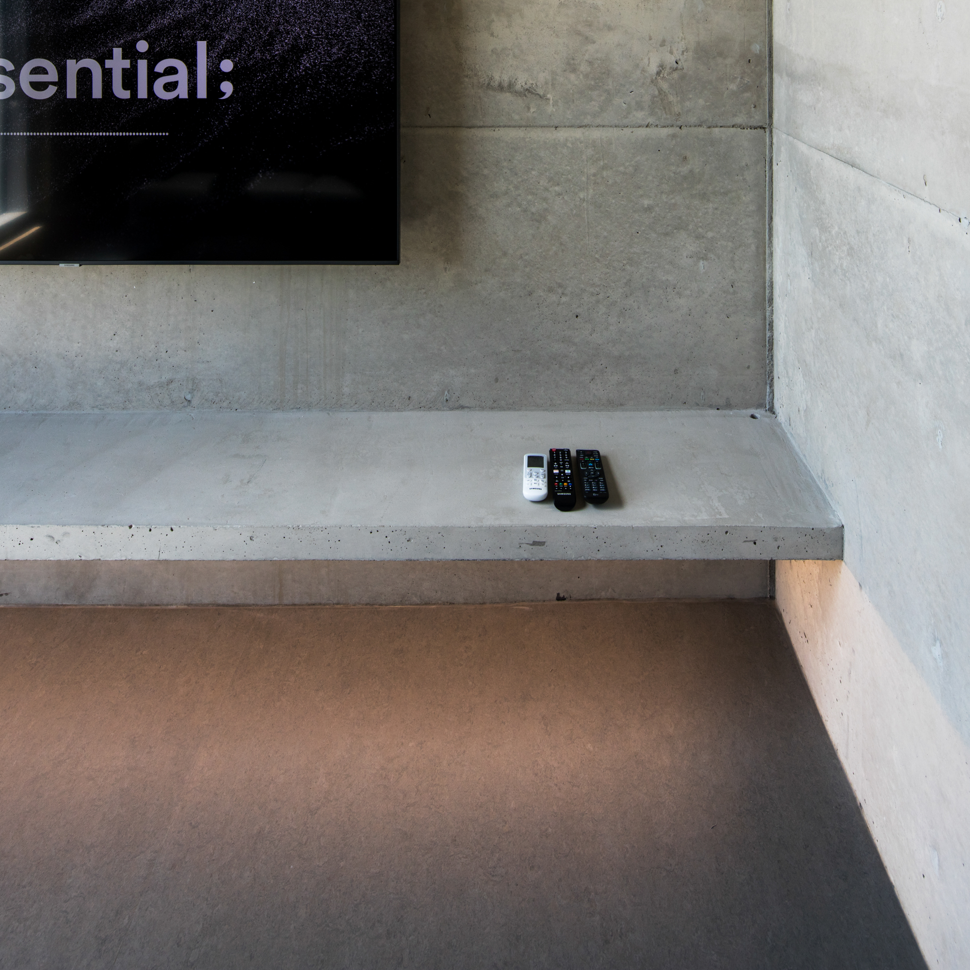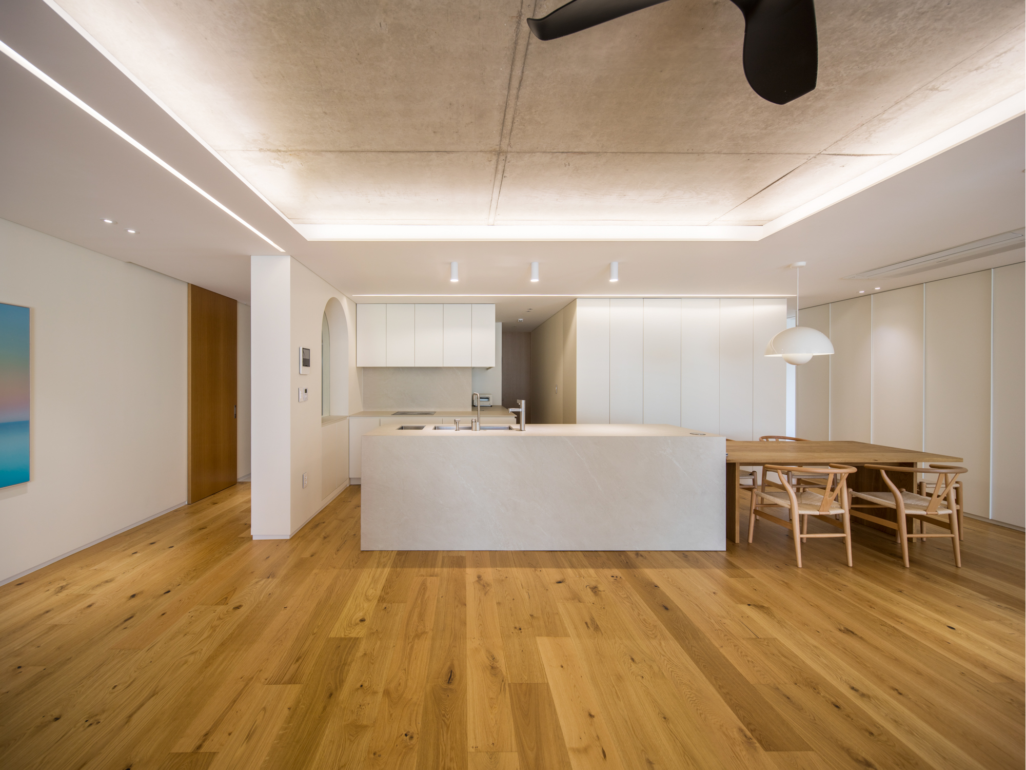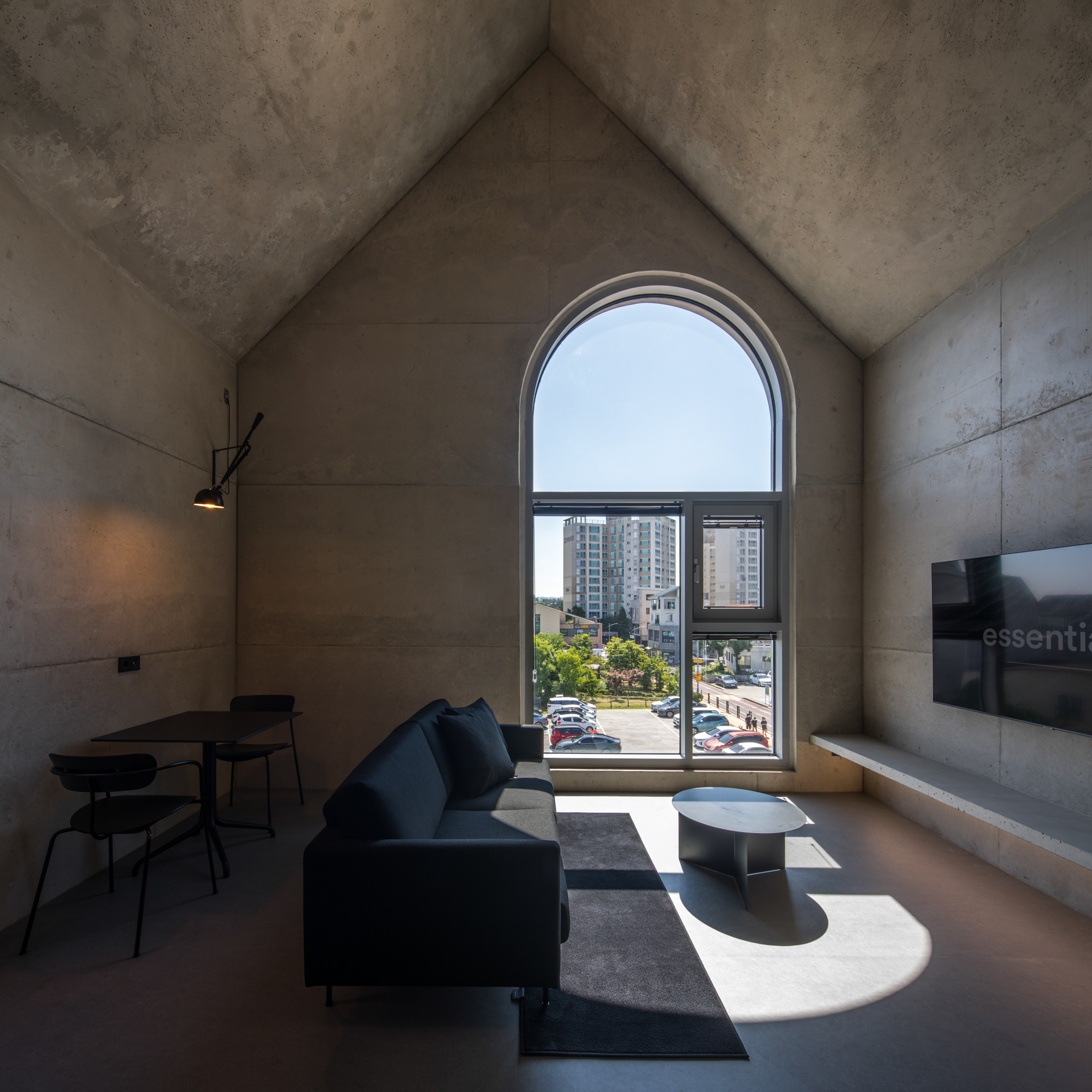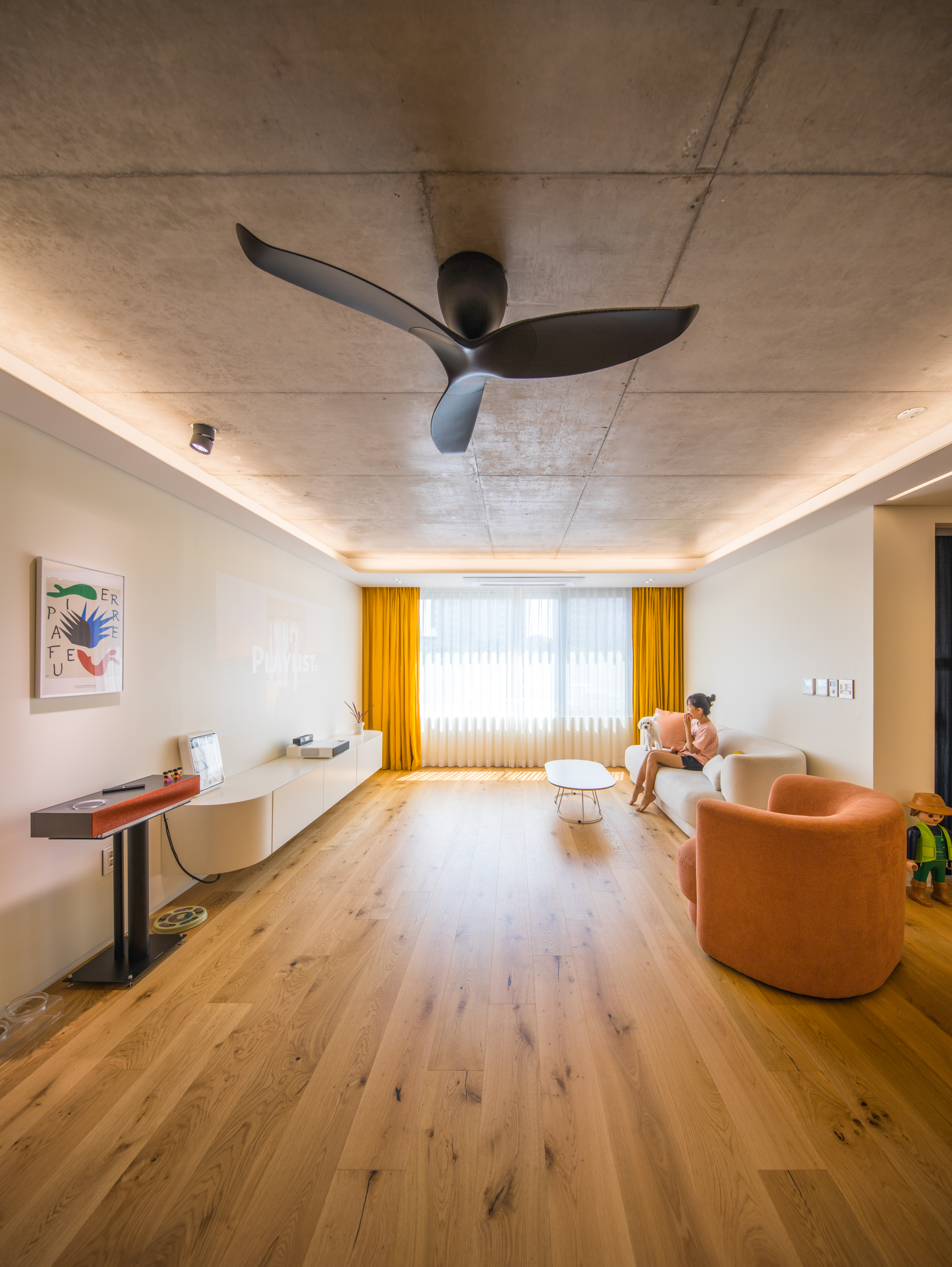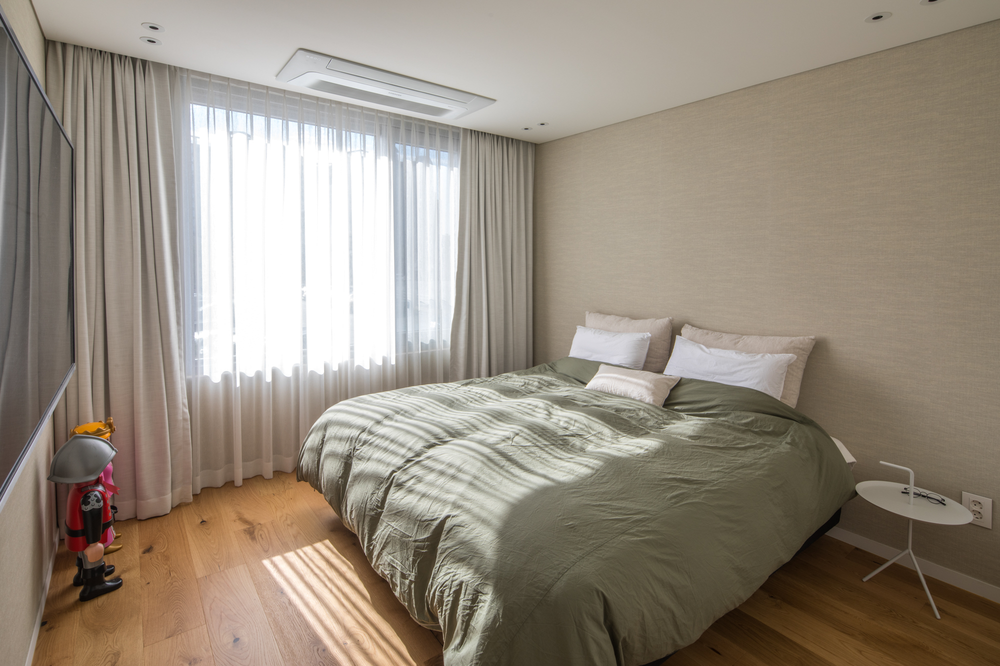 계단실에 90cm 여유 공간으로 빛이 들어온다. 보통의 공간에서 90cm만으로 일상이 특별해지는 건축적 경험을 할 수 있다. 출입문을 열고 가장 먼저 마주하게 되는 이곳 공용 공간에는 높이 11m에 달하는 수직 창이 남측 면에 계획하여 다가구 주택에서는 기대하기 힘든 밝고 개방감 있는 공간감을 마주한다. 공동 주택은 서로 공간과 기억을 공유한다. 그 공간들은 색과 재료로 이루어져 있다. 건축 공간의 체험은 집에 대한 질감의 형태로 기억될 것이다.■