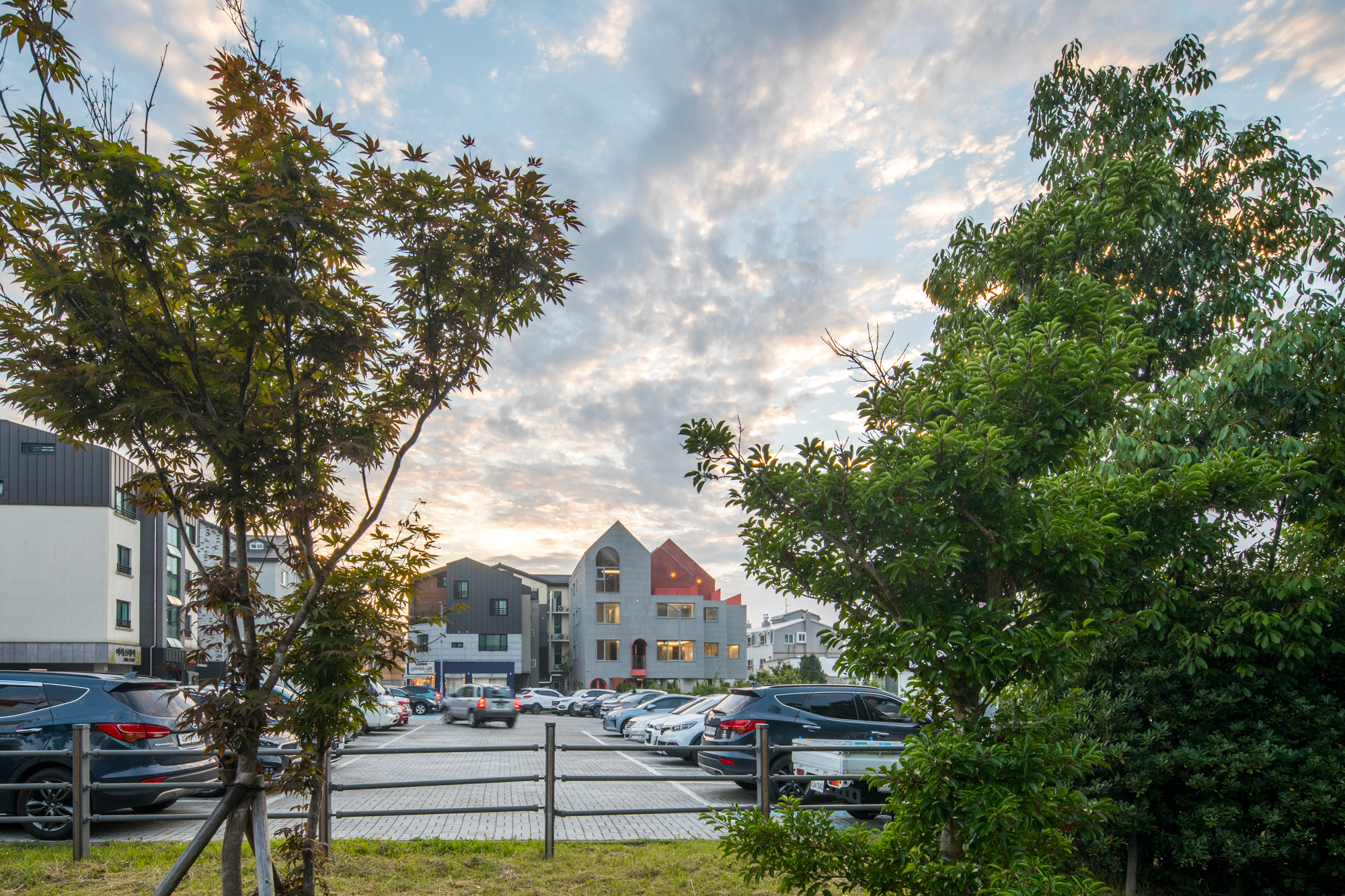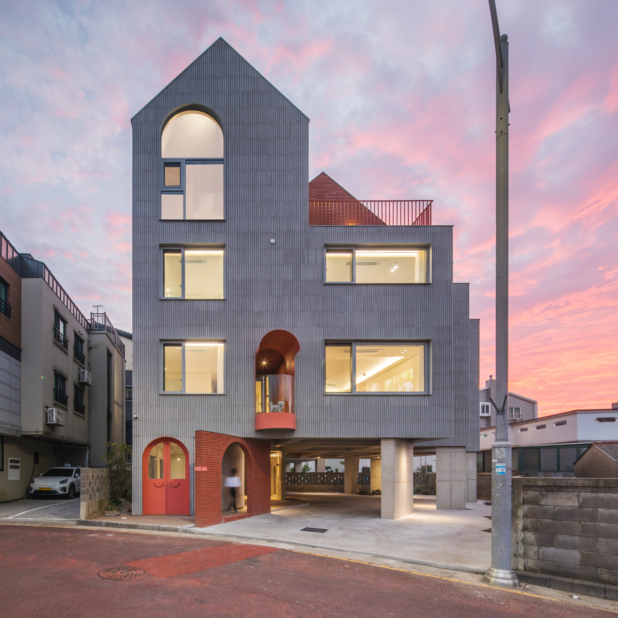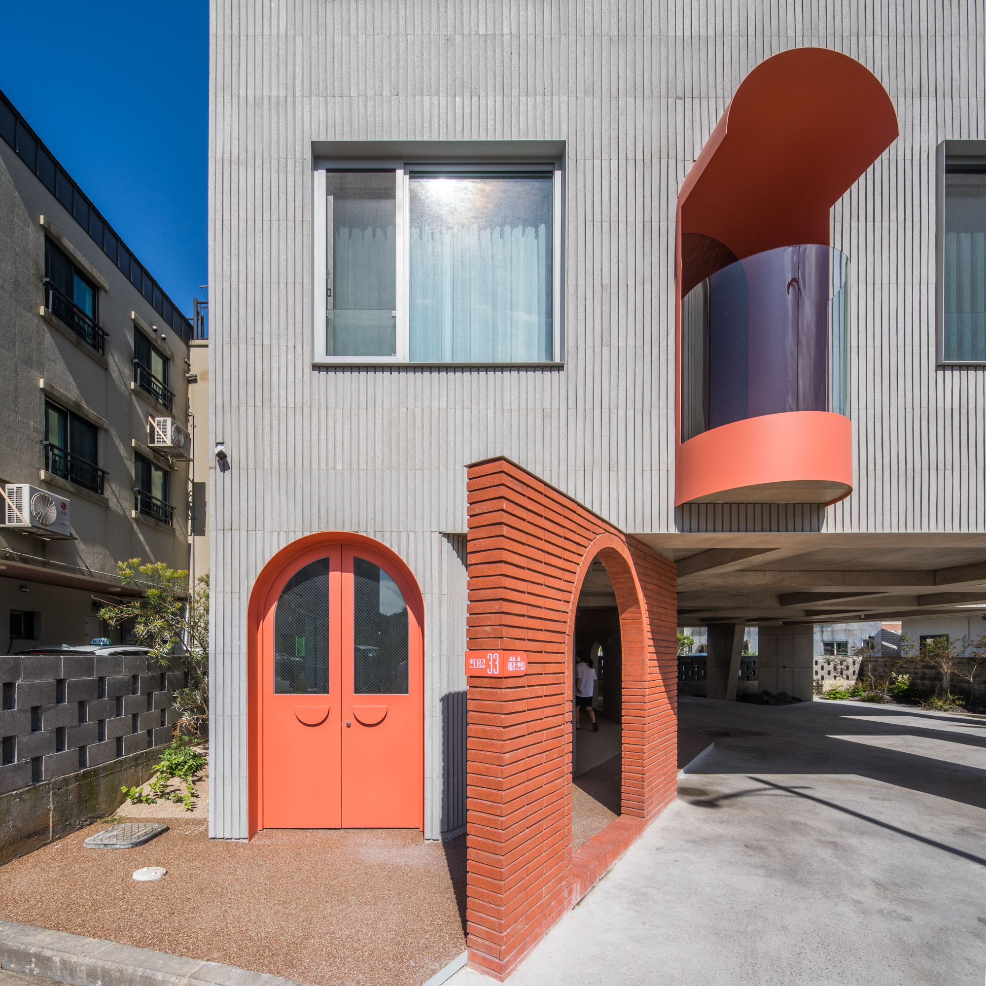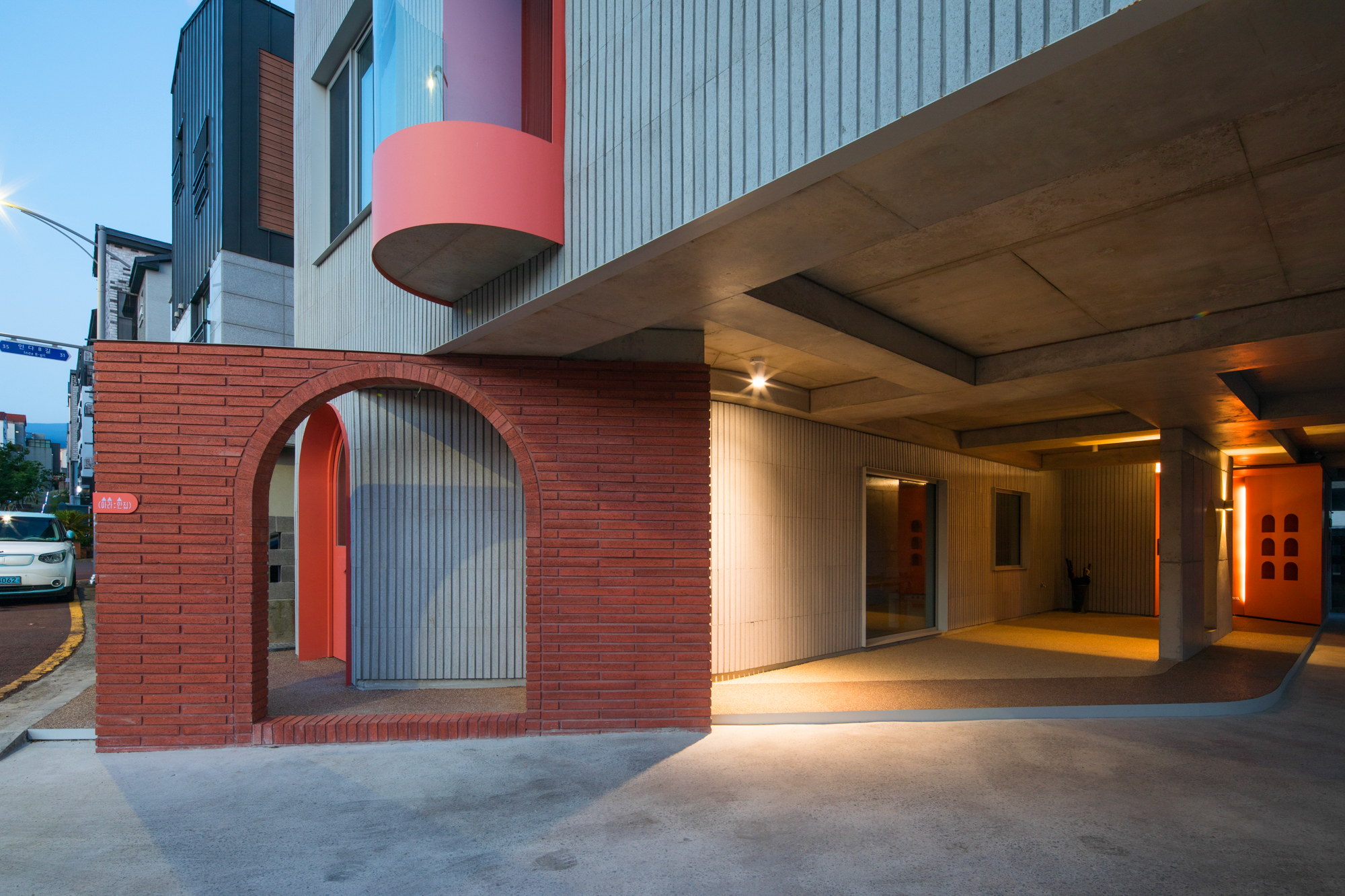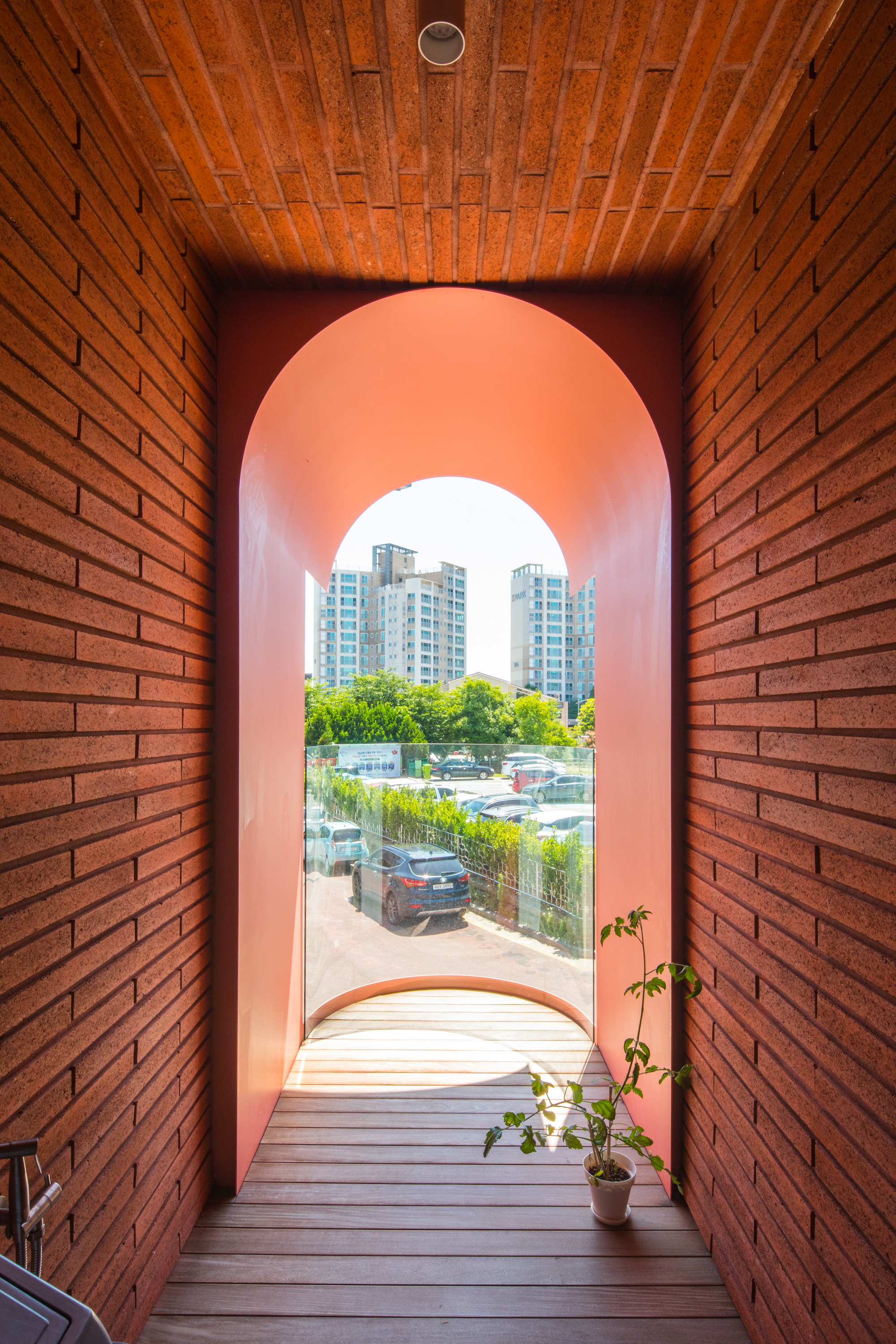 진입 공간의 시작에 건물 밖으로 튀어나온 진입 가벽을 형성하였다. 구조적으로는 기둥의 역할을 하는 이 가벽은 포인트 색상이 되는 붉은색 치장 벽돌을 적용하여 안쪽에 형성된 출입구 대신 입구로서의 상징성을 잡아준다. 가벽에는 아치형의 개구부가 있는데 이는 아치 형태의 근생 출입구와 2층의 돌출 발코니와 더불어 건물과 대비되는 강렬한 색상을 적용했다. 그래서 도로를 지나며 보이는 아이 레벨에서의 건물 정체성을 나타낸다. 동쪽으로만 좁게 열려있고, 남쪽으로 완전히 막혀있는 부지에서 가장 효율적인 채광 면적과 조망을 형성한다.