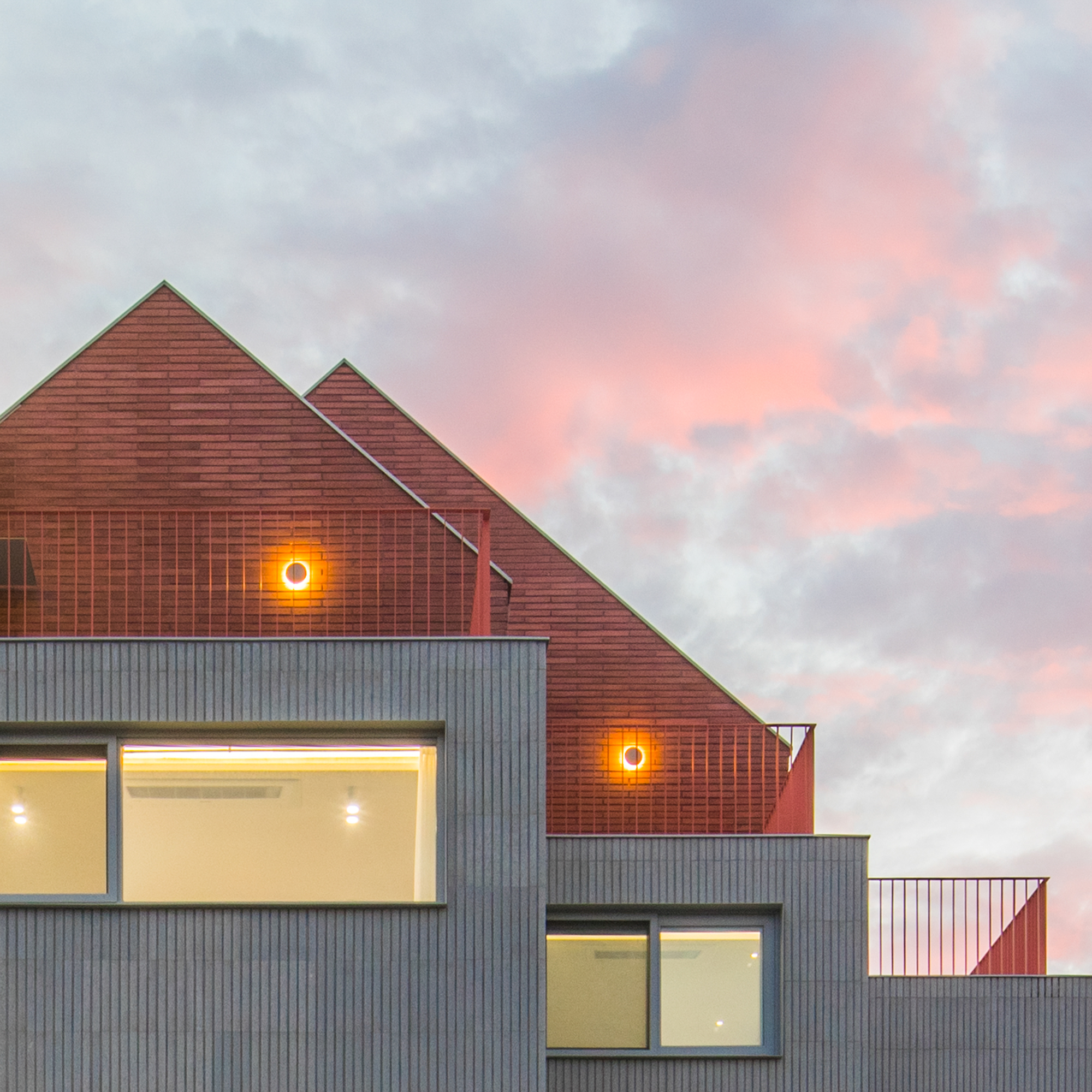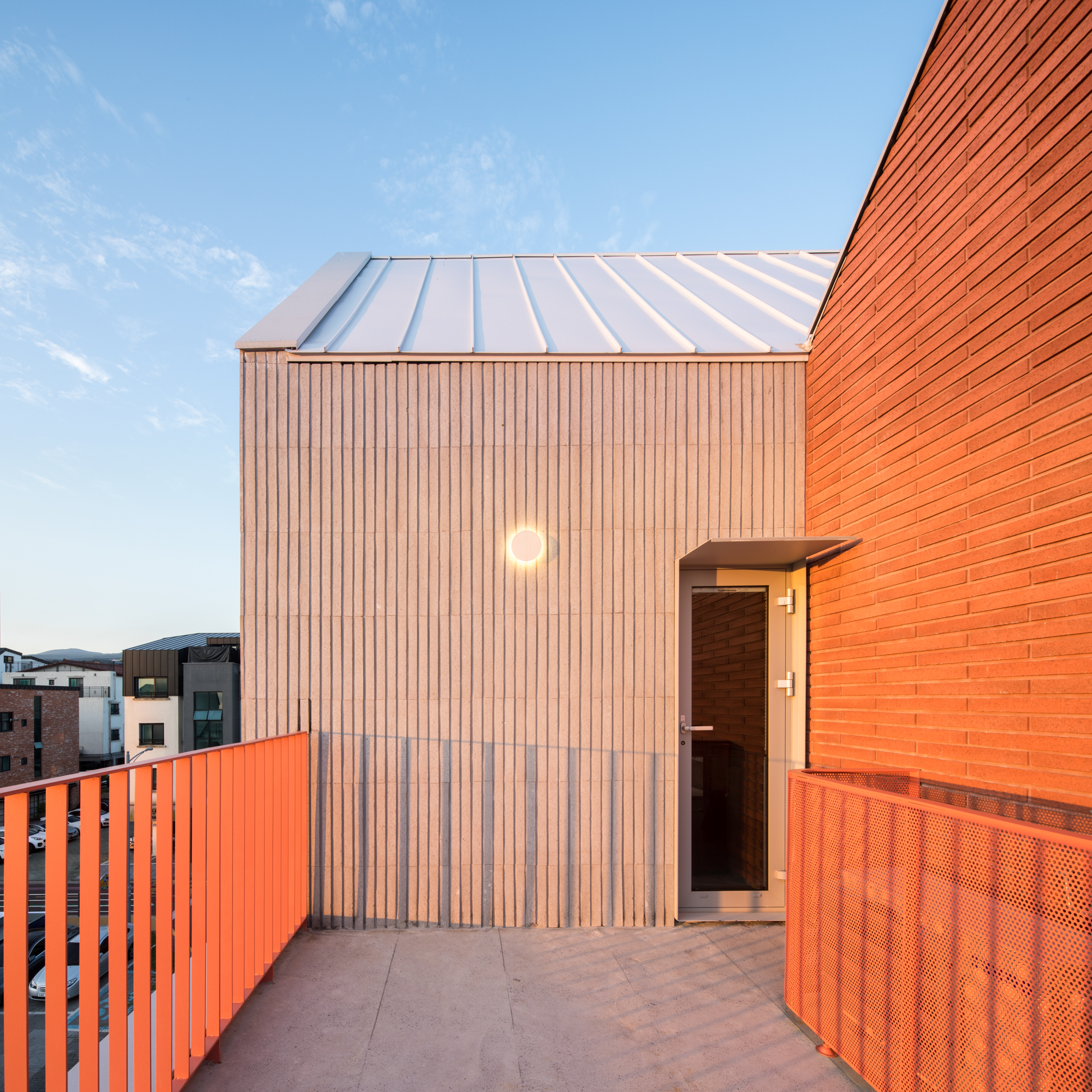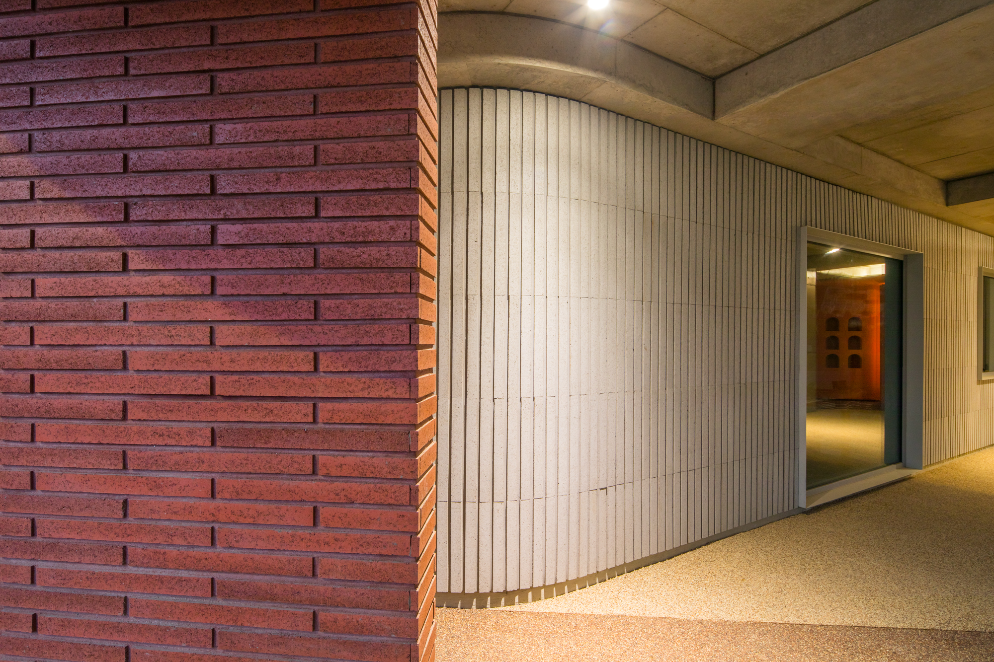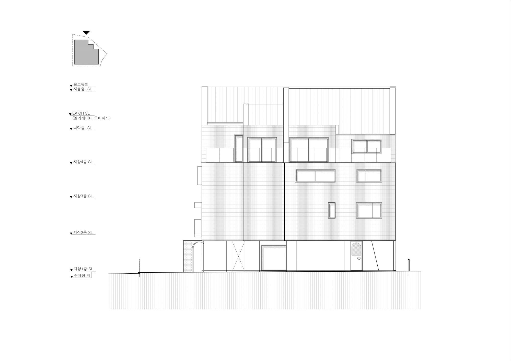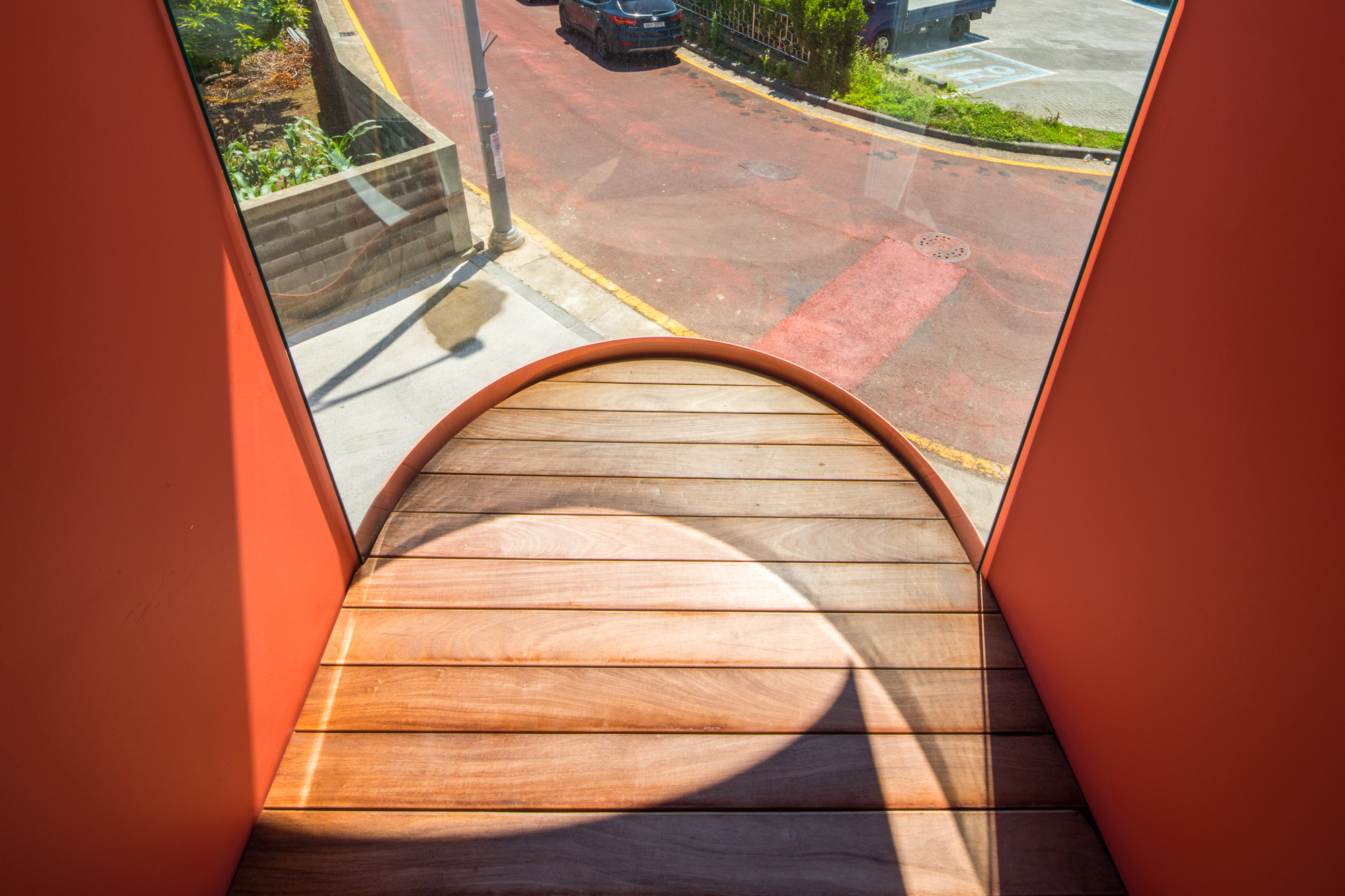 진입 공간의 시작에 건물 밖으로 튀어나온 진입 가벽을 형성하였다. 구조적으로는 기둥의 역할을 하는 이 가벽은 포인트 색상이 되는 붉은색 치장 벽돌을 적용하여 안쪽에 형성된 출입구 대신 입구로서의 상징성을 잡아준다. 가벽에는 아치형의 개구부가 있는데 이는 아치 형태의 근생 출입구와 2층의 돌출 발코니와 더불어 건물과 대비되는 강렬한 색상을 적용했다. 그래서 도로를 지나며 보이는 아이 레벨에서의 건물 정체성을 나타낸다. 동쪽으로만 좁게 열려있고, 남쪽으로 완전히 막혀있는 부지에서 가장 효율적인 채광 면적과 조망을 형성한다.