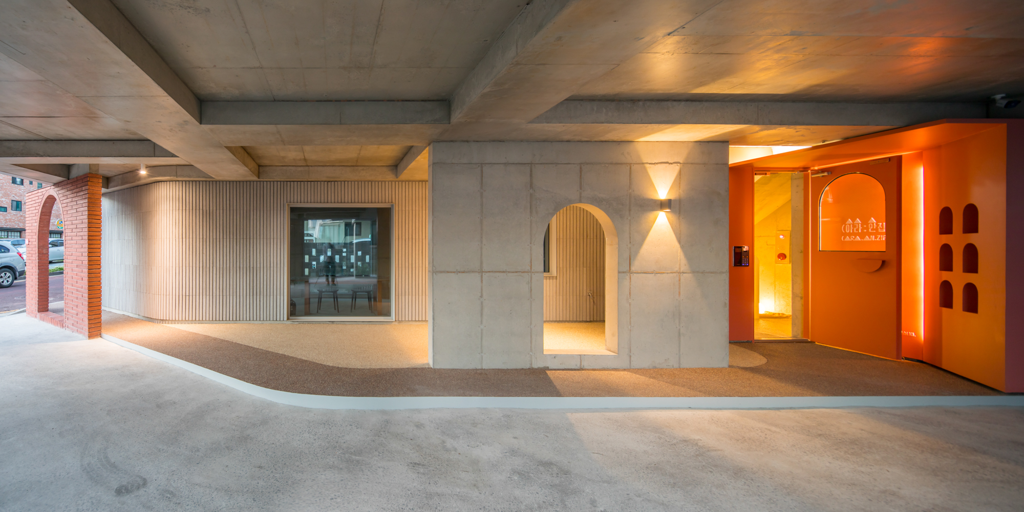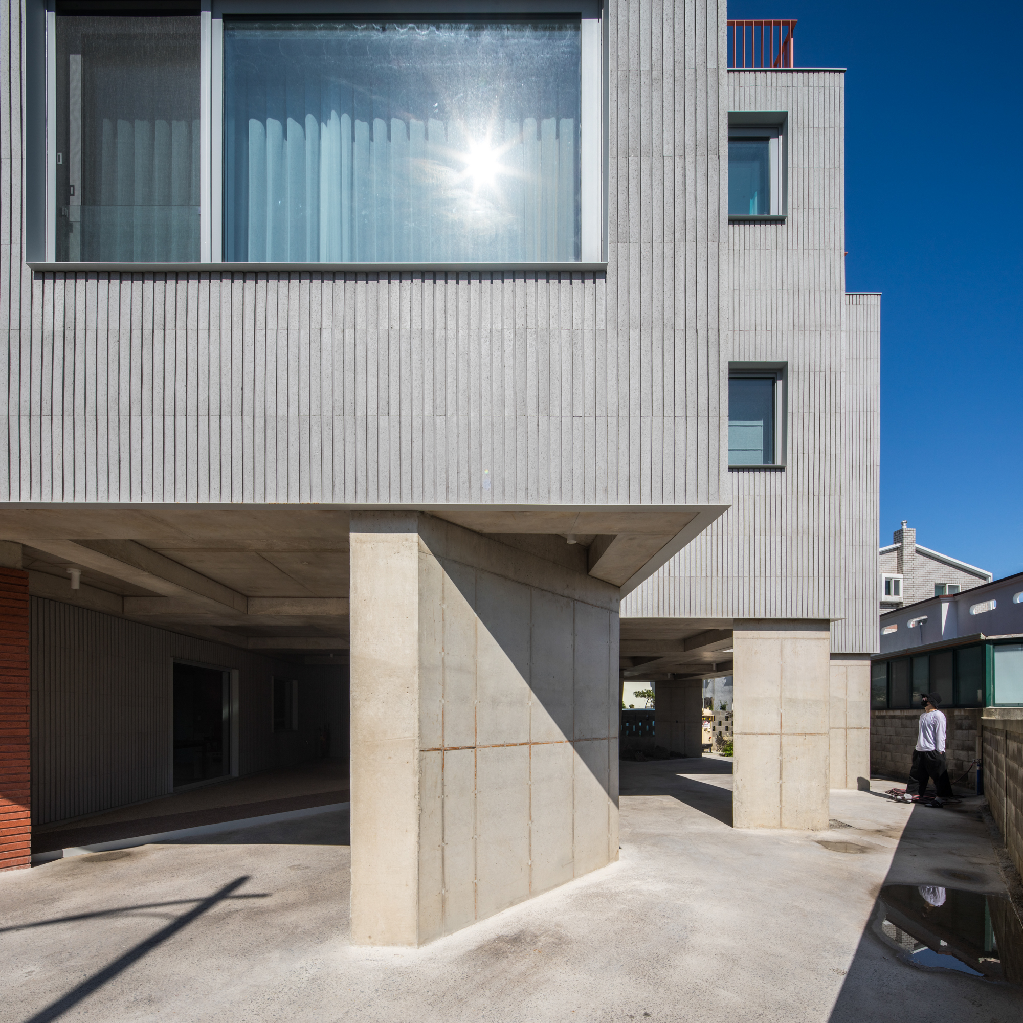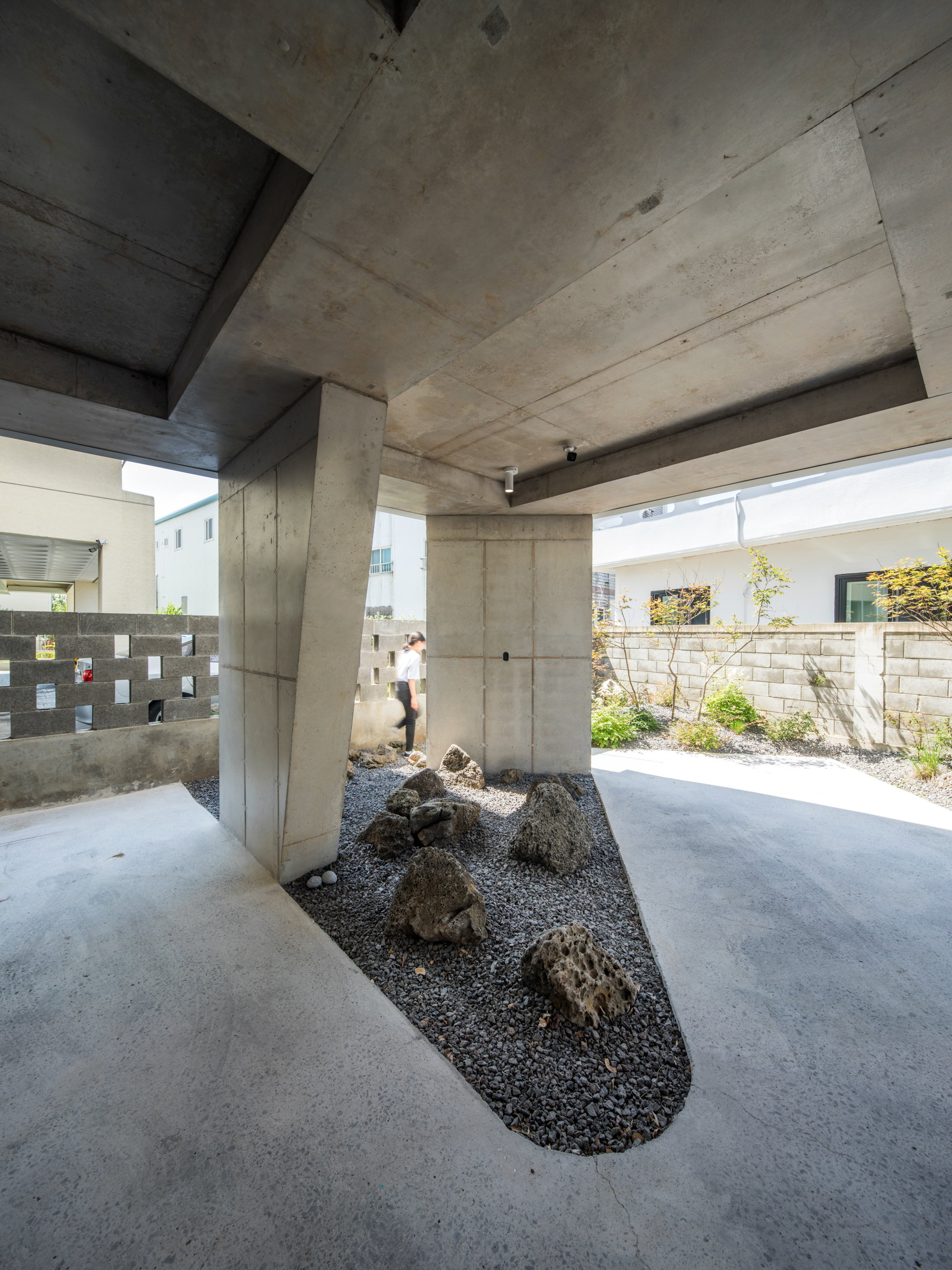 공동 주택의 필로티 공간과 주차장은 서로 같은 이름처럼 사용된다. 필로티 주차장의 전형성을 장식과 회랑의 형태로 탈피했다. 또한, 통행에 가까운 회랑(acade)과 장식적인 공간으로 어둡지 않은 디자인을 만들어낸다.