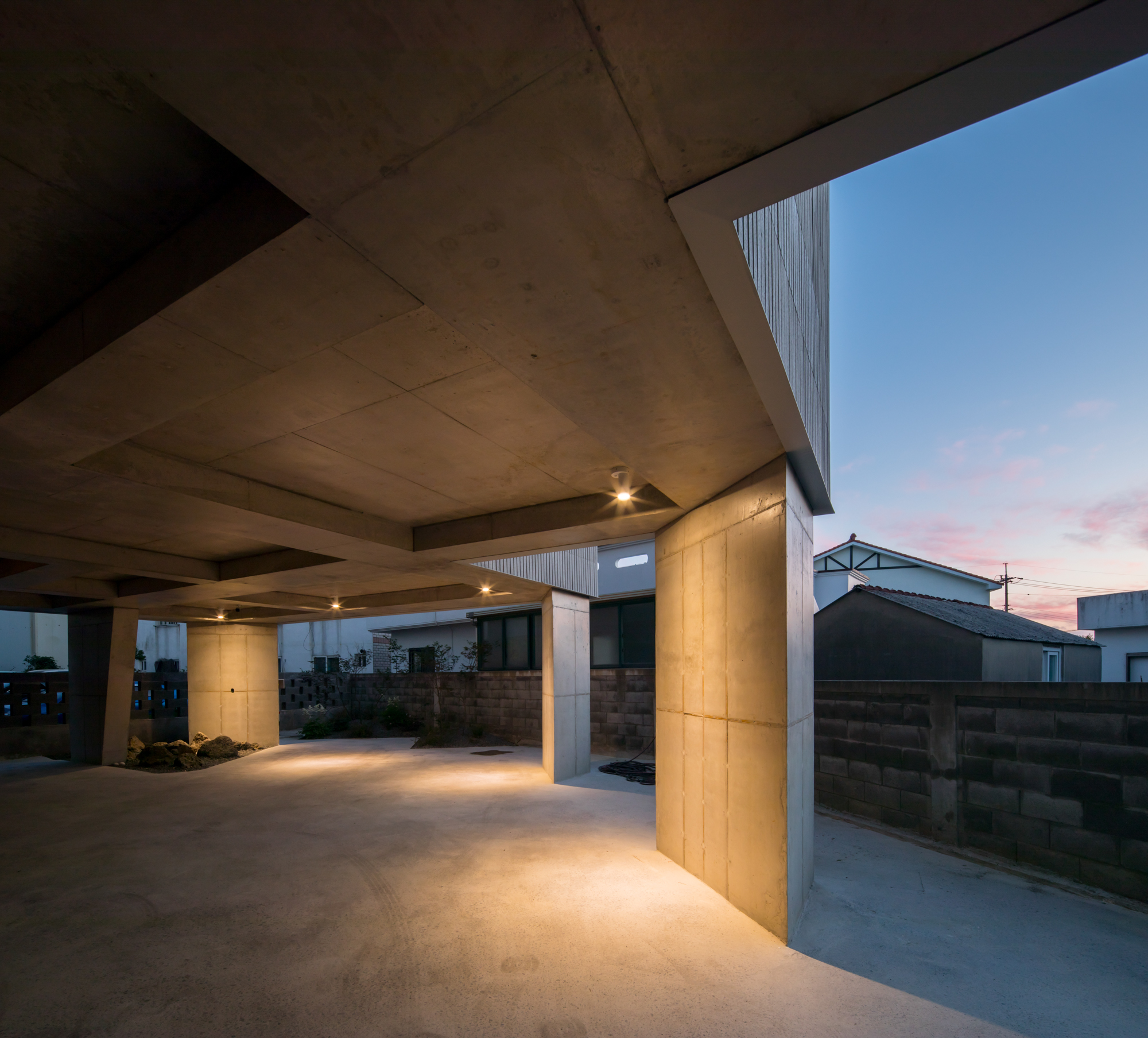 대지는 제주시 아라일동 계획 도시 중심에 위치한다. 10년안에 신축된 이 계획도시는 다가구 원룸에서부터 식당, 편의점, 사무소, 카페 등 평범한 도시의 골목이다. 이 골목 안쪽에 입구가 좁고 동쪽으로만 열려있는 부지는 오랫동안 공지로 남아있었다.부지는 도로를 좁게 면한 부채꼴 형태의 대지로 차량 진입과 보행 진입로를 계획하면 남는 폭이 거의 없을 정도로 입구가 좁은 형태였다. 불가피하게 주택의 진입이 필로티 안쪽으로 형성될 수밖에 없었다. 필로티 안쪽에 있는 주택 주 출입구까지 닿는 진입 동선을 어떻게 하면 어둡지 않고 기분 좋은 진입 공간이 될 수 있을지에 대한 고민이 시작되었다.