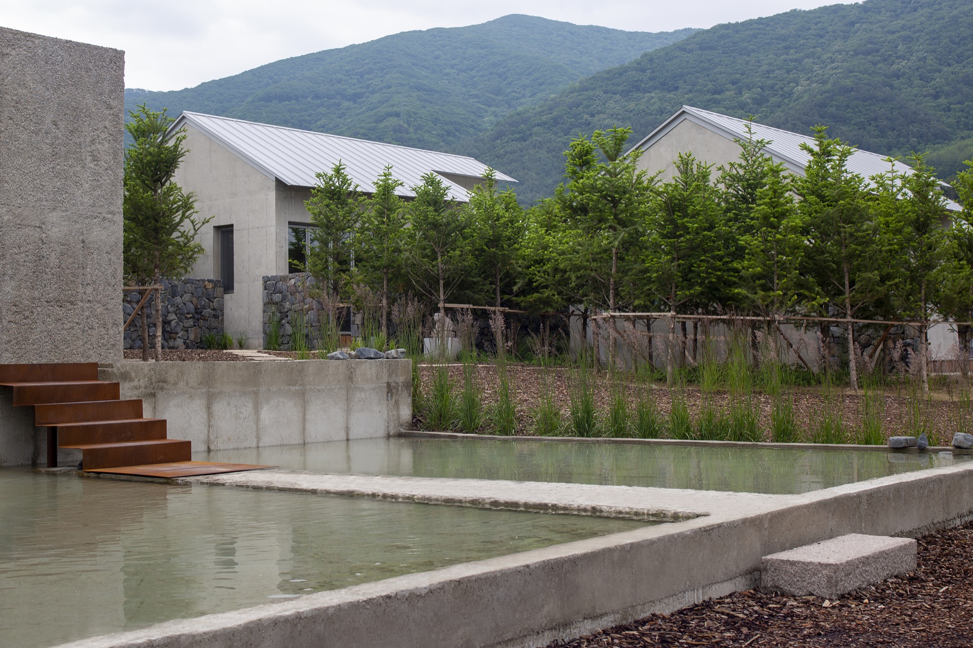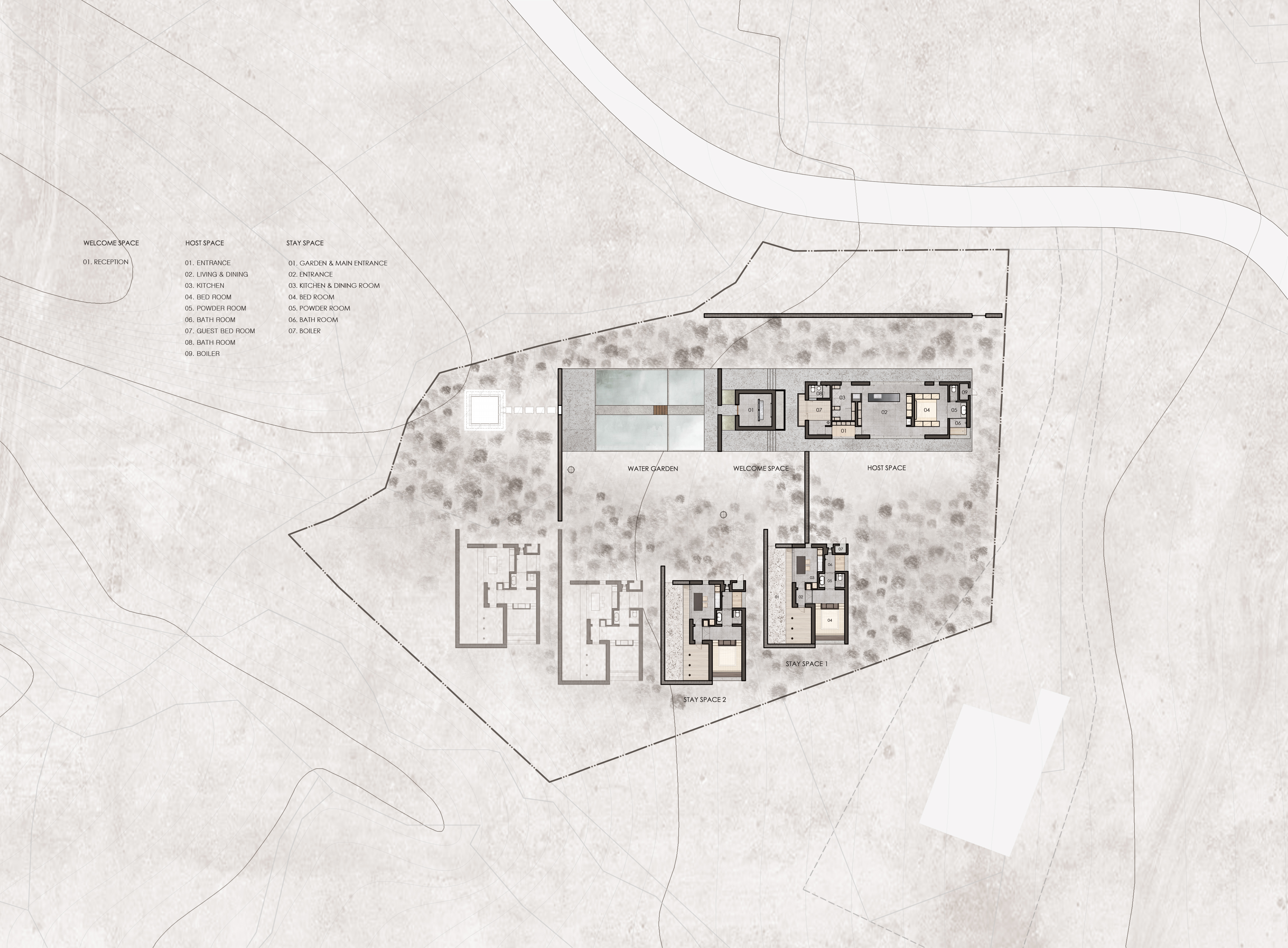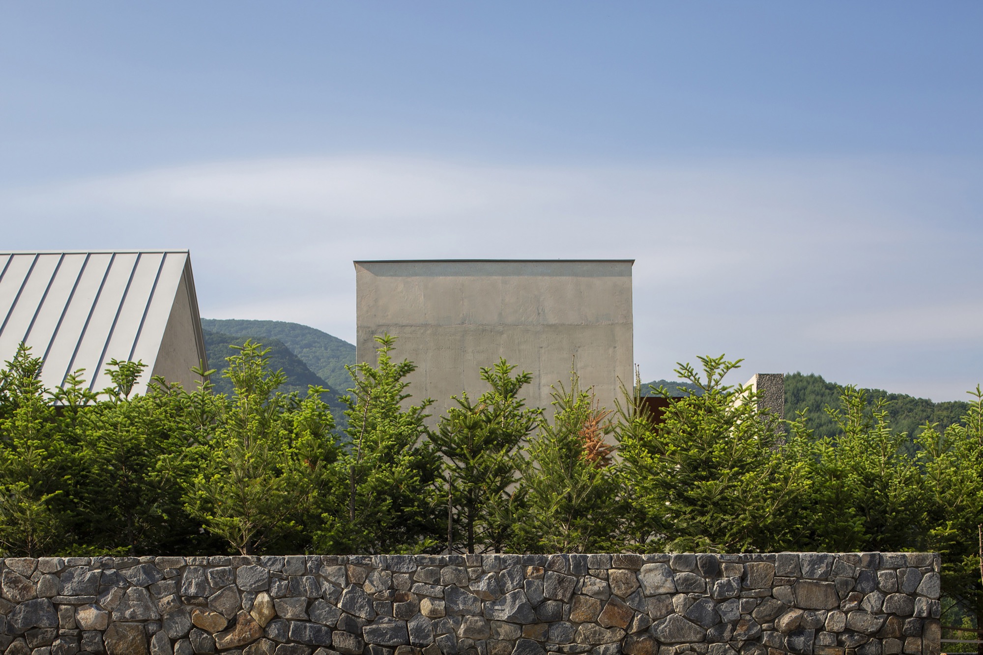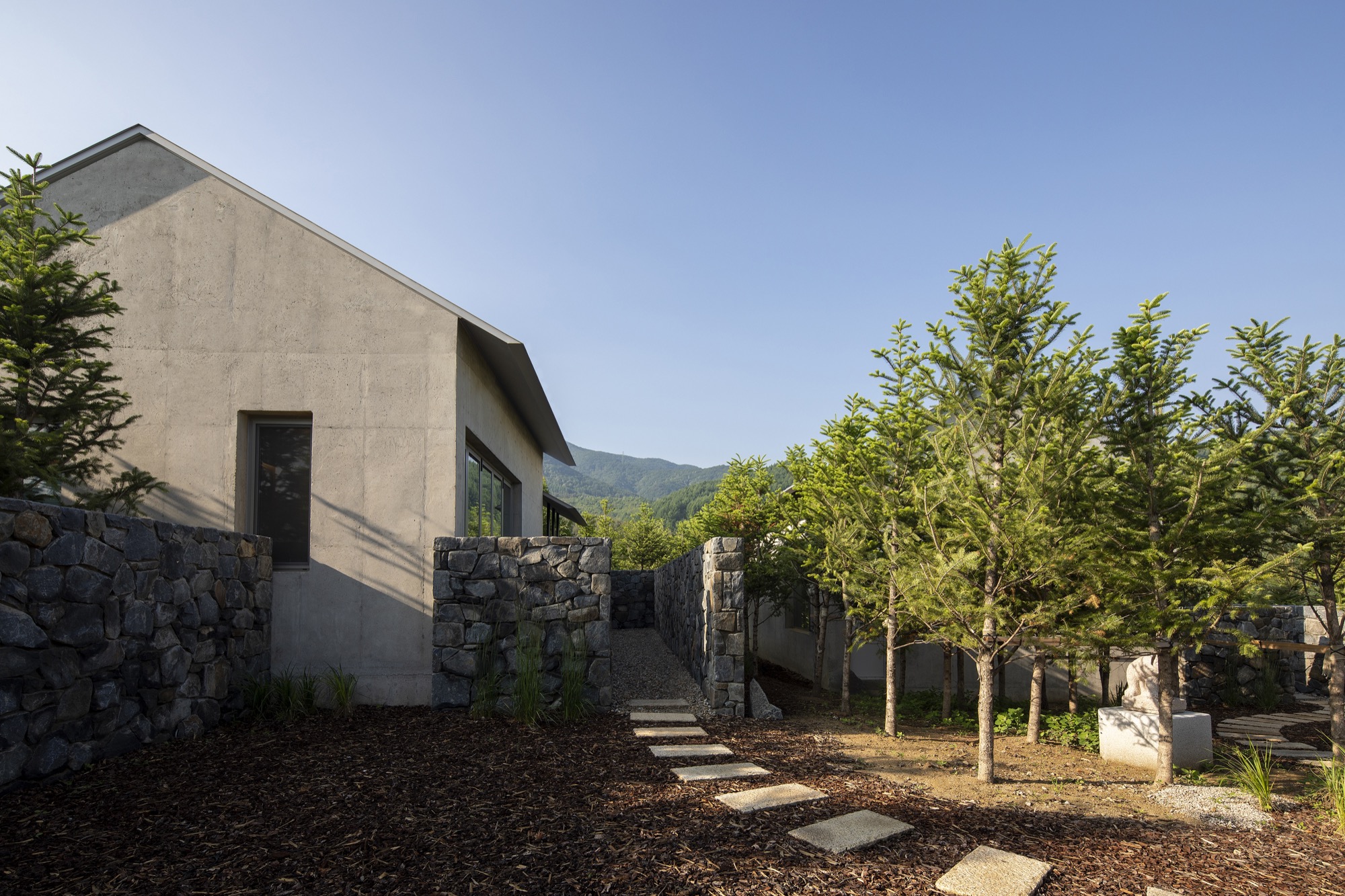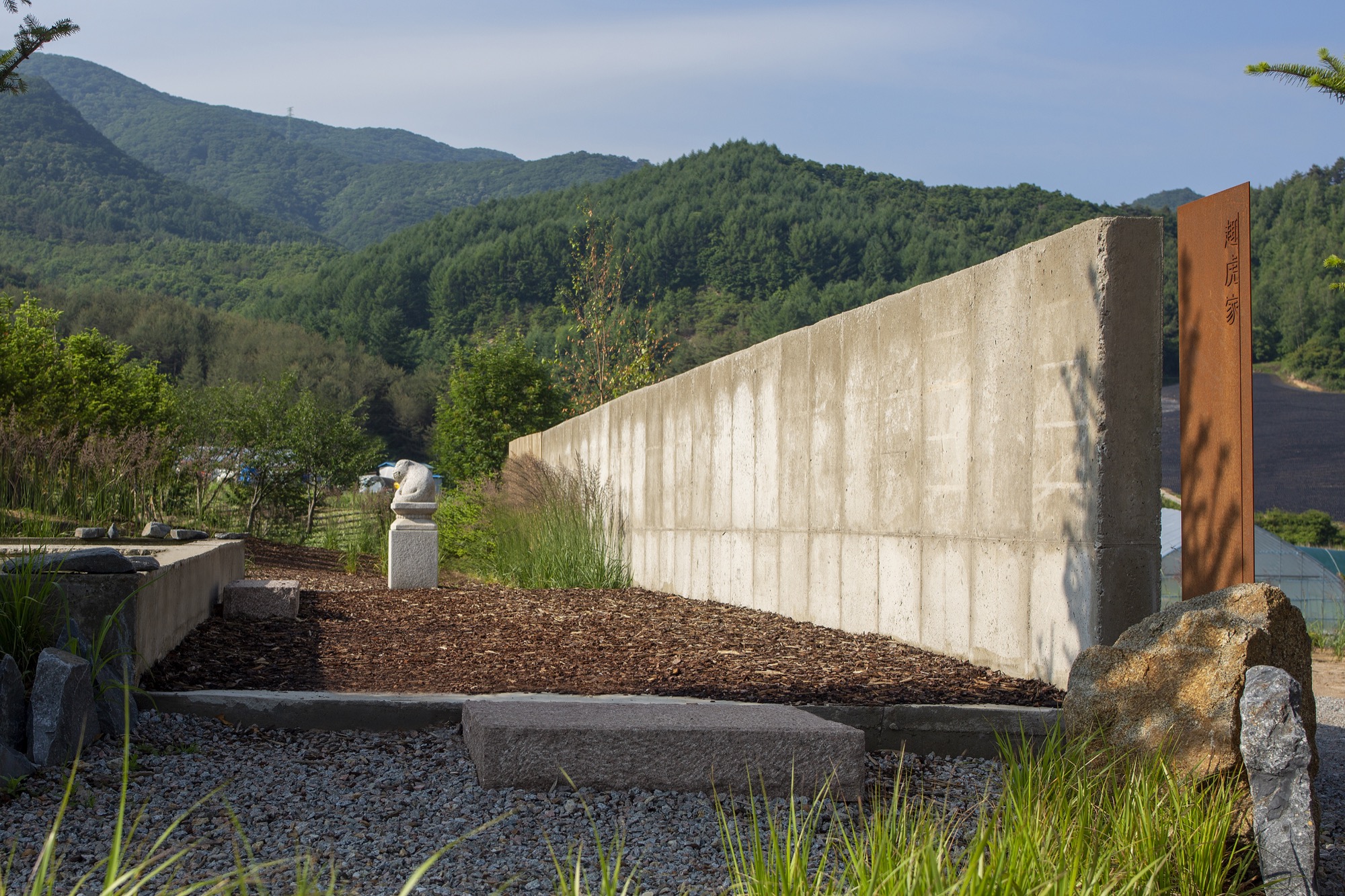 이러한 개념으로 존재하는 공간은 자연 생기生氣의 순환을 통한 심상의 순환을 이루기 위해 여백과 졸박미를 추구했다. 경사진 땅은 수평의 축을 만들어 장소 너머 산들의 주름과 공간의 경계가 교차하며 장면을 만들고, 경계를 부정하며 자연과 상호작용하는 투영의 못을 건너는 긴 축은 커다란 바위틈으로 동선을 이끈다. 커다란 바위틈 무위의 존재가 나무숲 사이, 바위에 올라있는 장면을 만든 것은 정제된 소재(죽은 나무와 바위) 위에 시간의 범위를 밤의 밖으로, 그리고 낮의 밖으로, 시간에서 솟아올라 무연(憮然)한 합작을 구현하고자 함이었다. 이 대지 위에 건축된 모든 공간은 이 장면들의 반복과 교차를 통해 시작하고 끝맺는다.