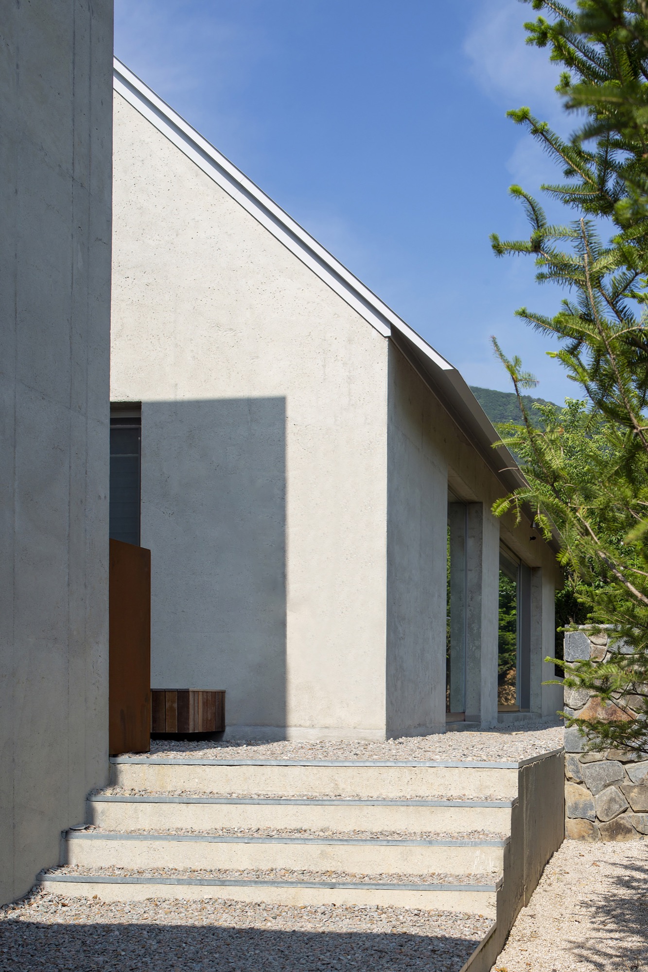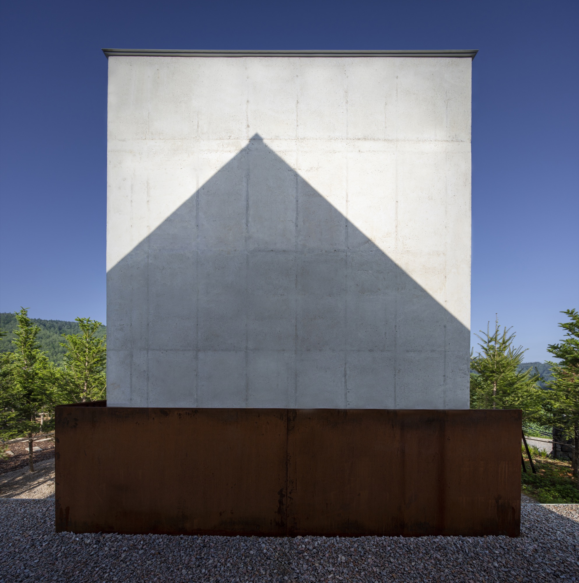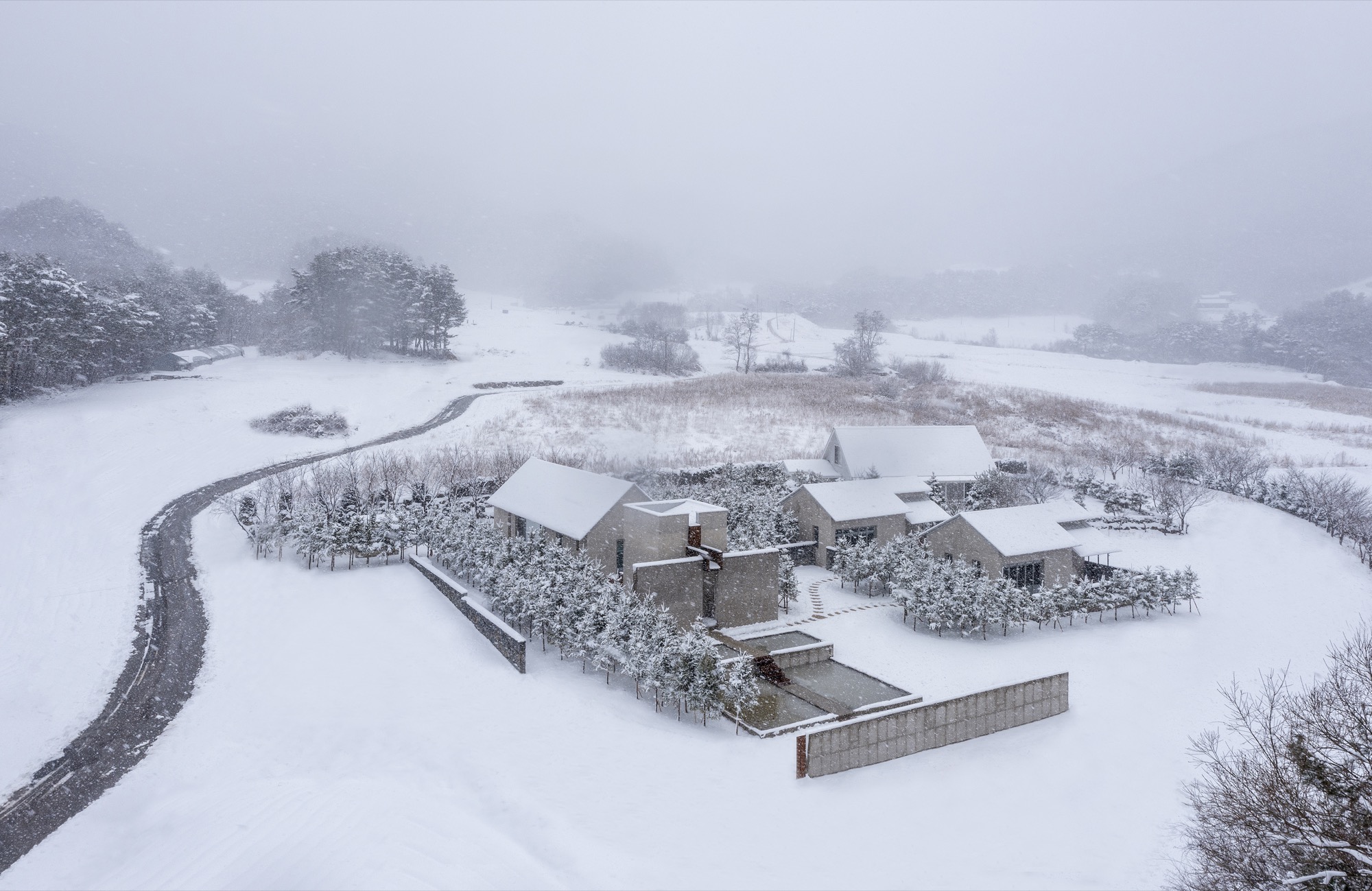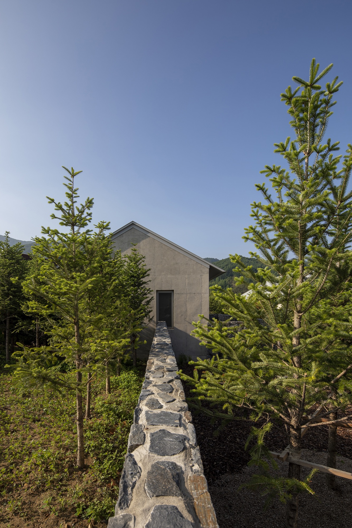 이러한 개념으로 존재하는 공간은 자연 생기生氣의 순환을 통한 심상의 순환을 이루기 위해 여백과 졸박미를 추구했다. 경사진 땅은 수평의 축을 만들어 장소 너머 산들의 주름과 공간의 경계가 교차하며 장면을 만들고, 경계를 부정하며 자연과 상호작용하는 투영의 못을 건너는 긴 축은 커다란 바위틈으로 동선을 이끈다. 커다란 바위틈 무위의 존재가 나무숲 사이, 바위에 올라있는 장면을 만든 것은 정제된 소재(죽은 나무와 바위) 위에 시간의 범위를 밤의 밖으로, 그리고 낮의 밖으로, 시간에서 솟아올라 무연(憮然)한 합작을 구현하고자 함이었다. 이 대지 위에 건축된 모든 공간은 이 장면들의 반복과 교차를 통해 시작하고 끝맺는다.