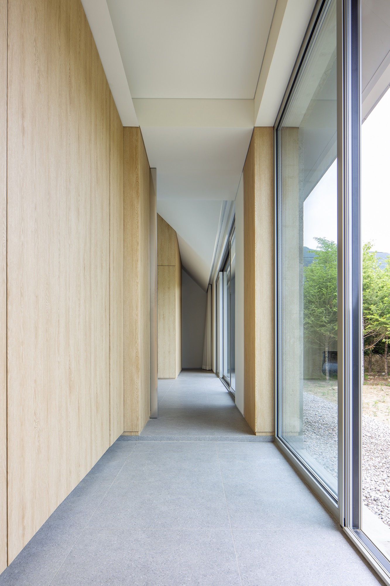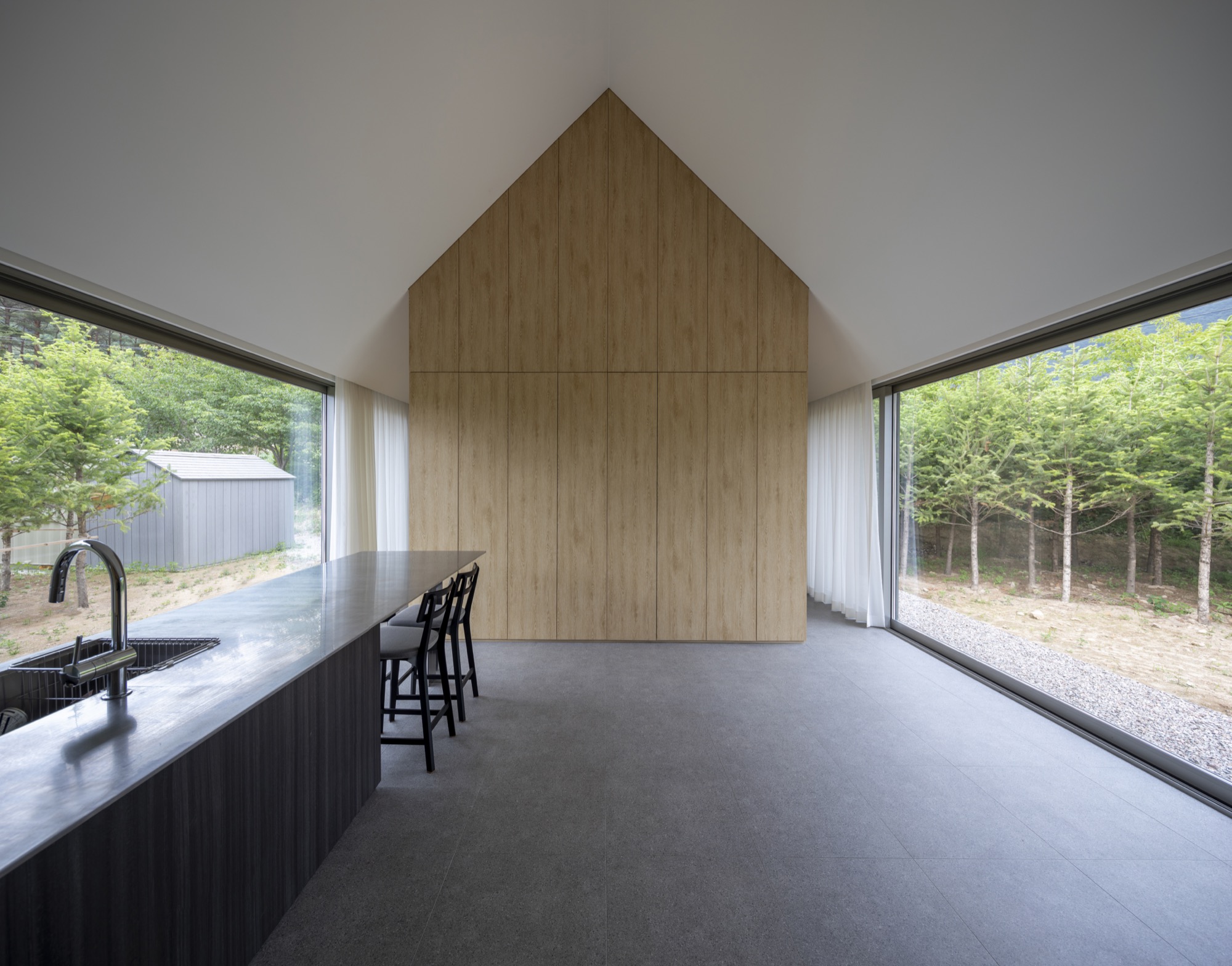 이 대지는 '먼 옛날 마을 앞 큰 바위 위에 호랑이가 자주 올라 울었다.'하여 ‘범우리’라 이름 지어진 마을로, 현재는 ‘호명리’라 불리는 병두산과 두타산 그리고 오대산으로 둘러싸인 곳에 있다. 산들의 주름 사이를 넘나들던 호랑이의 흔적이 시간의 범위를 아스라이 흩트린 터에 ‘머무름을 통해 복원의 에너지를 얻는 호랑이 사원’ 이야기를 기록했다. 공간을 설계할 때 가장 먼저 떠오른 것은 단원 김홍도의 송하맹호도(松下猛虎圖)와 죽하맹호도(竹下猛虎圖)였다. 두 그림에서 각각 나오는 송림(松林)과 죽림(竹林)은 명상의 장소이자 깨달음을 얻는 장소로서 의미가 있다. 건축주와 나 사이에 이 공간을 구축하는 암묵적인 의미가 있었다면 그것은 아마 ‘명상의 장소이자 깨달음을 얻는 장소’가 아니었을까 생각한다. 여기에서 호랑이는 자아 속으로 성찰에 나서는 존재, 근원의 실체가 된다. 단원 김홍도의 송하맹호도와 죽하맹호도에서 이러한 개념이 모든 인위적인 방해물을 지워내고, 몰입하는 행위인 무위(無爲), 화면의 경계를 초월하여 영원한 명상의 세계로 이끄는 무한 공간의 의미를 내포하고 있다. 이렇듯 이 대지의 건축은 머무는 자에게 혼란해진 자기 자신을 스스로 정화하고 본래의 자연스러움을 회복하는 복원의 에너지를 얻는 무위의 장소가 되길 바랐다.