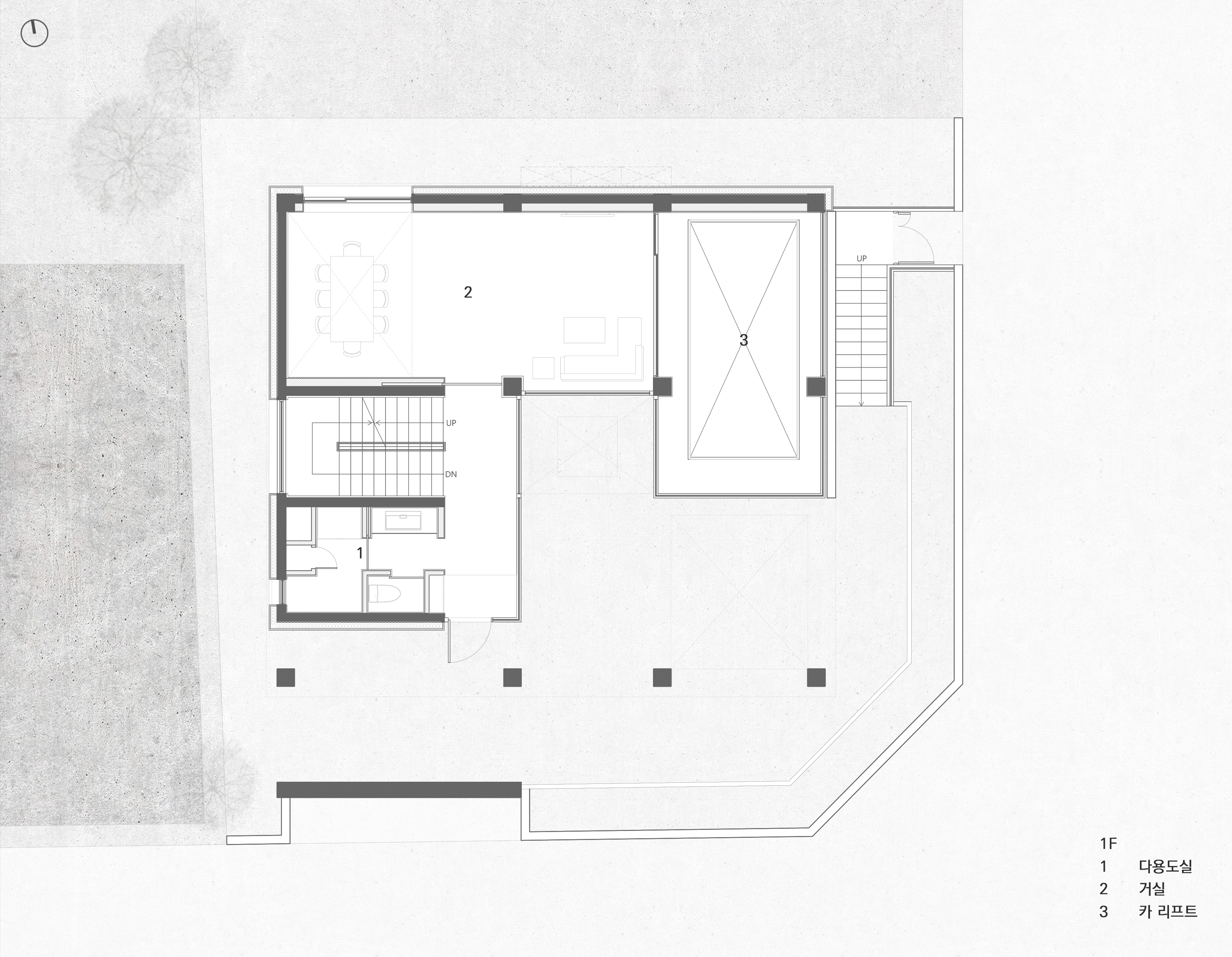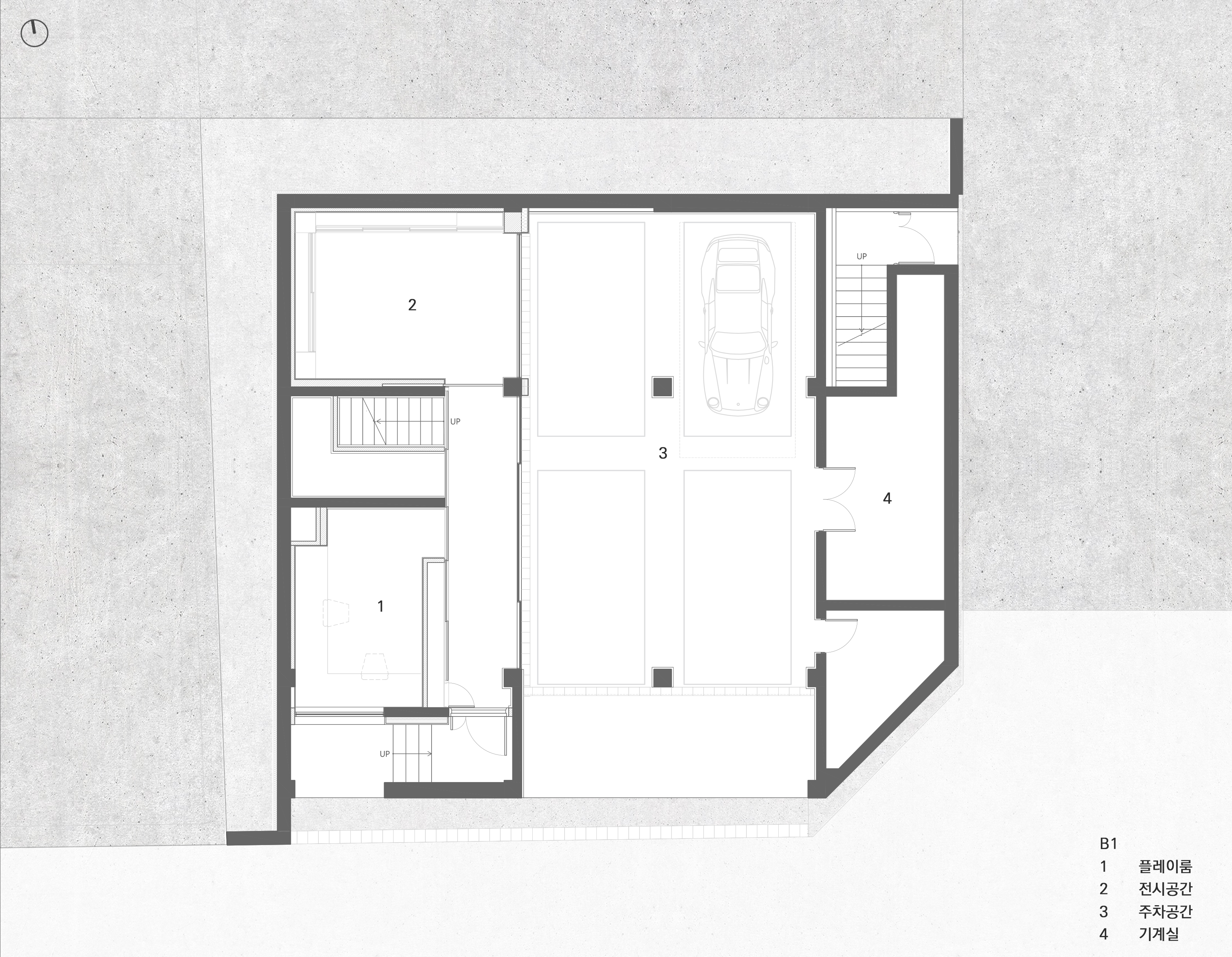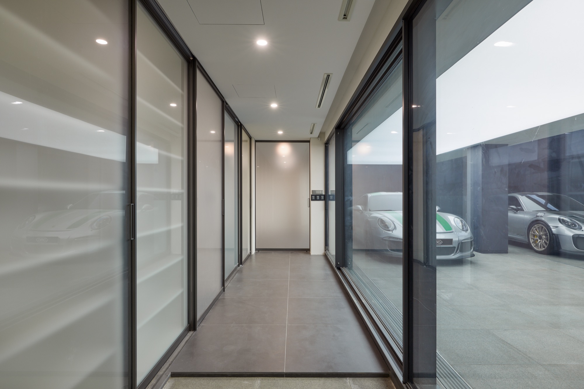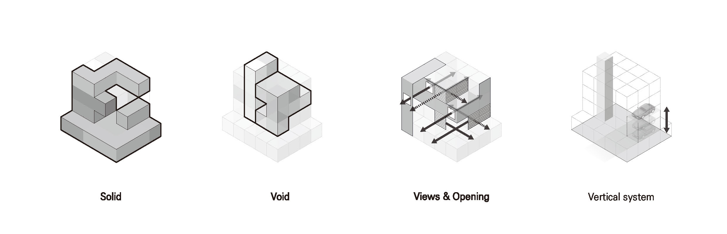 스페이스 프로그램의 필요조건들을 각각의 CUBE로 구획하고 전체 공간을 조성해가며 형태를 완성해 나가아가는 방식으로, 하나의 CELL이 채워지면 다른 CELL은 비우는 과정을 반복했다. 중정이 수직과 수평으로 건물을 관통하고 그 주변에 각각의 성격과 기능을 담은 CUBE들이 어우러지고 치환되어 내외부와의 관계를 맺게 된다. 어느 CUBE에서는 자동차가 카리프트를 타고 거실 앞으로 올라가 자동차 전시관이 되기도 하고, 또 다른 CUBE에서는 외부 중정을 반사 시킨듯한 모습으로 내부 전체를 관통하는 VOID가 형성된다. 각각 프로그램들의 성격이 강한 만큼 공간이 치환될 때마다 극적인 긴장감과 장면의 풍경이 전개된다.
