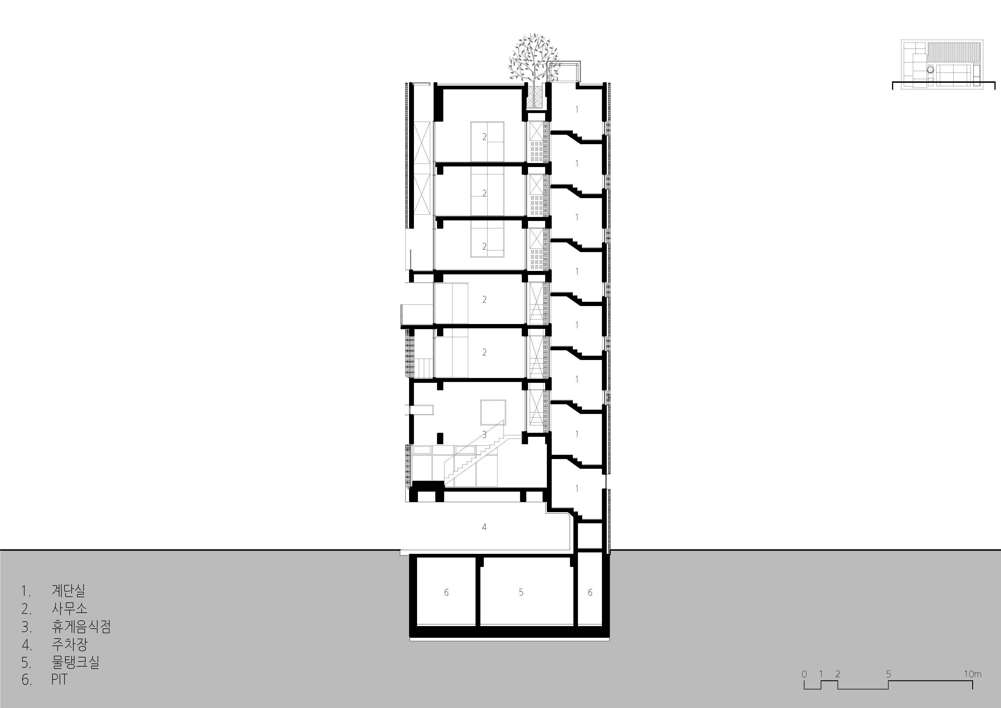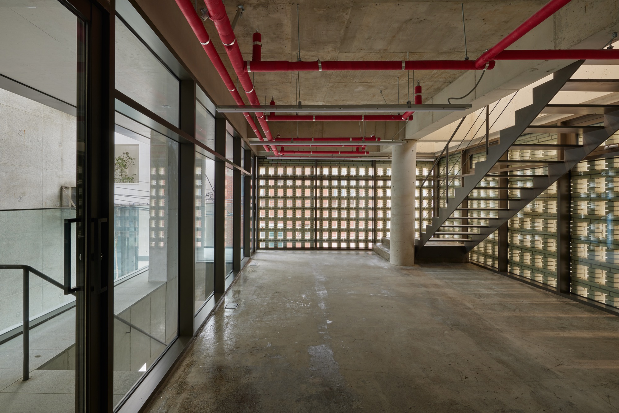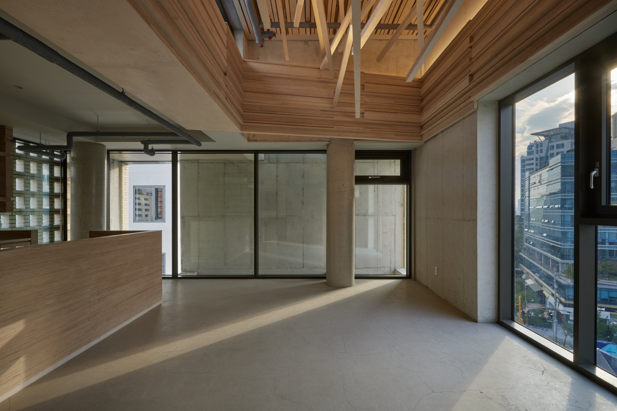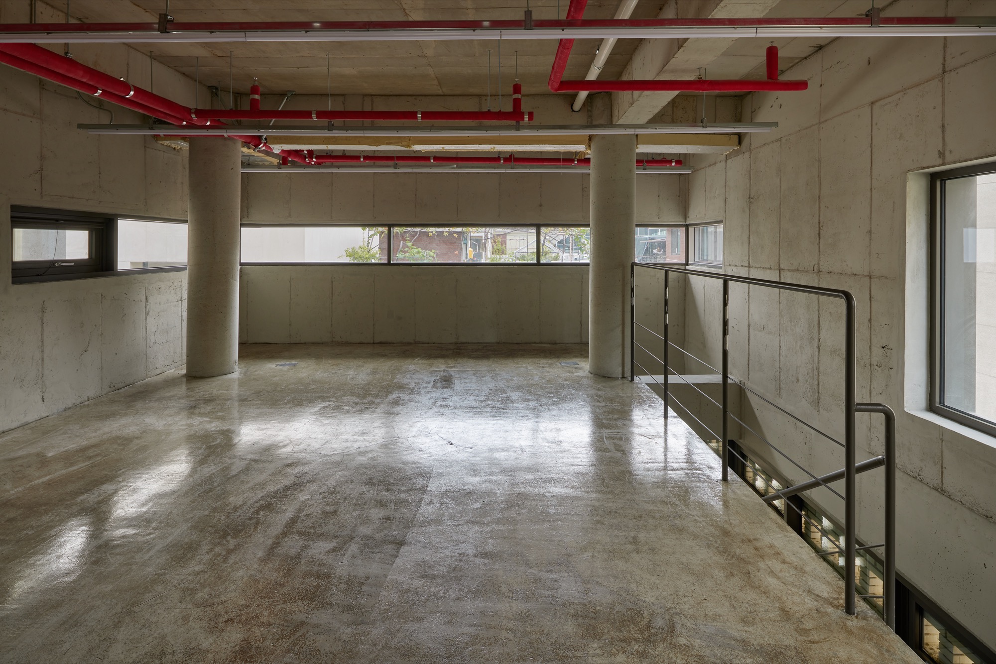 8층 규모의 용적은 주차대수 설계의 한계로 잉여 용적이 생겨났다. 우리는 남은 용적에 도시환경에 대응하는 INTERWALL(사이 벽)을 계획했다. 이 벽은 8층 높이의 벽으로 층마다 비움과 채움, 수직과 수평, 열림과 닫힘, 가림과 채광, 봄과 보임의 방식으로 도시환경과 관계를 맺고 조직을 만드는 표층이 된다. 수직 표층은 건물의 파사드가 되면서 낮과 밤, 시간에 따라 변화하는 빛으로 다양한 내부 공간 경험을 만들고, 도시의 외부 입면이 된다. 이러한 전략은 도시 경계에서 사성(私性)의 격리적 표피에서 공성(共性)의 관계적 표층으로 바뀌게 할 것이다.