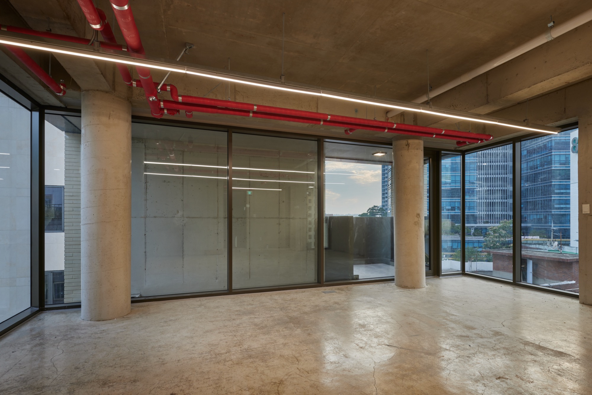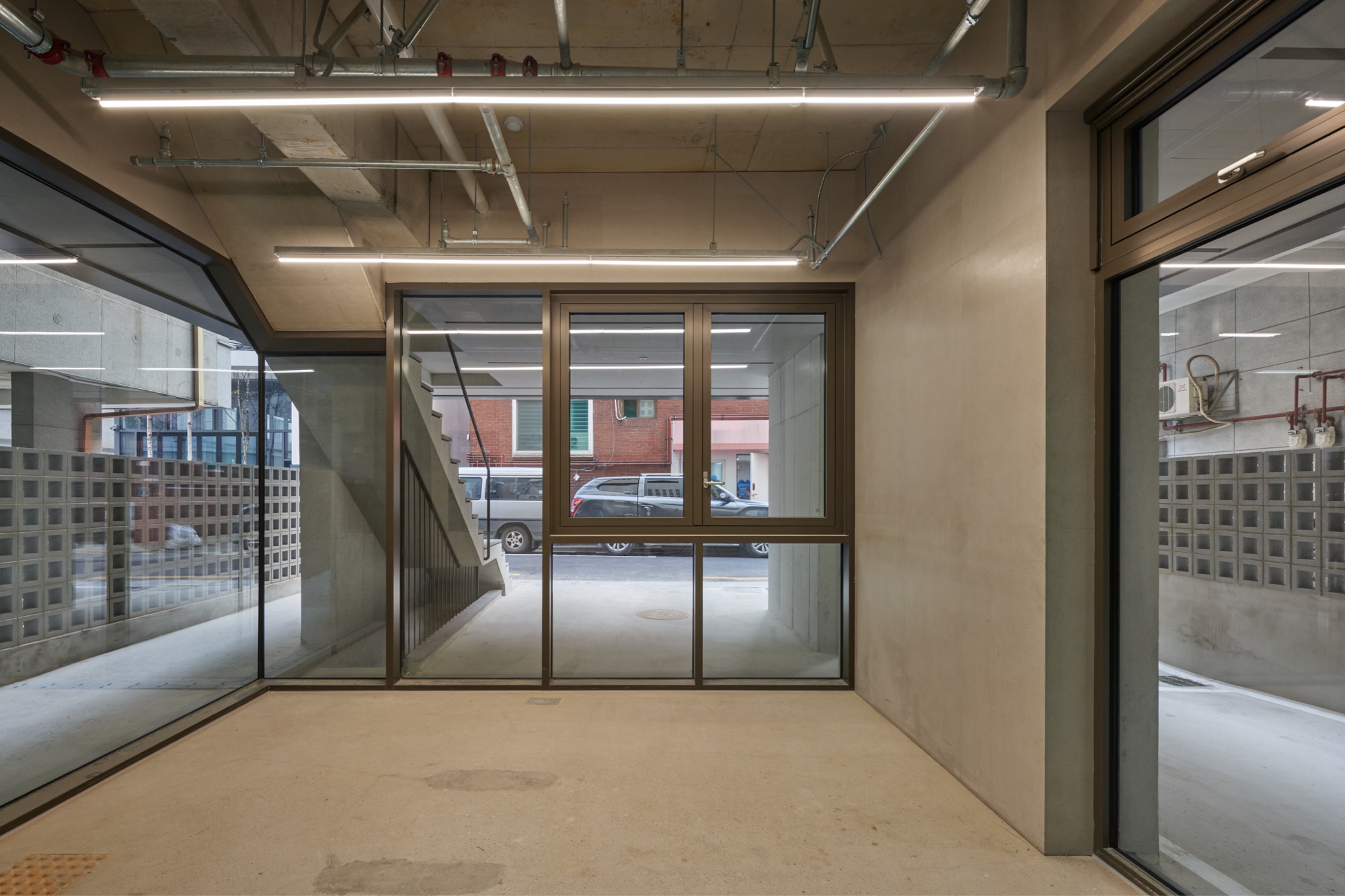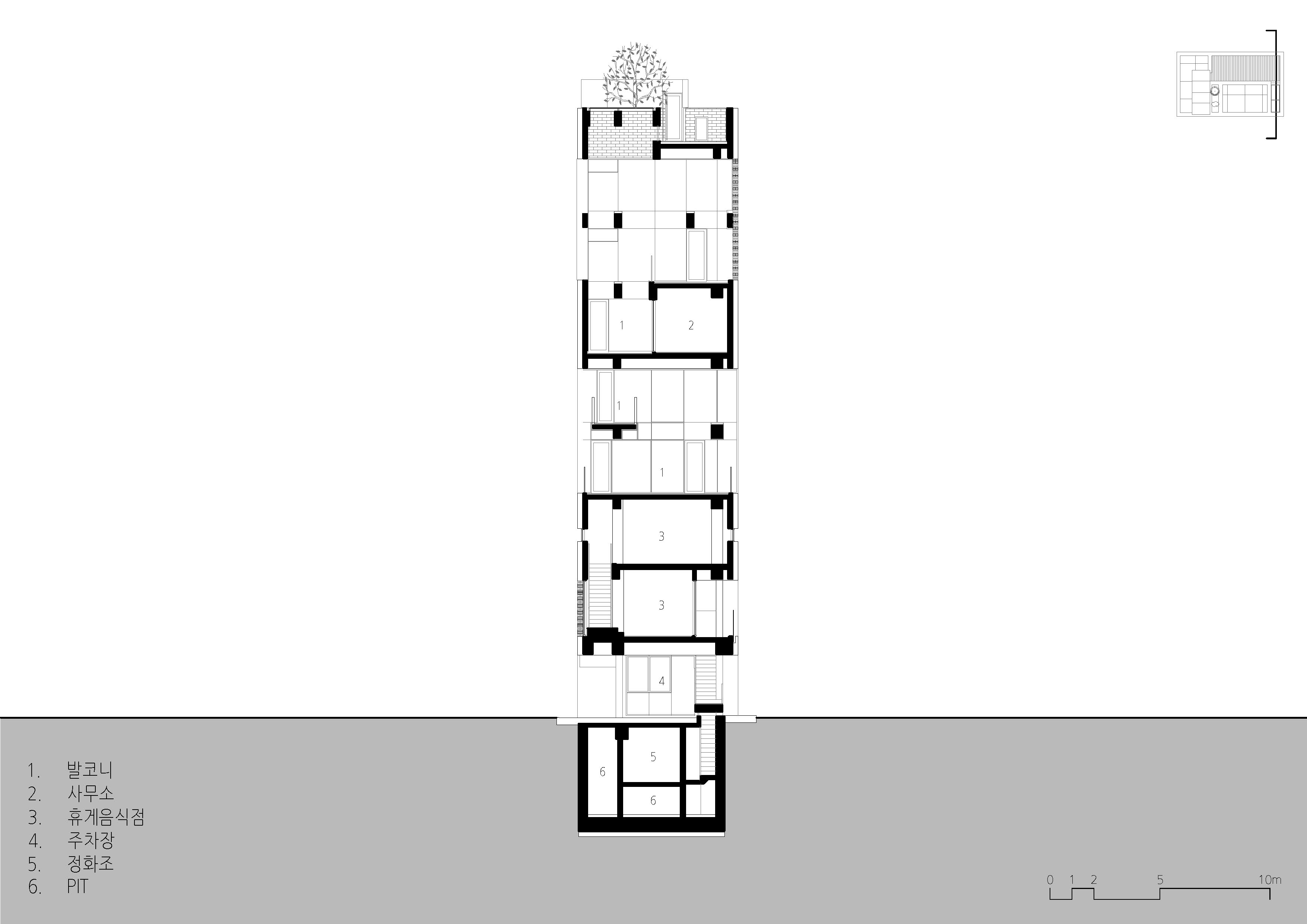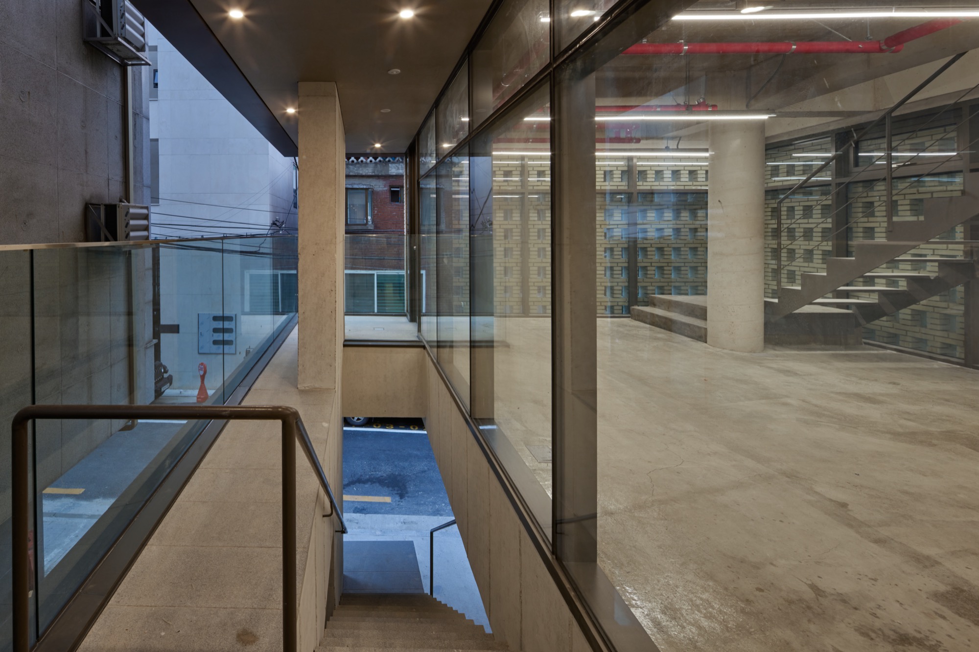 8층 규모의 용적은 주차대수 설계의 한계로 잉여 용적이 생겨났다. 우리는 남은 용적에 도시환경에 대응하는 INTERWALL(사이 벽)을 계획했다. 이 벽은 8층 높이의 벽으로 층마다 비움과 채움, 수직과 수평, 열림과 닫힘, 가림과 채광, 봄과 보임의 방식으로 도시환경과 관계를 맺고 조직을 만드는 표층이 된다. 수직 표층은 건물의 파사드가 되면서 낮과 밤, 시간에 따라 변화하는 빛으로 다양한 내부 공간 경험을 만들고, 도시의 외부 입면이 된다. 이러한 전략은 도시 경계에서 사성(私性)의 격리적 표피에서 공성(共性)의 관계적 표층으로 바뀌게 할 것이다.