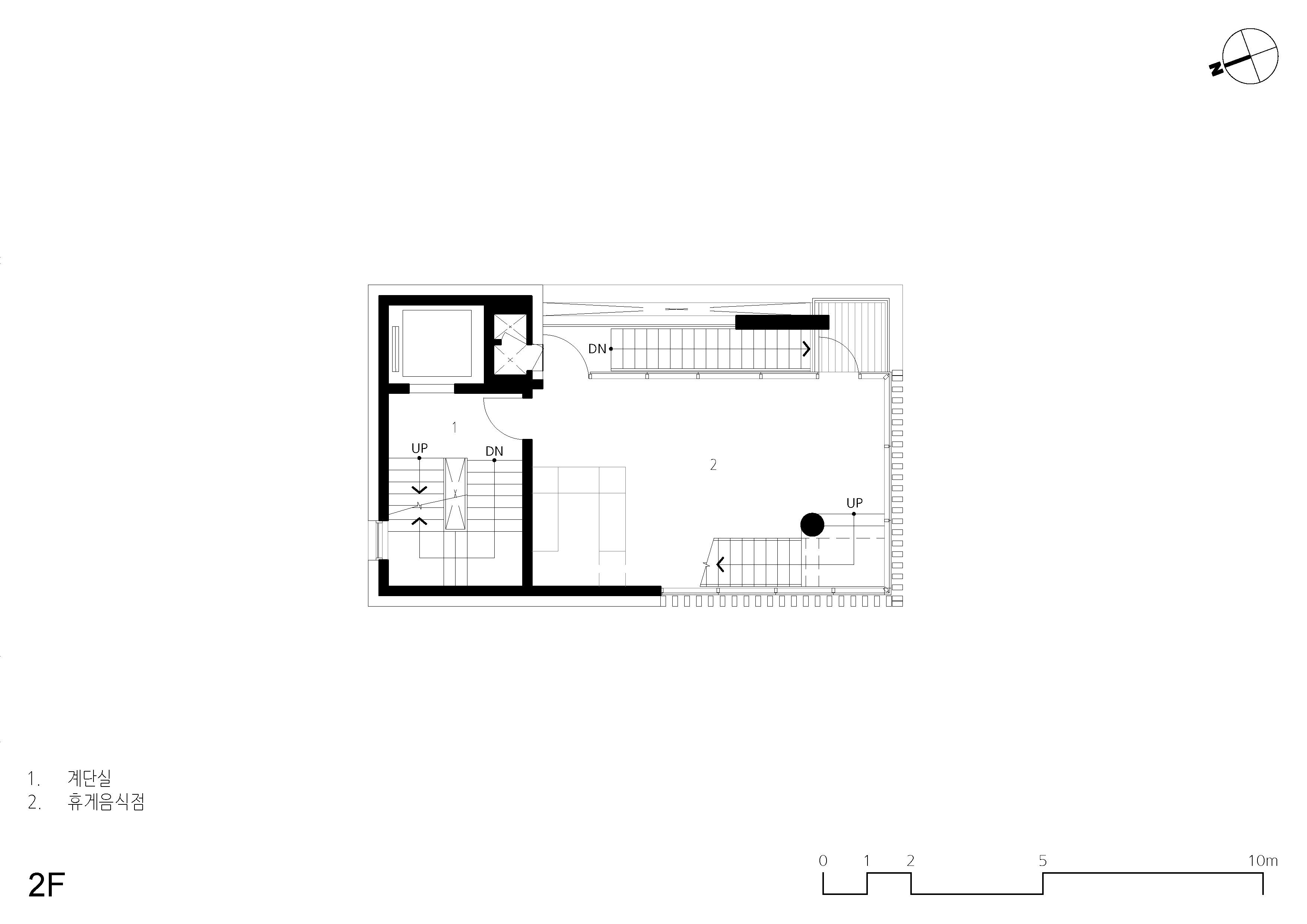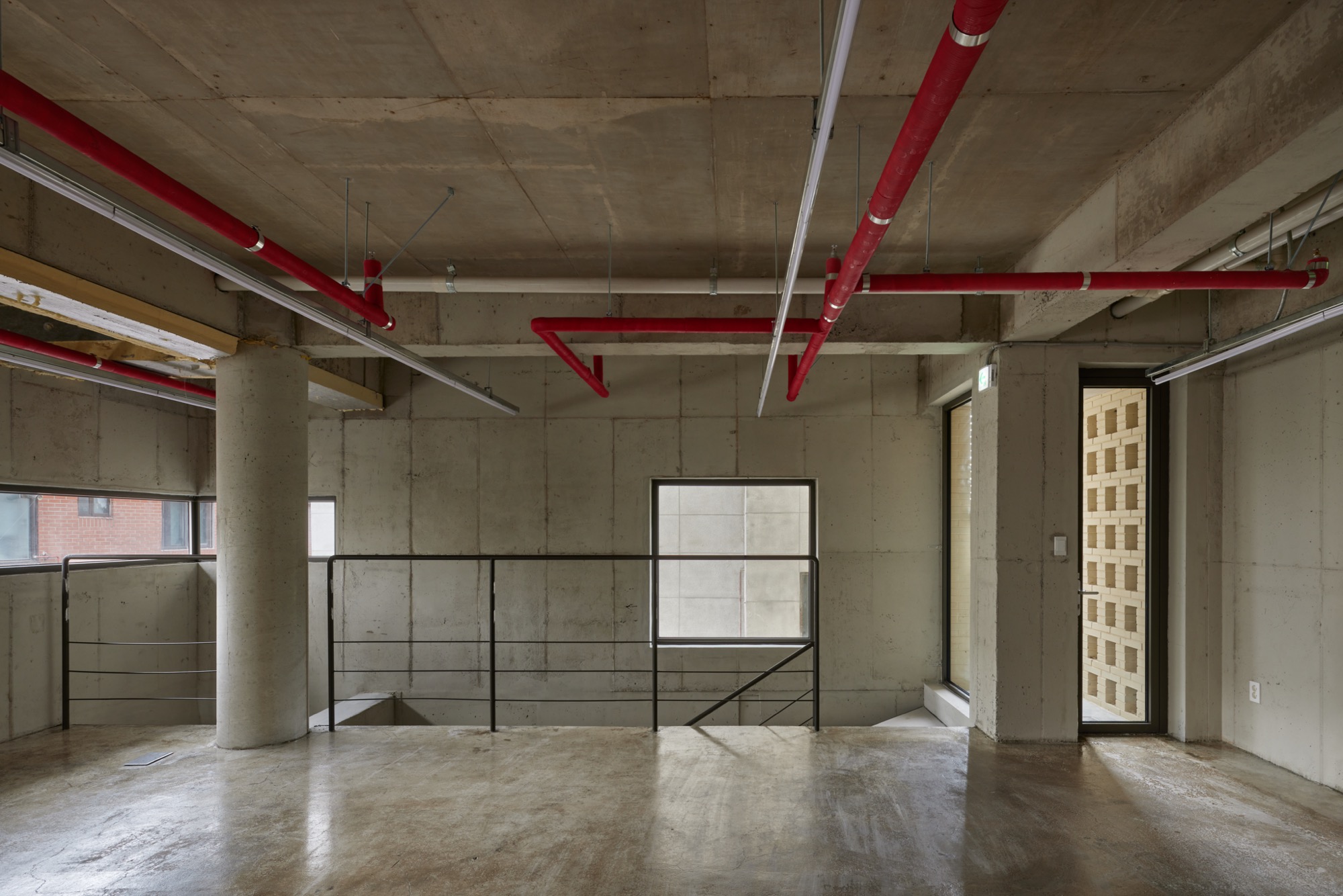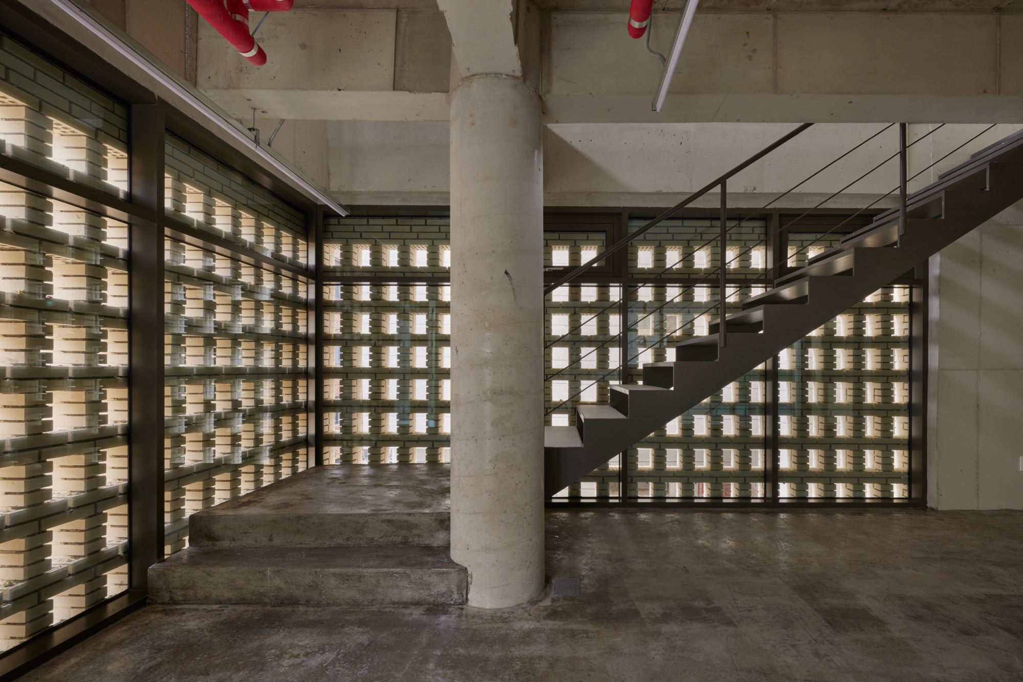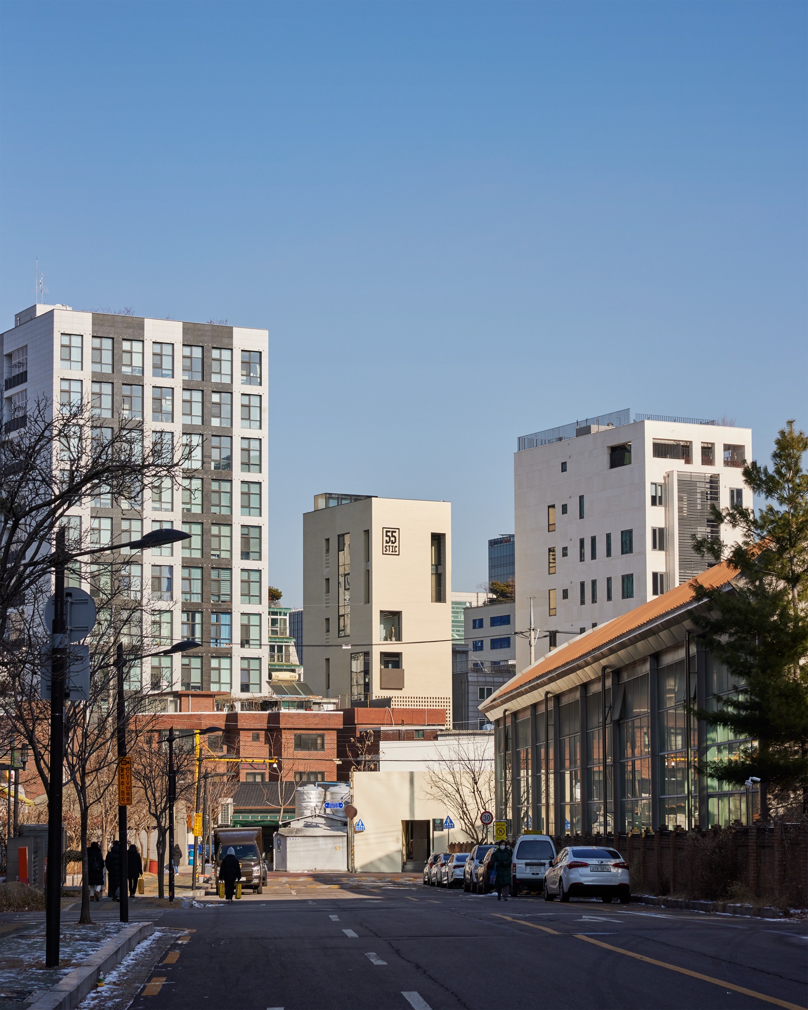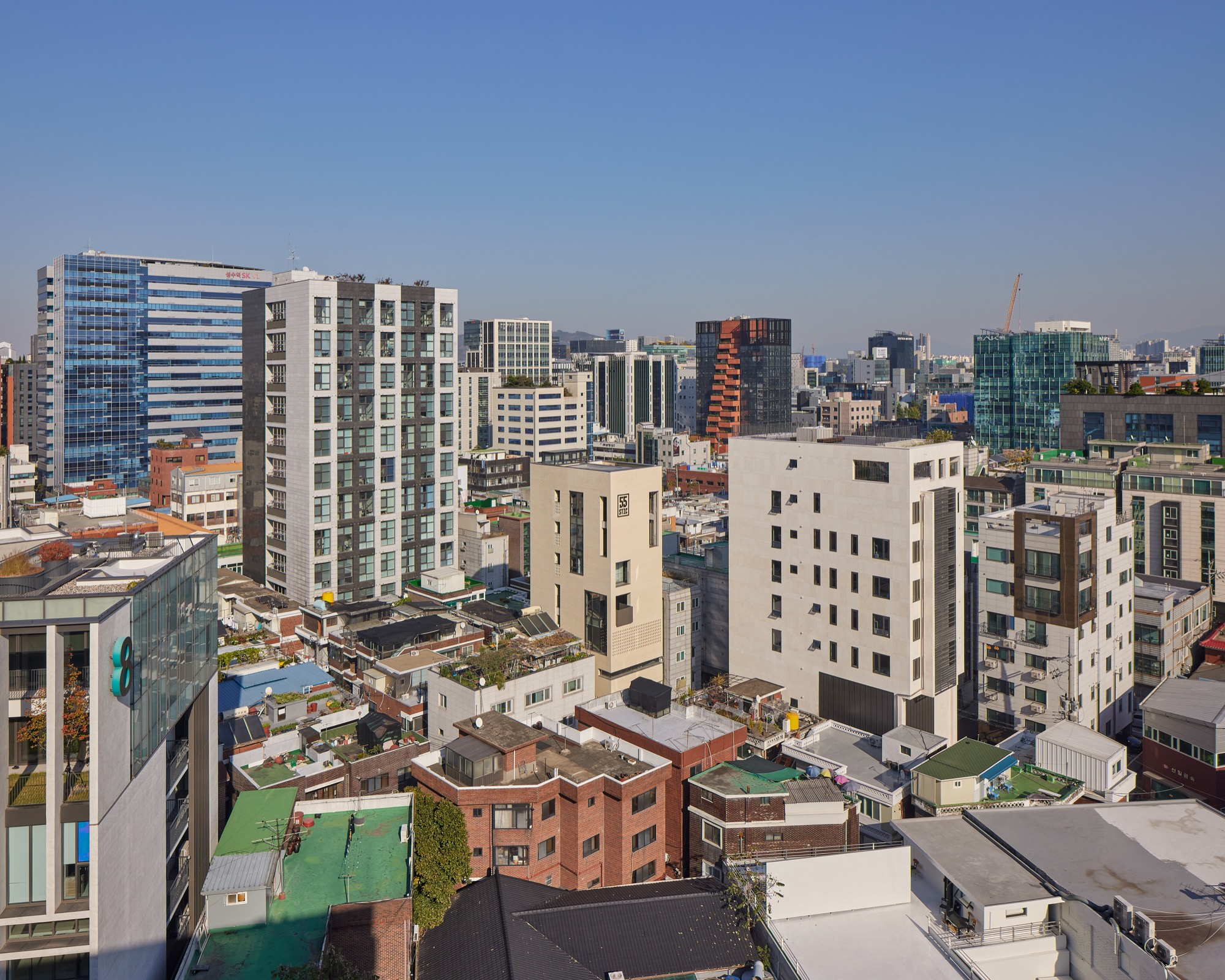 8층 규모의 용적은 주차대수 설계의 한계로 잉여 용적이 생겨났다. 우리는 남은 용적에 도시환경에 대응하는 INTERWALL(사이 벽)을 계획했다. 이 벽은 8층 높이의 벽으로 층마다 비움과 채움, 수직과 수평, 열림과 닫힘, 가림과 채광, 봄과 보임의 방식으로 도시환경과 관계를 맺고 조직을 만드는 표층이 된다. 수직 표층은 건물의 파사드가 되면서 낮과 밤, 시간에 따라 변화하는 빛으로 다양한 내부 공간 경험을 만들고, 도시의 외부 입면이 된다. 이러한 전략은 도시 경계에서 사성(私性)의 격리적 표피에서 공성(共性)의 관계적 표층으로 바뀌게 할 것이다.