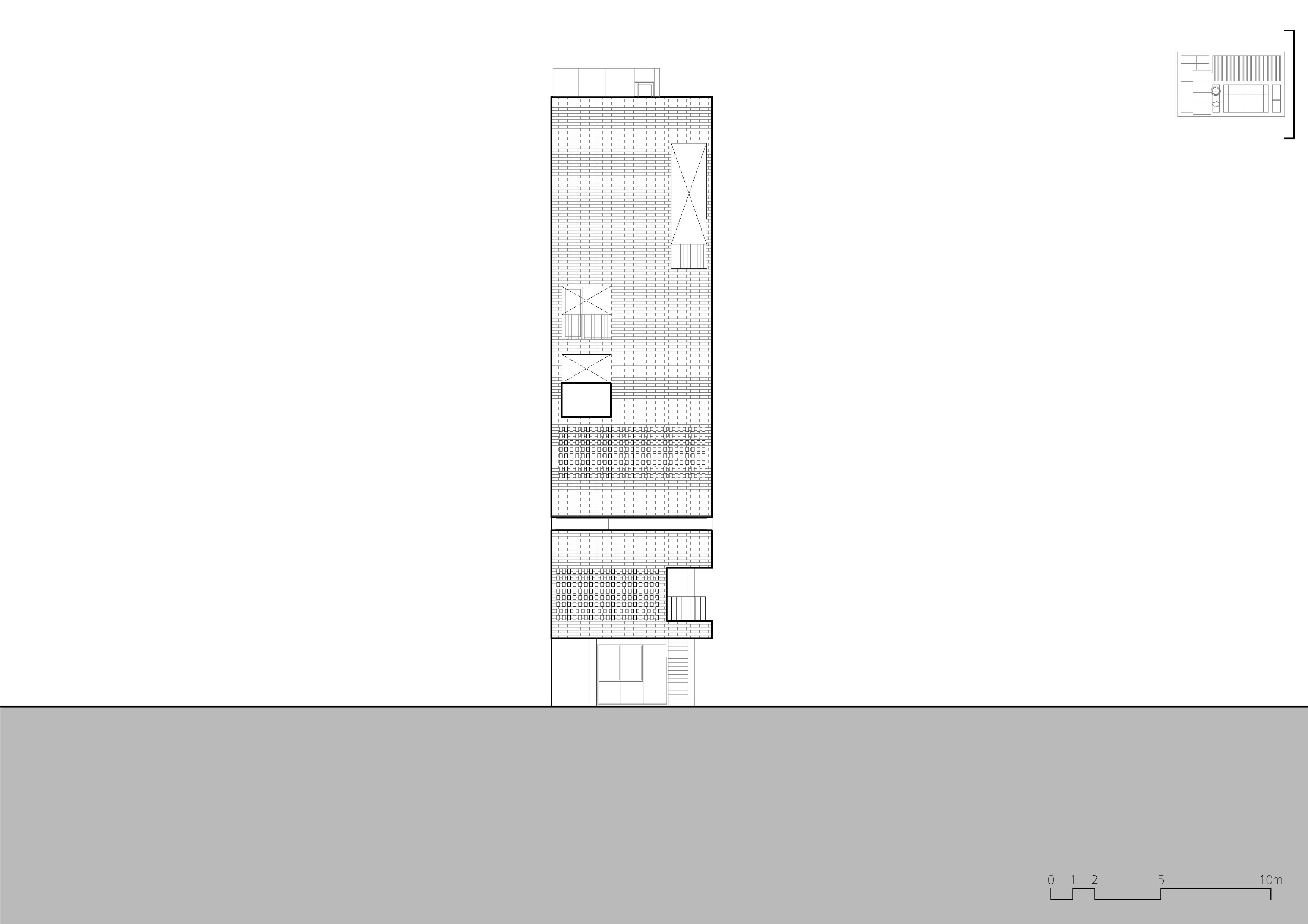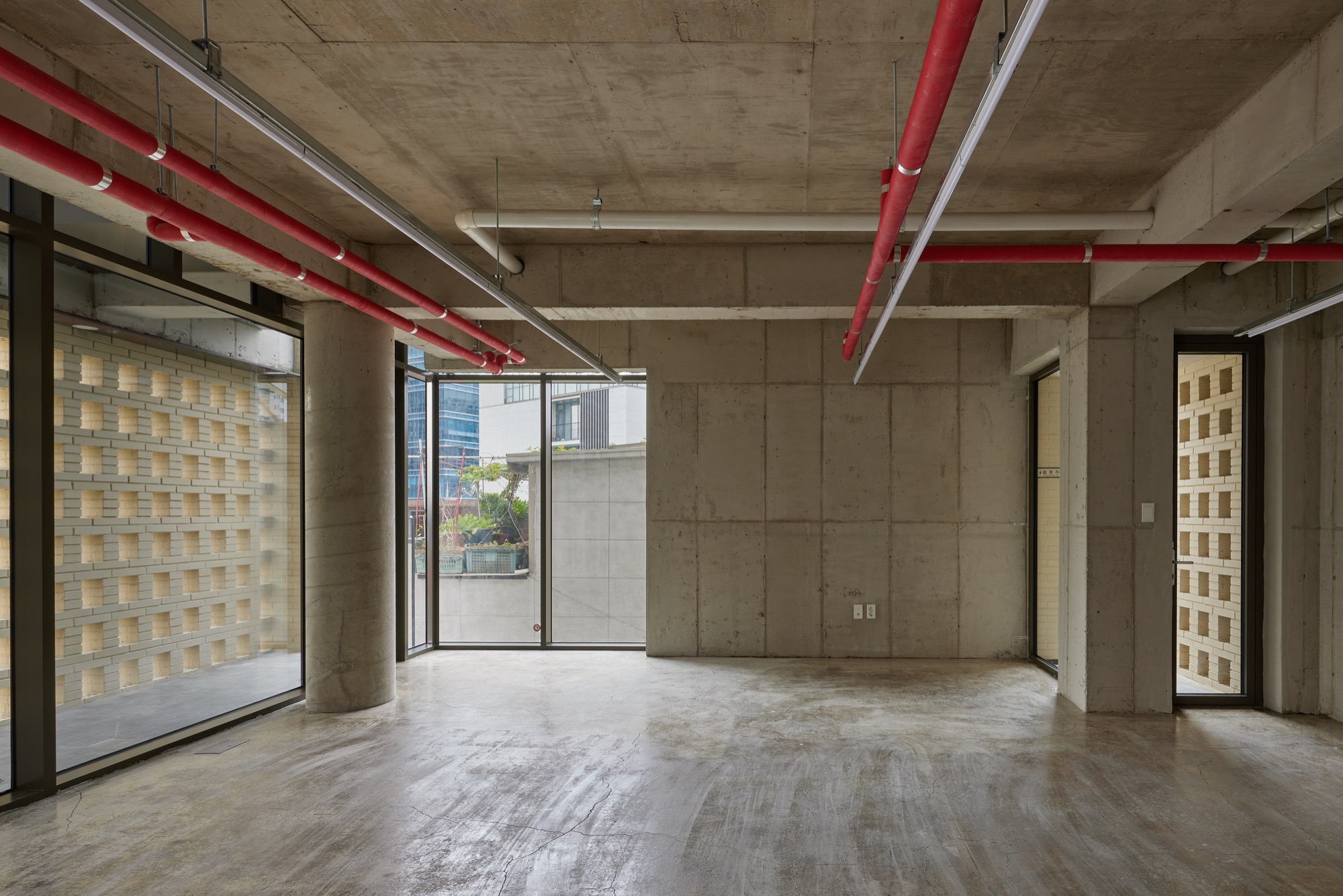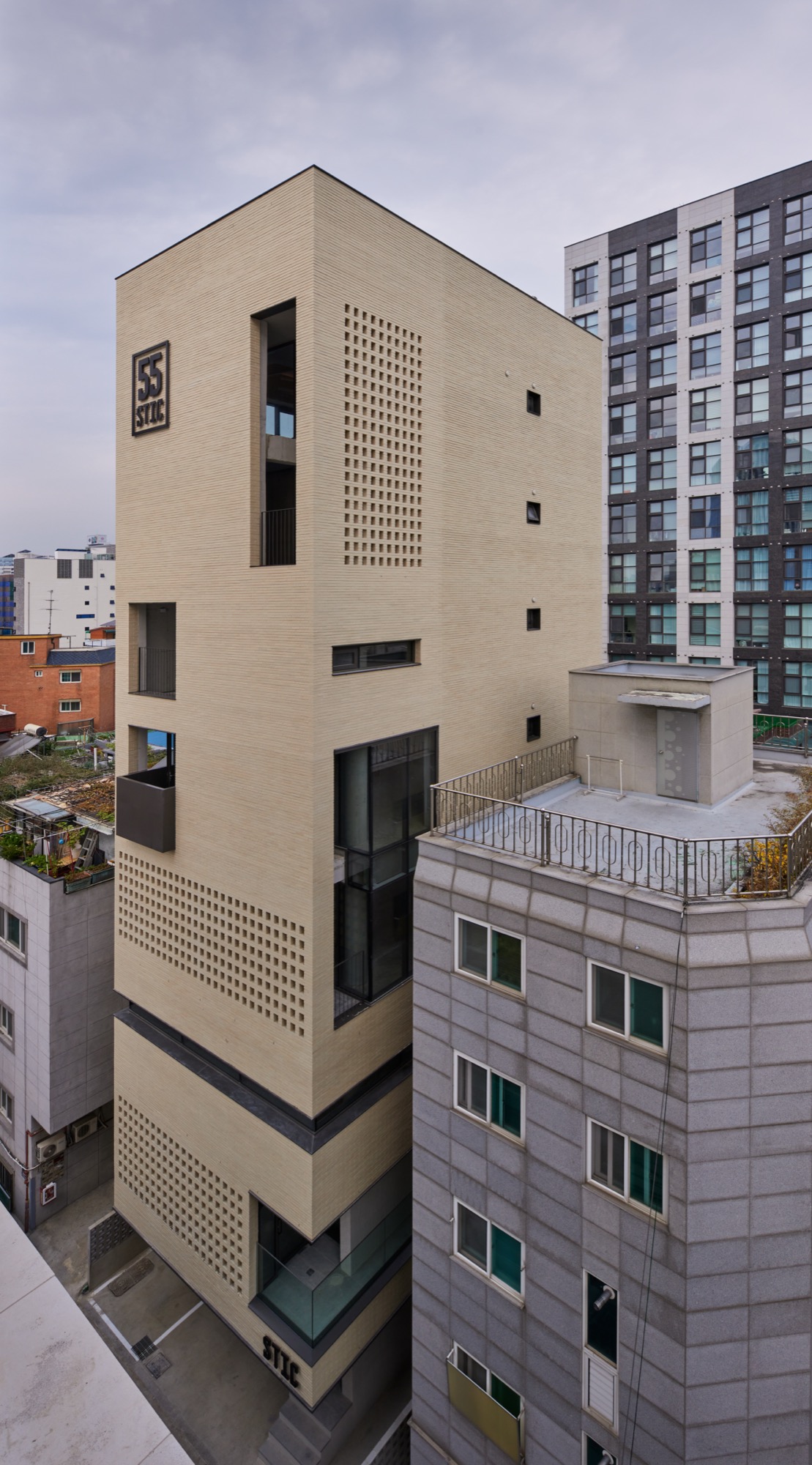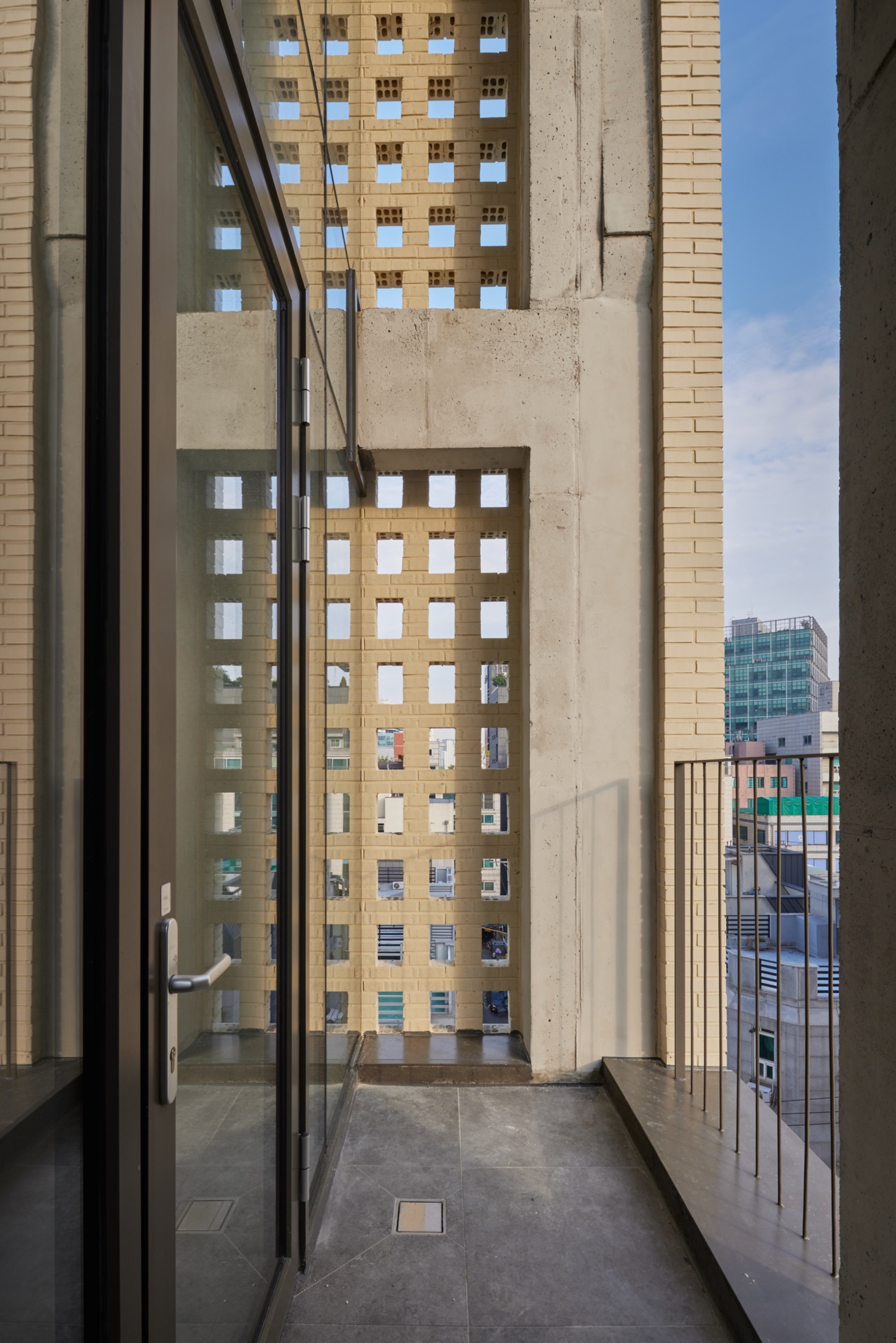 인접 필지는 주거용 건물이 자리해있다. 내부가 보여야 하는 근린생활시설의 방향성과 주거 생활자의 사생활 보호가 충돌됐다. 주거용 건물이 밀집된 대지의 맥락에 대응하기 위해 벽돌을 쌓아 닫힌 입면의 상업시설을 제안했다. 전체적으로 닫힌 모습이지만 벽돌을 쌓는 방식을 통해 적절한 시선의 투과와 채광을 받을 수 있게 계획했다. 주변 높이와 건물의 시선 문제를 체크하고, 각 상황에 맞도록 닫힘과 열림, 다공쌓기 방식을 결정했다. 벽돌의 모듈은 입면 전체의 비례 관계 속에서 벽돌 규격과 쌓기 방식이 정해졌다. 최고 높이와 도로 전면 활용 폭이 결정된 상황 속에서 23.5☓11☓5cm 규격의 벽돌을 사용했다. 다공 쌓기 방식에서도 전체 매스 크기를 고려하여 두 단을 겹으로 쌓아서 만든 크기로 결정했다. 나머지 크기의 창도 전체 크기의 비례와 관계 속에서 결정됐다. 이렇게 구성된 입면의 전략은 주변 맥락과 관계 속에서 새로운 상업적 가능성을 만들어 준다.