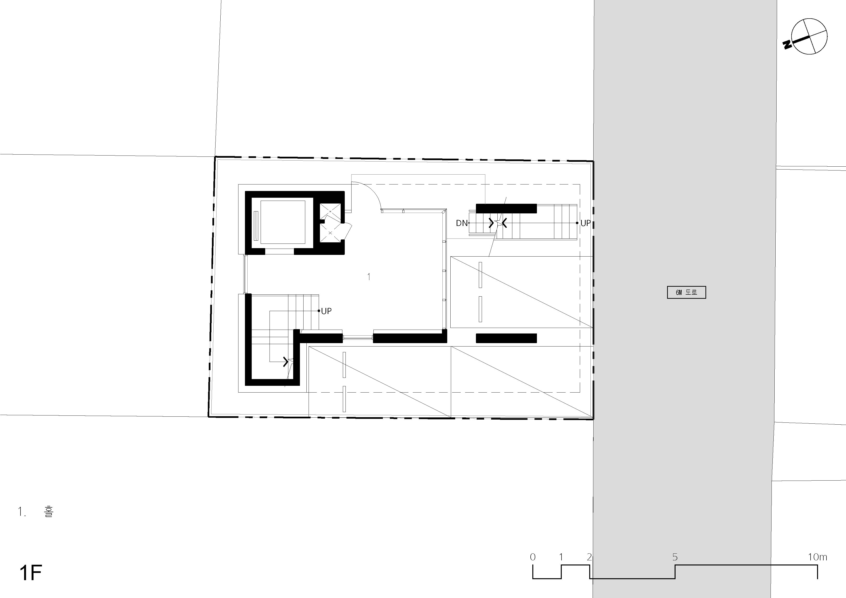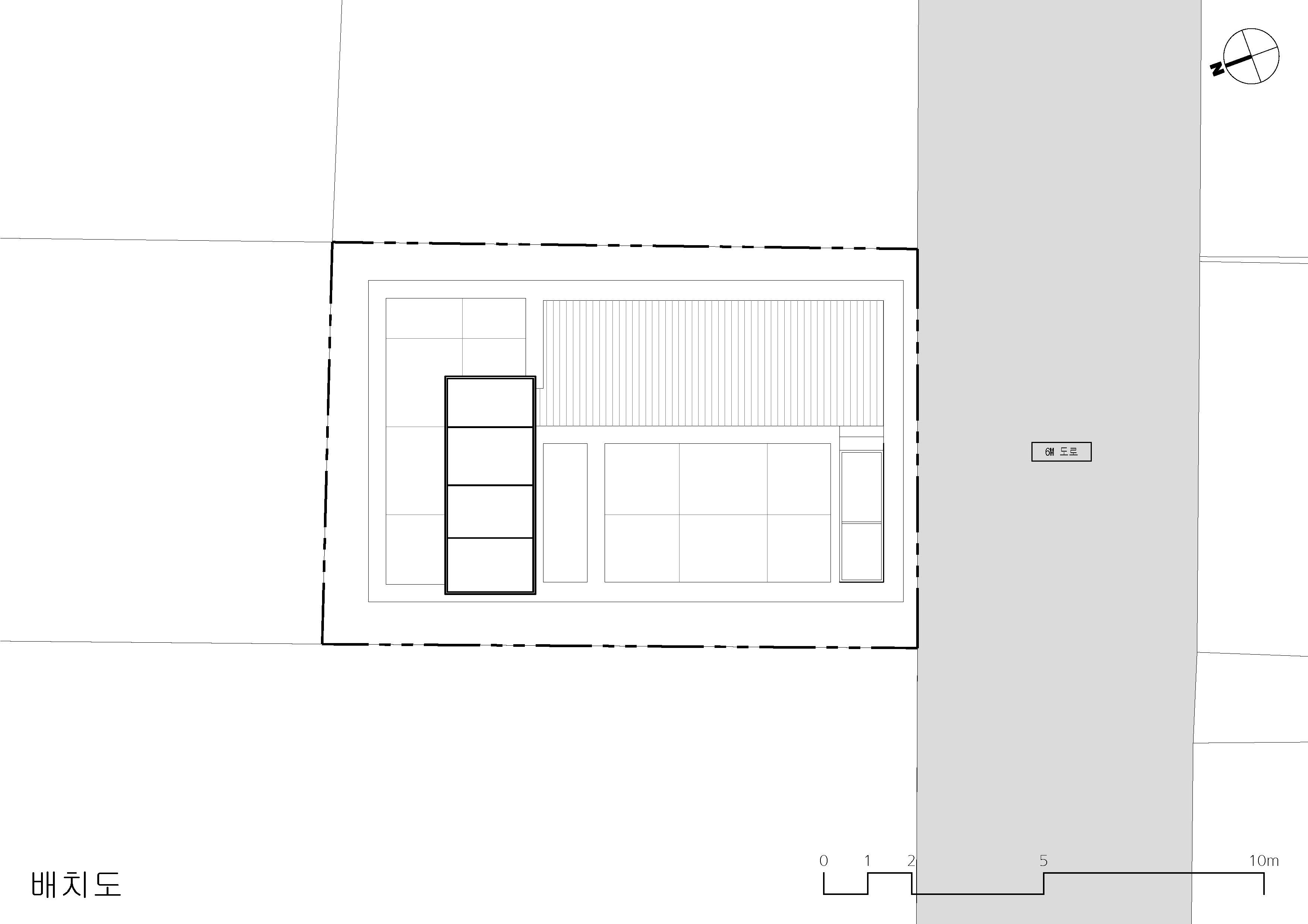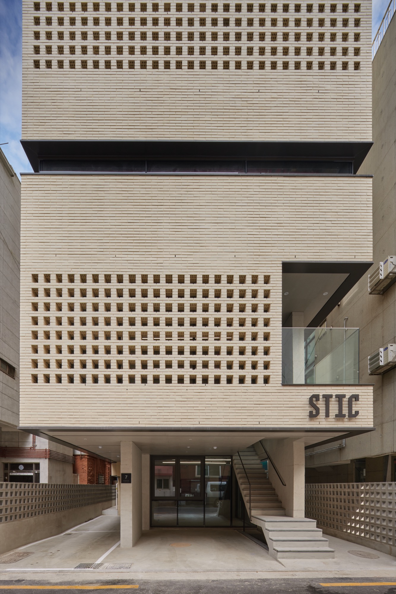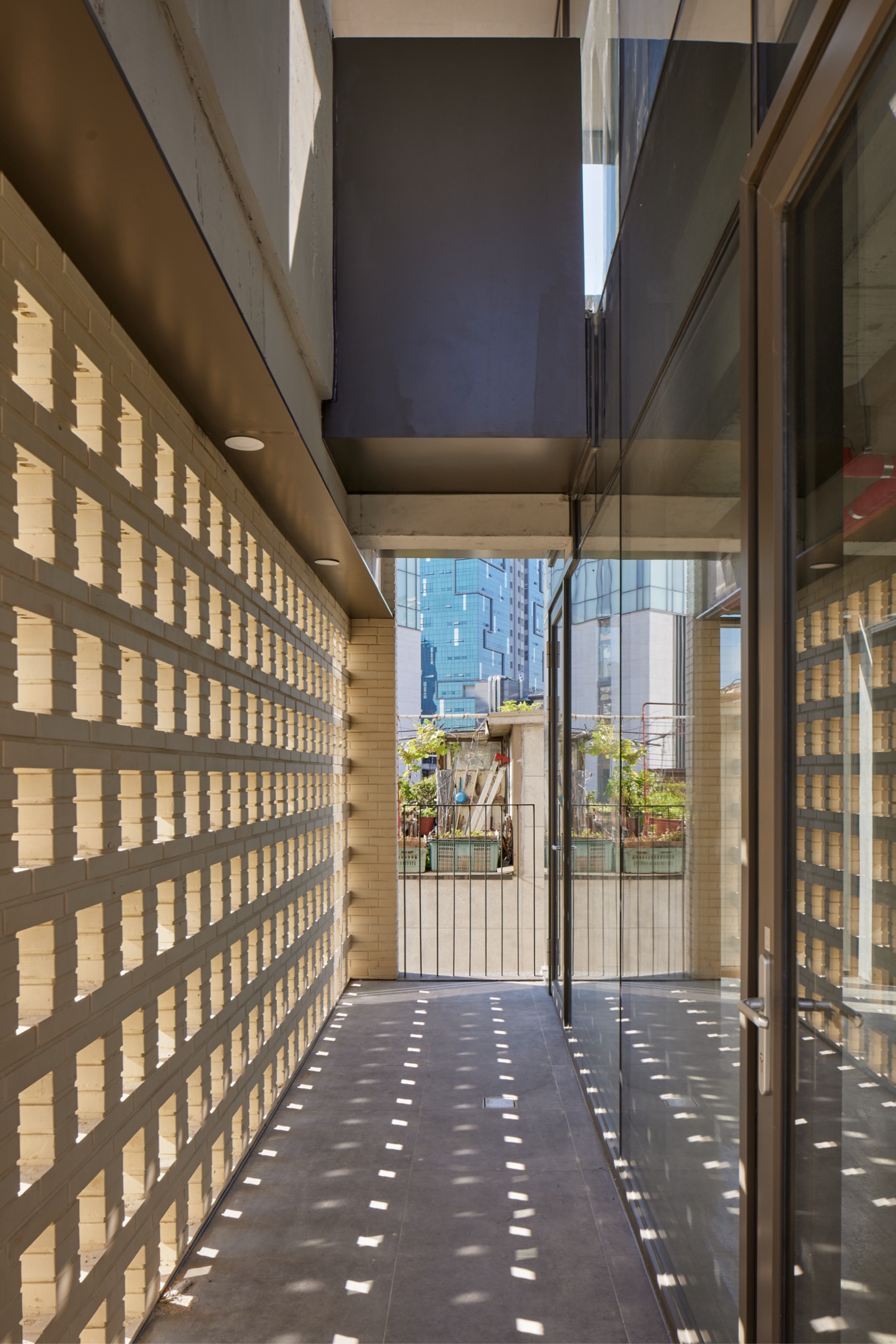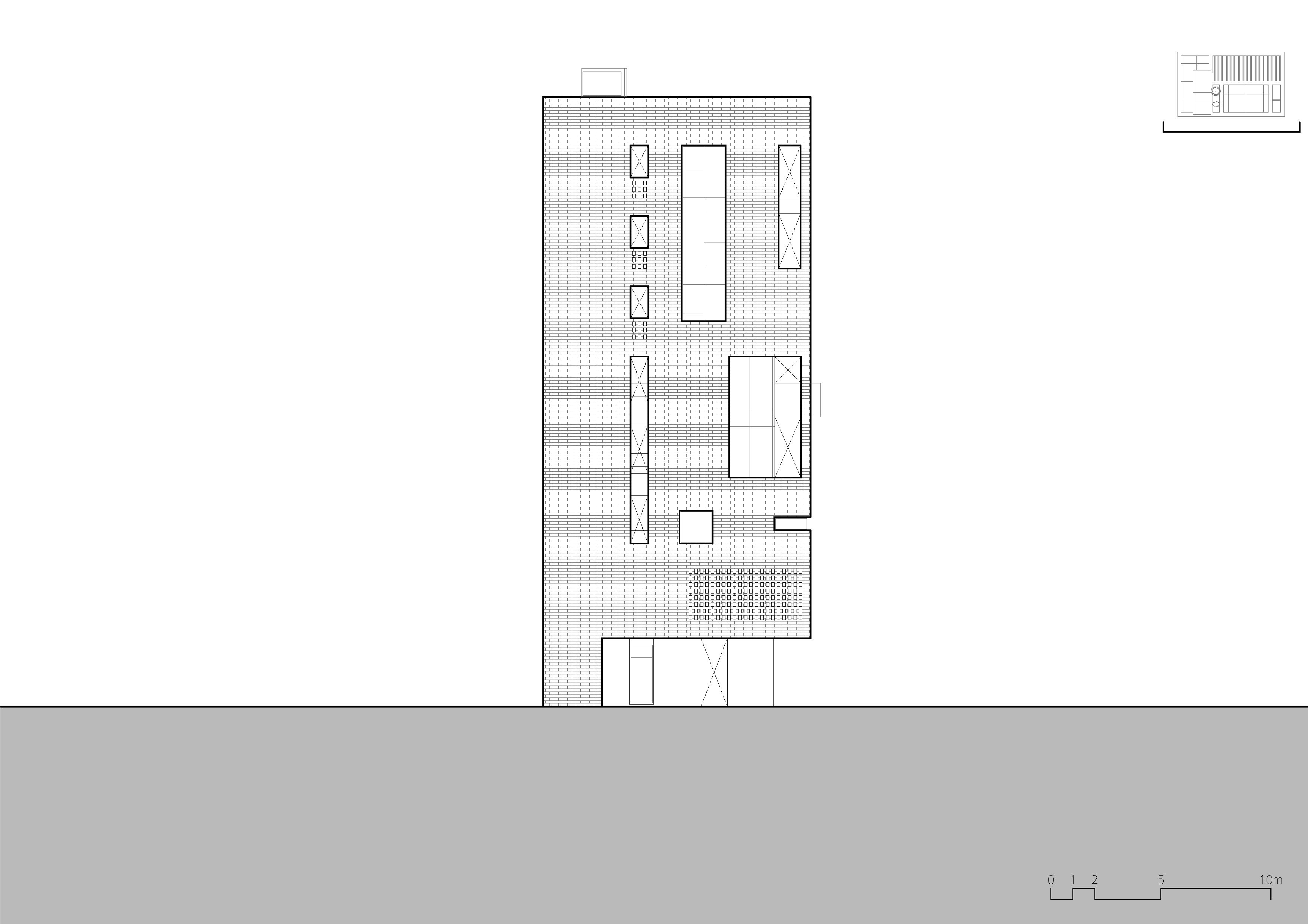 인접 필지는 주거용 건물이 자리해있다. 내부가 보여야 하는 근린생활시설의 방향성과 주거 생활자의 사생활 보호가 충돌됐다. 주거용 건물이 밀집된 대지의 맥락에 대응하기 위해 벽돌을 쌓아 닫힌 입면의 상업시설을 제안했다. 전체적으로 닫힌 모습이지만 벽돌을 쌓는 방식을 통해 적절한 시선의 투과와 채광을 받을 수 있게 계획했다. 주변 높이와 건물의 시선 문제를 체크하고, 각 상황에 맞도록 닫힘과 열림, 다공쌓기 방식을 결정했다. 벽돌의 모듈은 입면 전체의 비례 관계 속에서 벽돌 규격과 쌓기 방식이 정해졌다. 최고 높이와 도로 전면 활용 폭이 결정된 상황 속에서 23.5☓11☓5cm 규격의 벽돌을 사용했다. 다공 쌓기 방식에서도 전체 매스 크기를 고려하여 두 단을 겹으로 쌓아서 만든 크기로 결정했다. 나머지 크기의 창도 전체 크기의 비례와 관계 속에서 결정됐다. 이렇게 구성된 입면의 전략은 주변 맥락과 관계 속에서 새로운 상업적 가능성을 만들어 준다.