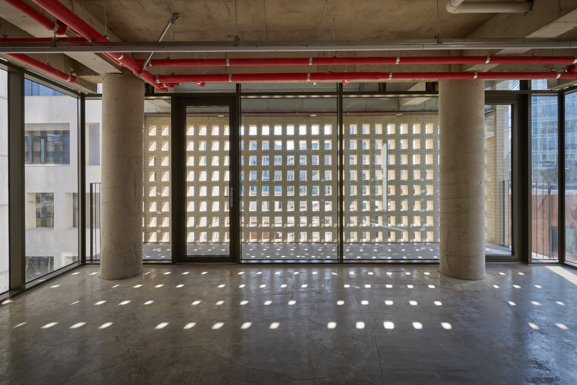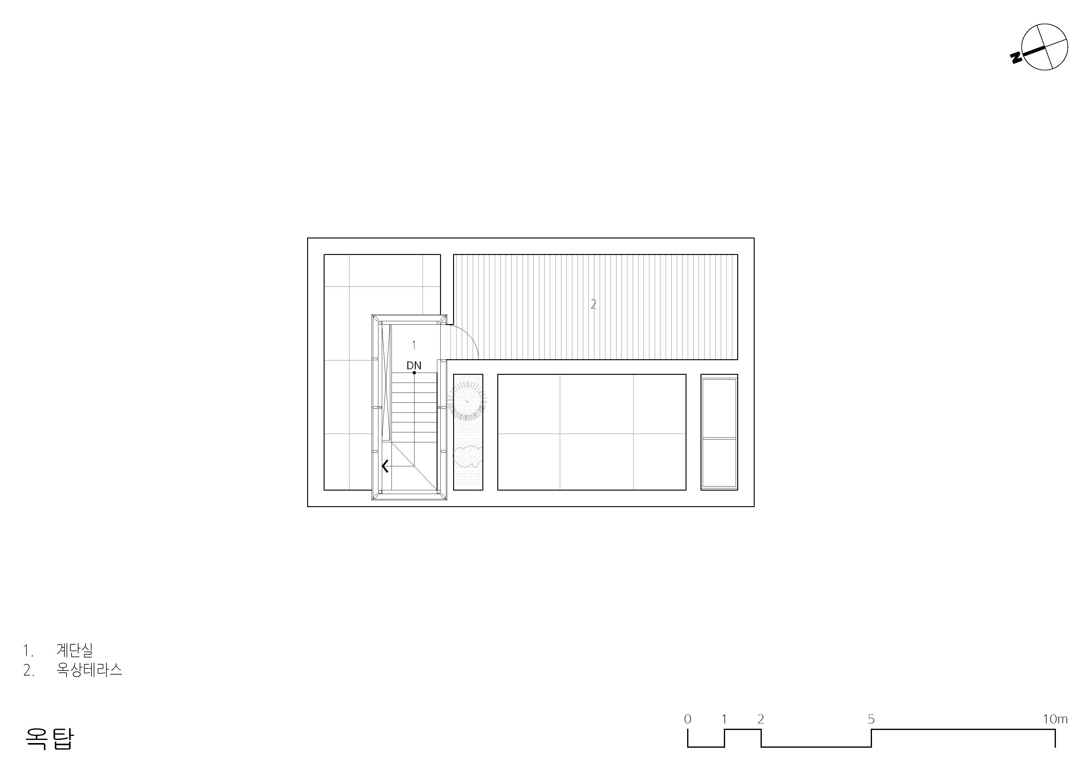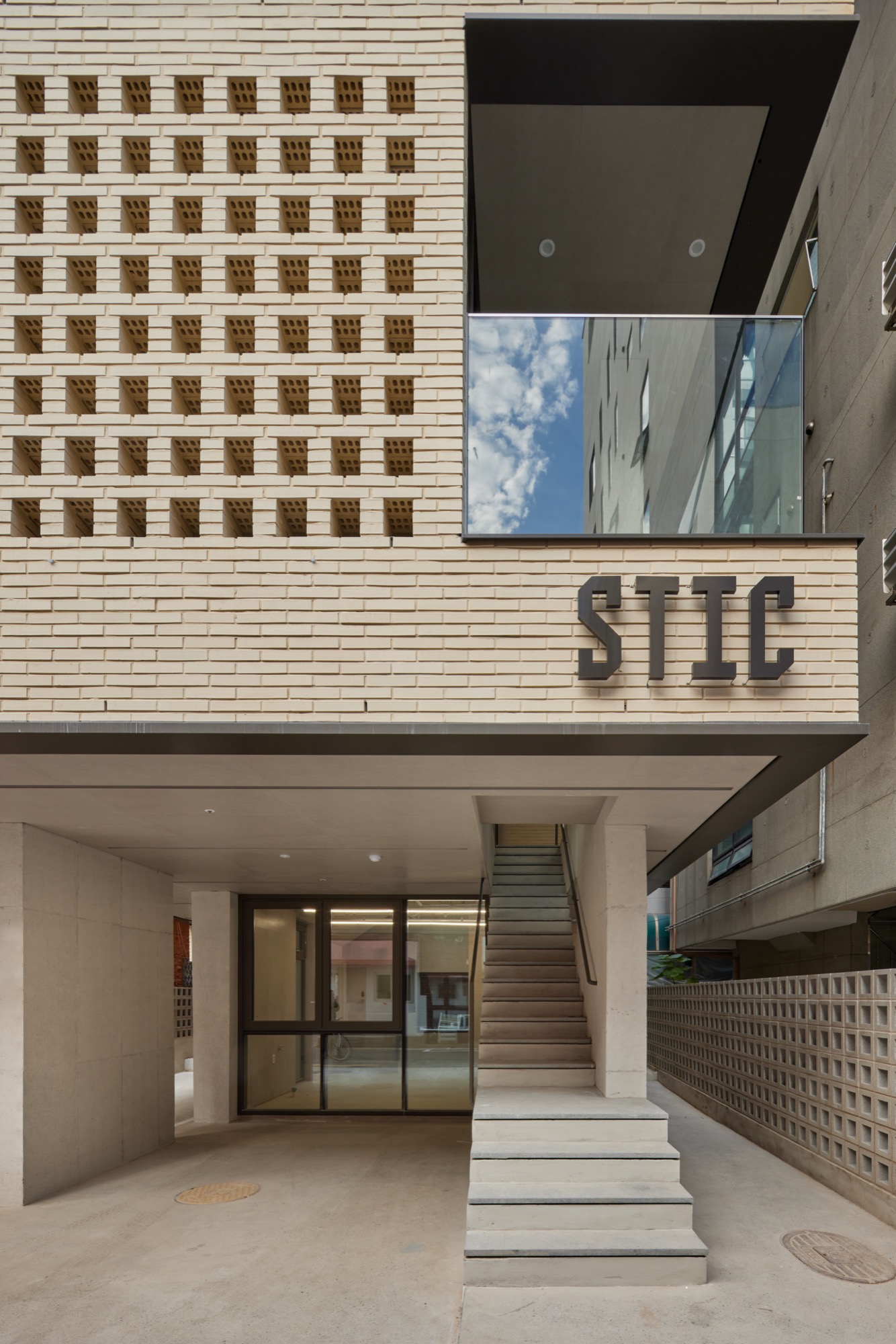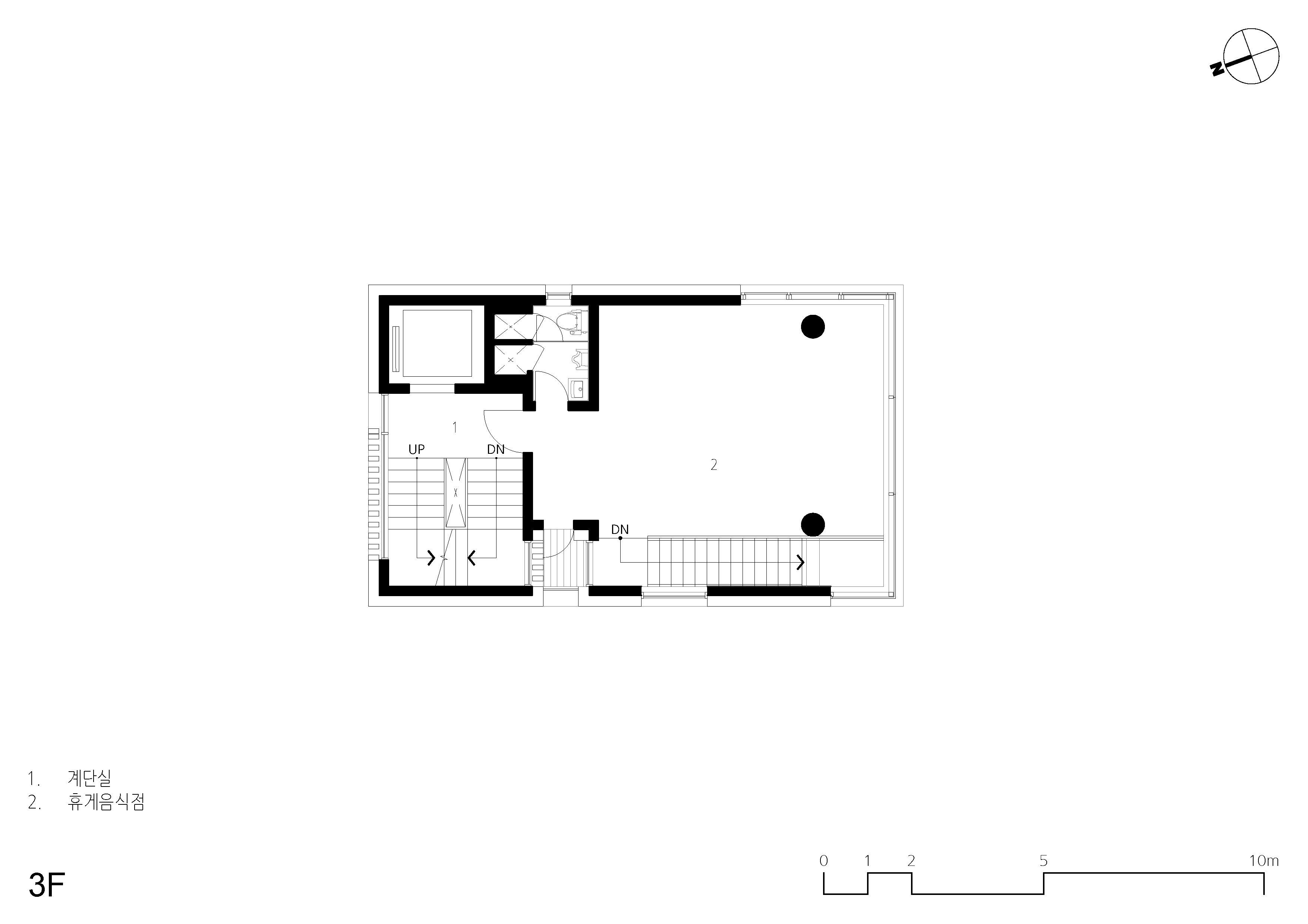 인접 필지는 주거용 건물이 자리해있다. 내부가 보여야 하는 근린생활시설의 방향성과 주거 생활자의 사생활 보호가 충돌됐다. 주거용 건물이 밀집된 대지의 맥락에 대응하기 위해 벽돌을 쌓아 닫힌 입면의 상업시설을 제안했다. 전체적으로 닫힌 모습이지만 벽돌을 쌓는 방식을 통해 적절한 시선의 투과와 채광을 받을 수 있게 계획했다. 주변 높이와 건물의 시선 문제를 체크하고, 각 상황에 맞도록 닫힘과 열림, 다공쌓기 방식을 결정했다. 벽돌의 모듈은 입면 전체의 비례 관계 속에서 벽돌 규격과 쌓기 방식이 정해졌다. 최고 높이와 도로 전면 활용 폭이 결정된 상황 속에서 23.5☓11☓5cm 규격의 벽돌을 사용했다. 다공 쌓기 방식에서도 전체 매스 크기를 고려하여 두 단을 겹으로 쌓아서 만든 크기로 결정했다. 나머지 크기의 창도 전체 크기의 비례와 관계 속에서 결정됐다. 이렇게 구성된 입면의 전략은 주변 맥락과 관계 속에서 새로운 상업적 가능성을 만들어 준다.