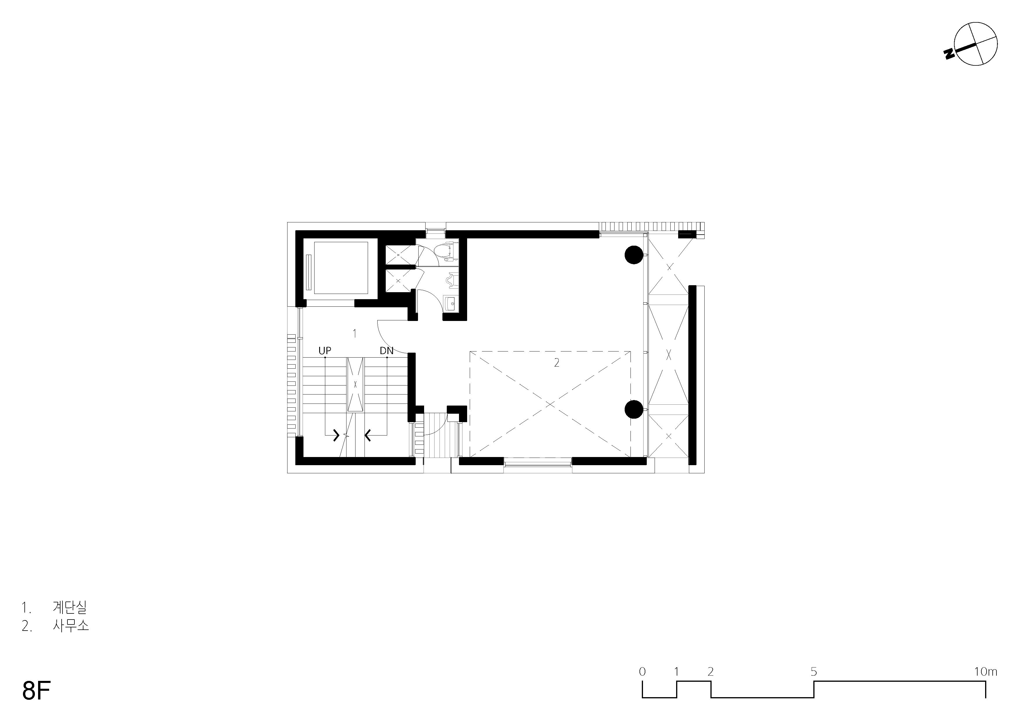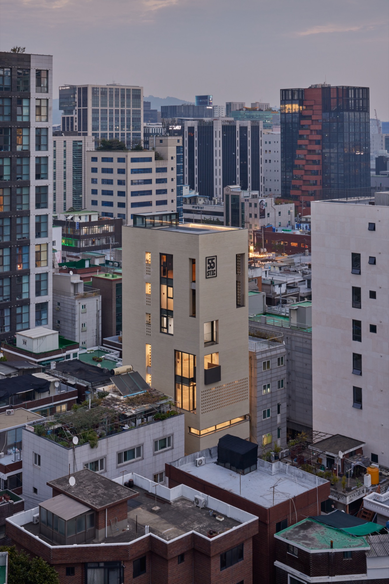 필지는 남쪽으로 6m 도로에 접한 성수동의 작은 필지다. 전면 도로와 8.5m만 접하고, 나머지 3면은 주거형(다세대, 다가구) 건물로 채워진 인접 필지와 접해있다. 준공업지역인 성수동은 필지별 높이 산정이 산술식으로 결정된다. 27m 남짓한 높이가 기준이 되면서 8층의 좁고 높은 건물의 볼륨이 부동산적 규모로 결정됐다. 60%의 건폐율과 8층 높이의 용적률, 법정 주차대수를 조율하면서 건물의 매스를 계획했다. 여기서 좁은 필지에 들어설 수직 형태의 기하학은 양보할 수 없는 성수동의 부동산적 욕망이 담긴 매스로 인정하면서 건축적 가능성을 찾아가는 출발점이 됐다.