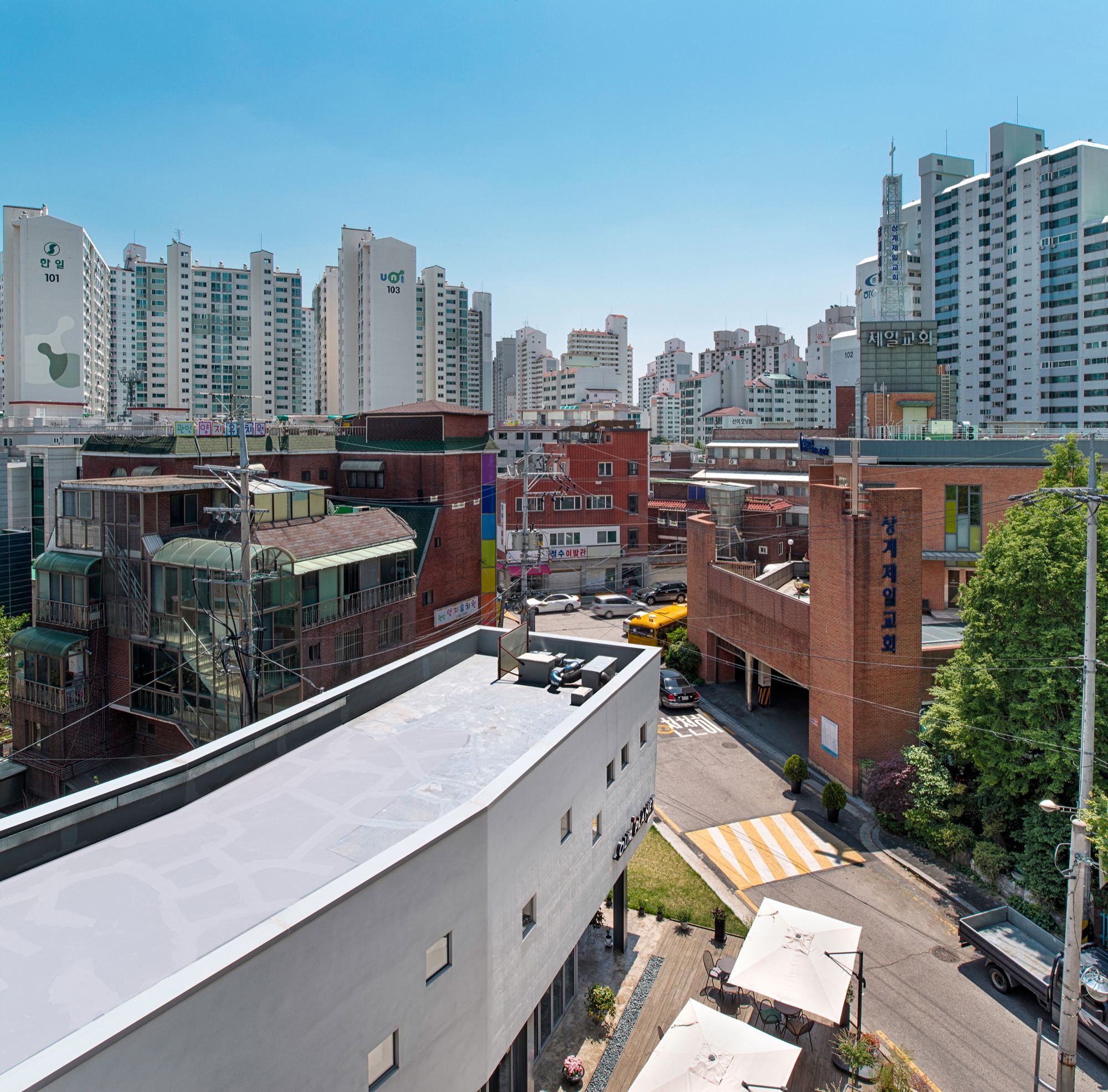 노원구 상계동은 대규모 아파트 단지들 사이에 얼마 남지 않은 주택가이다. 동네라 불릴 만한 작은 규모의 건물들, 그 사이로 이어지는 골목길, 그 골목에서 자연스레 만날 수 있는 사람들. 몇몇 규모가 큰 건물들이 기존의 도시 스케일을 파괴하고 있지만, 지역 아티스트를 위한 소규모 구립미술관이 새로이 들어서는 등, 동네문화를 살리기 위한 움직임이 이루어지는 곳이다. 30년 이상 된 연와조 건물을 허물고 두 필지를 합하여 대지를 조성하였다. 남북으로 길어진 대지의 서 측으로 기존의 복지관이 자리해 있으며, 동쪽은 채 4m가 안 되는 골목길과 2~3층 규모의 흔히 볼 수 있는 다세대 주택들이 줄지어 들어서 있다.