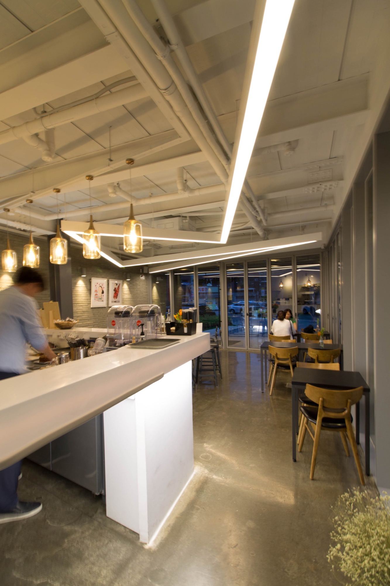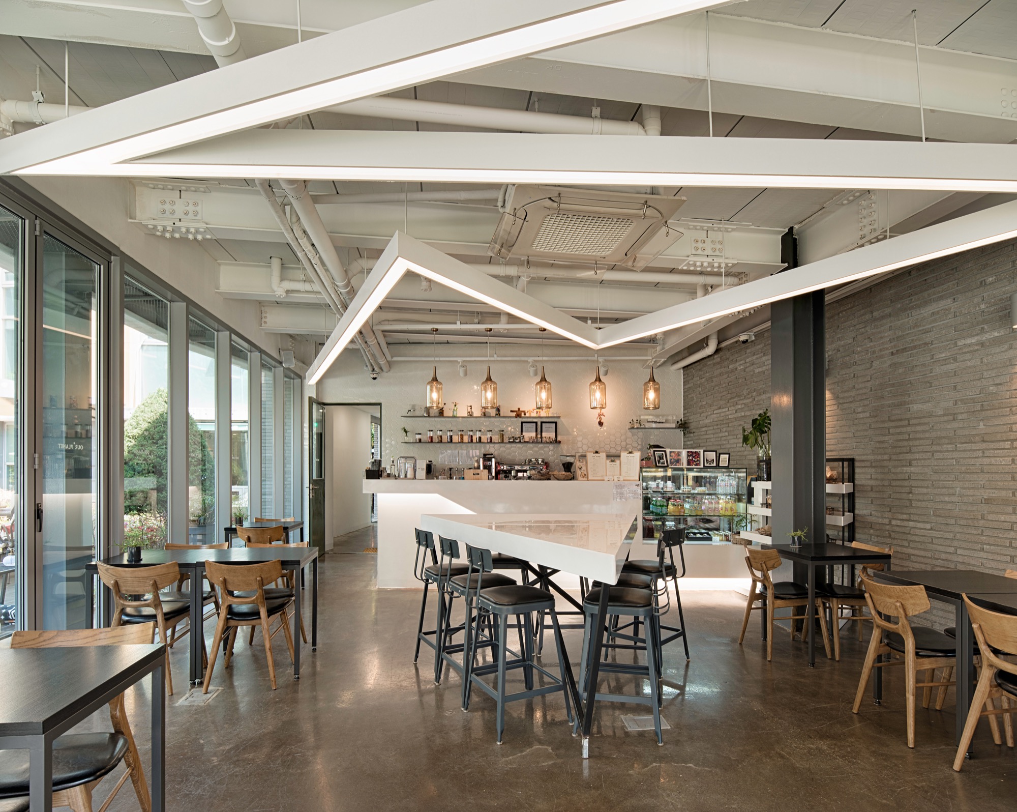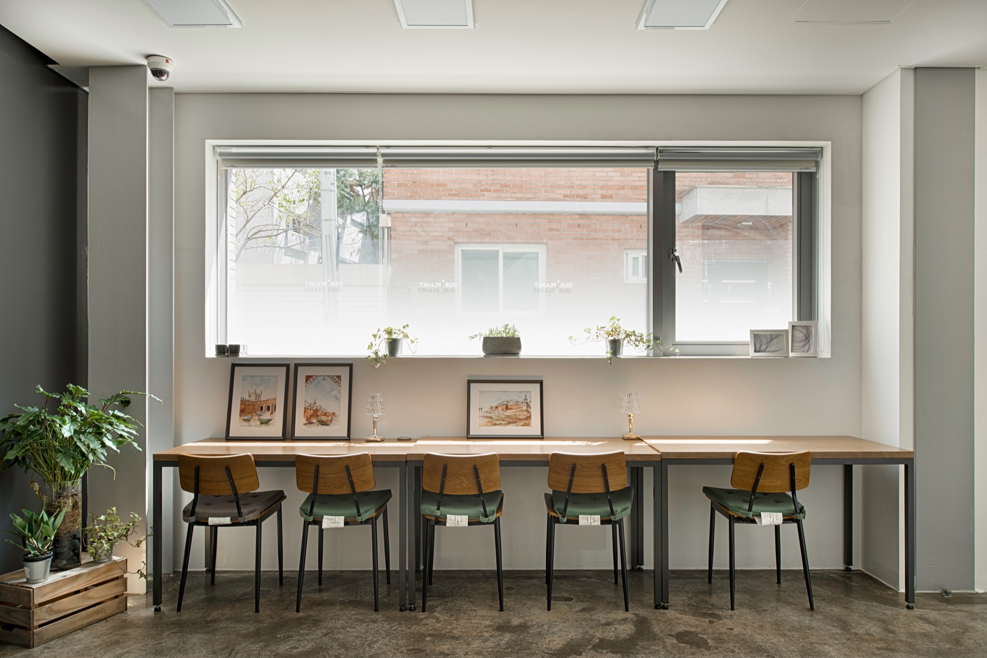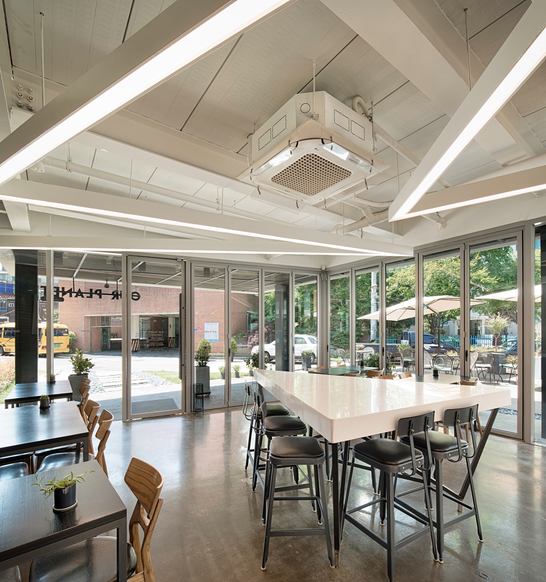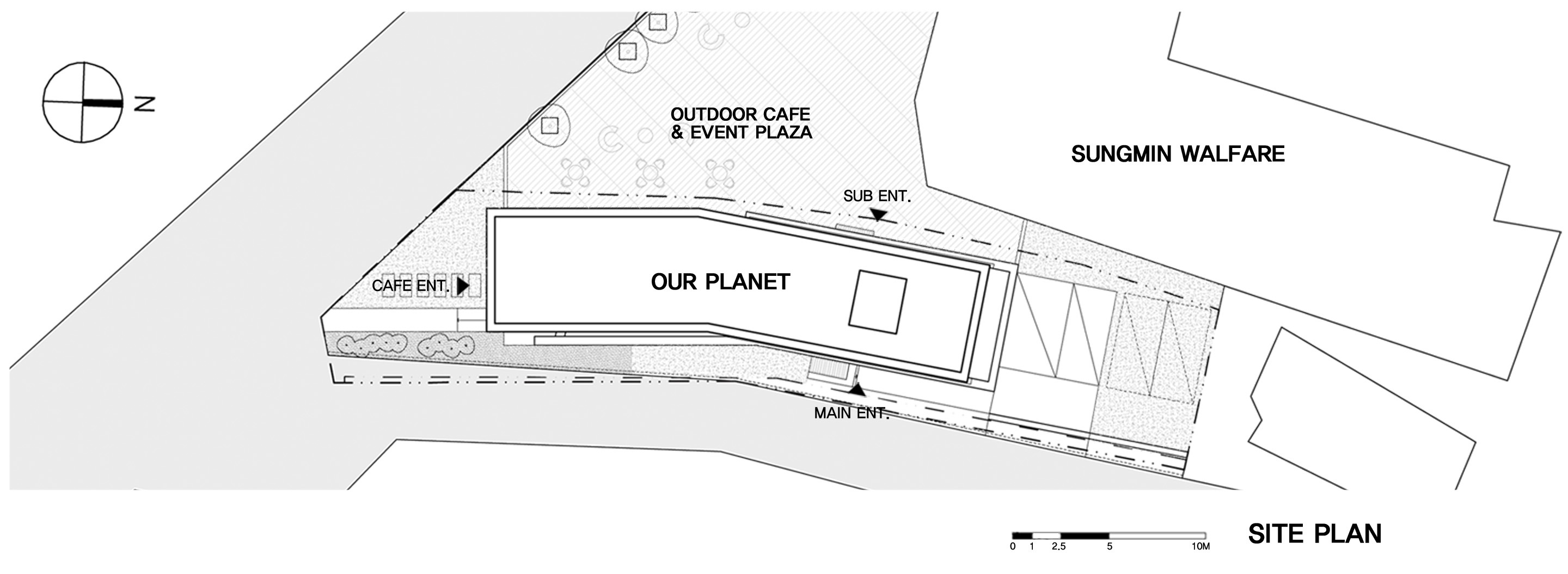 길이방향을 정확히 직각으로 가로지르는 출입 동선 축은 서쪽의 복지관과 연계성을 높이면서 동시에 각 층에 요구되는 실의 면적을 정확하게 나누기 위한 섬세한 전략이다. 이를 기준으로 층별로 카페와 세미나실, 제빵제과 실과 사무실이 나뉜다. 도로에서의 접근이 중요한 카페는 남측에 배치하고 1층의 상당 부분을 필로티로 비워 개방성과 공공성을 극대화하였다.