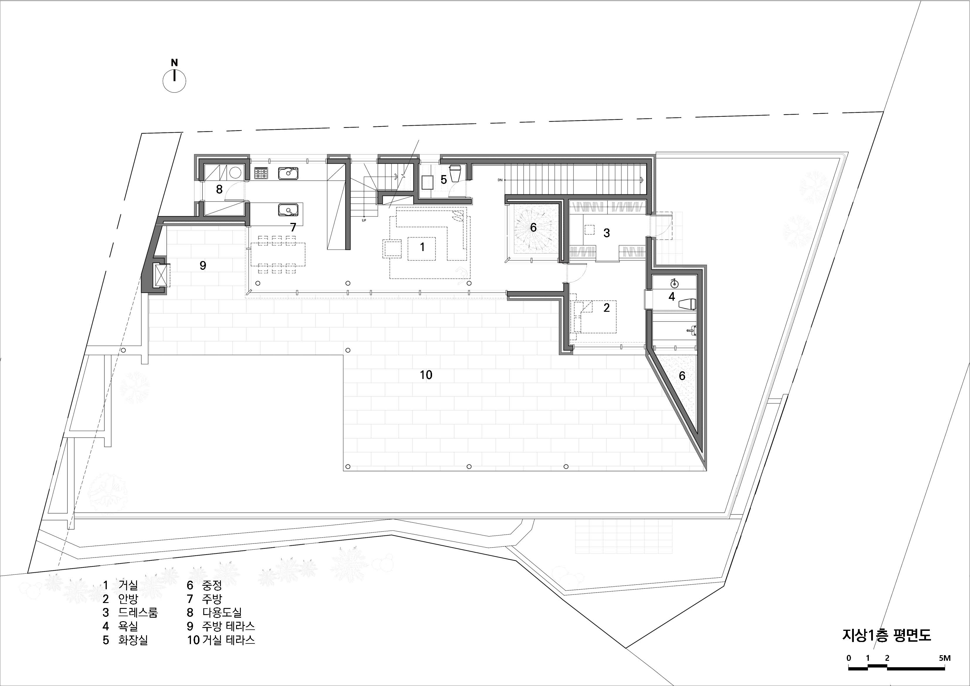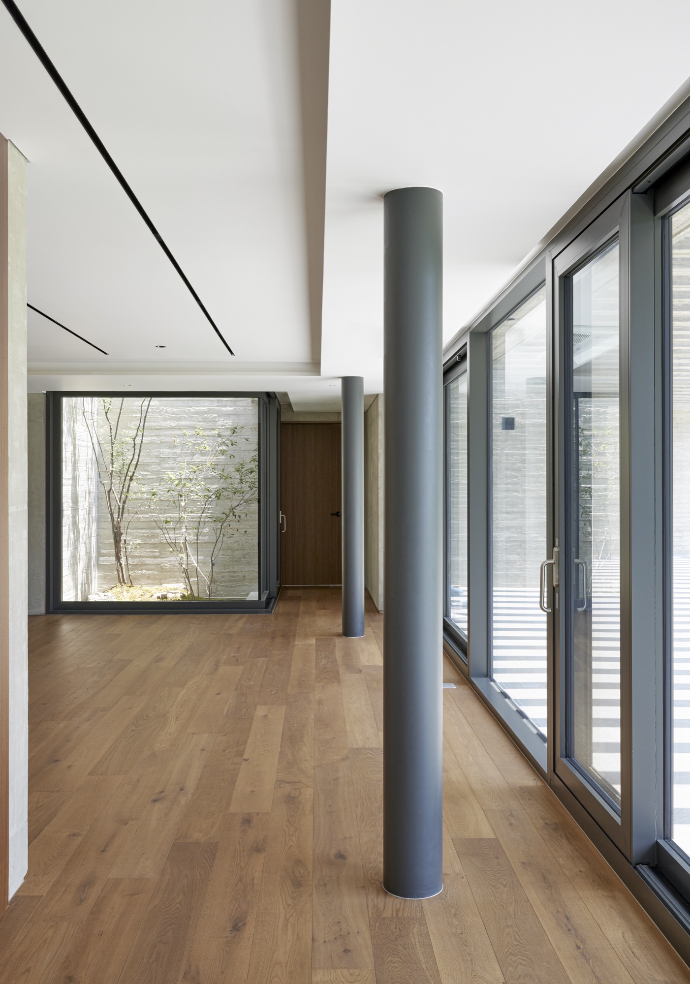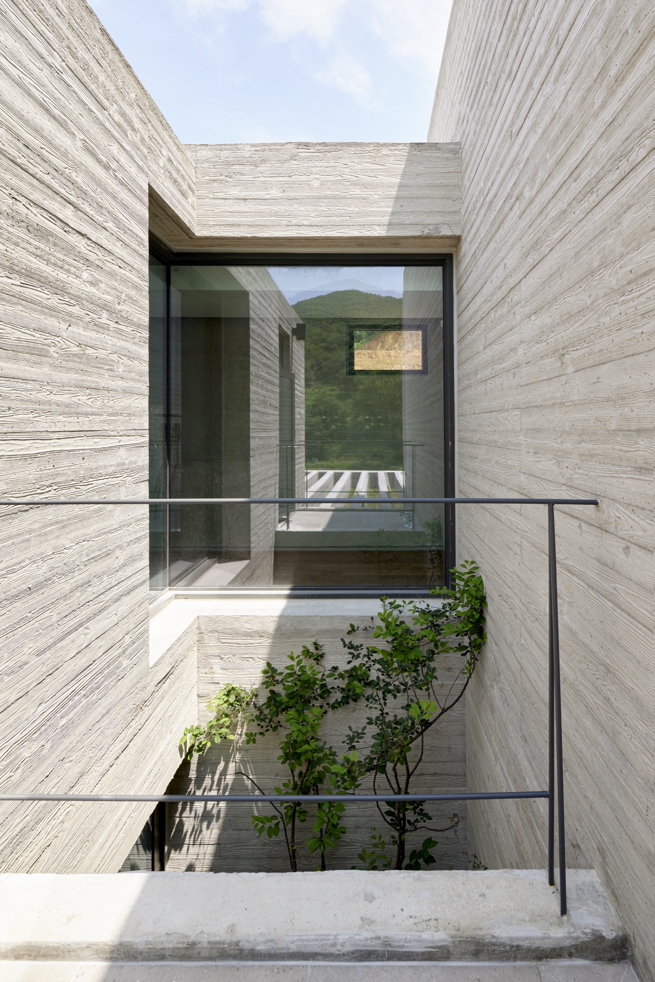 양산 파노라마 하우스는 두 개의 중정이 있다. 하나는 거실 올라오면 볼 수 있는 유리 중정으로 안방과 거실의 경계 역할과 거실 공간을 시각적으로 확장한다. 거실에서 전면 풍경을 바라보지 않더라도 중정으로 쏟아지는 빛과 그림자를 통해 시간과 계절을 실내에서도 느낄 수 있도록 하고자 했다. 마당은 거실에서 저수지 너머로 보이는 자연을 오롯이 느끼기 위해 비워 두었지만, 중정은 나무와 이끼로 채워 정제된 새로운 공간을 경험할 수 있도록 했다. 또 다른 중정은 안방 욕실에 있는 비밀스러운 중정이다. 안방 욕실은 가장 안쪽에 삼각형 형태의 중정과 연결되어 있다. 이 중정은 외부의 시선을 노출콘크리트 벽으로 차단한 채 삼각형으로 열린 하늘만을 담고 있다. 외부와 단절된 채, 조용하게 하늘을 항해 열린 중정을 보며 온전히 편안한 휴식을 취할 수 있는 공간으로 만들어졌다.